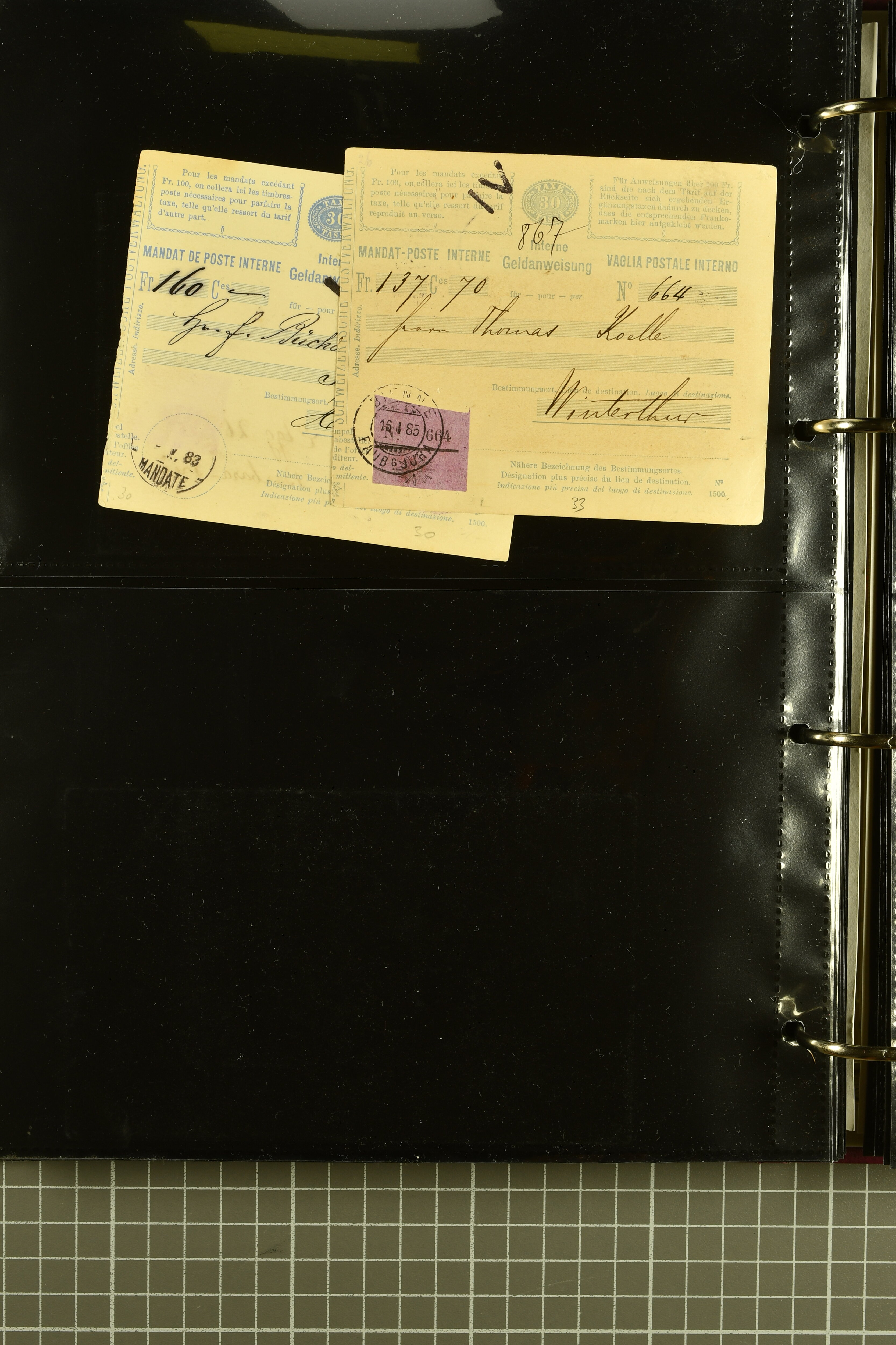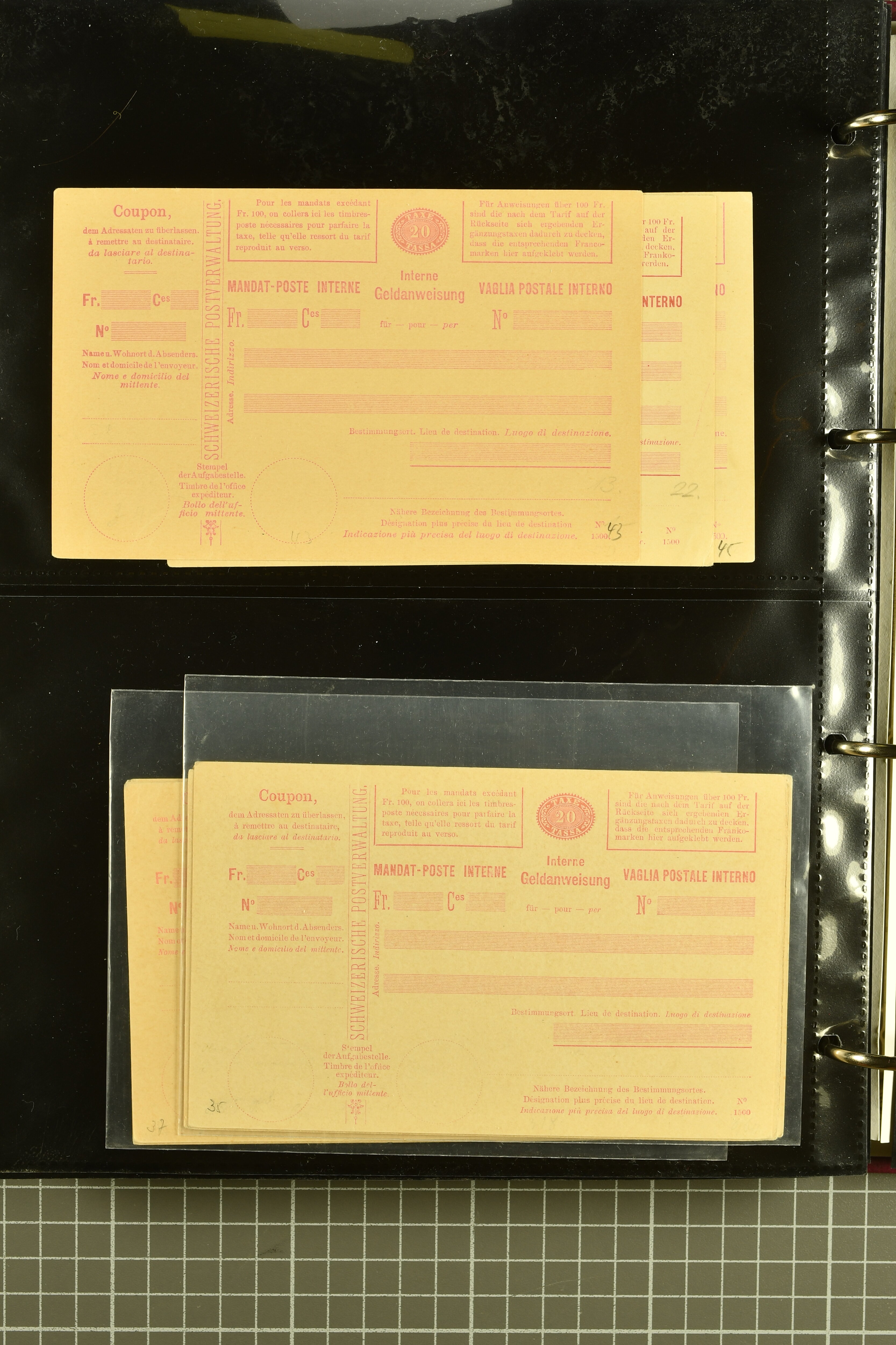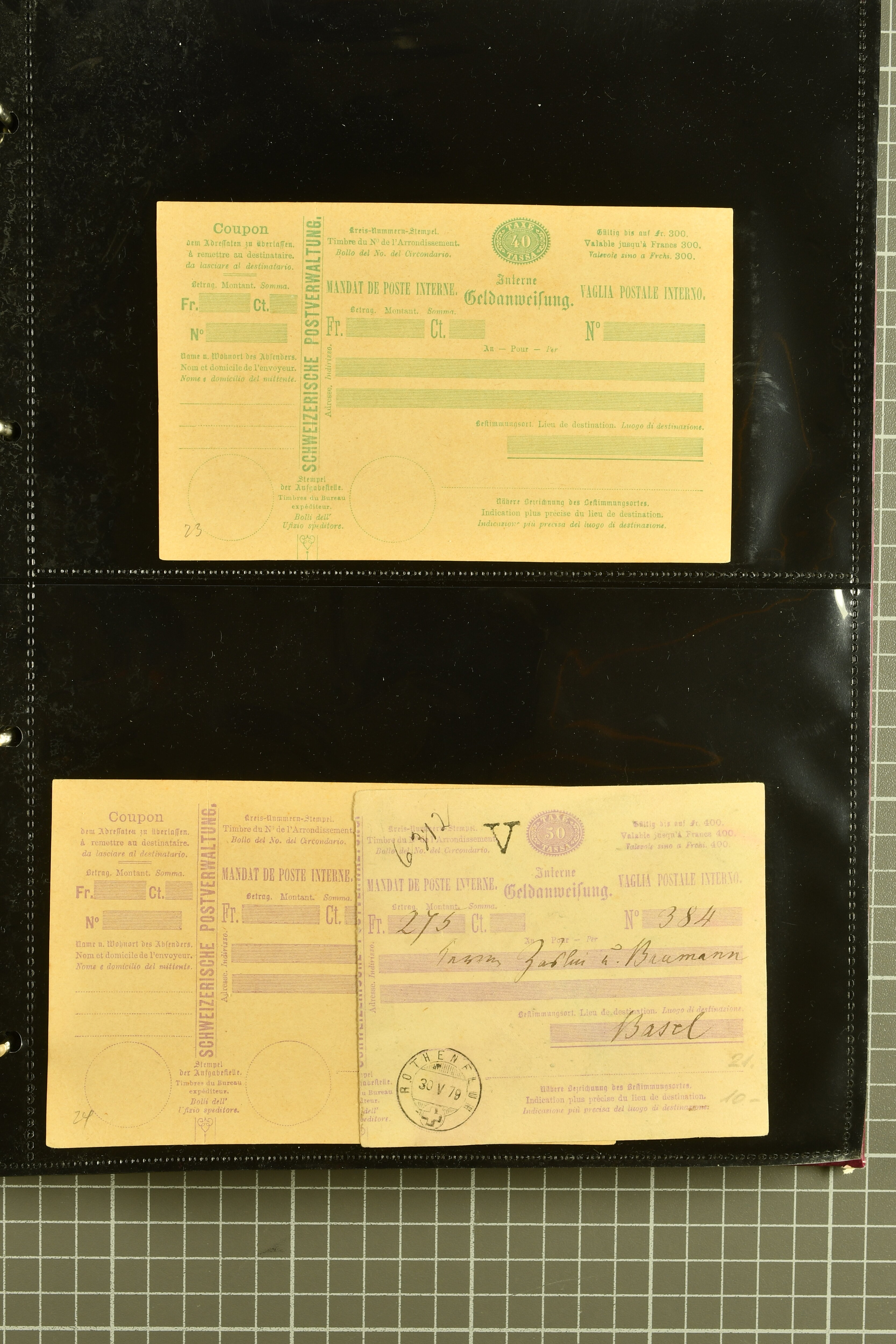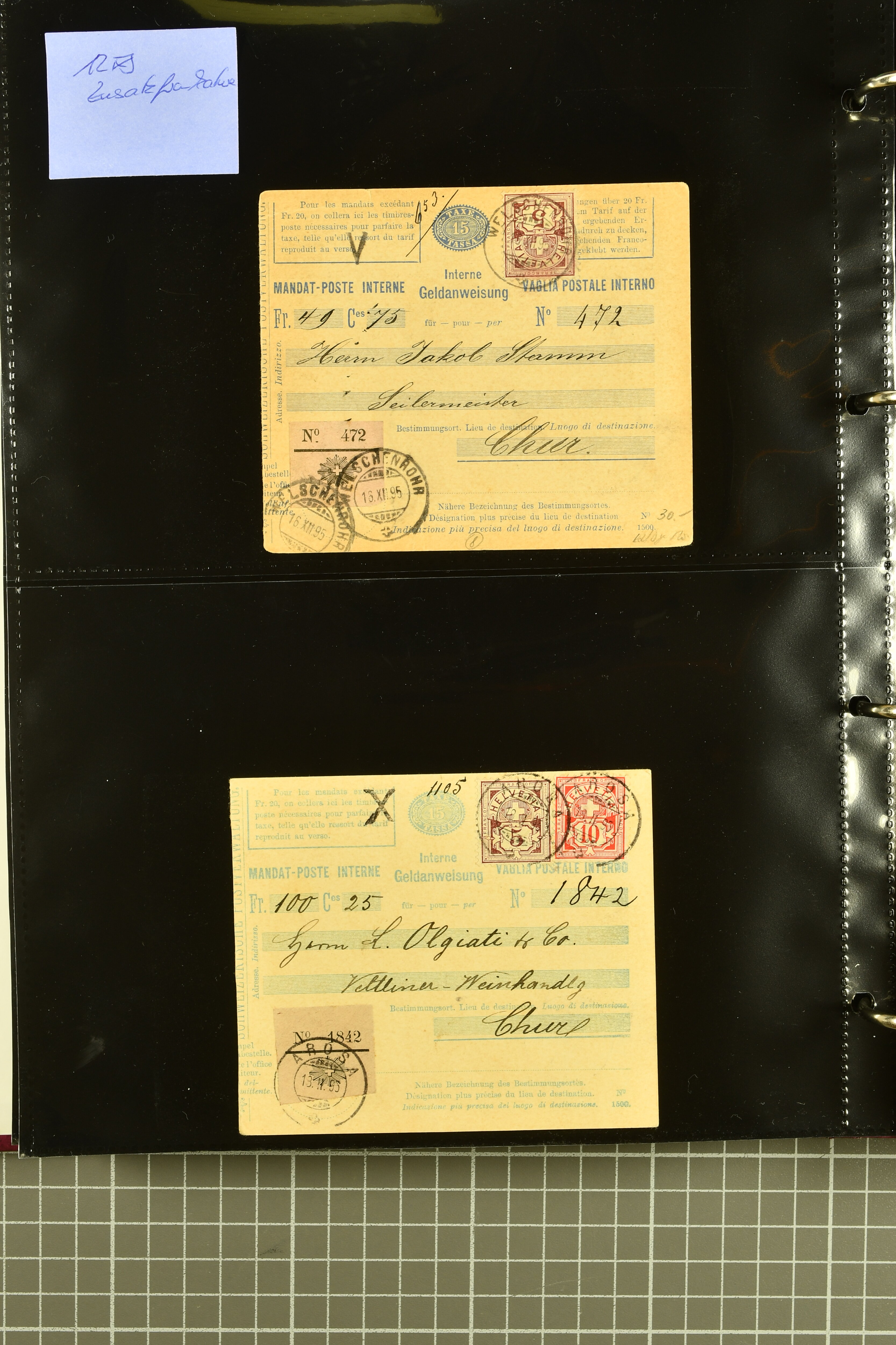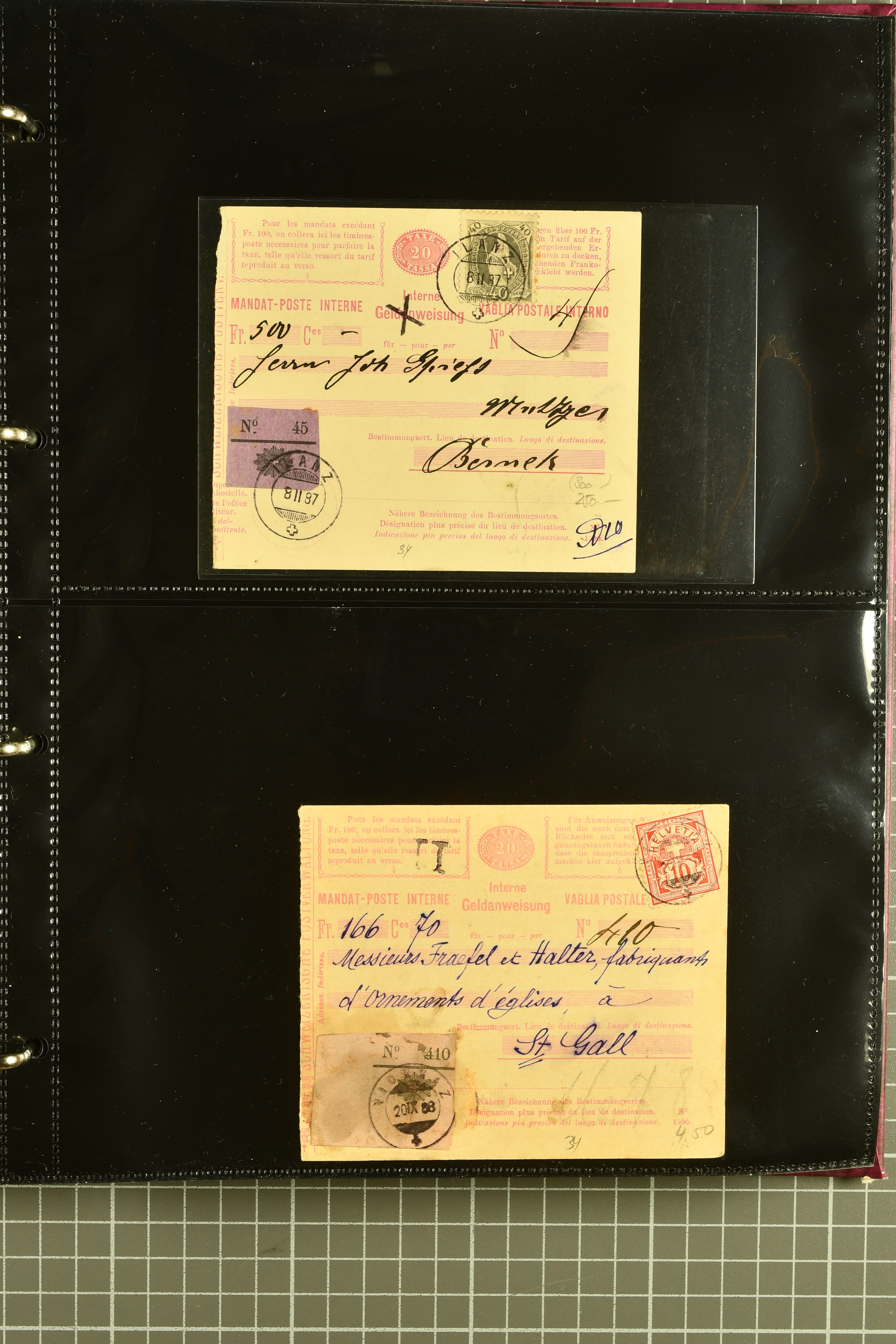 9896 cover image1867/1905ca: Lot 125 ungebrauchte / gebrauchte interne Geldanweisungen, die Ausgabe 1867 mit 20, 30 & 50 Rp. ungebraucht, 1860 OFFICIEL 40 Rp. grün gebraucht & ungebraucht, 50 Rp. lila gebraucht 1878 in WALTENSCHWYL und ungebraucht (2) sowie 60 Rp. gebraucht; 1869 zweiteilige Anweisung mit enger oder weiter Zähnung, der komplette Satz aller fünf Wertstufen ungebraucht, die Ausgaben bis 1875 in grosser Vielfalt, Ausgaben ab 1894 gebraucht ohne Coupon mit Zusatzfrankaturen Ziffer resp. Stehende (12), interessantes Los auch mit Vielzahl an Ortsstempeln, meist aus dem Zürcher Postkreis. SGSSV = CHF 1600+ (Image 1) (Image 2) (Image 3) (Image 4) (Image 5) (Image 6) (Image 7) (Image 8) (Image 9) (Image 10) (Image 11) (Image 12) (Image 13) (Image 14) (Image 15) (Image 16) (Image 17) (Image 18) (Image 19) (Image 20) (Image 21) (Image 22) (Image 23) (Image 24) (Image 25) (Image 26) (Image 27) (Image 28) (Image 29)