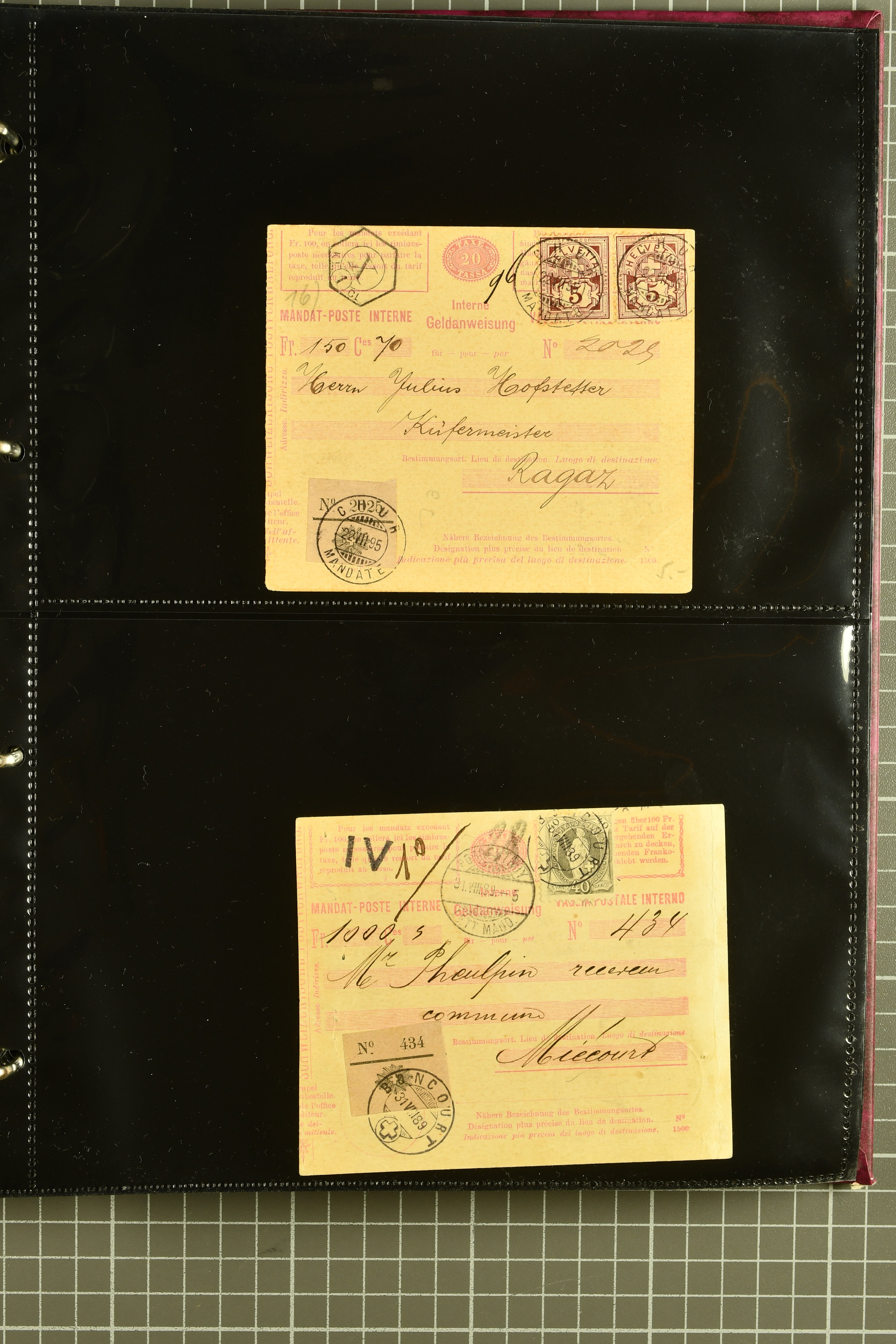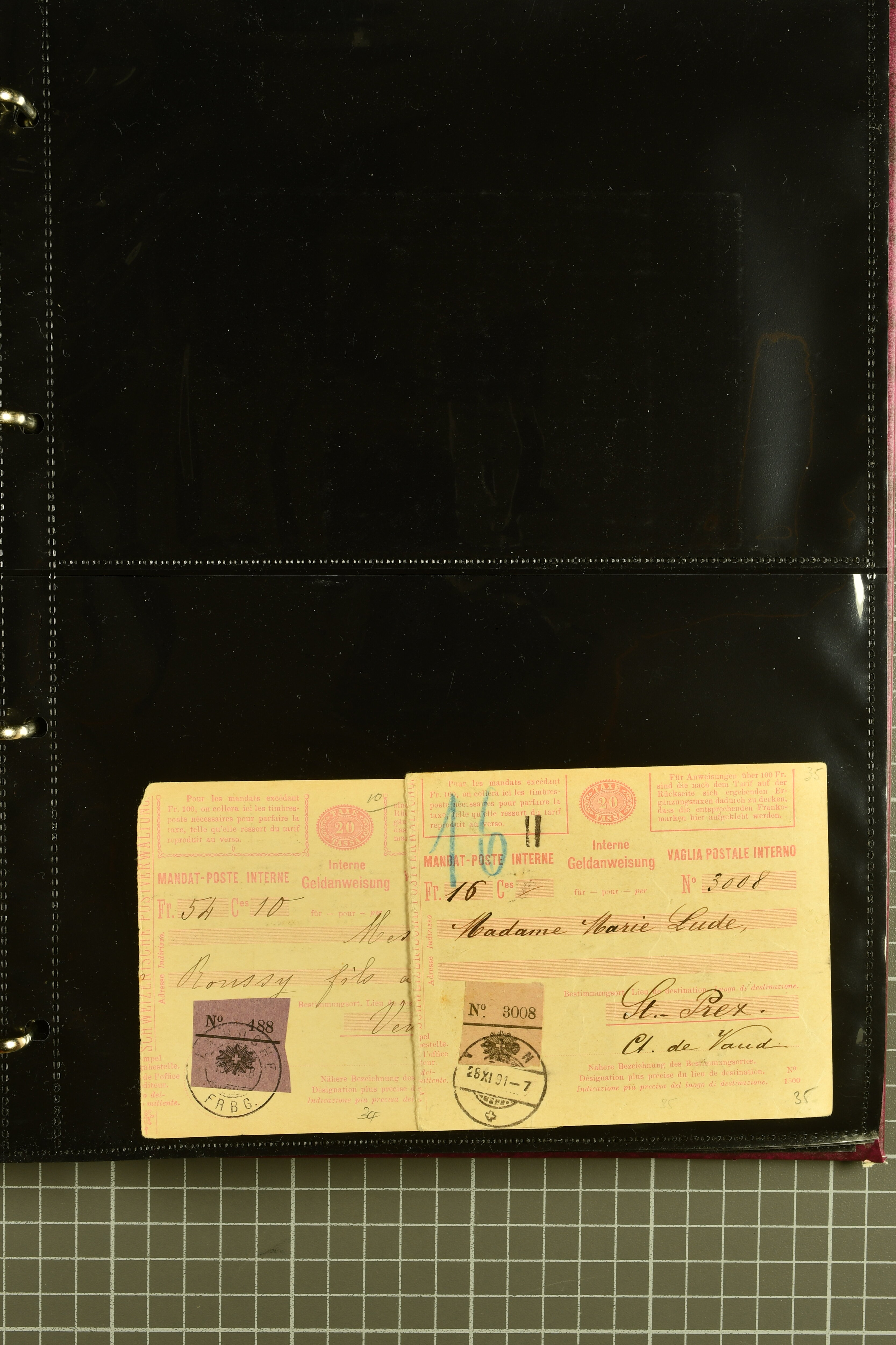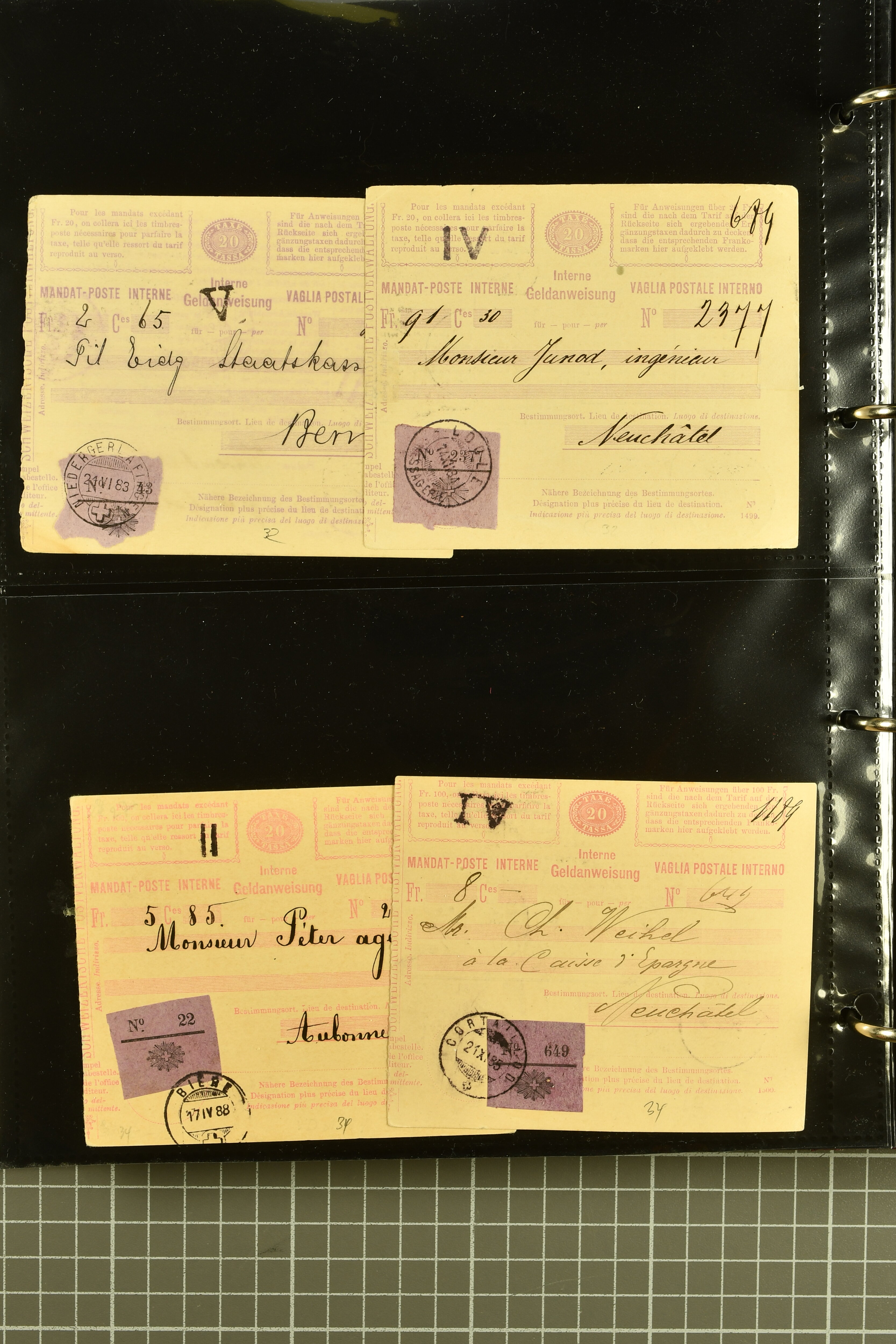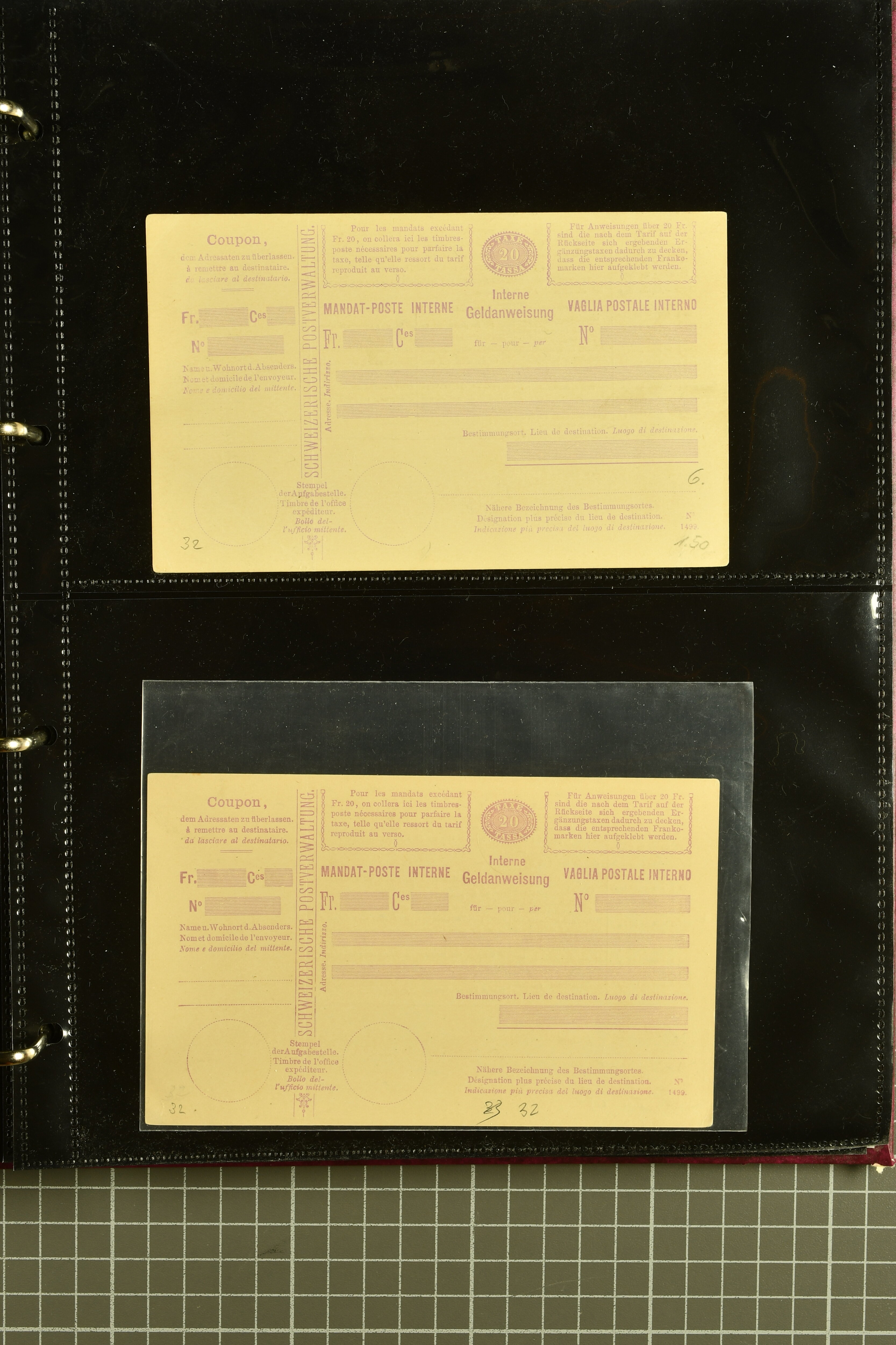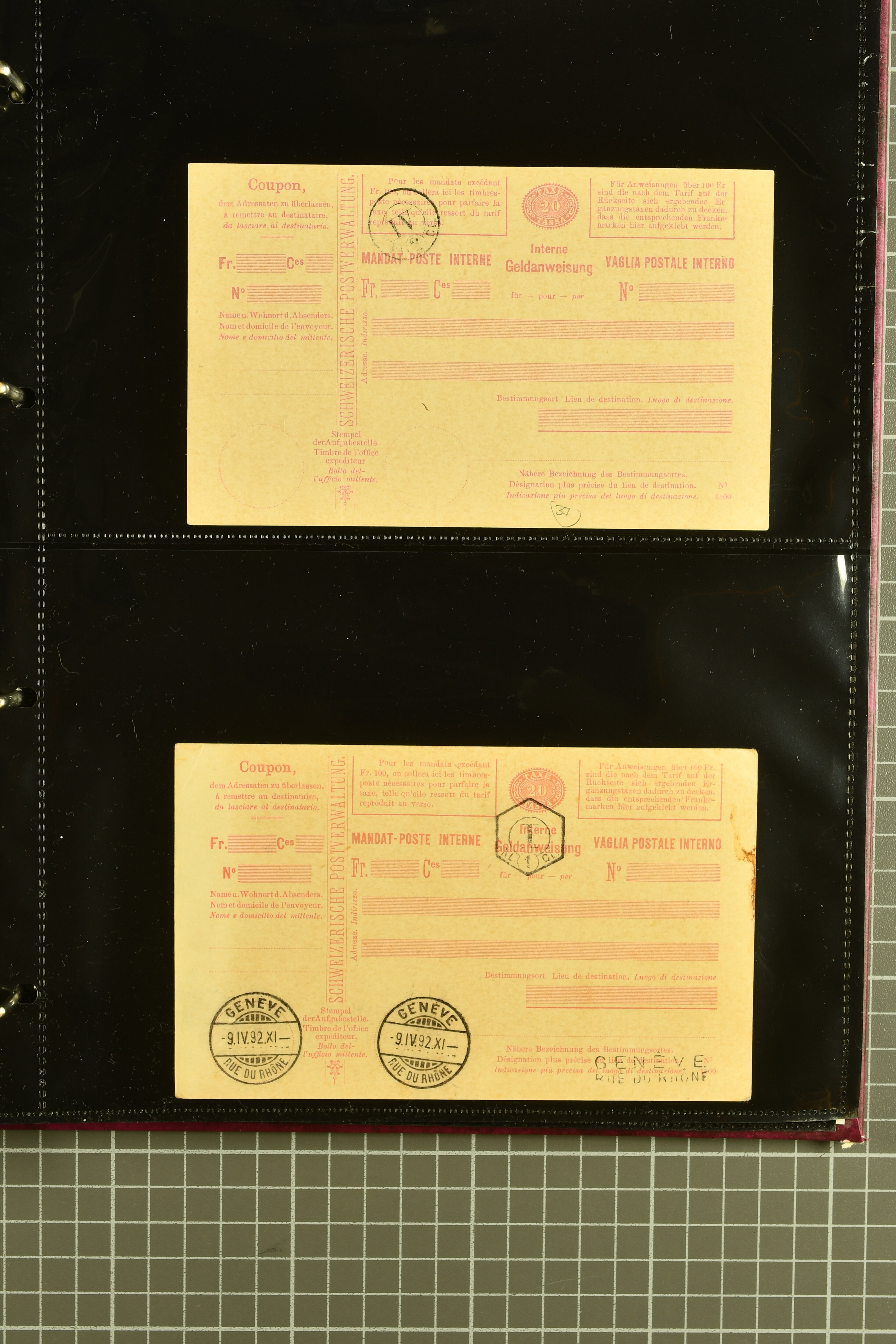 9896 cover image1867/1905ca: Lot 125 ungebrauchte / gebrauchte interne Geldanweisungen, die Ausgabe 1867 mit 20, 30 & 50 Rp. ungebraucht, 1860 OFFICIEL 40 Rp. grün gebraucht & ungebraucht, 50 Rp. lila gebraucht 1878 in WALTENSCHWYL und ungebraucht (2) sowie 60 Rp. gebraucht; 1869 zweiteilige Anweisung mit enger oder weiter Zähnung, der komplette Satz aller fünf Wertstufen ungebraucht, die Ausgaben bis 1875 in grosser Vielfalt, Ausgaben ab 1894 gebraucht ohne Coupon mit Zusatzfrankaturen Ziffer resp. Stehende (12), interessantes Los auch mit Vielzahl an Ortsstempeln, meist aus dem Zürcher Postkreis. SGSSV = CHF 1600+ (Image 1) (Image 2) (Image 3) (Image 4) (Image 5) (Image 6) (Image 7) (Image 8) (Image 9) (Image 10) (Image 11) (Image 12) (Image 13) (Image 14) (Image 15) (Image 16) (Image 17) (Image 18) (Image 19) (Image 20) (Image 21) (Image 22) (Image 23) (Image 24) (Image 25) (Image 26) (Image 27) (Image 28) (Image 29)