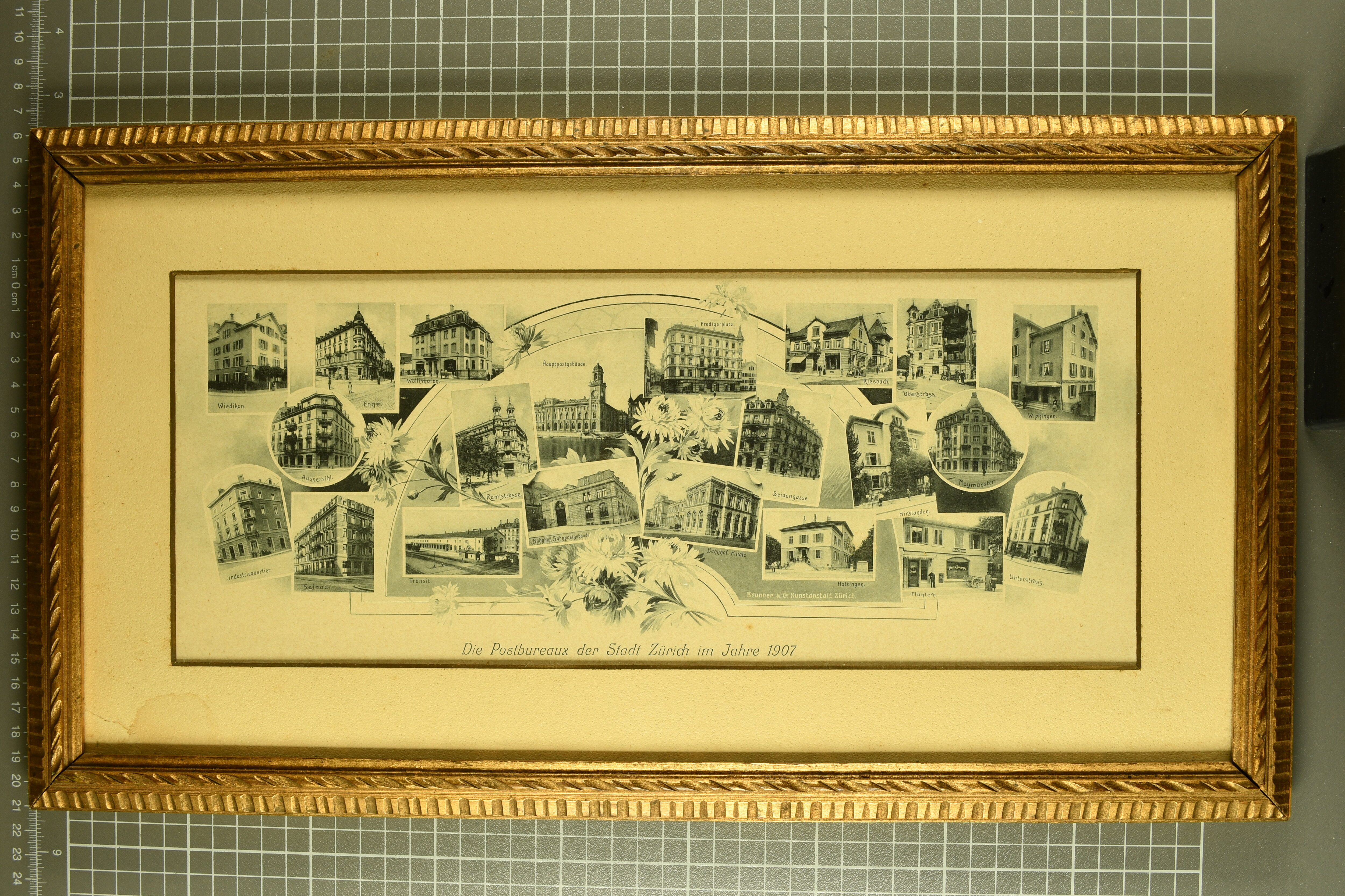 9883 image1907: Gerahmter Druck mit einer Zusammenstellung kleiner Fotografien unter dem Titel 'Die Postbureaux der Stadt Zürich im Jahre 1907'; im Stil zeitgenössischer Ansichtskarten, jedoch in grösserem Format. Passepartout links unten leicht fleckig, sonst gut erhalten. Abgebildet und beschriftet sind sämtliche 21 Postämter, einschliesslich jener der zuvor eingemeindeten Stadtteile. Herausgegeben von der Firma 'Brunner und C° Kunstanstalt Zürich' (Image 1)