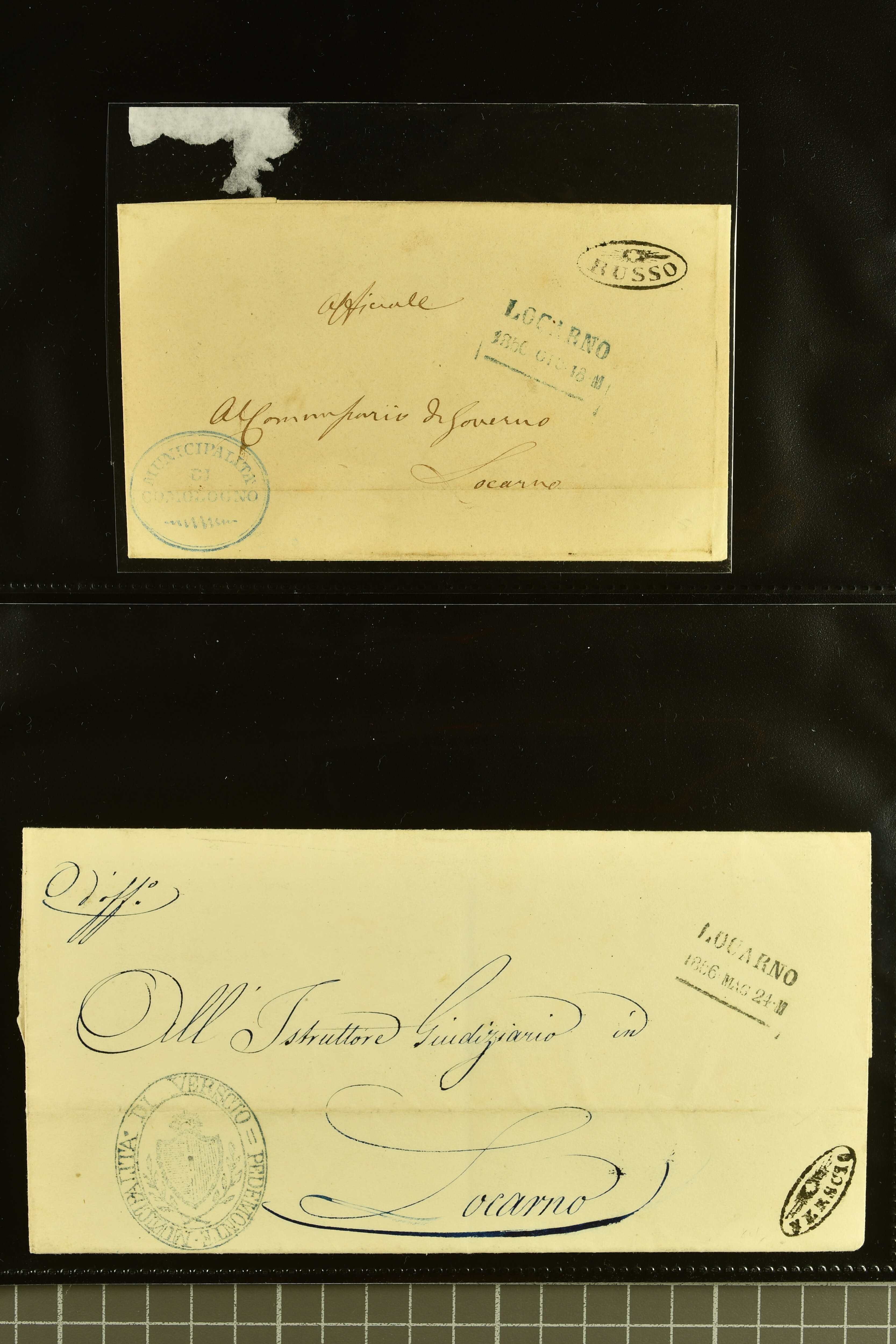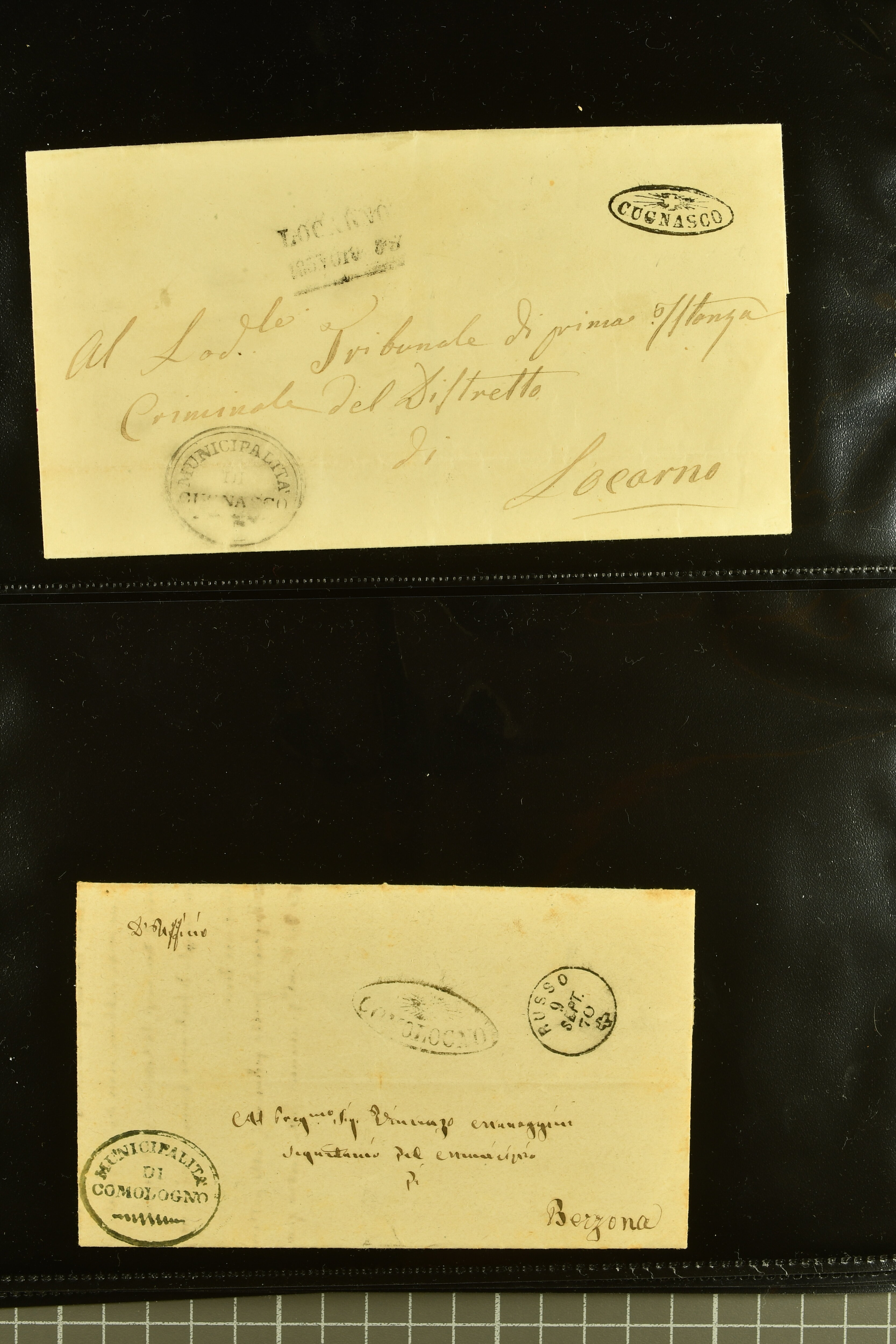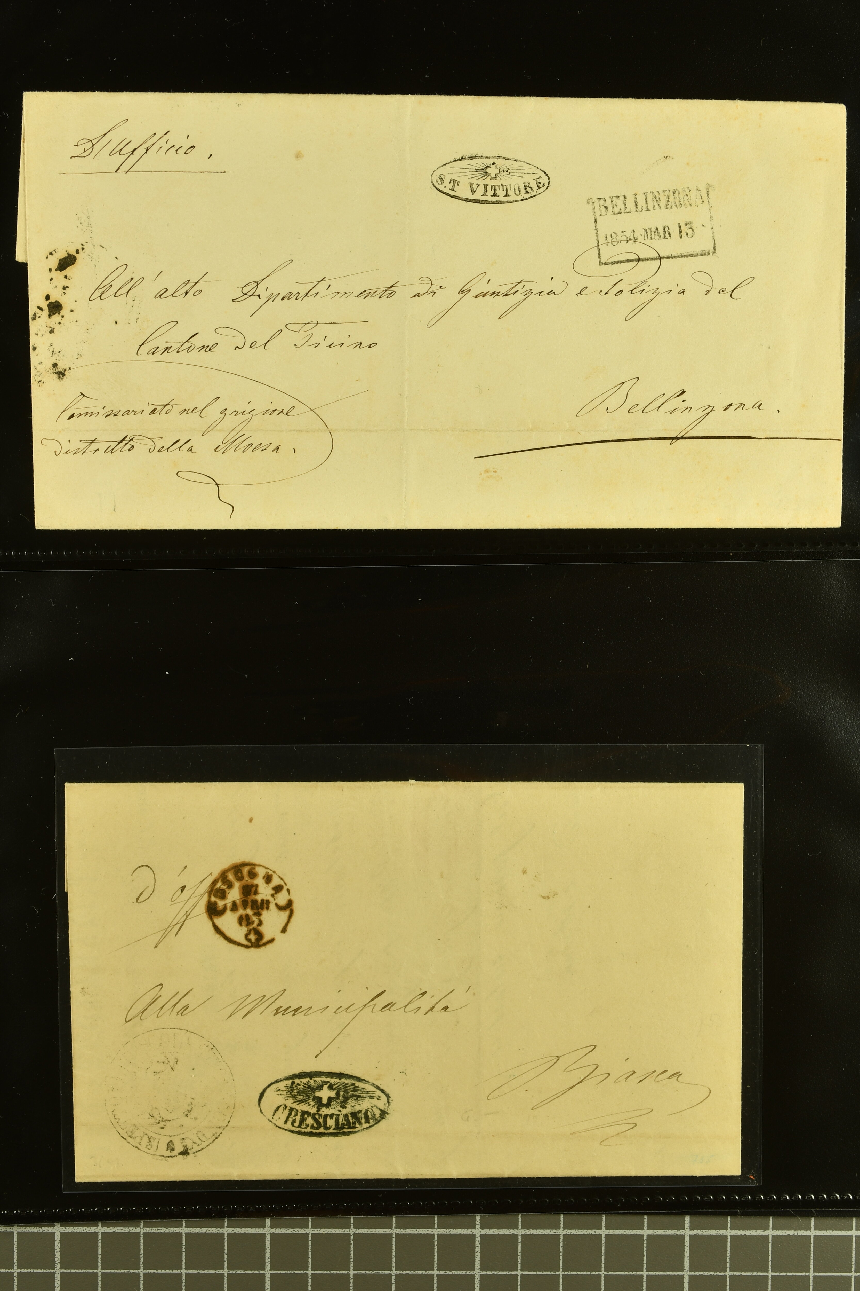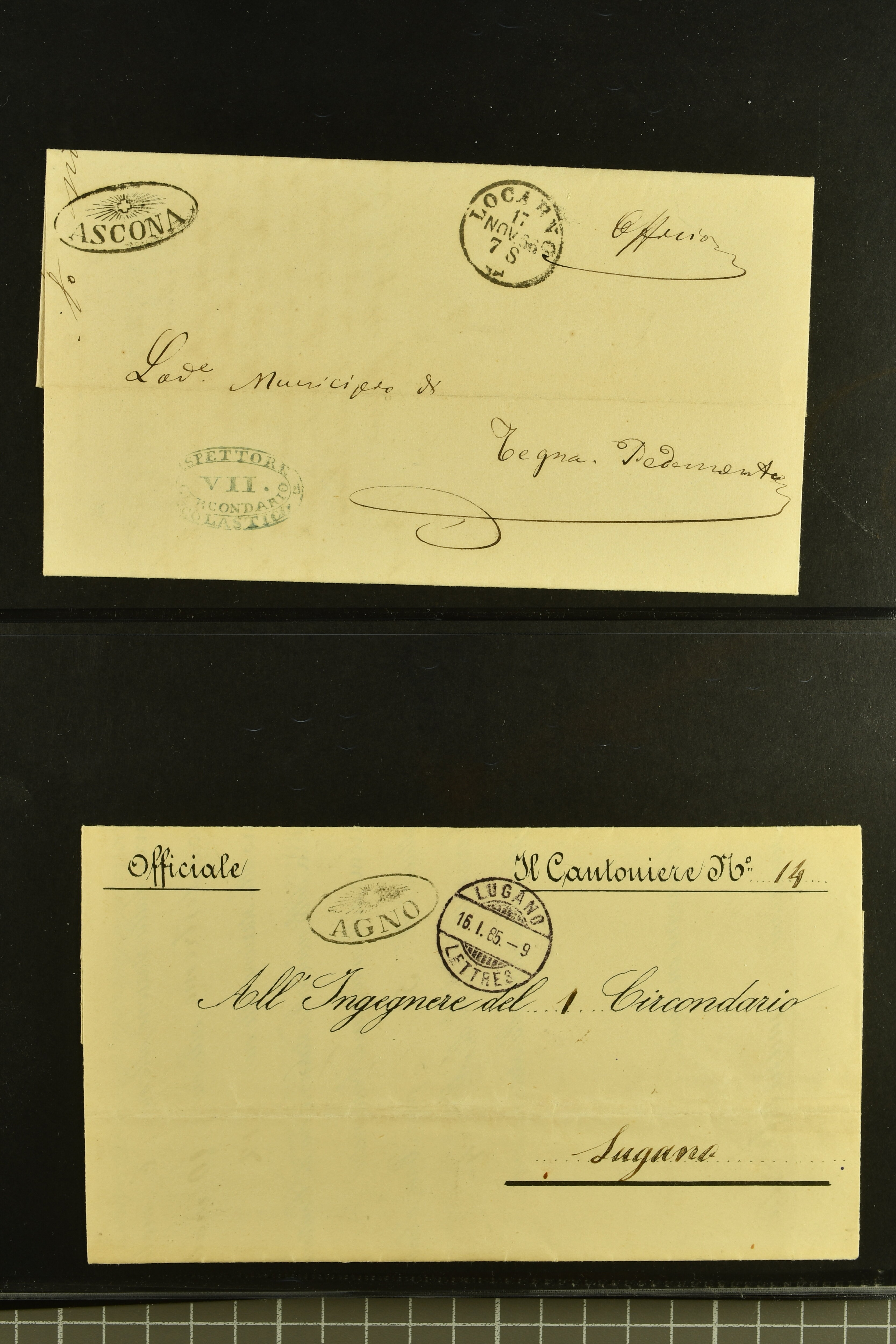 9875 cover imageStrahlenstempel Tessin, 1853/85: Lot 21 markenlose Briefe mit Abschlägen von Strahlenstempeln, bis auf einen unfrankierten Brief alles Dienstbriefe ex offo mit den entsprechenden Handstempeln der Gemeinde, ein ansprechendes Lot mit generell sauberen Abschlägen von ASCONA, AGNO aus dem Jahr 1885, BIGNASCO, CEVIO (2), CUGNASCO, COMOLOGNO, CAVIGLIANO, CERENTINO, CAPOLAGO, GIUMAGLIO, GORDOLA in bläulichem Schwarz, INTRAGNA, MAGLIASCO, PRATO, RUSSO, VERSCIO, MAGGIA, PONTE TRESA, ST. VITTORE, CRESCIANO II und CURIO (Image 1) (Image 2) (Image 3) (Image 4) (Image 5) (Image 6) (Image 7) (Image 8) (Image 9) (Image 10) (Image 11)