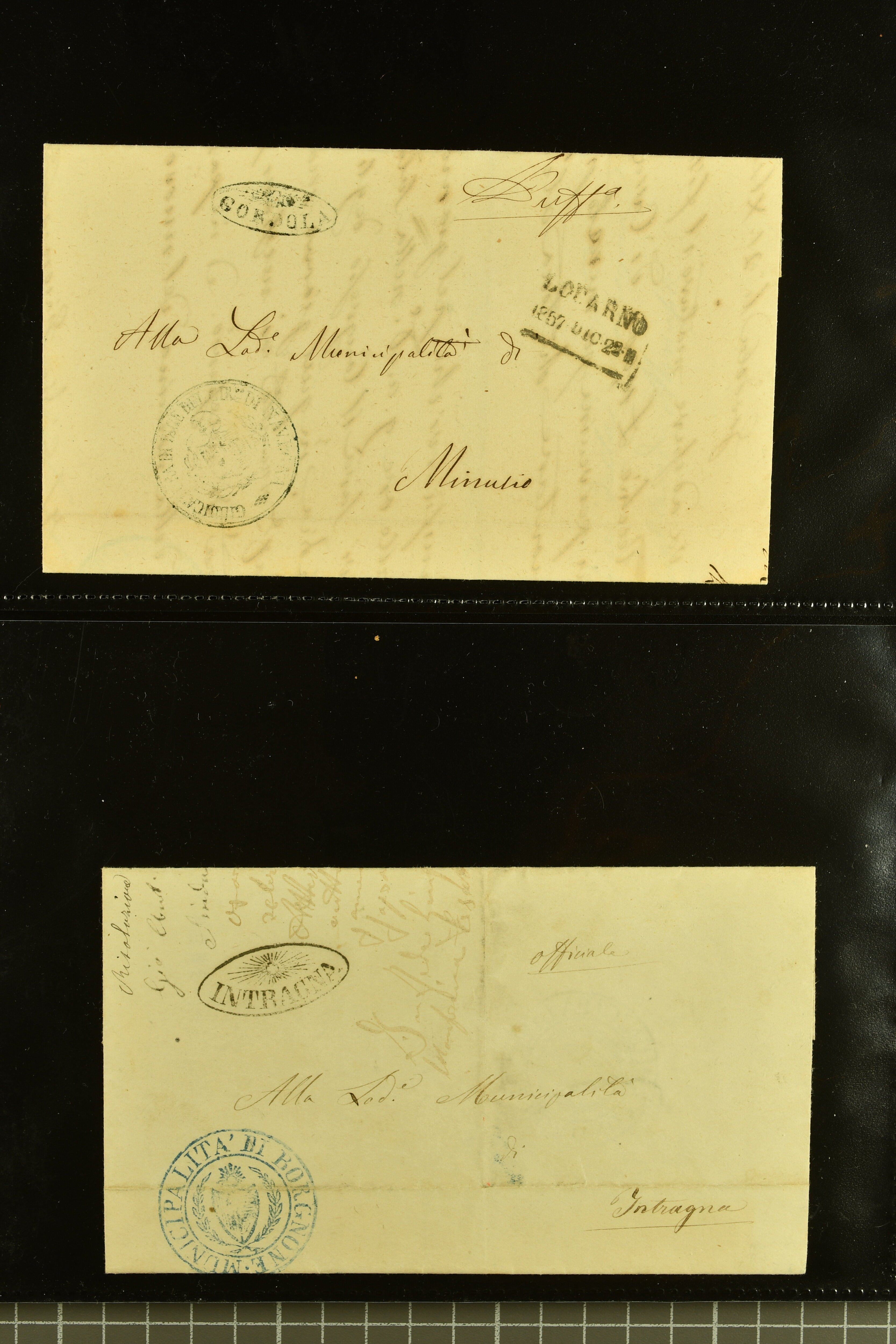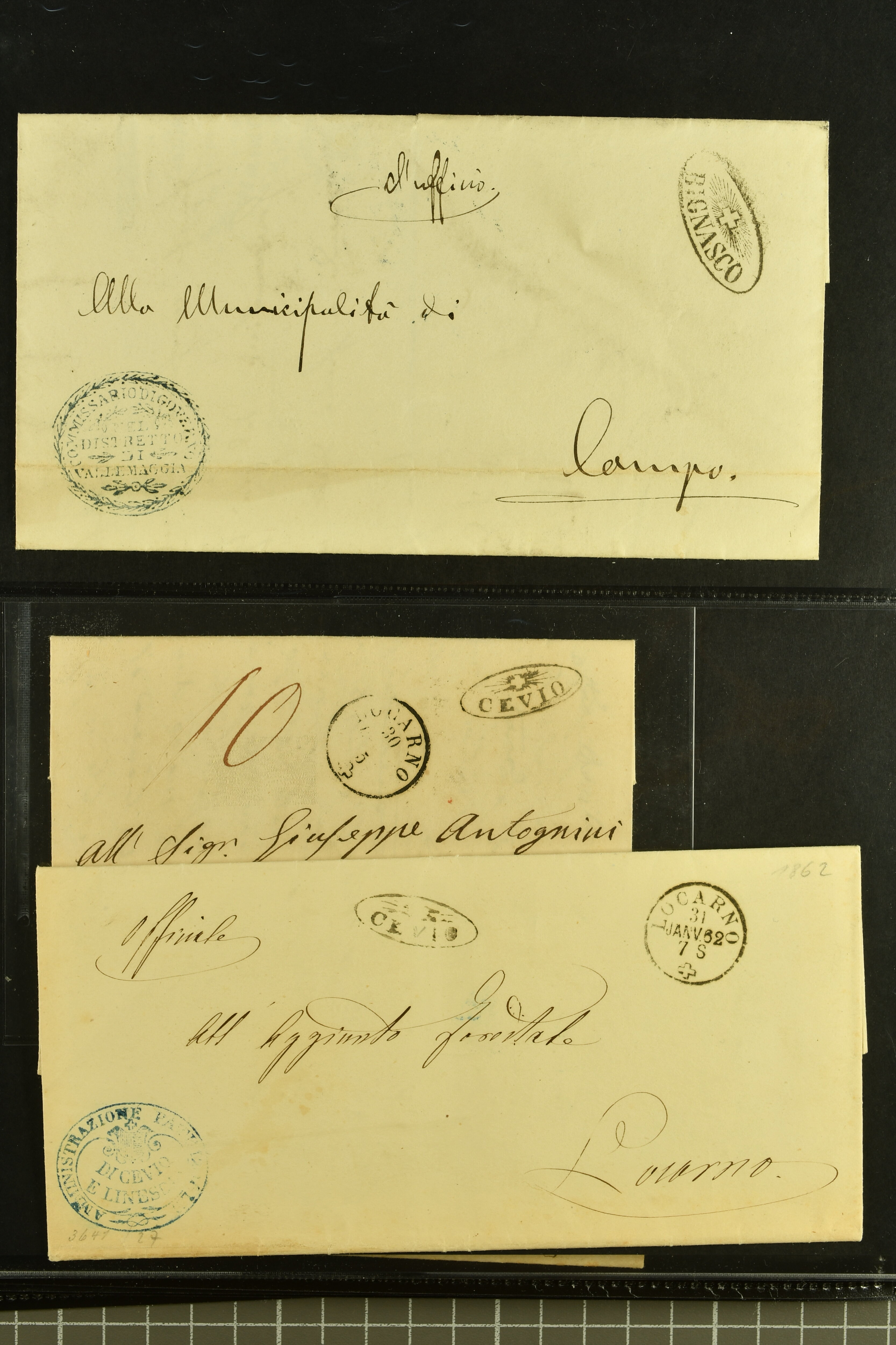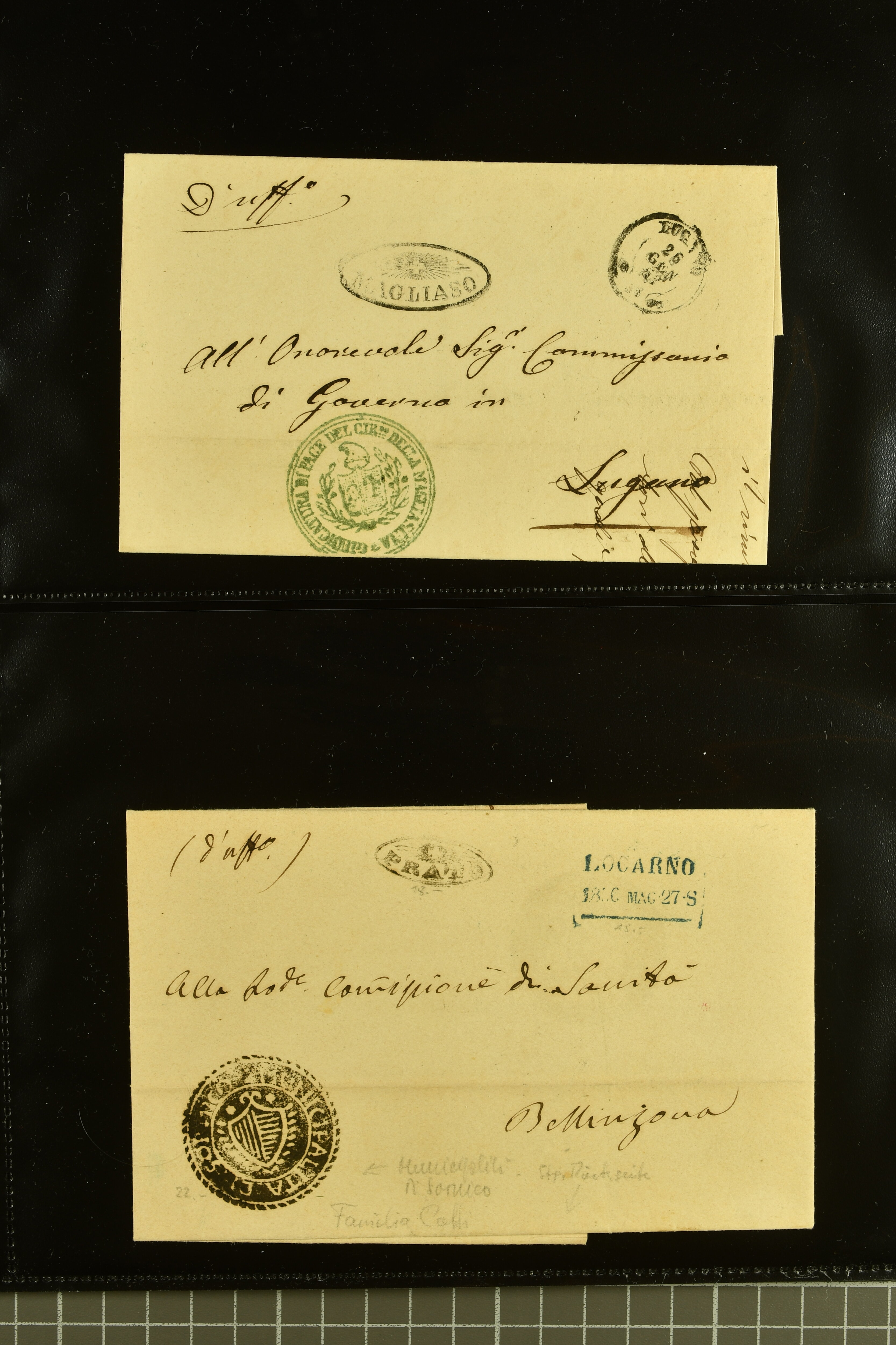9875 cover imageStrahlenstempel Tessin, 1853/85: Lot 21 markenlose Briefe mit Abschlägen von Strahlenstempeln, bis auf einen unfrankierten Brief alles Dienstbriefe ex offo mit den entsprechenden Handstempeln der Gemeinde, ein ansprechendes Lot mit generell sauberen Abschlägen von ASCONA, AGNO aus dem Jahr 1885, BIGNASCO, CEVIO (2), CUGNASCO, COMOLOGNO, CAVIGLIANO, CERENTINO, CAPOLAGO, GIUMAGLIO, GORDOLA in bläulichem Schwarz, INTRAGNA, MAGLIASCO, PRATO, RUSSO, VERSCIO, MAGGIA, PONTE TRESA, ST. VITTORE, CRESCIANO II und CURIO (Image 1) (Image 2) (Image 3) (Image 4) (Image 5) (Image 6) (Image 7) (Image 8) (Image 9) (Image 10) (Image 11)