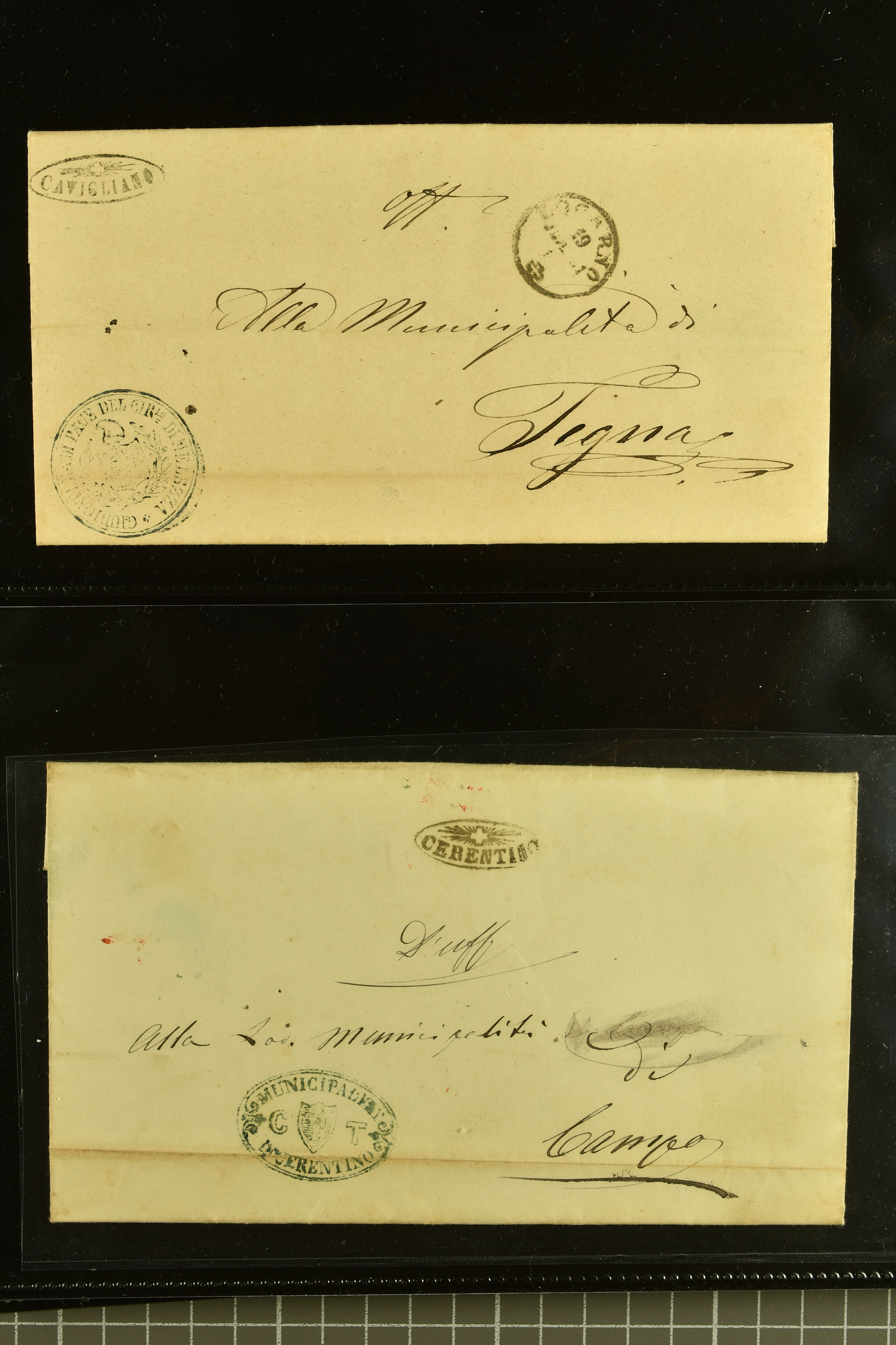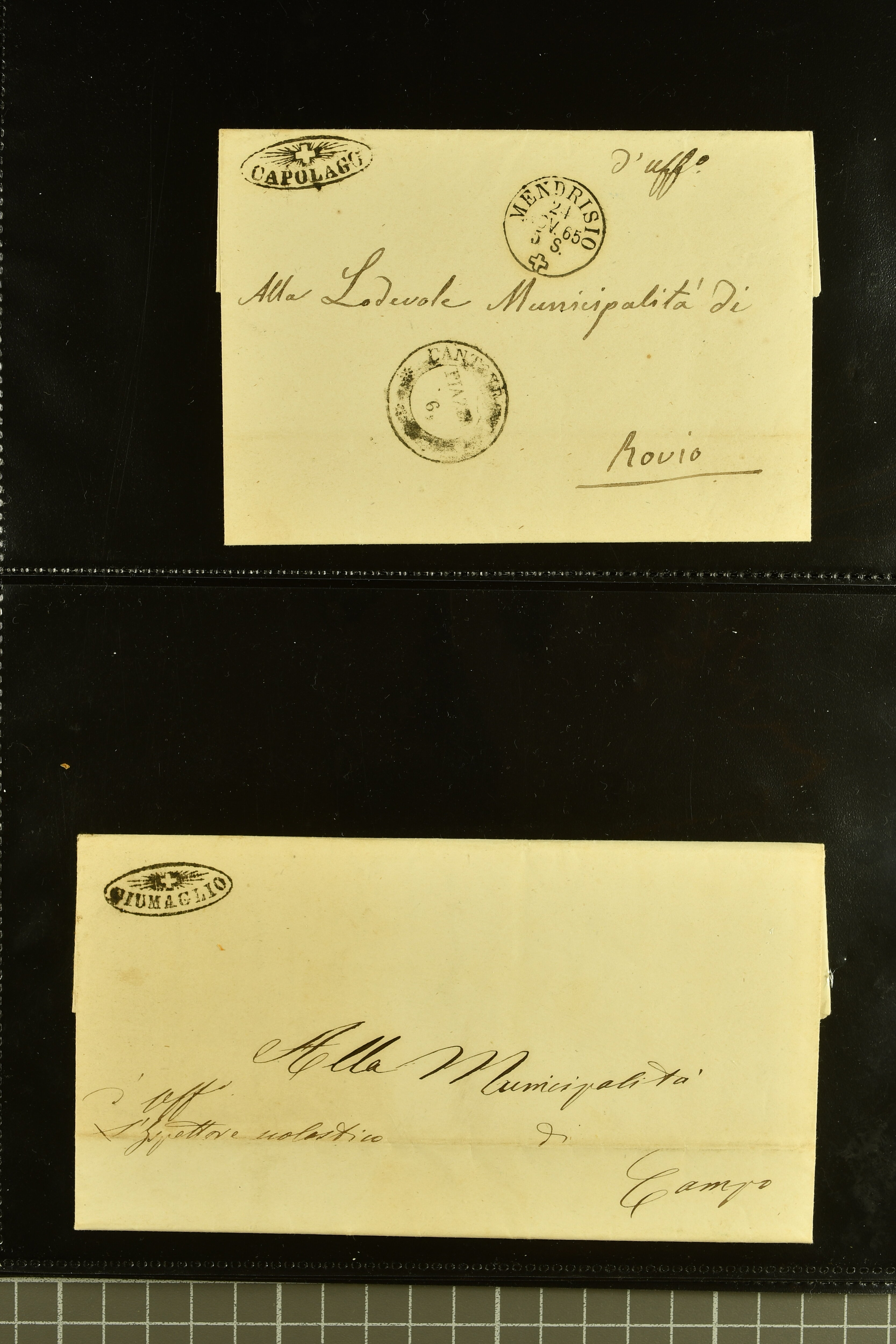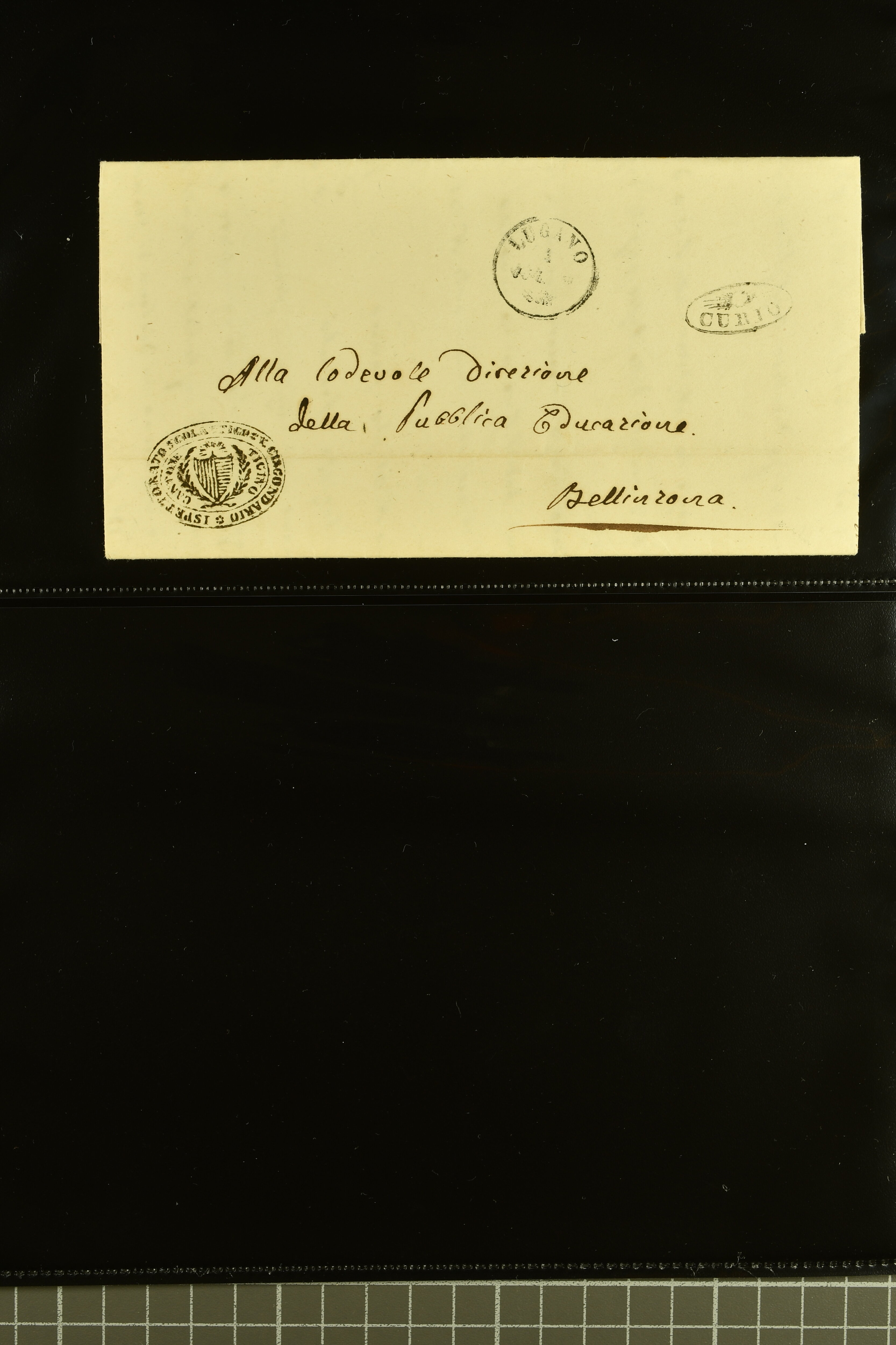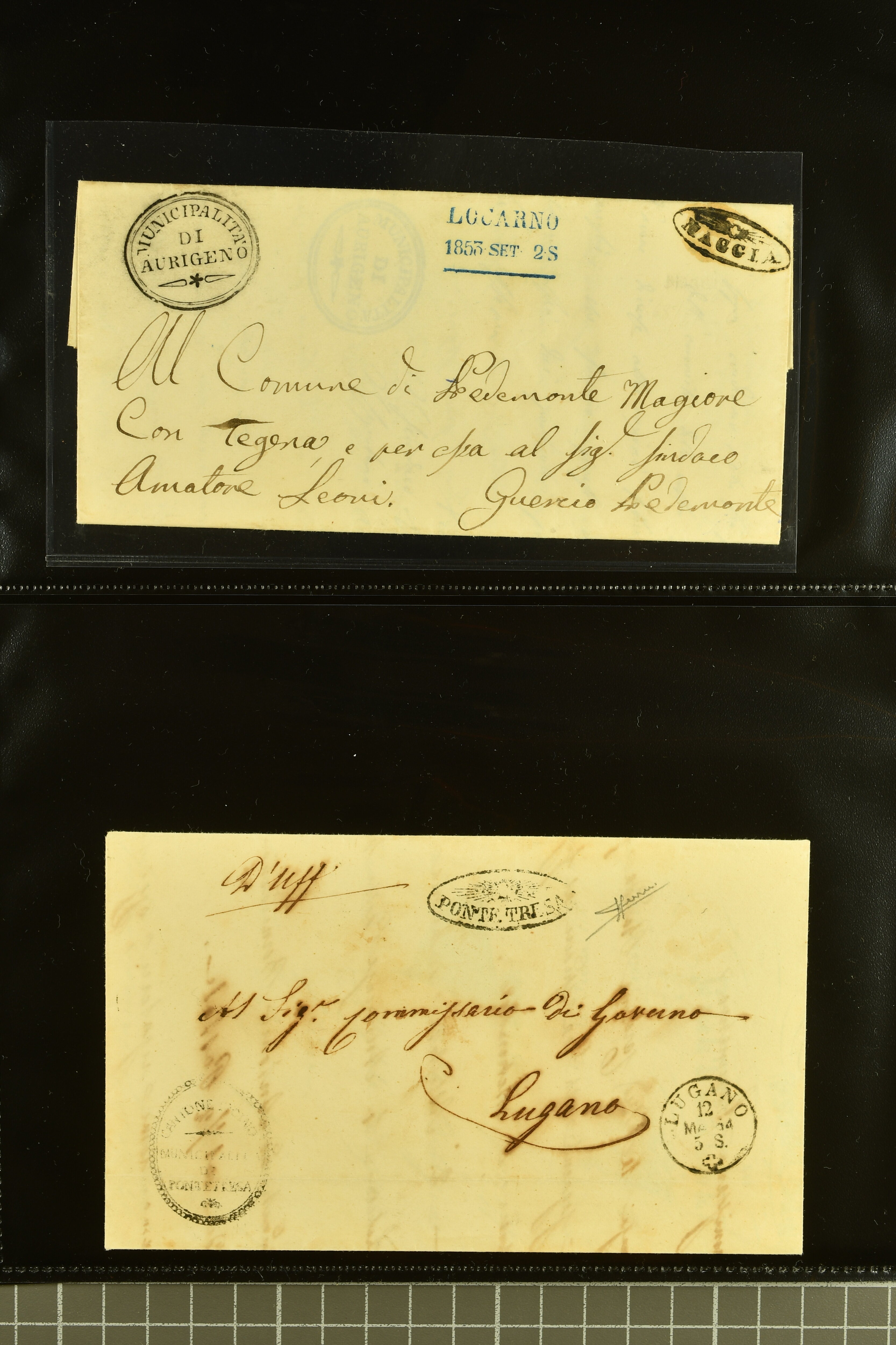 9875 cover imageStrahlenstempel Tessin, 1853/85: Lot 21 markenlose Briefe mit Abschlägen von Strahlenstempeln, bis auf einen unfrankierten Brief alles Dienstbriefe ex offo mit den entsprechenden Handstempeln der Gemeinde, ein ansprechendes Lot mit generell sauberen Abschlägen von ASCONA, AGNO aus dem Jahr 1885, BIGNASCO, CEVIO (2), CUGNASCO, COMOLOGNO, CAVIGLIANO, CERENTINO, CAPOLAGO, GIUMAGLIO, GORDOLA in bläulichem Schwarz, INTRAGNA, MAGLIASCO, PRATO, RUSSO, VERSCIO, MAGGIA, PONTE TRESA, ST. VITTORE, CRESCIANO II und CURIO (Image 1) (Image 2) (Image 3) (Image 4) (Image 5) (Image 6) (Image 7) (Image 8) (Image 9) (Image 10) (Image 11)