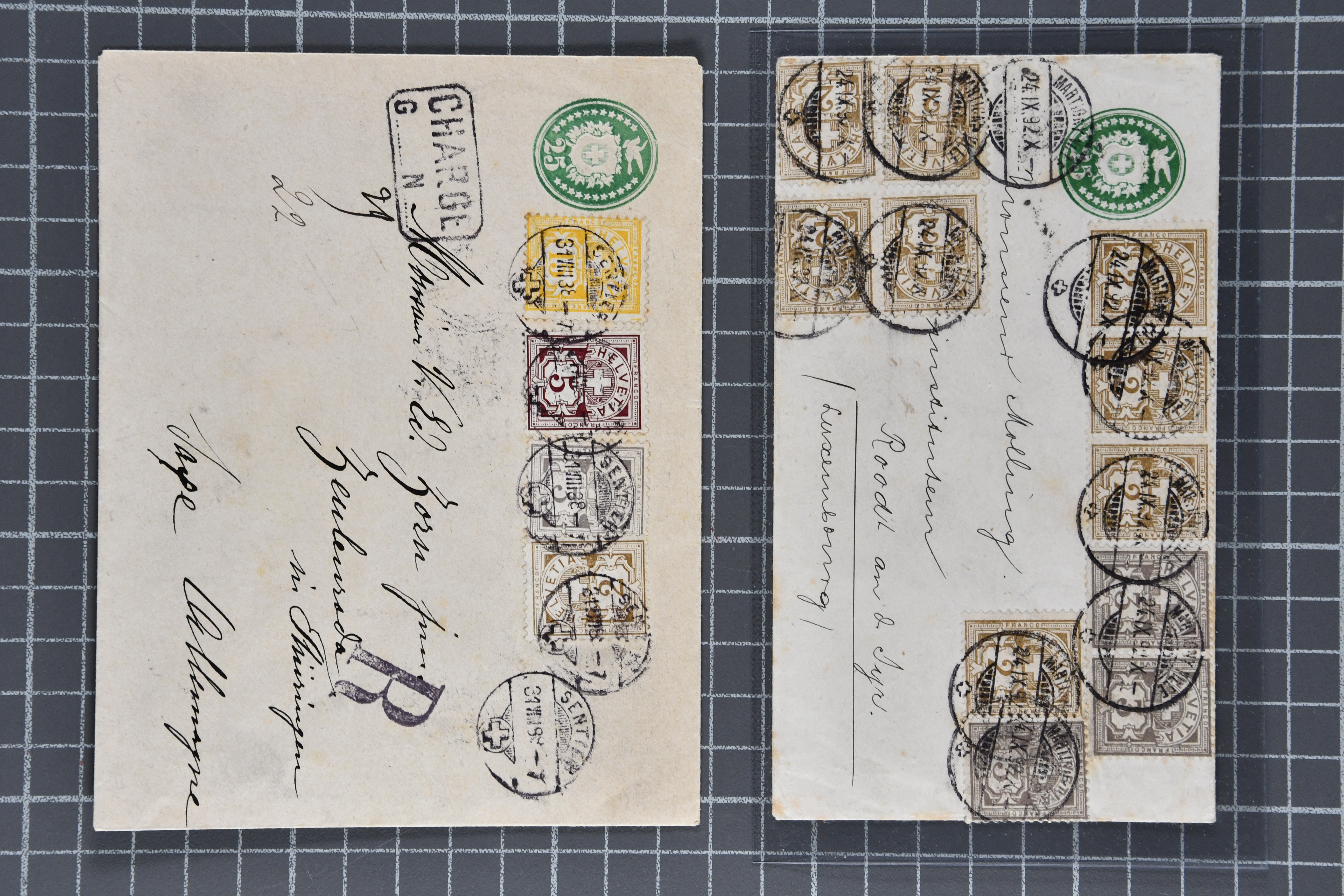 1888/96: Lot vier Tüblibriefe mit attraktiven Ziffermuster-Zusatzfrankaturen. Dabei 25 Rp. grün im kl. Format mit 2 Rp. olivbraun (8) und 3 Rp. grau (3) portogerecht für einen Breif der 2. Gewichtsstufe von