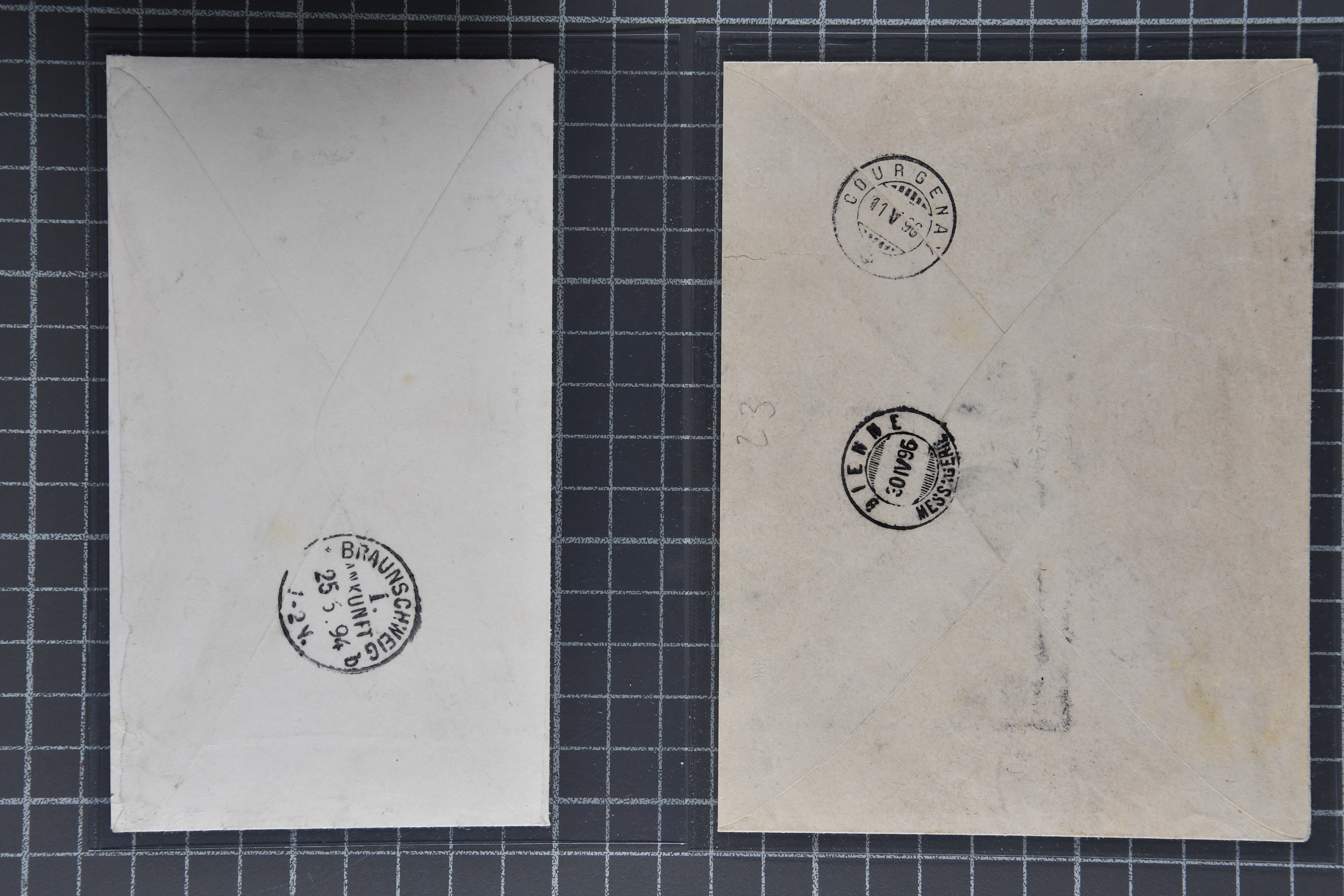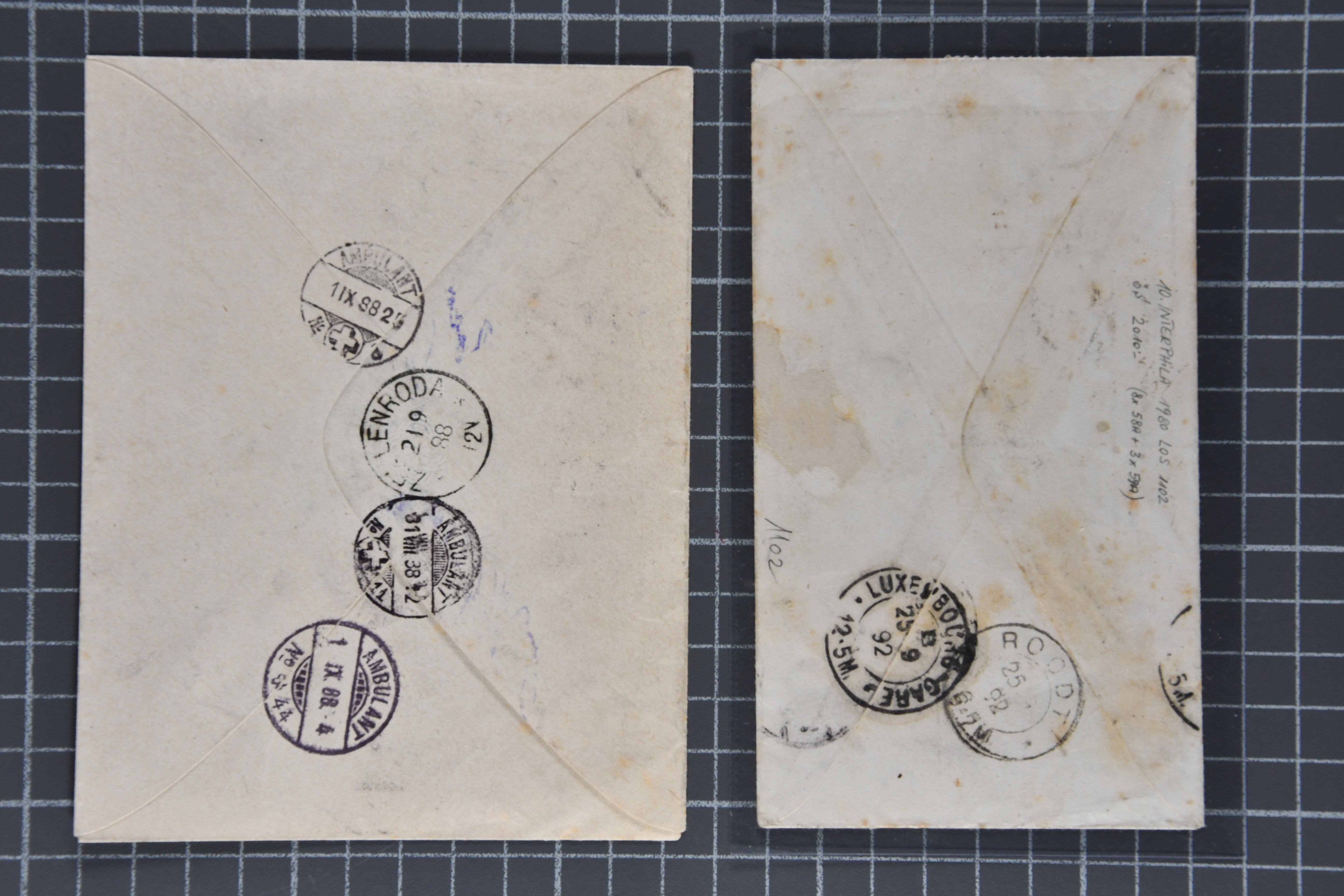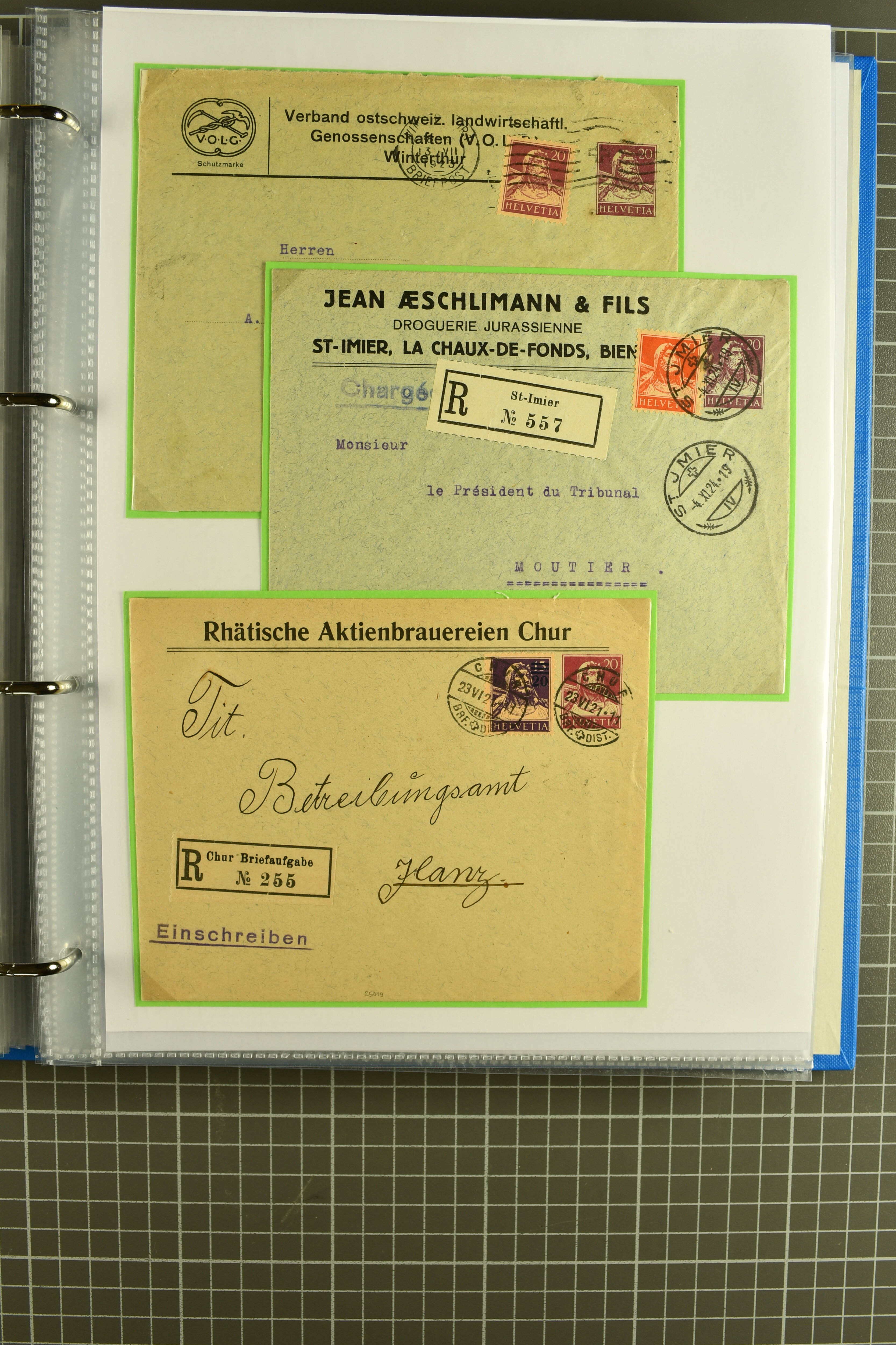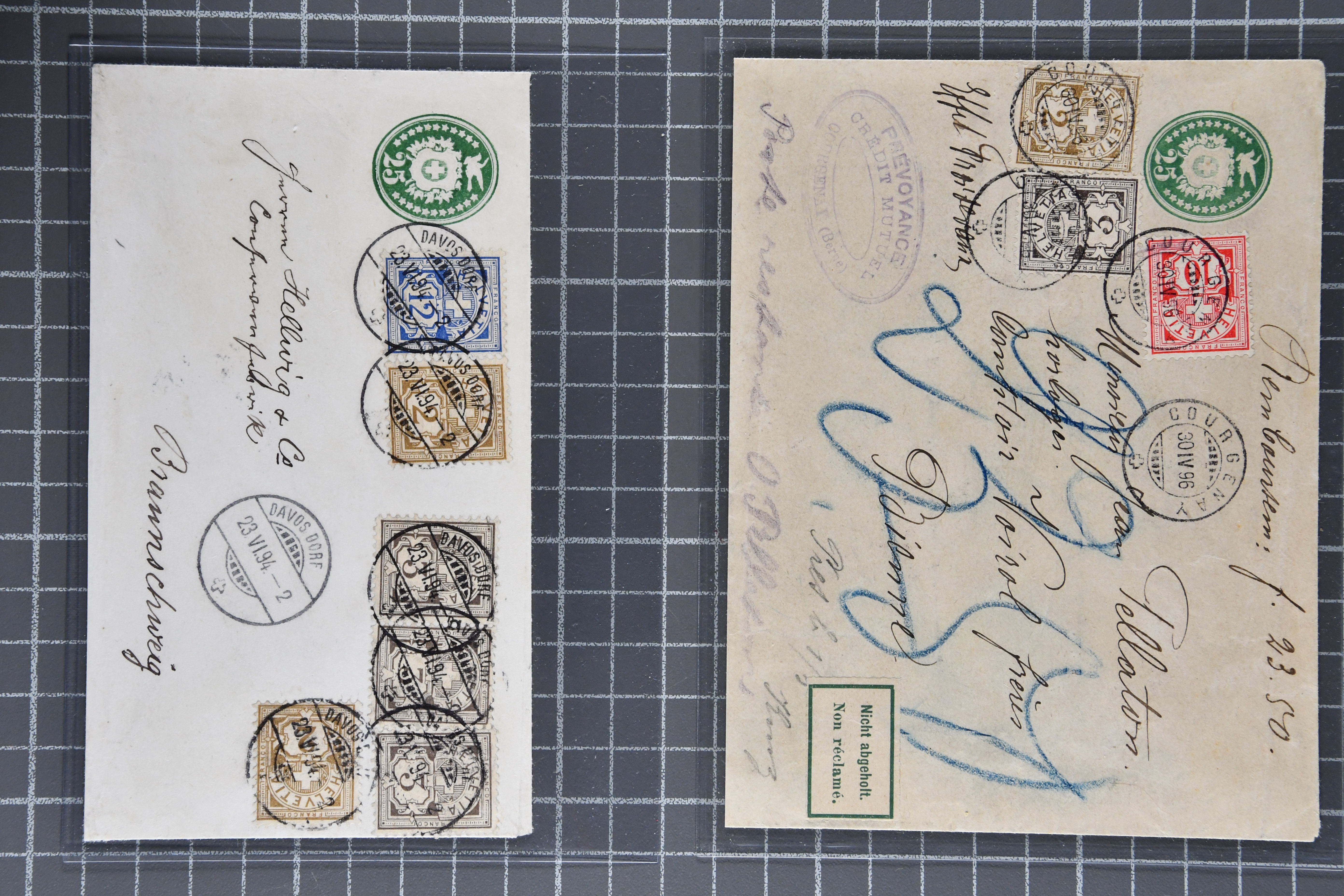 Martigny nach Roodt, Luxemburg, ein ebensolcher Umschlag mit Zusatzfrankatur 2 Rp. olivbraun (2), 3 Rp. grau (3) und 12 Rp. ultramarin zum selben Tarif von Davos Dorf nach Braunschweig, Deutschland, 25 Rp. grün im gr. Format mit
