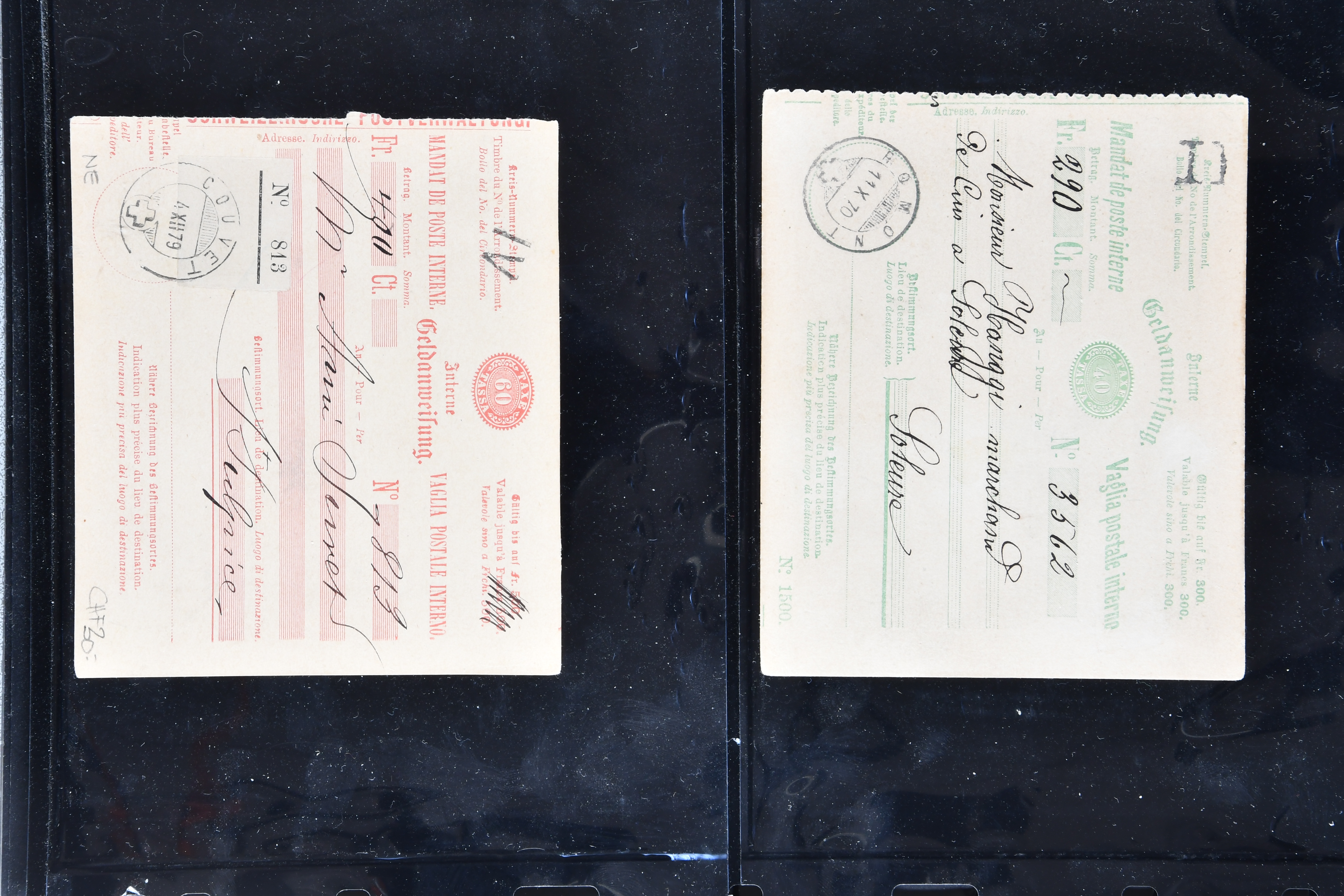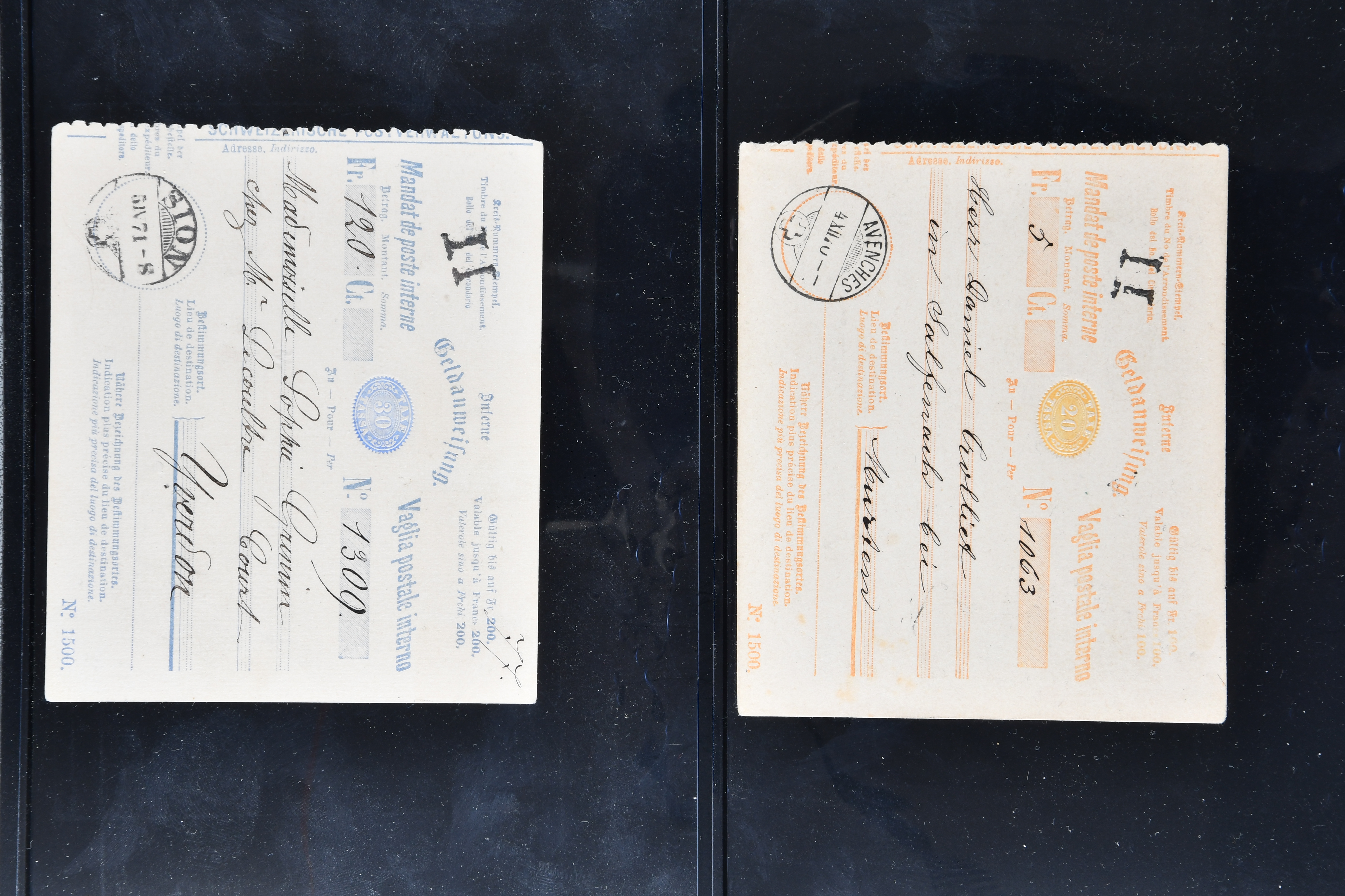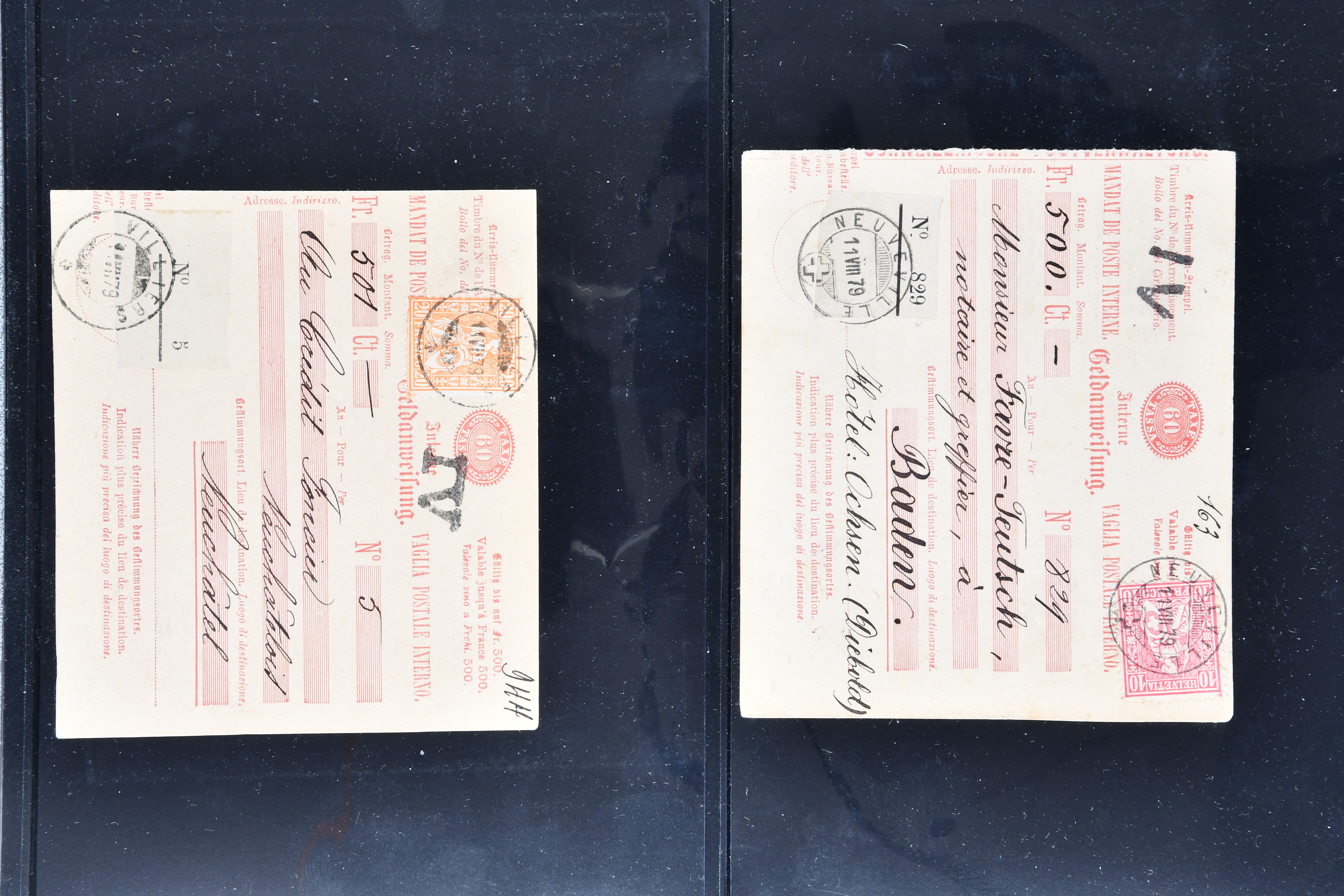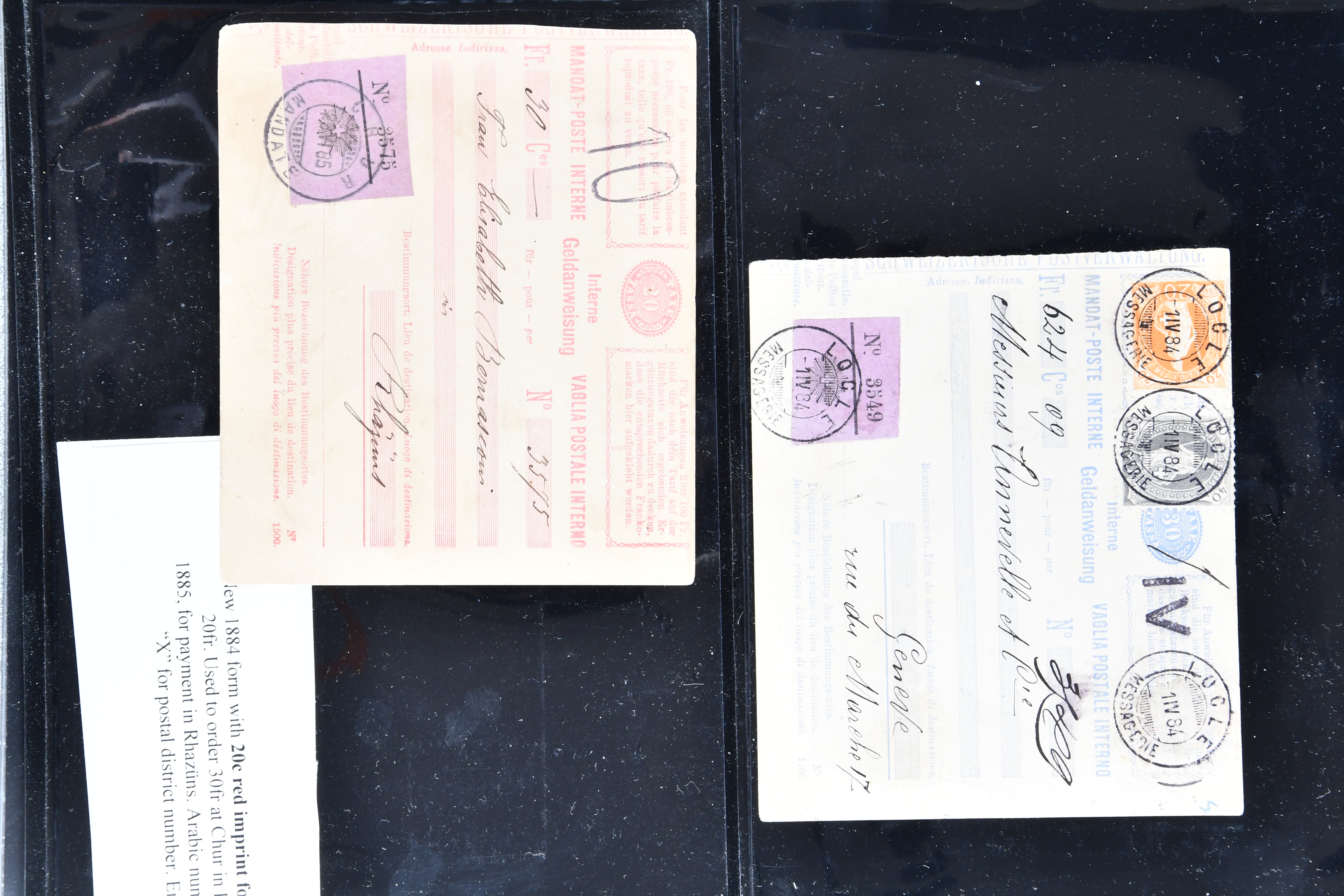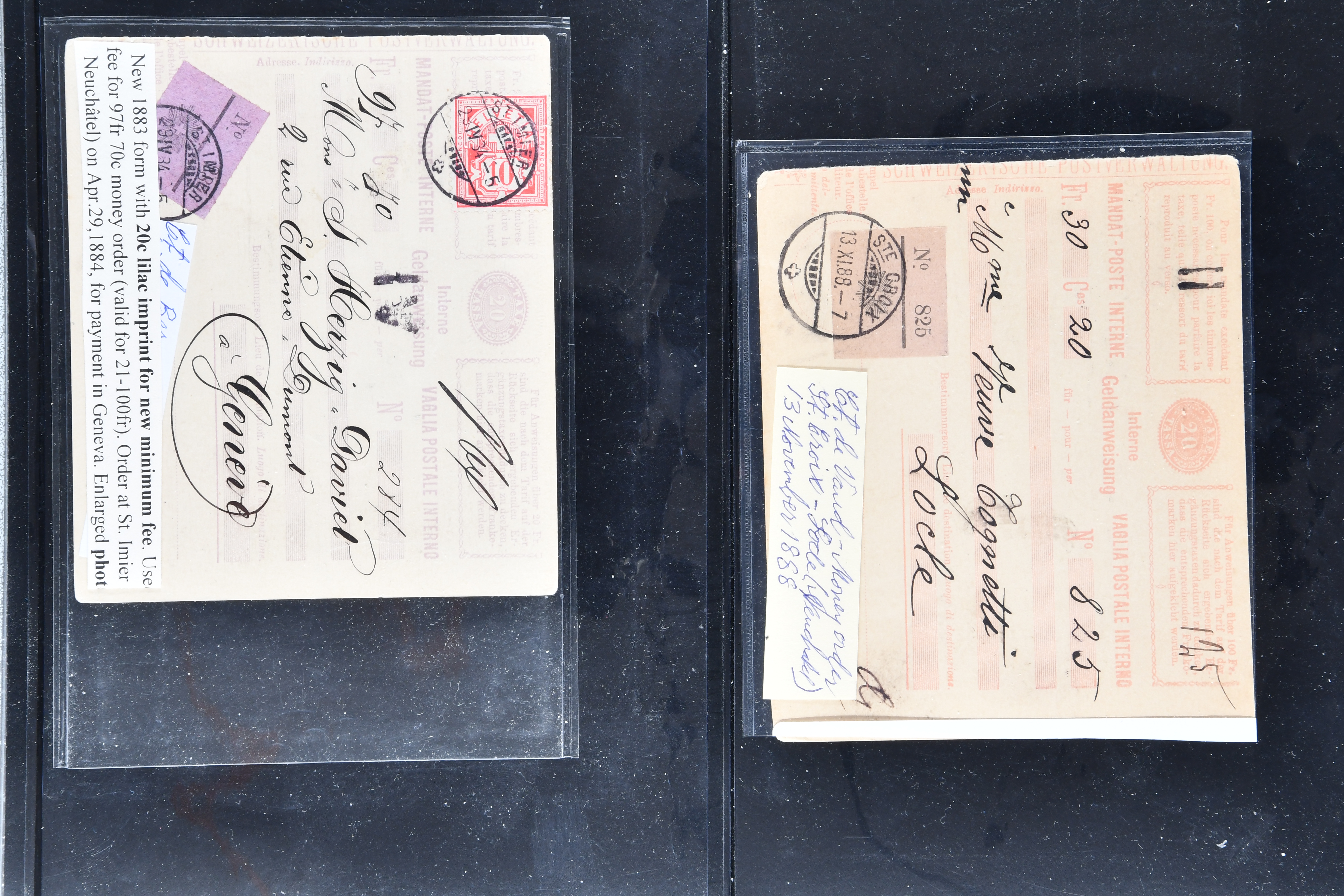 karmin (SGSSV: GA-I 20) je einmal mit Zusatzfrankatur Sitzende Helvetia 10 Rp. rot (SBK 38) als Anweisung über Fr. 500 von La Neuveville nach Baden resp. 20 Rp. orange (SBK 32) als Anweisung über Fr. 501 von Villiers nach Neuenburg, 1884, 20 Rp. rot