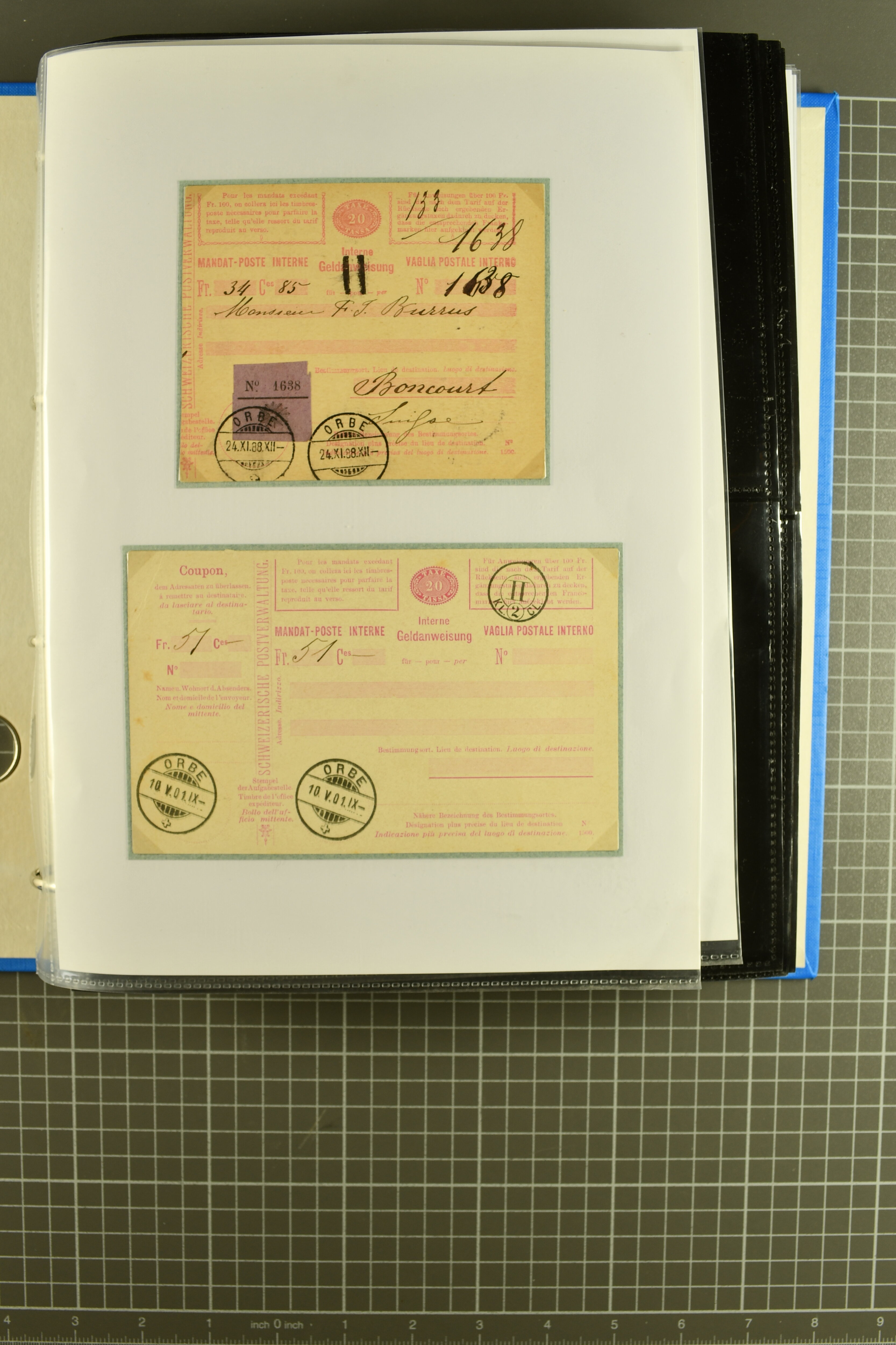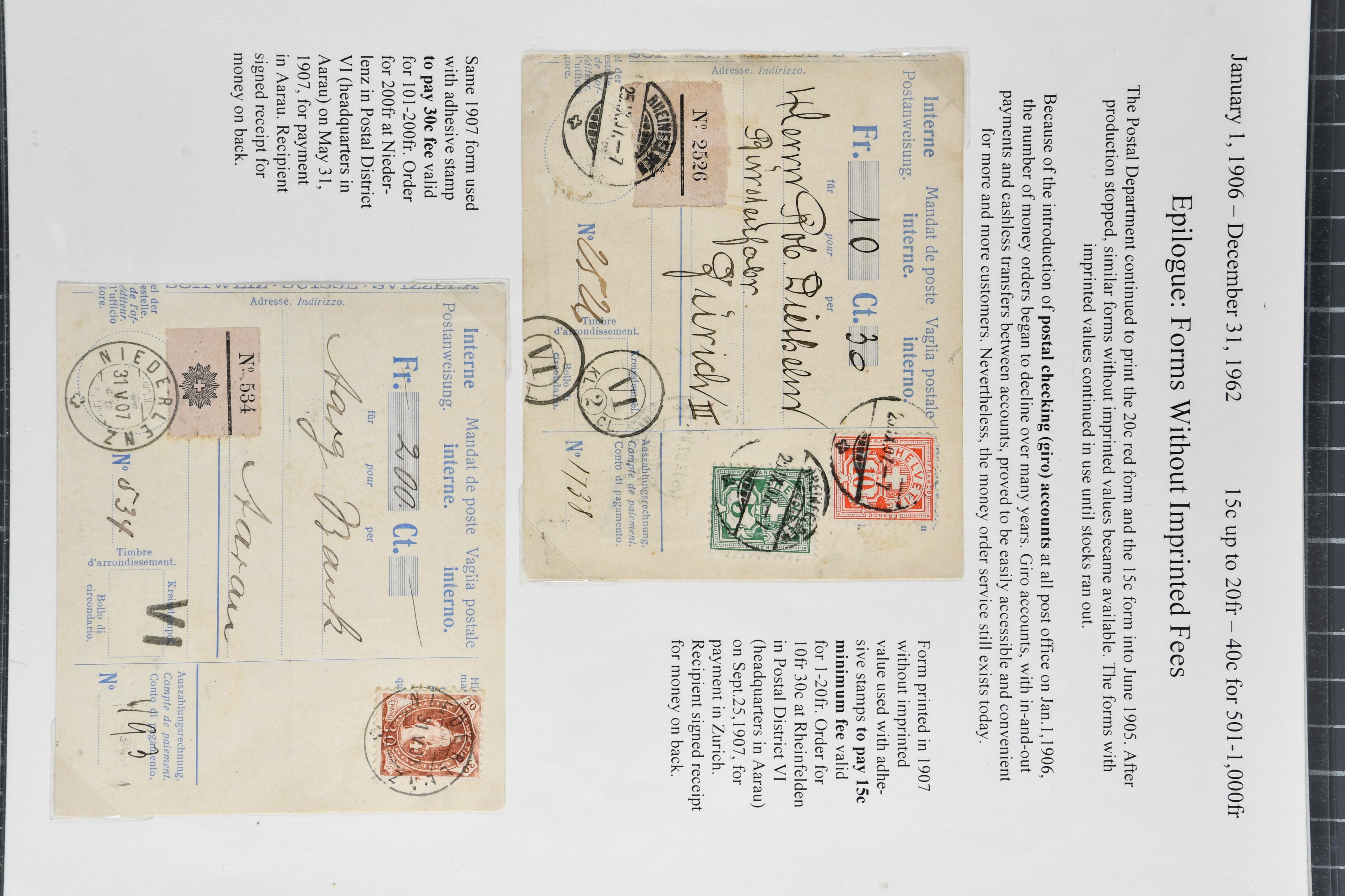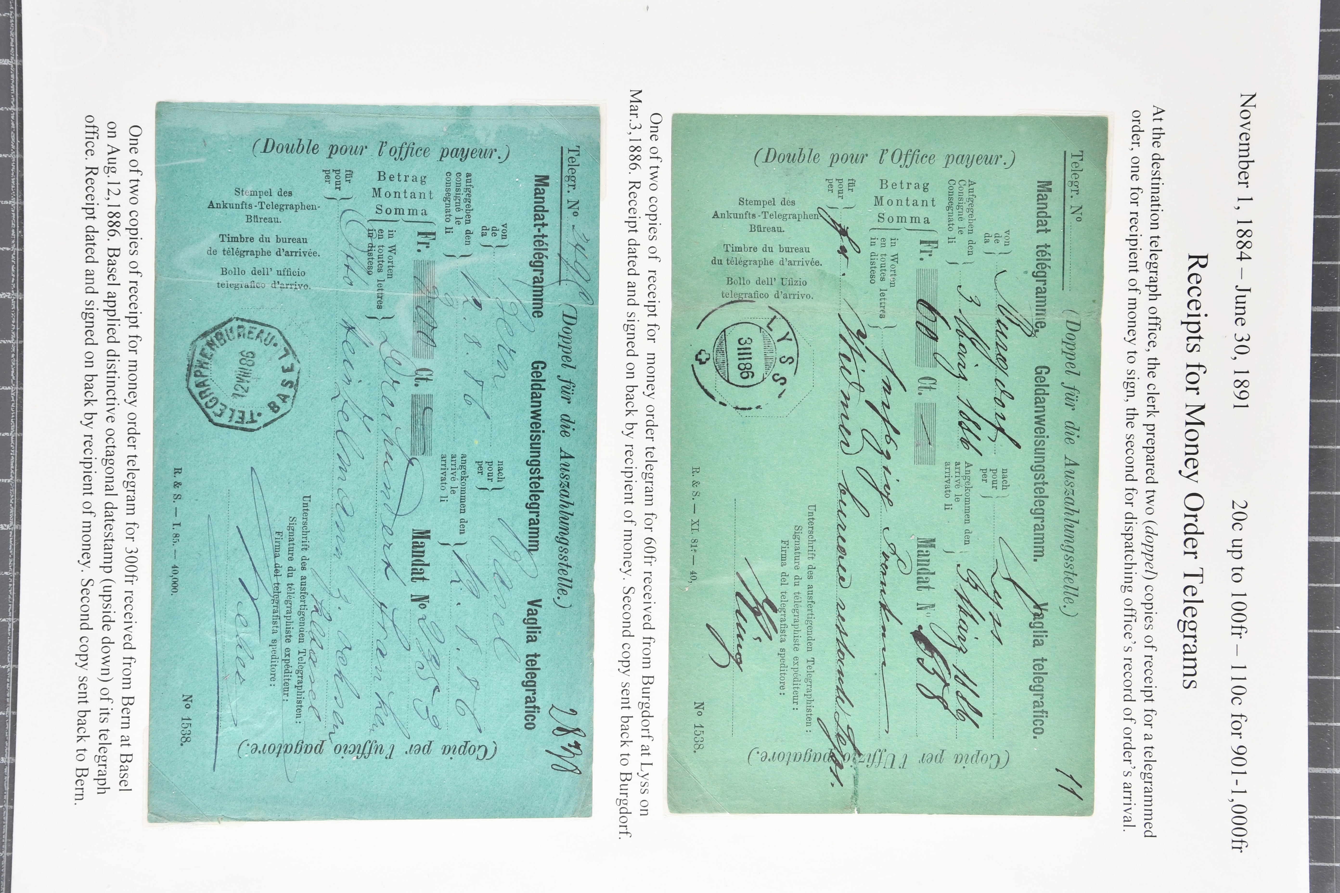mit div. Frankaturen inkl. einer späten Anweisung von 1933 sowie zwei Quittungsformulare für Geldanweisungen per Telegramm von Lyss und Basel (1886). Selten und in guter Erhaltung; teils auf Ausstellungsblätter aufgezogen (Image 1)