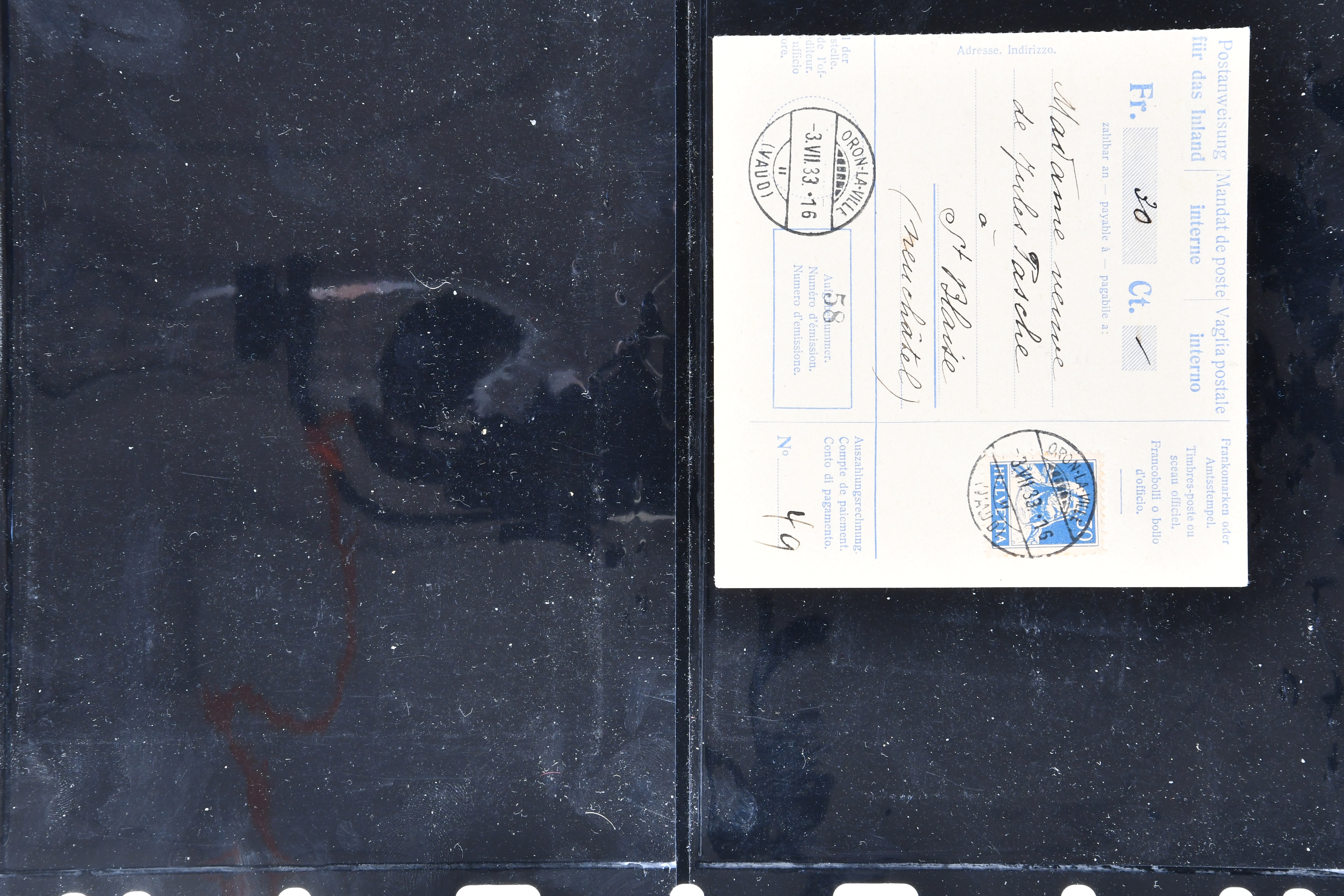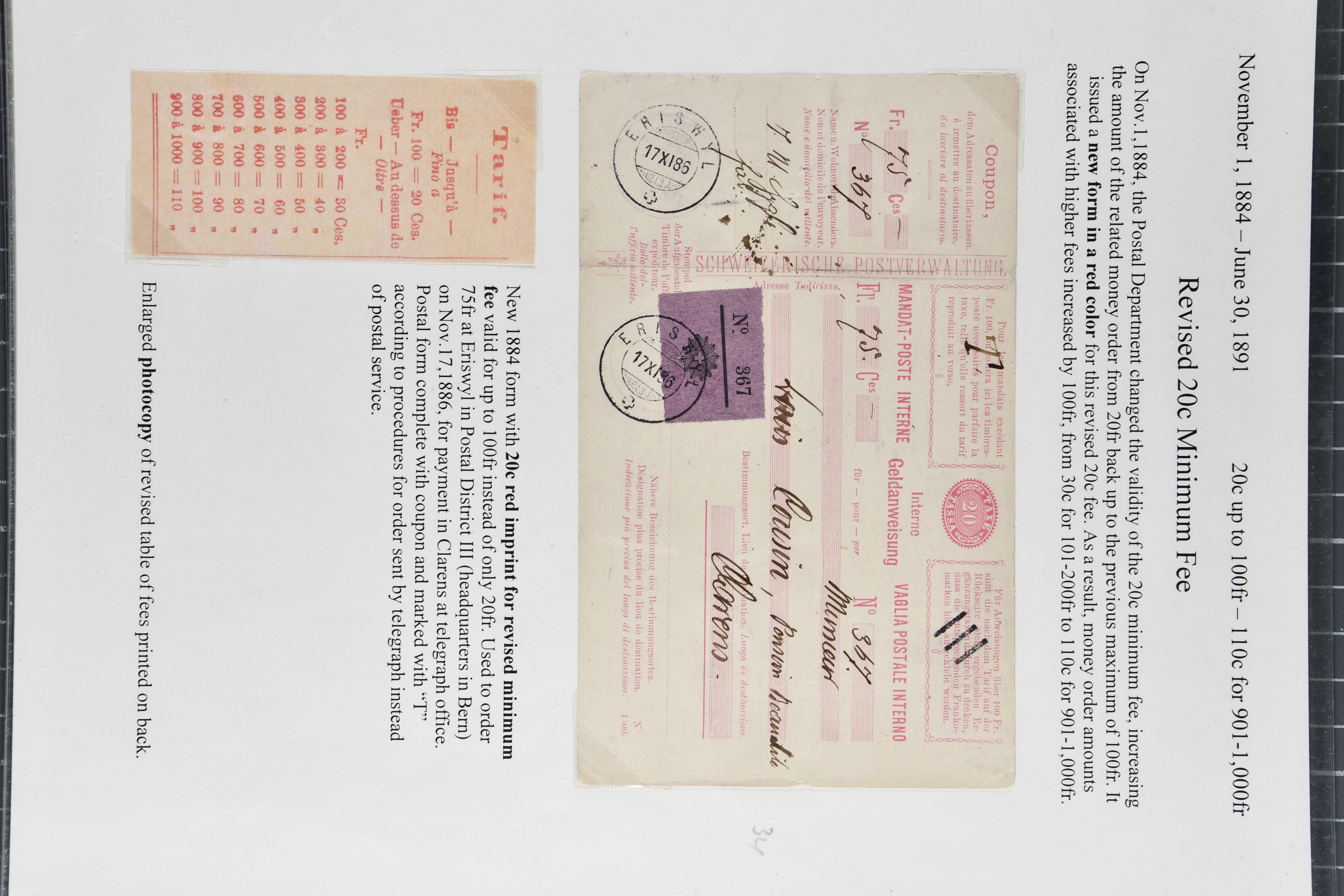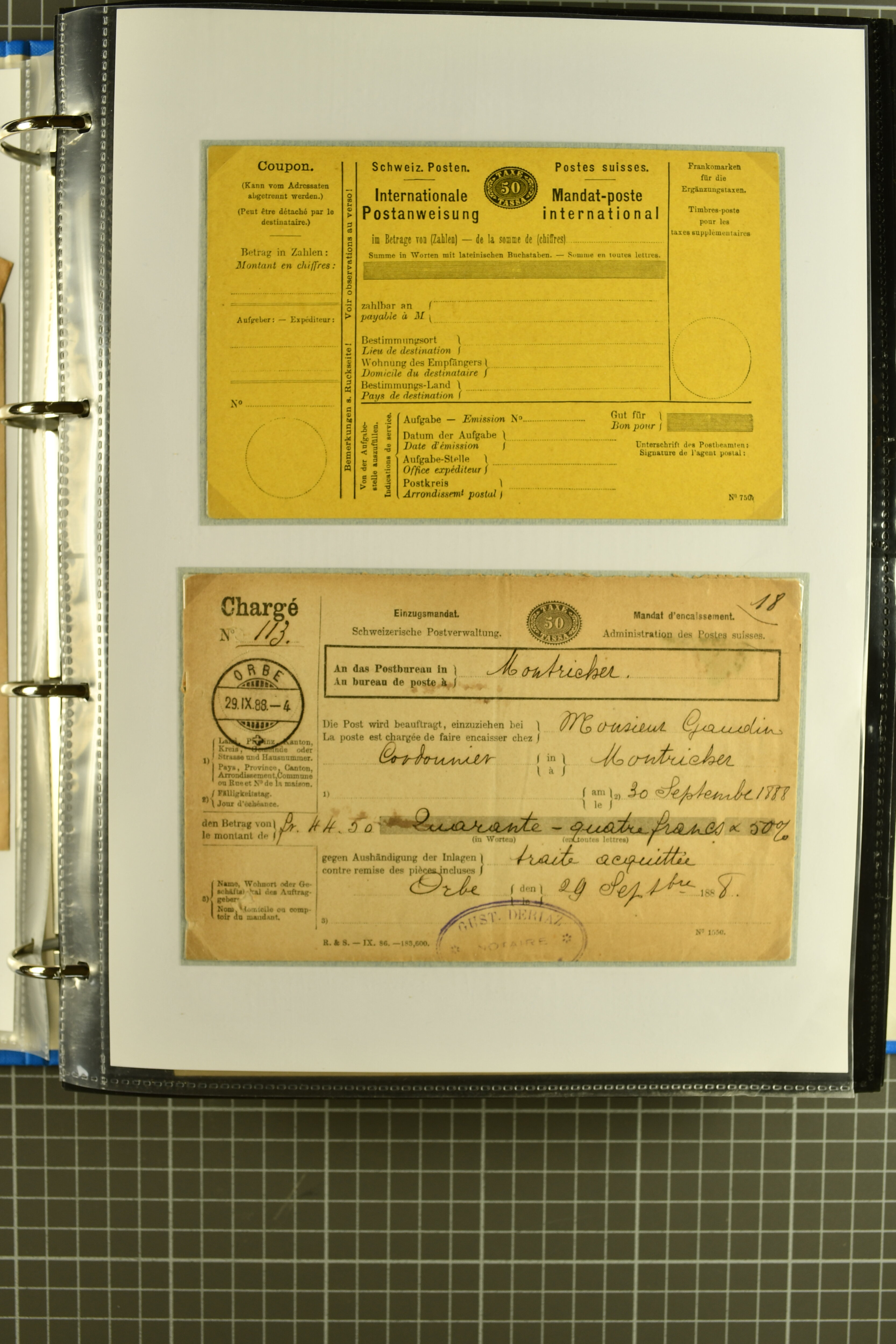 mit div. Frankaturen inkl. einer späten Anweisung von 1933 sowie zwei Quittungsformulare für Geldanweisungen per Telegramm von Lyss und Basel (1886). Selten und in guter Erhaltung; teils auf Ausstellungsblätter aufgezogen (Image 1)