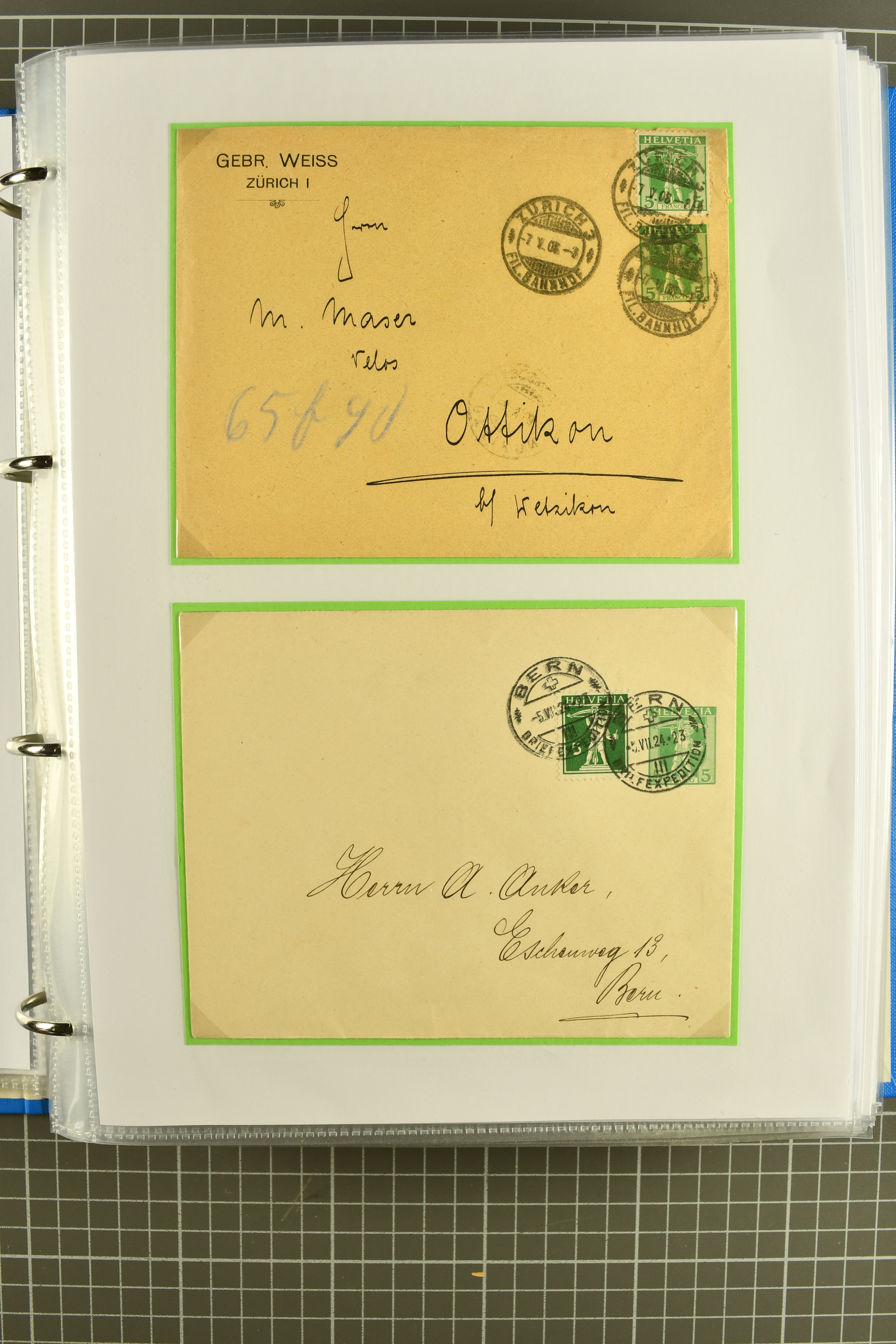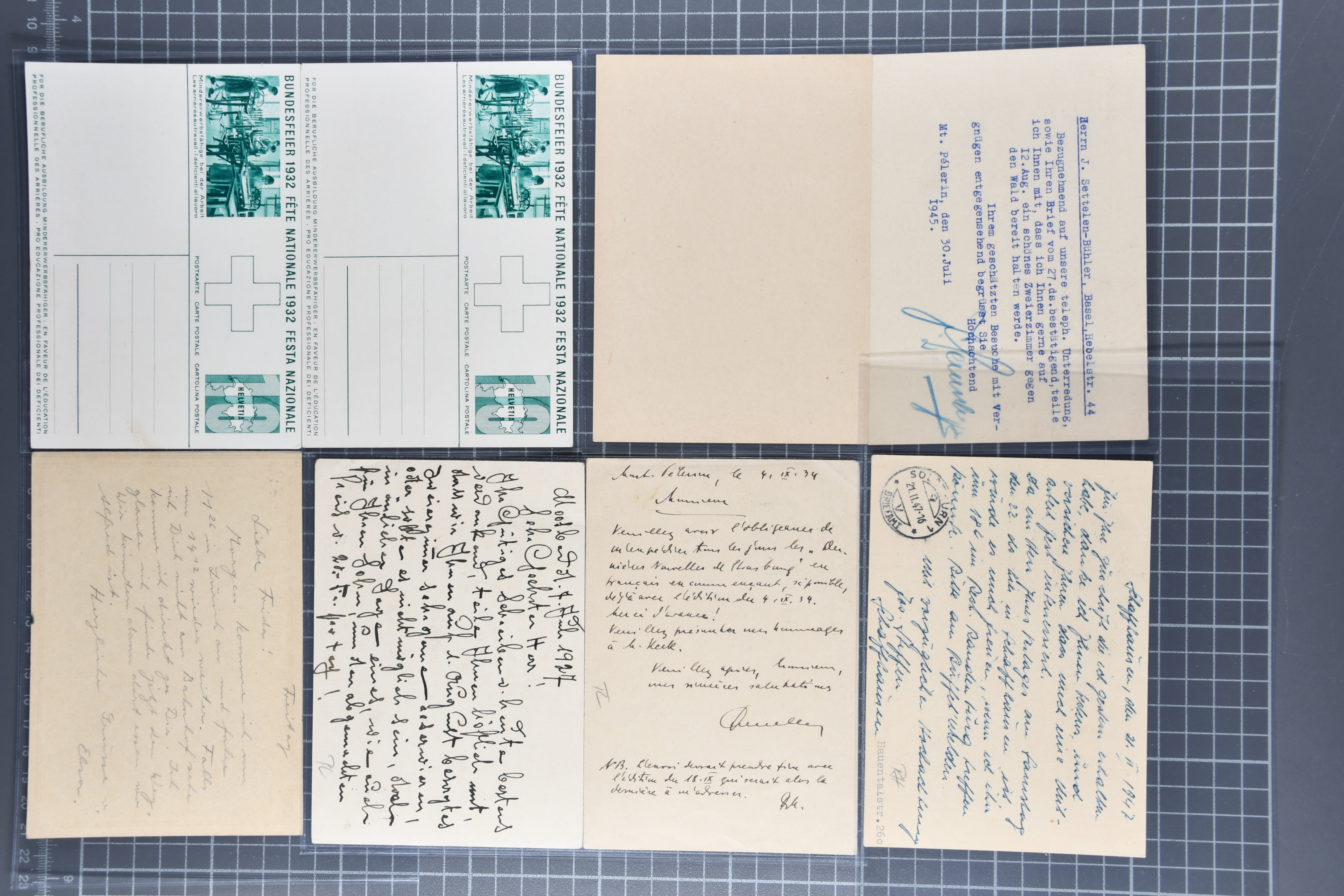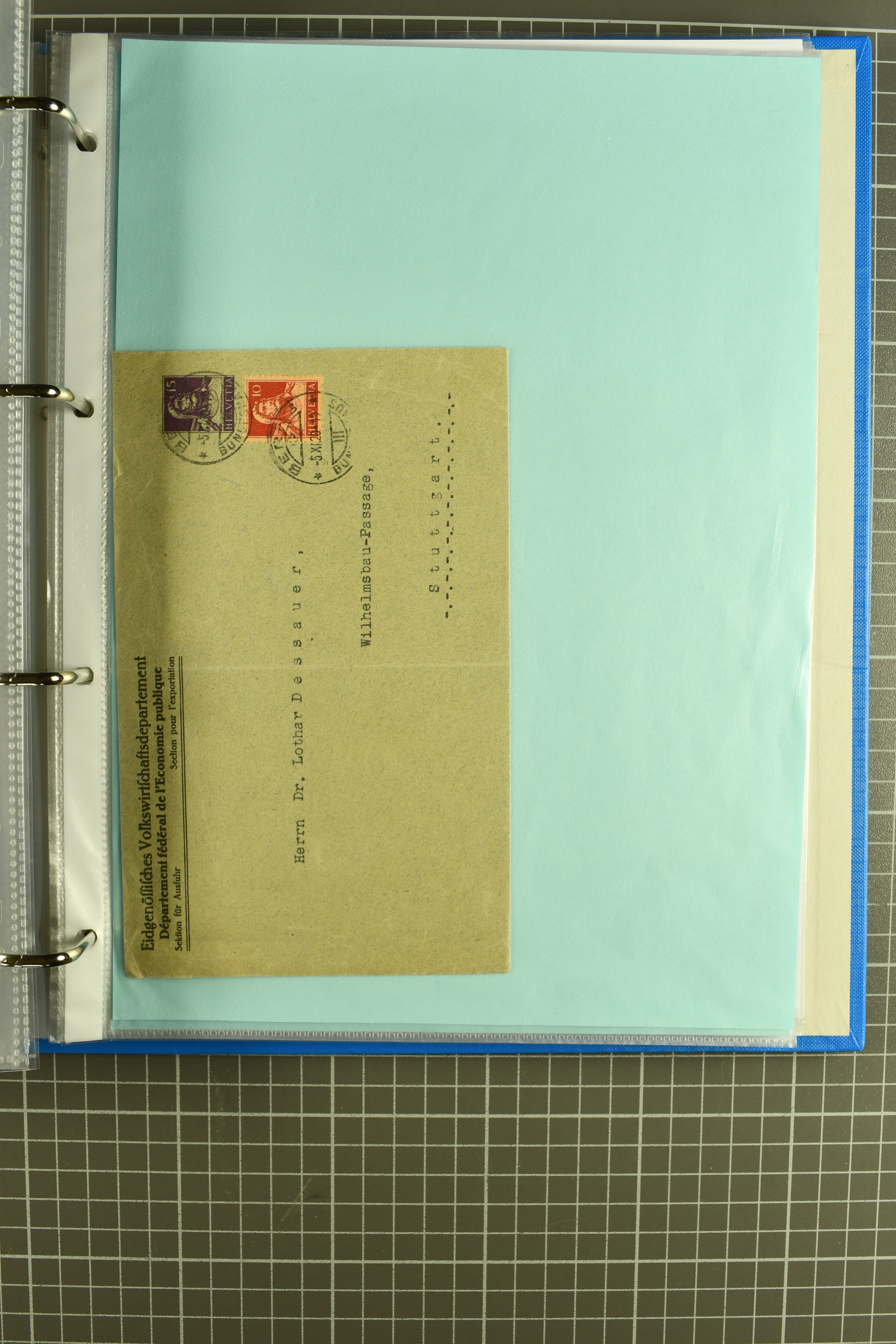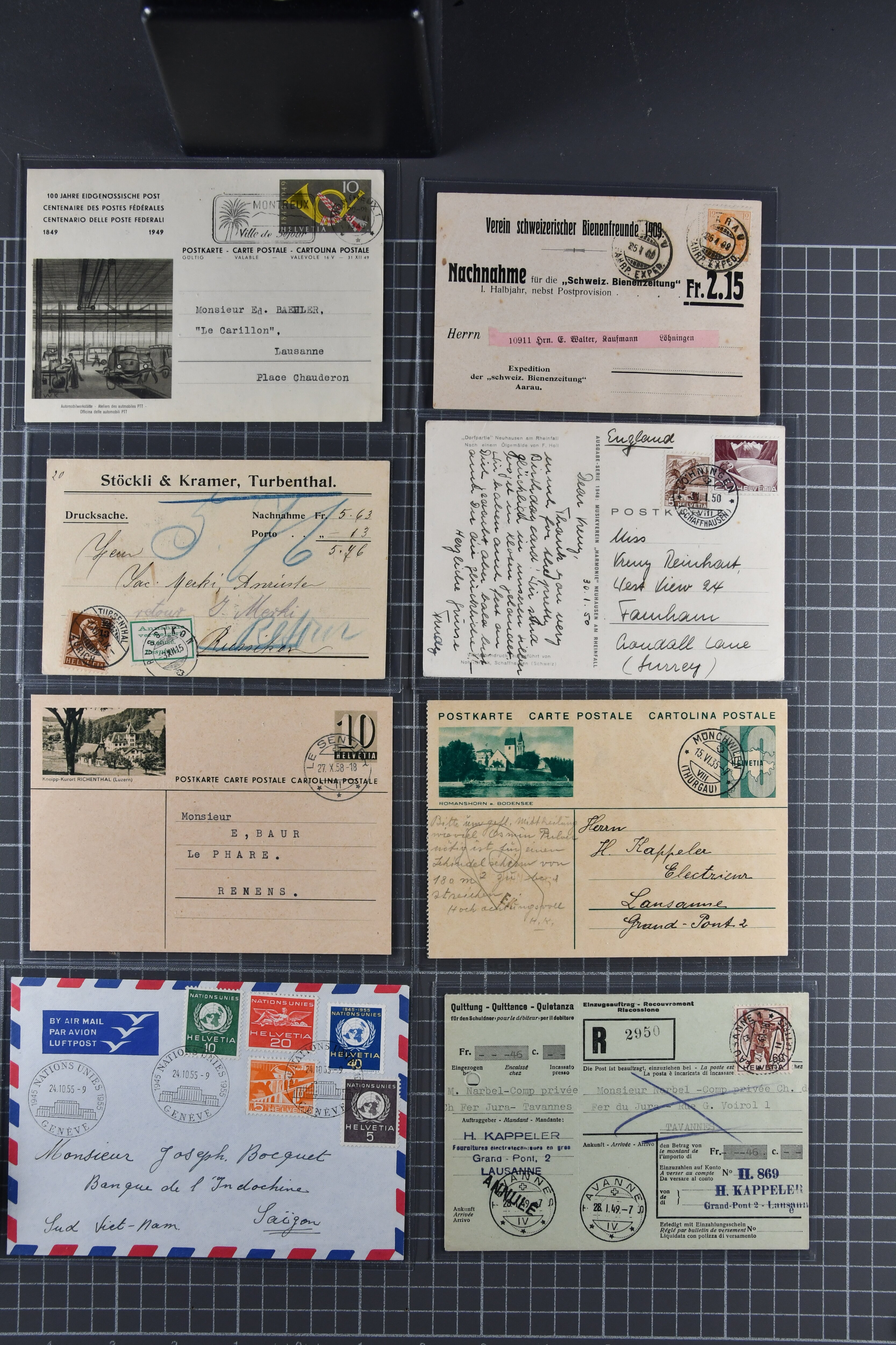 Mischfrankatur gleicher Wertstufen 5 Rp. Nr. 195 + 202, Ansichtskarten usw. 9 Maximumkarten Fussball-WM 1954 'Ouverture' und 2 Karten 'Endspiel'; dazu ca. 115 Briefe zumeist zensuriert nach dem Deutschen Reich (Familienkorrespondenz); Album mit