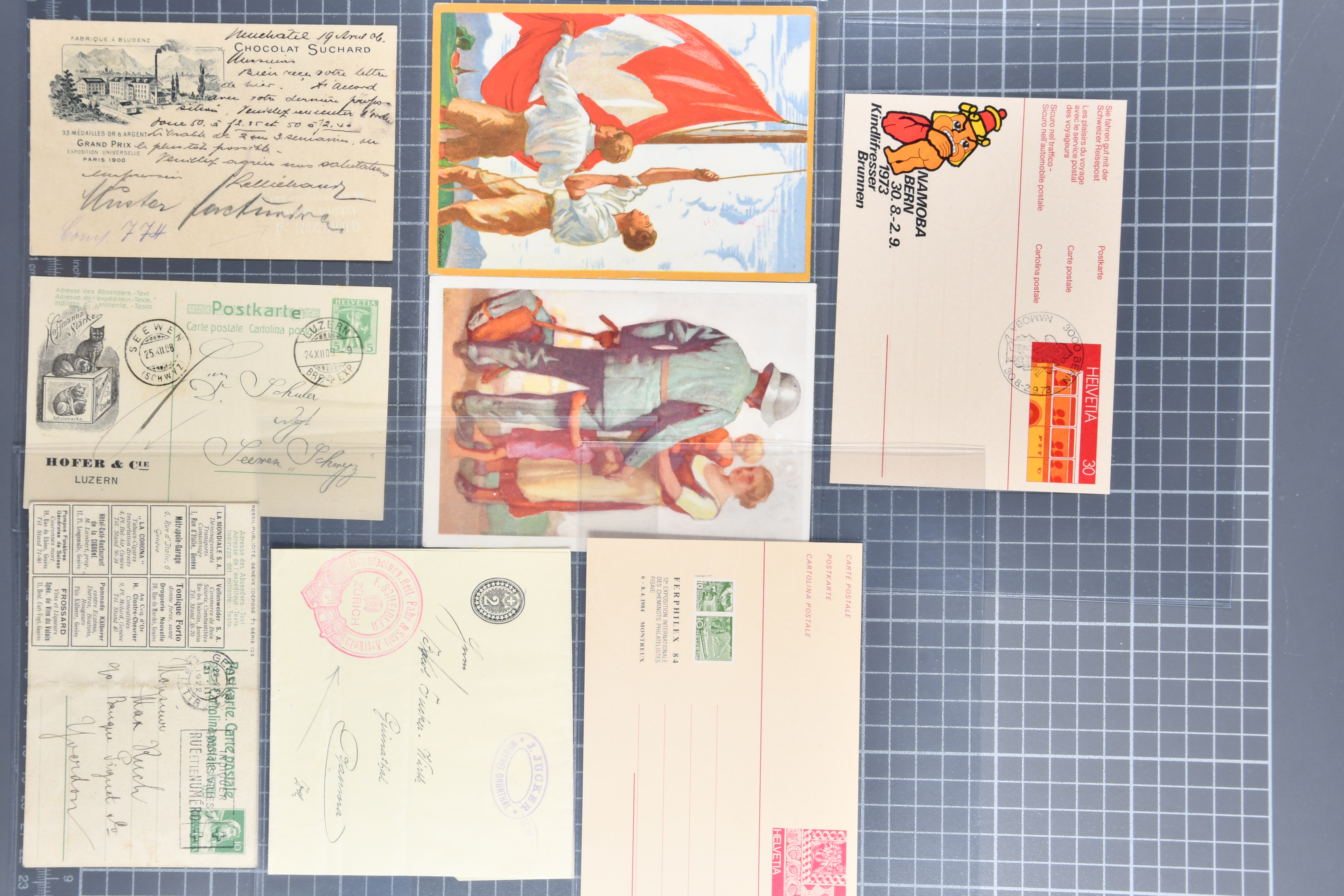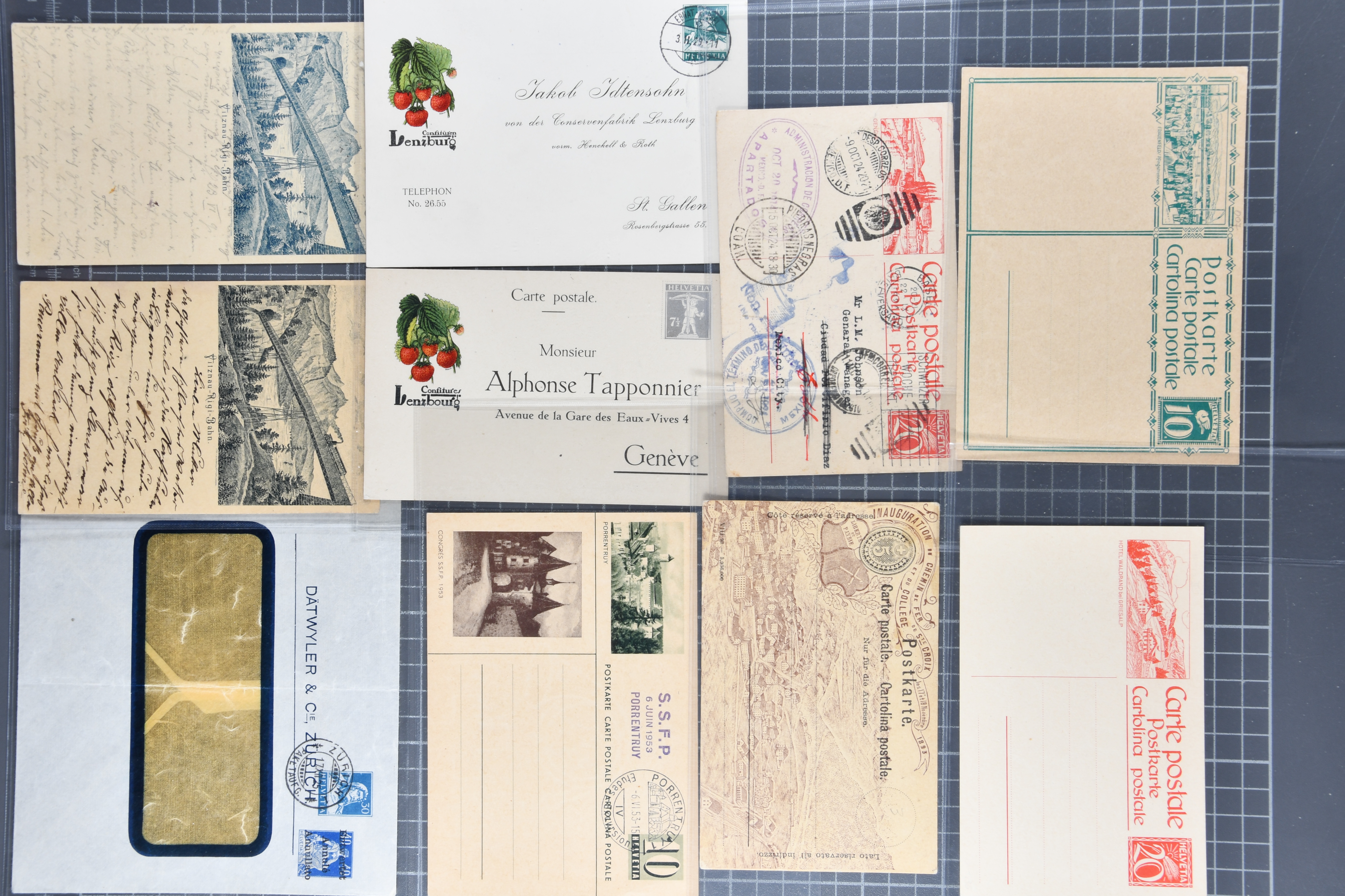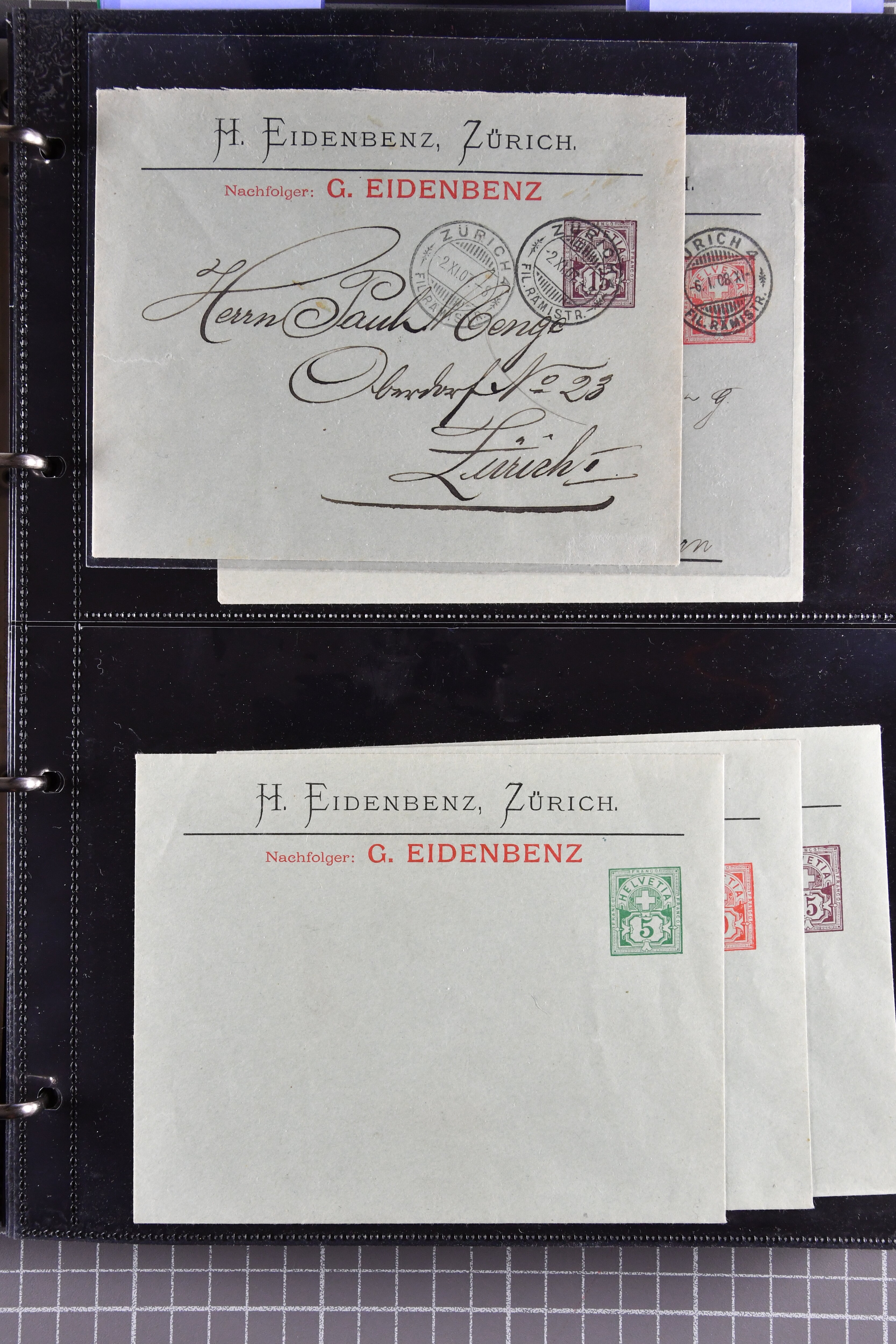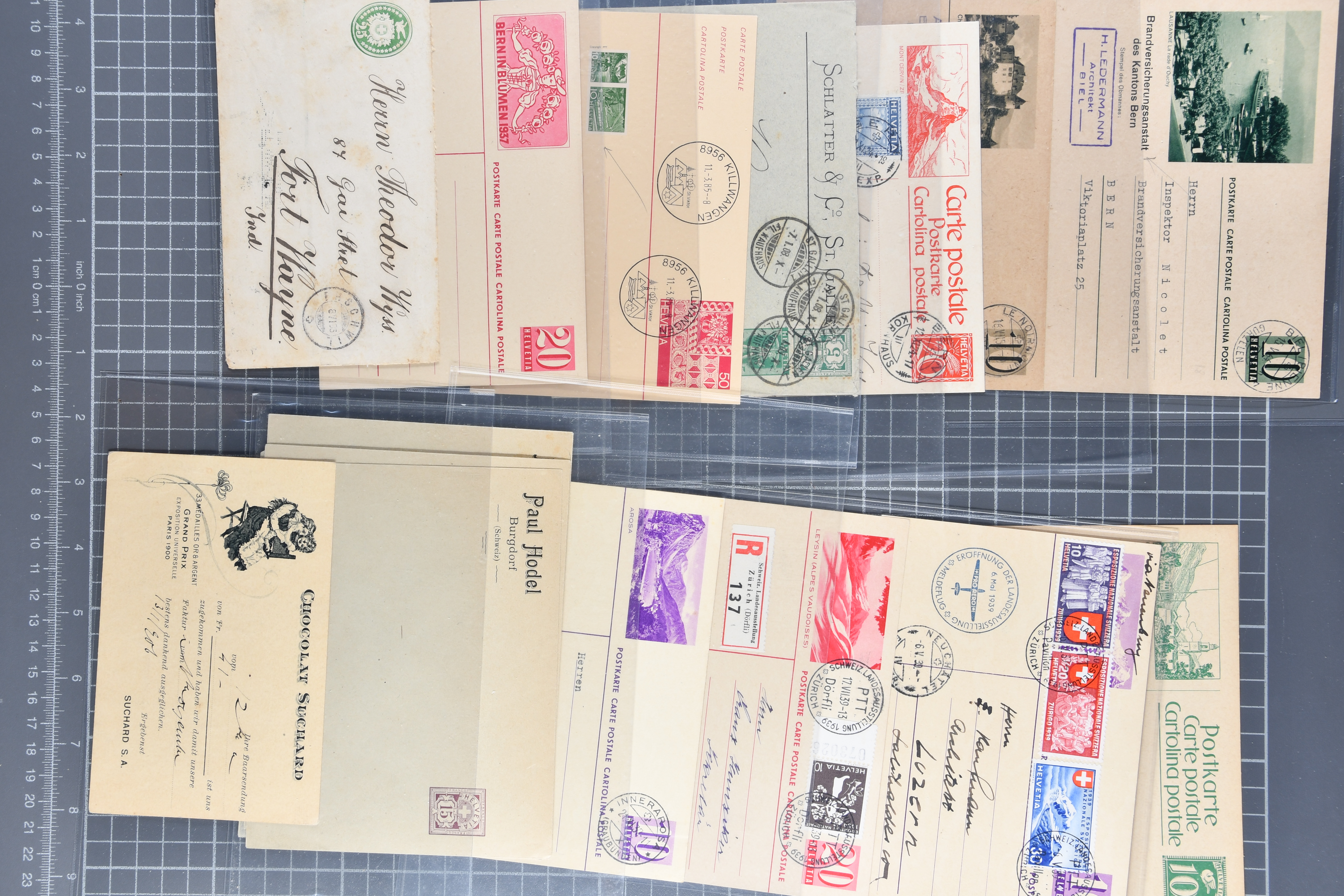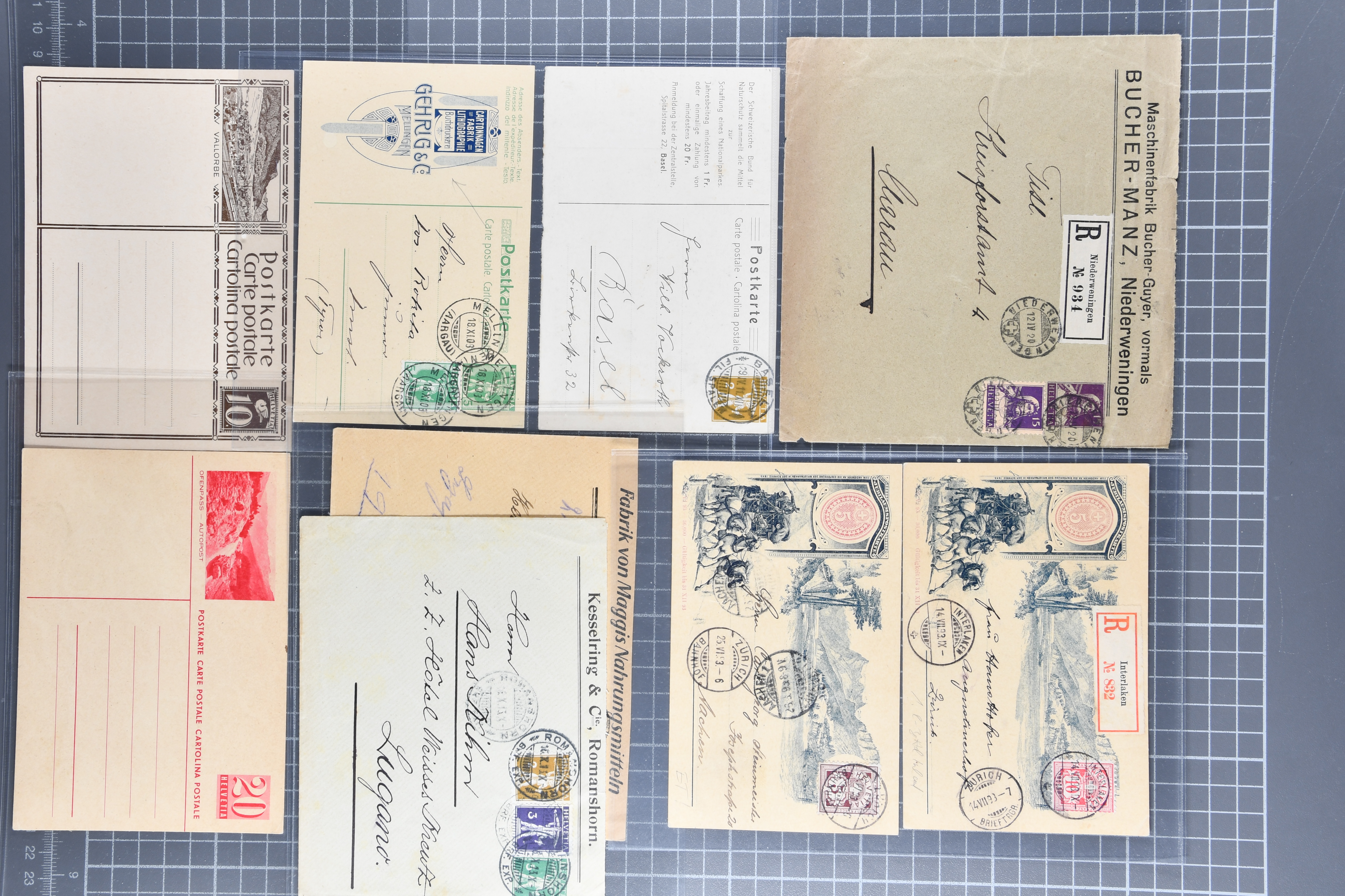 1907/1930ca.: Privatganzsachen, zumeist echt gelaufen. Sammlung mit Schwerpunkt Umschläge verschiedener Absenderfirmen (darunter auch Briefmarkenhändler). Enthalten u. a. seltene Gerichts-Zustellungsurkunde 10 Rp.