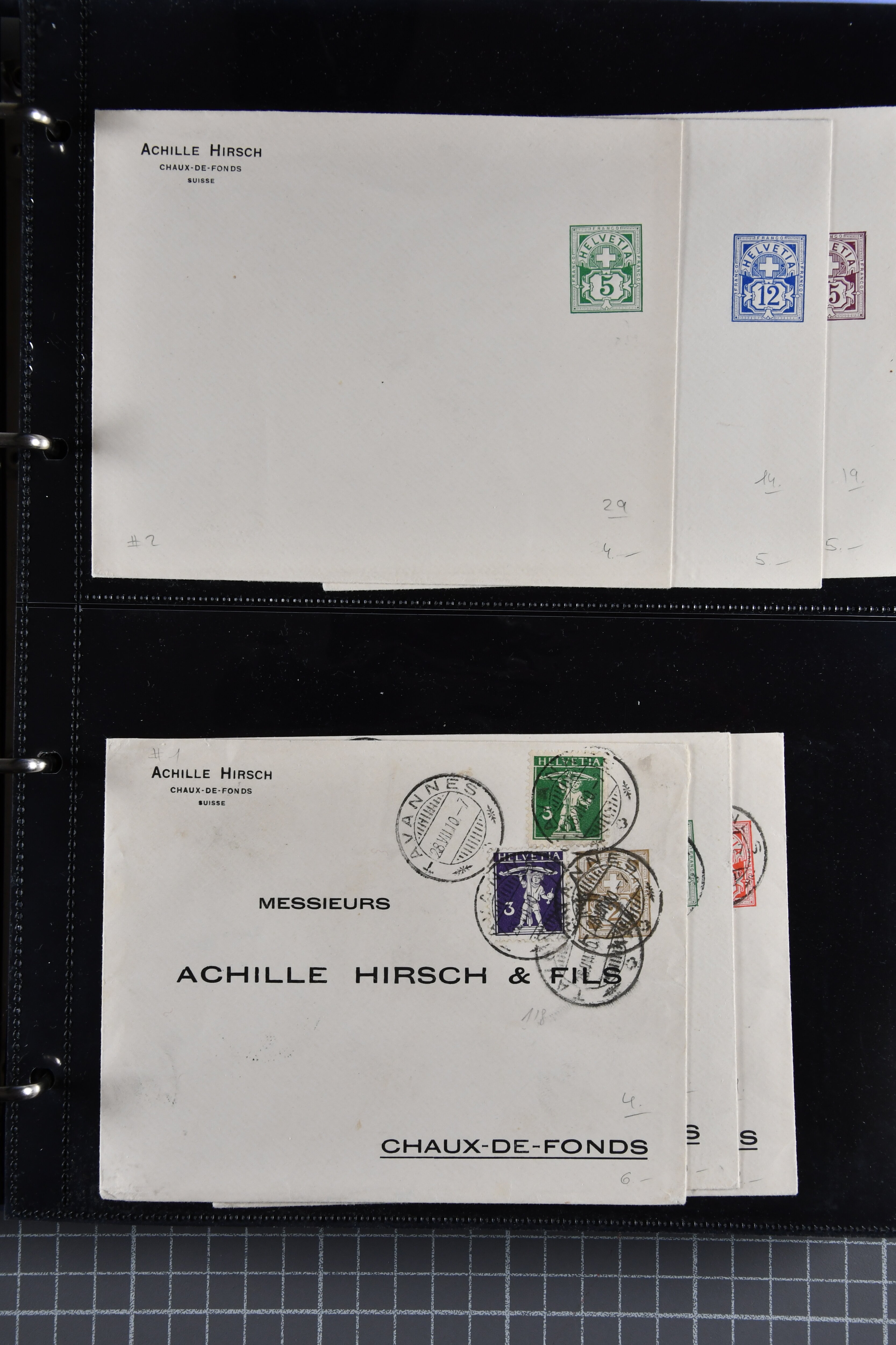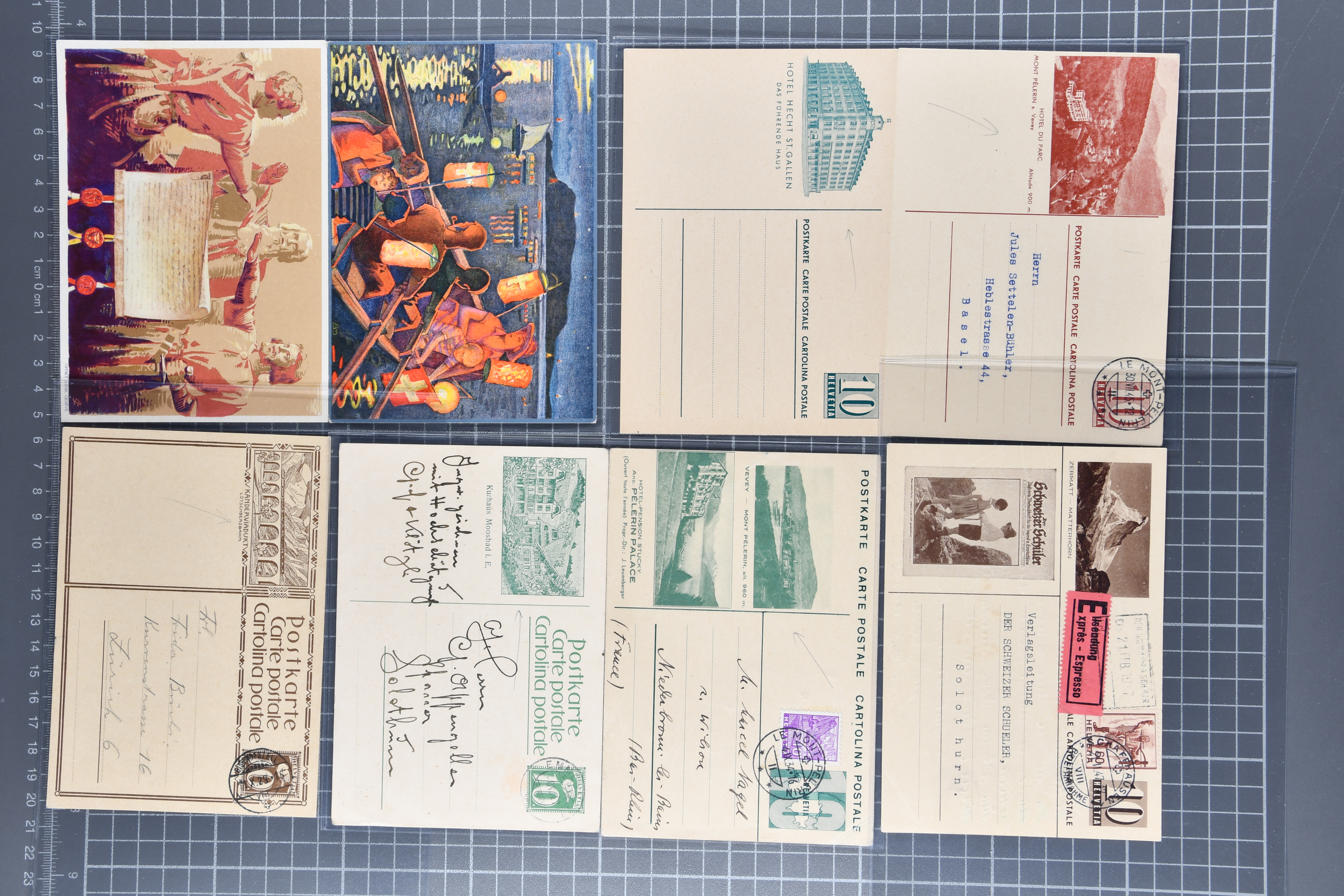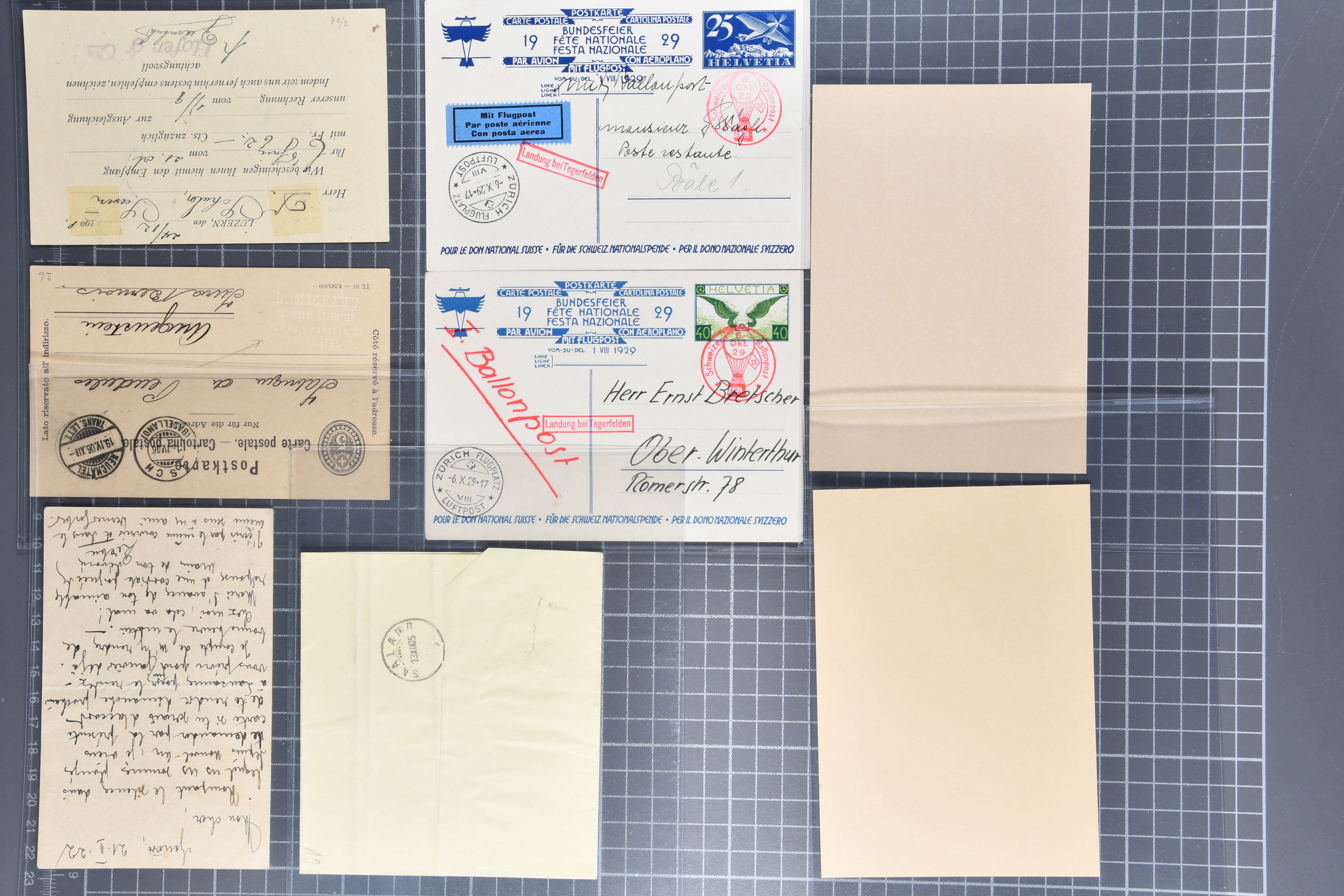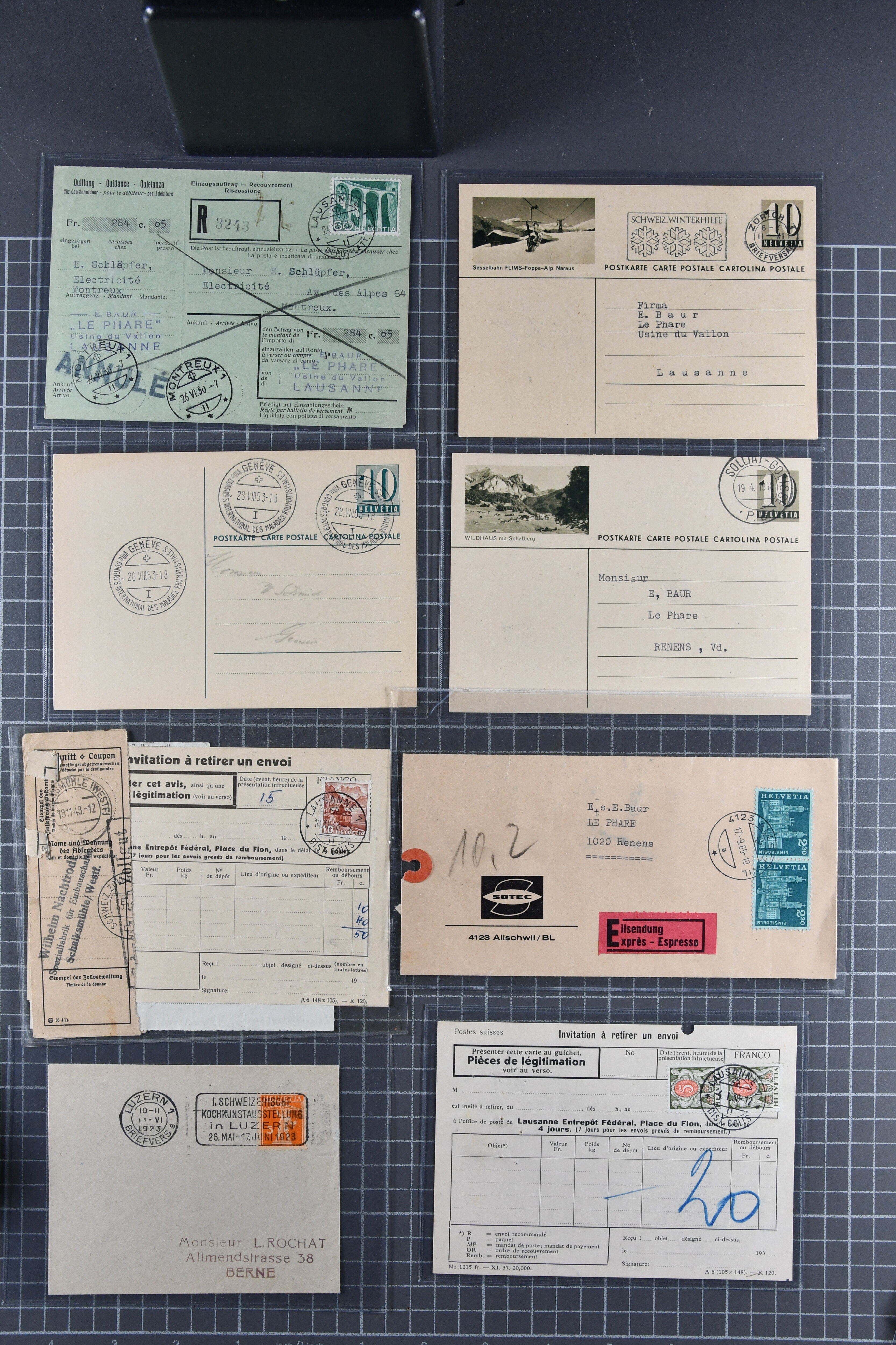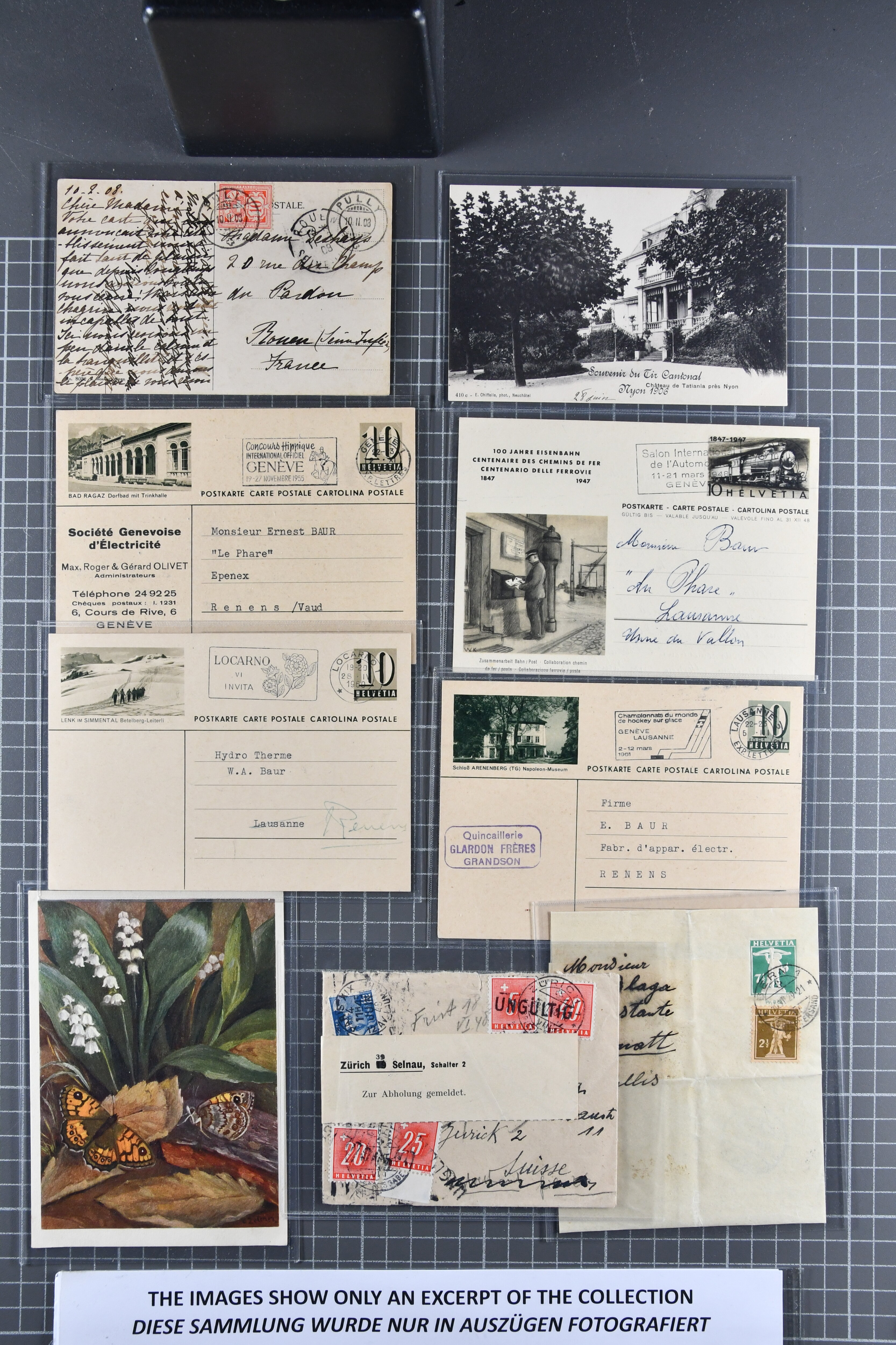 1907/1930ca.: Privatganzsachen, zumeist echt gelaufen. Sammlung mit Schwerpunkt Umschläge verschiedener Absenderfirmen (darunter auch Briefmarkenhändler). Enthalten u. a. seltene Gerichts-Zustellungsurkunde 10 Rp.