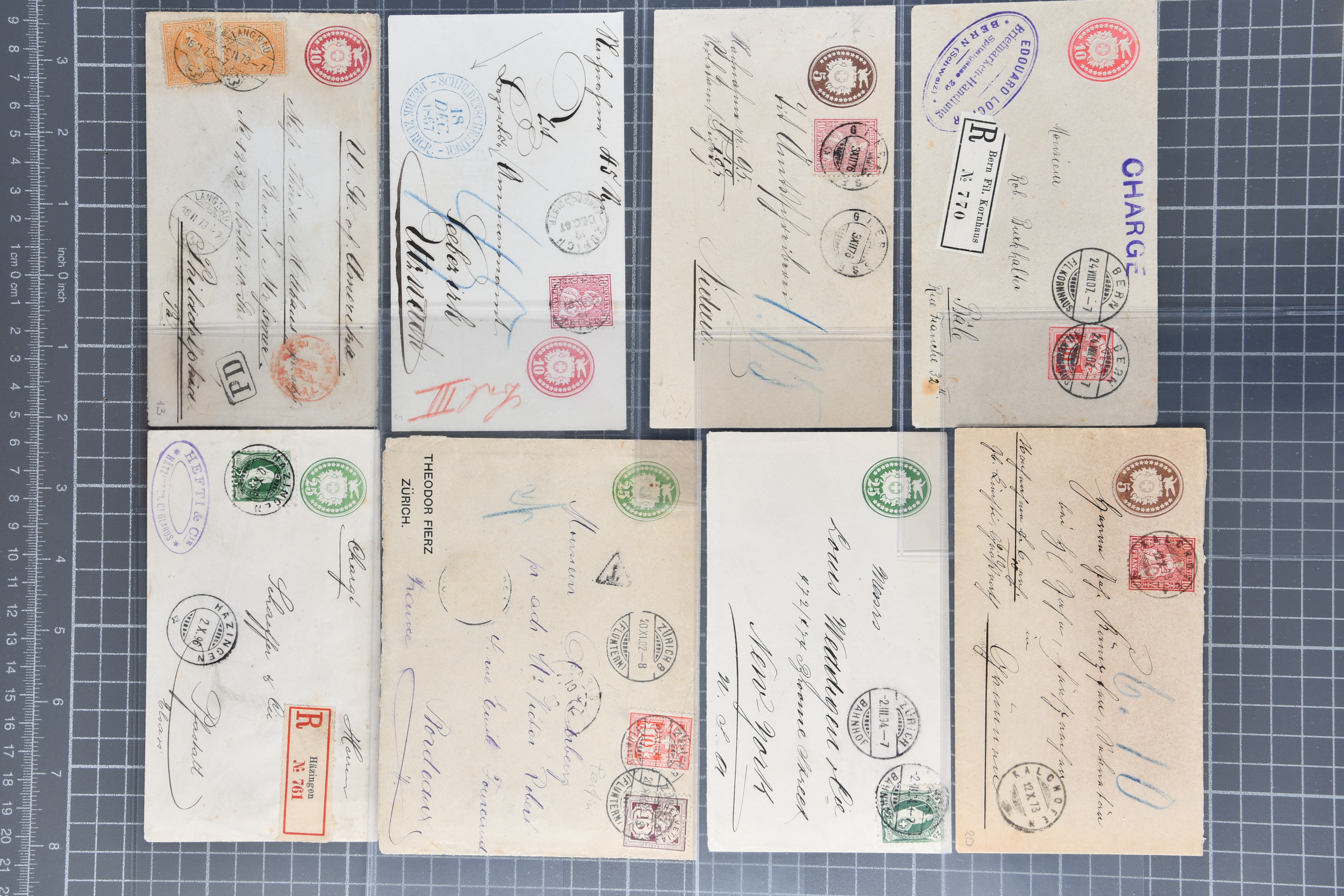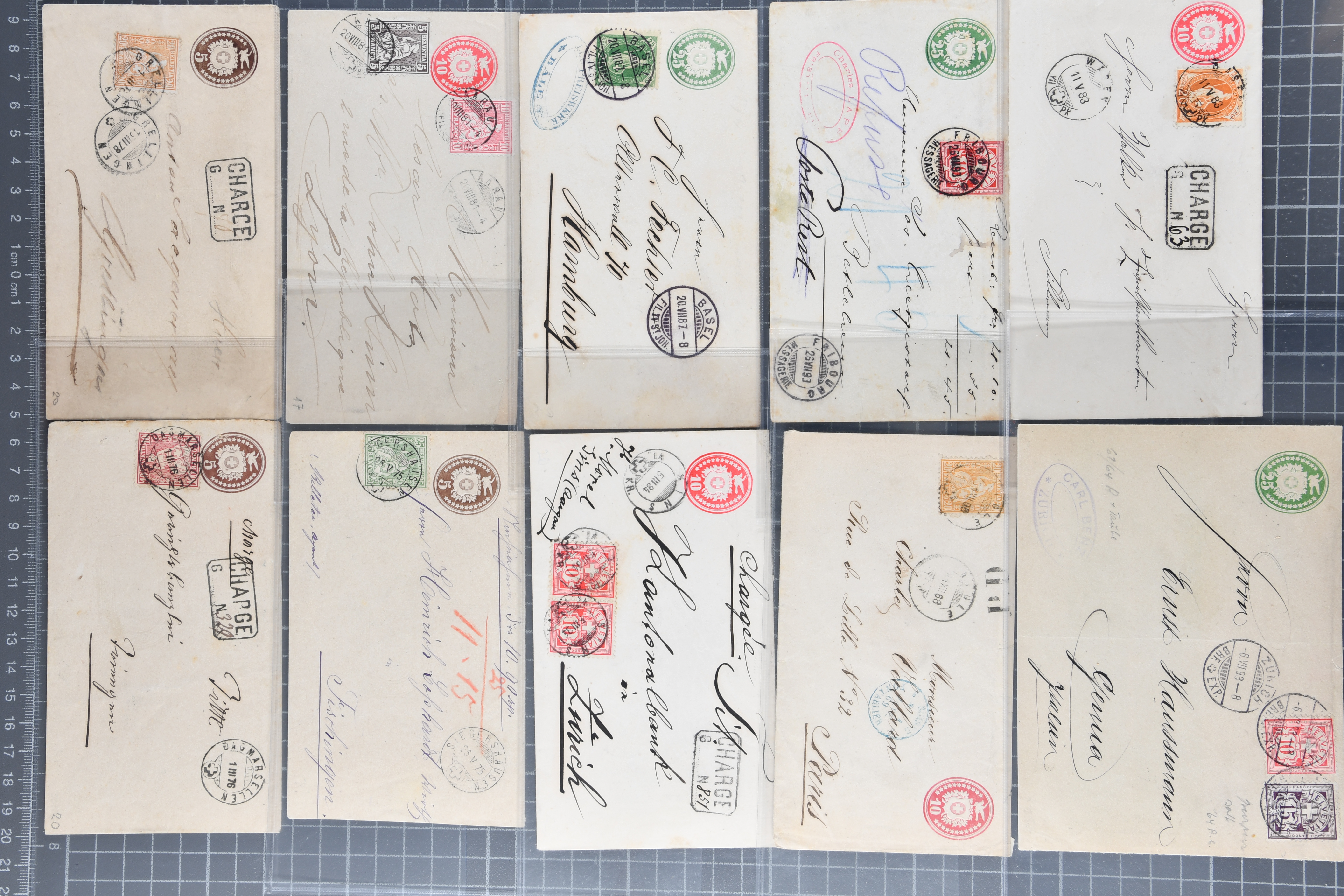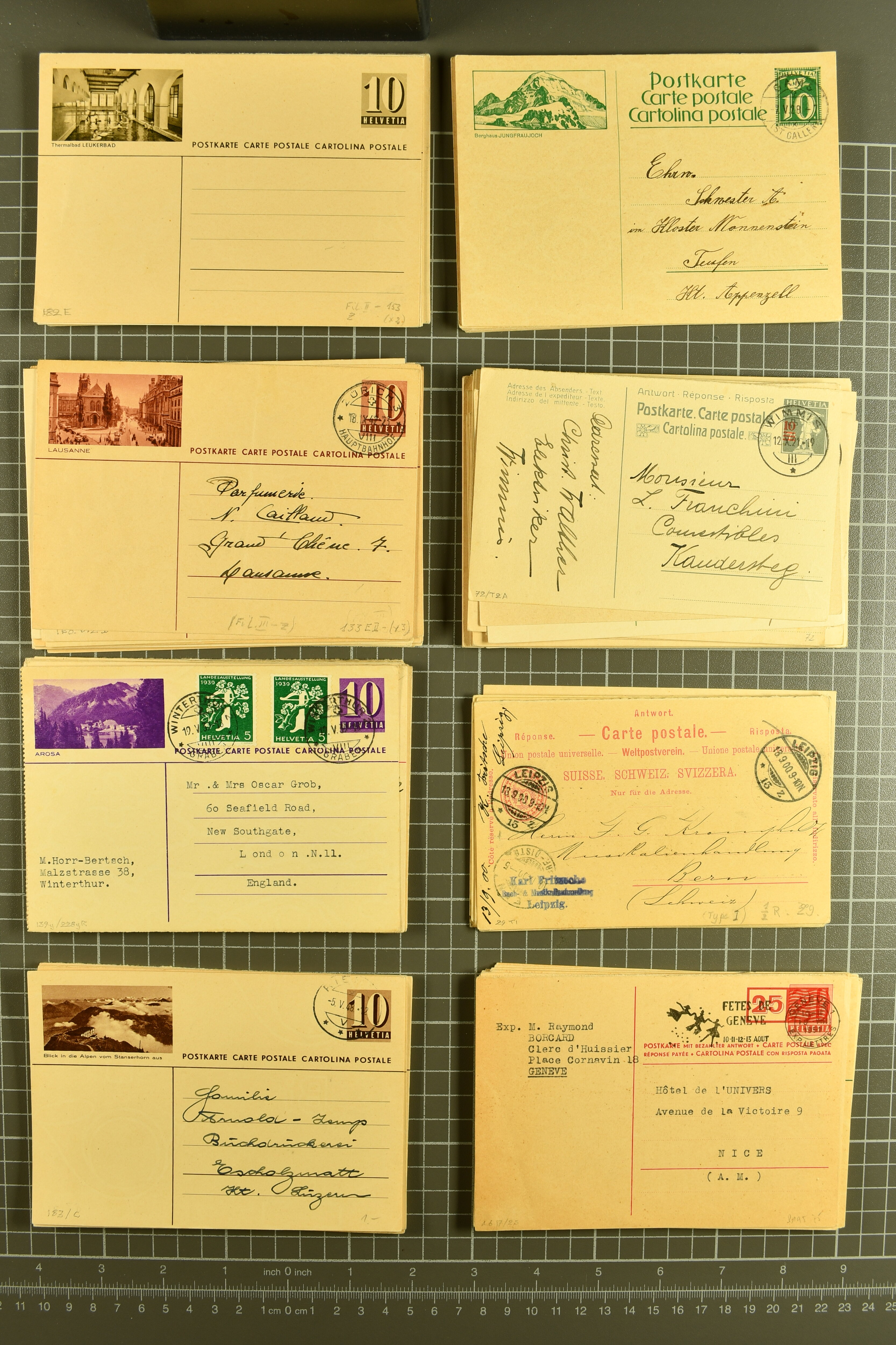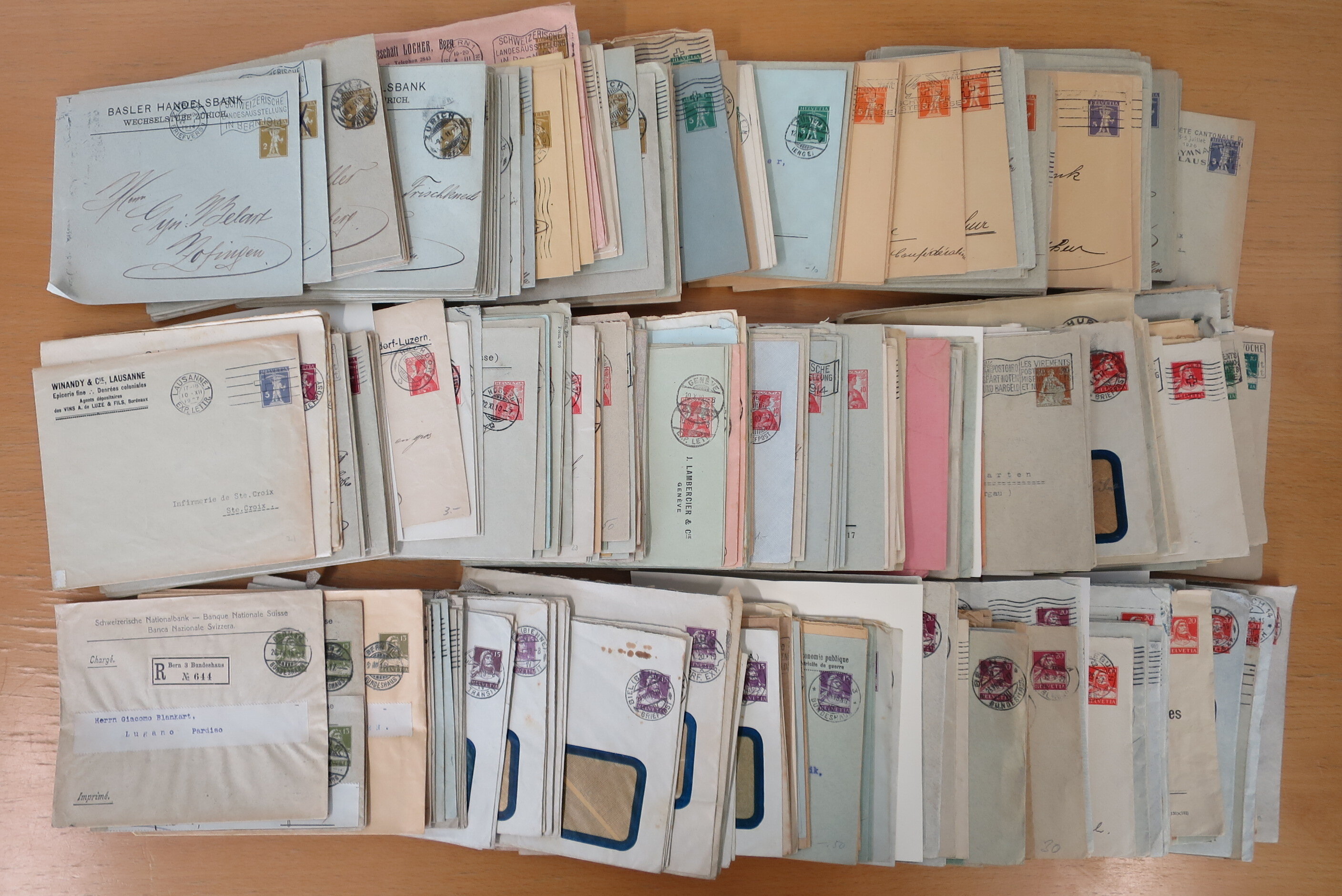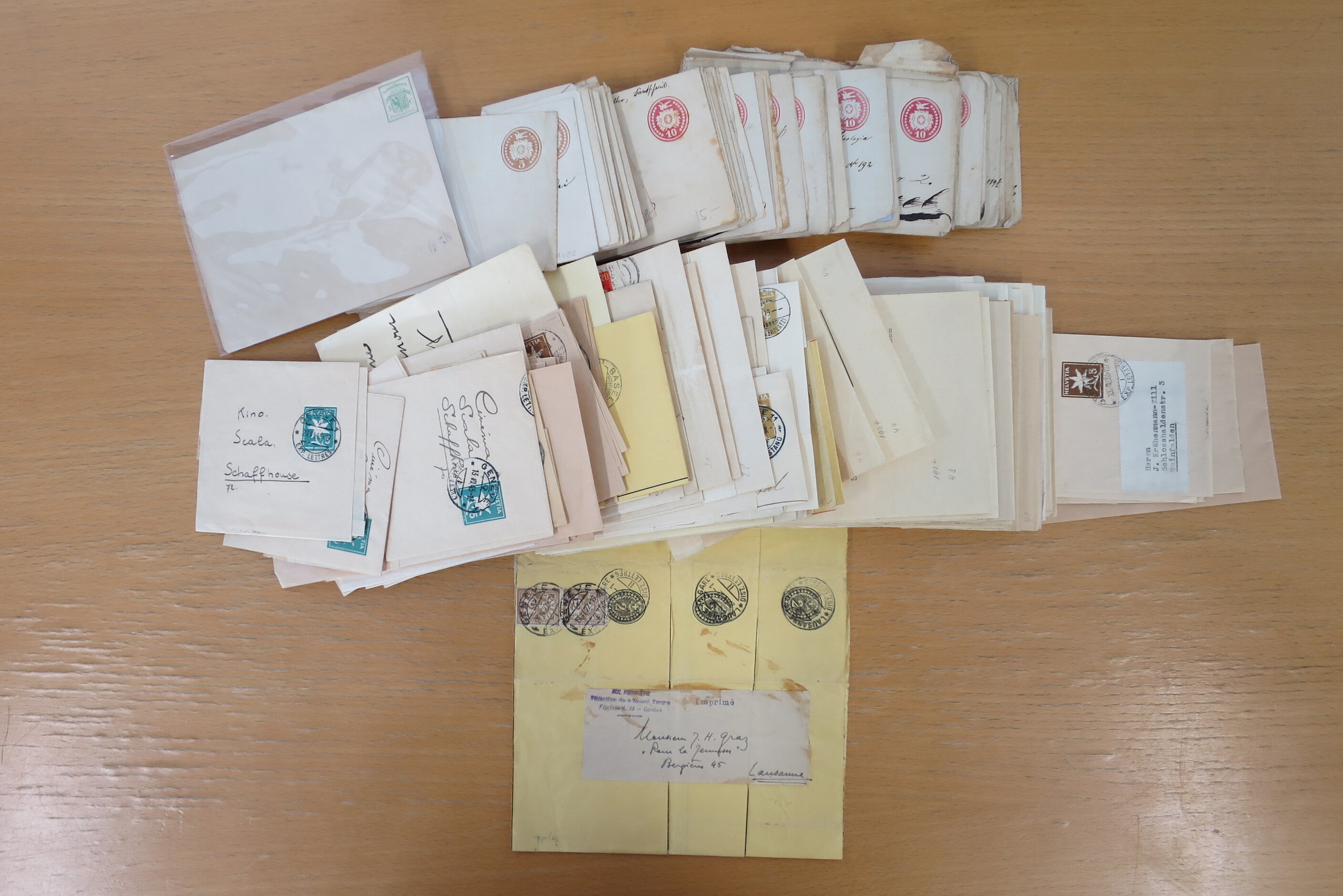 Umschlägen auch zu 12 oder 15 Rappen, Zusatzfrankaturen, Drucksachen-Karten mit Besuchsanzeigen, zwei Bahnhofsbriefe; weiterhin 120 meist ungebrauchte Umschläge / Karten meist mit zwei oder drei Wertstempeln; sowie 80 häufige nahezu vollständig