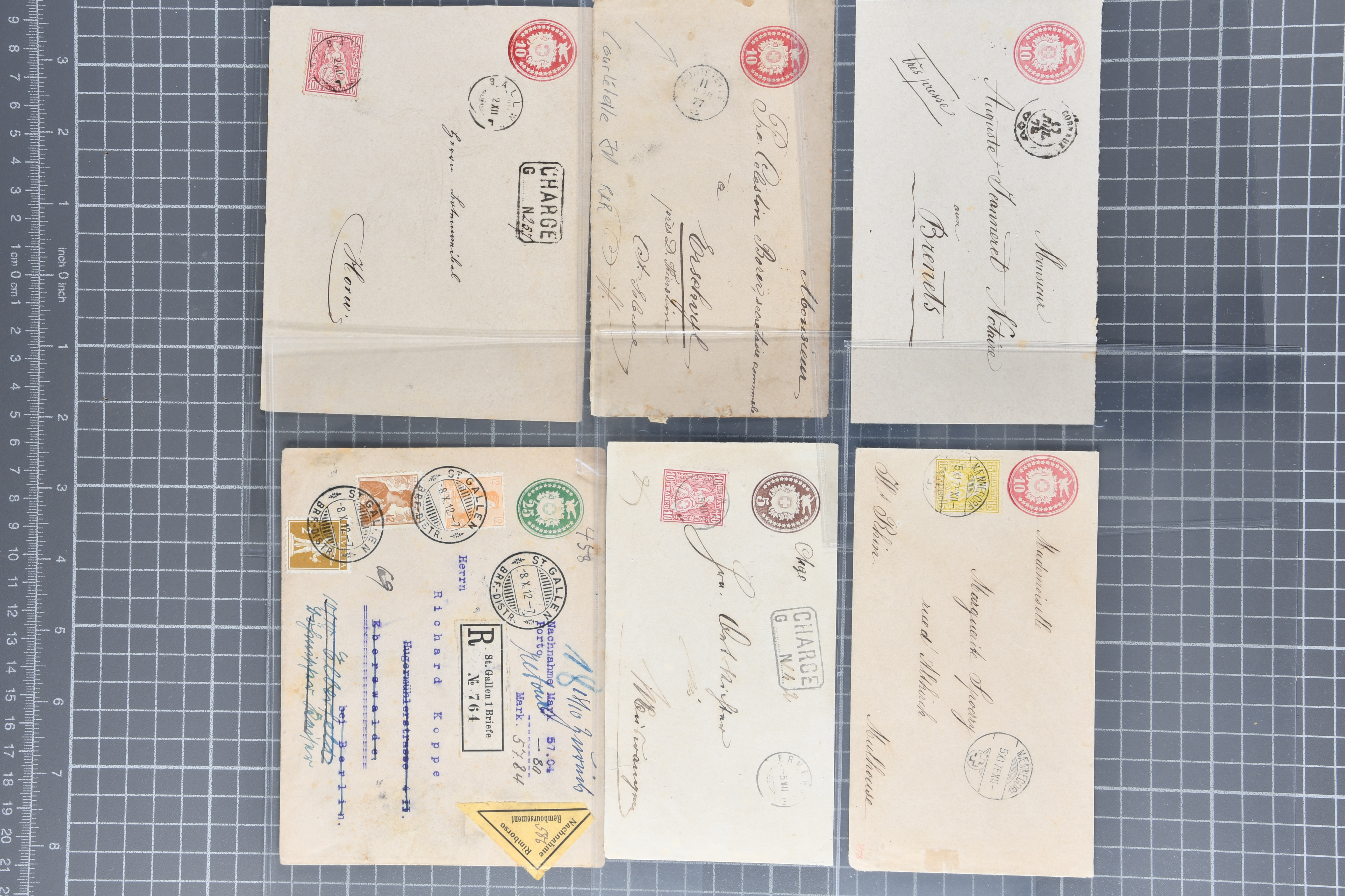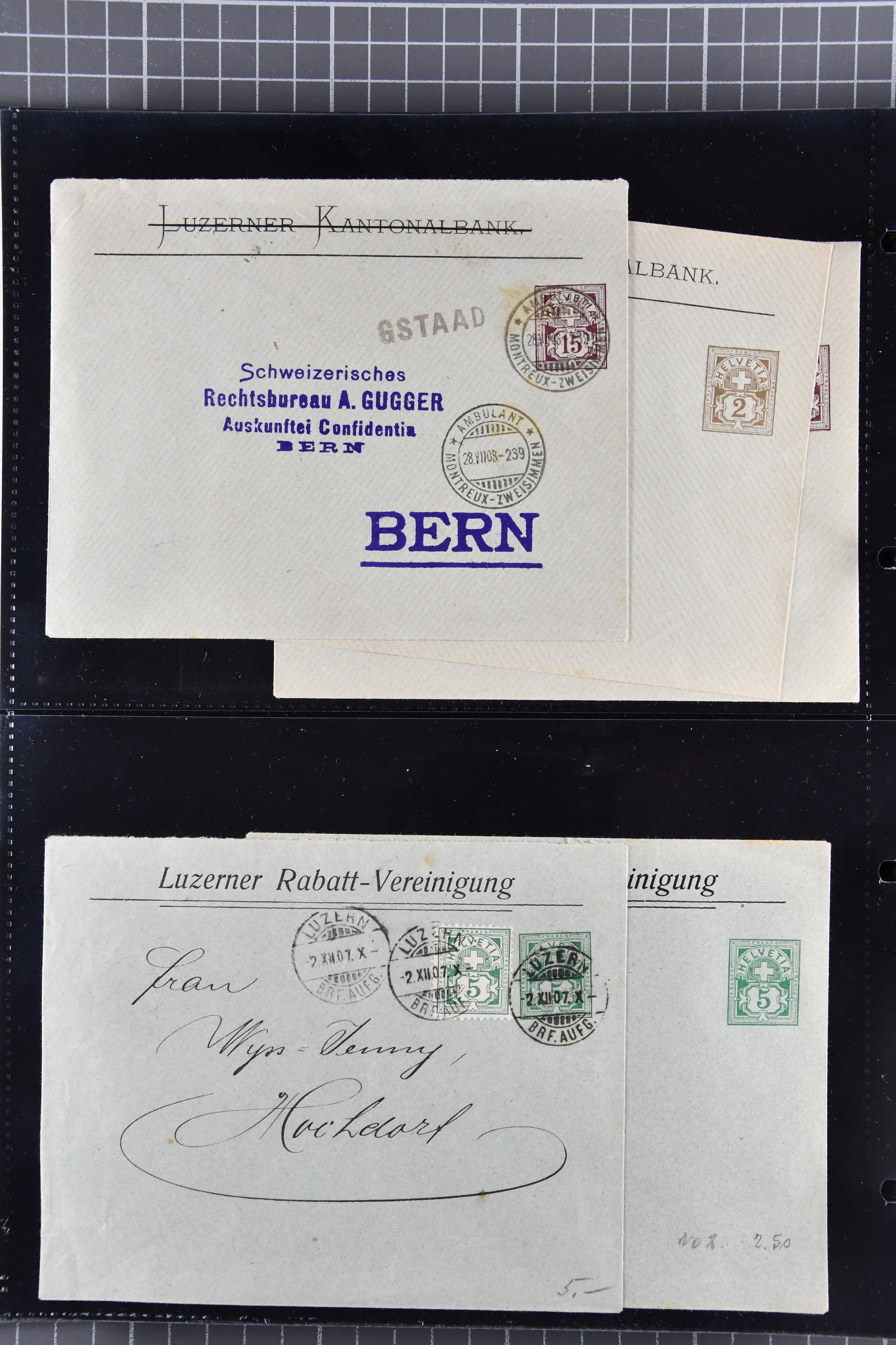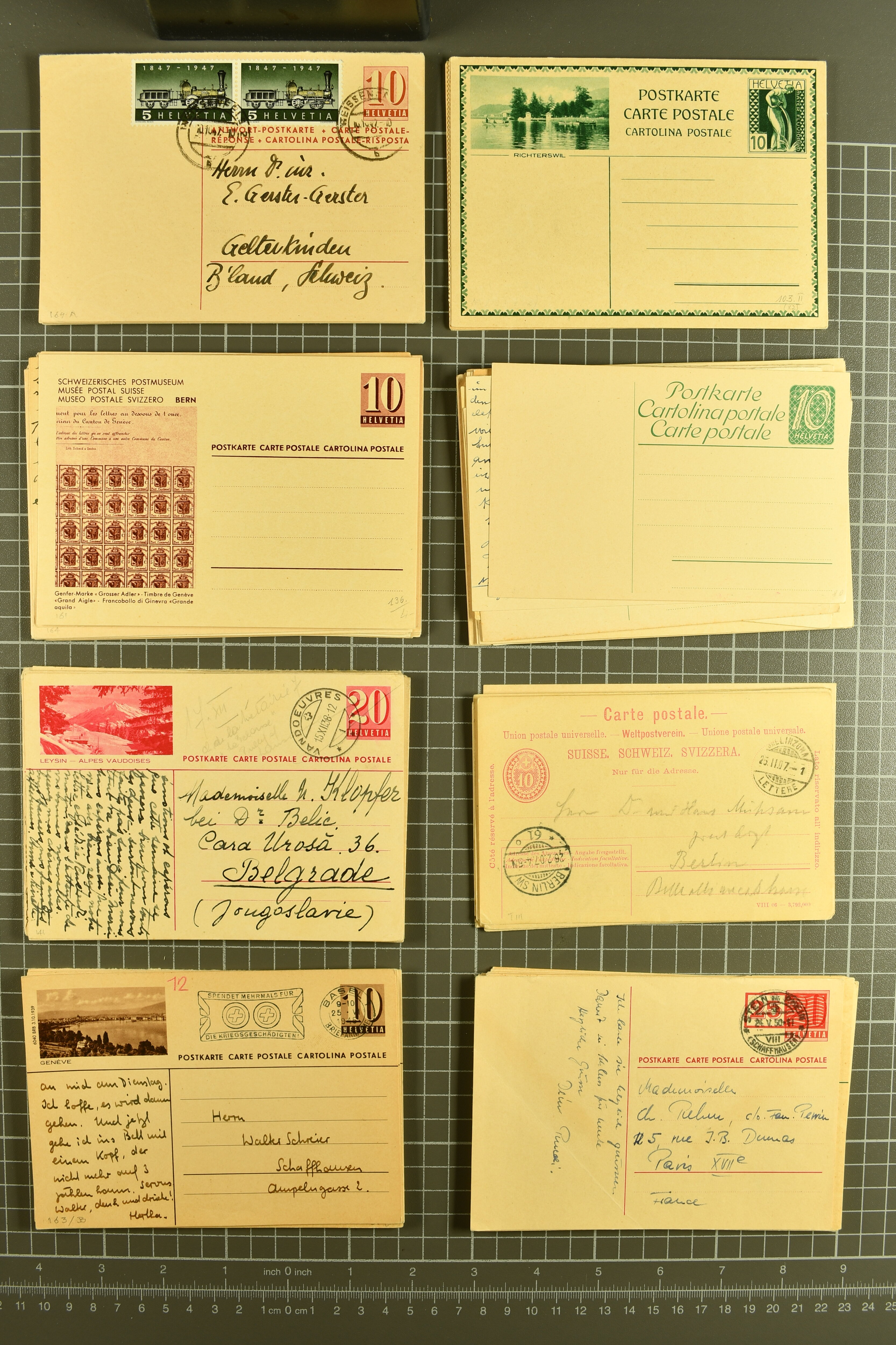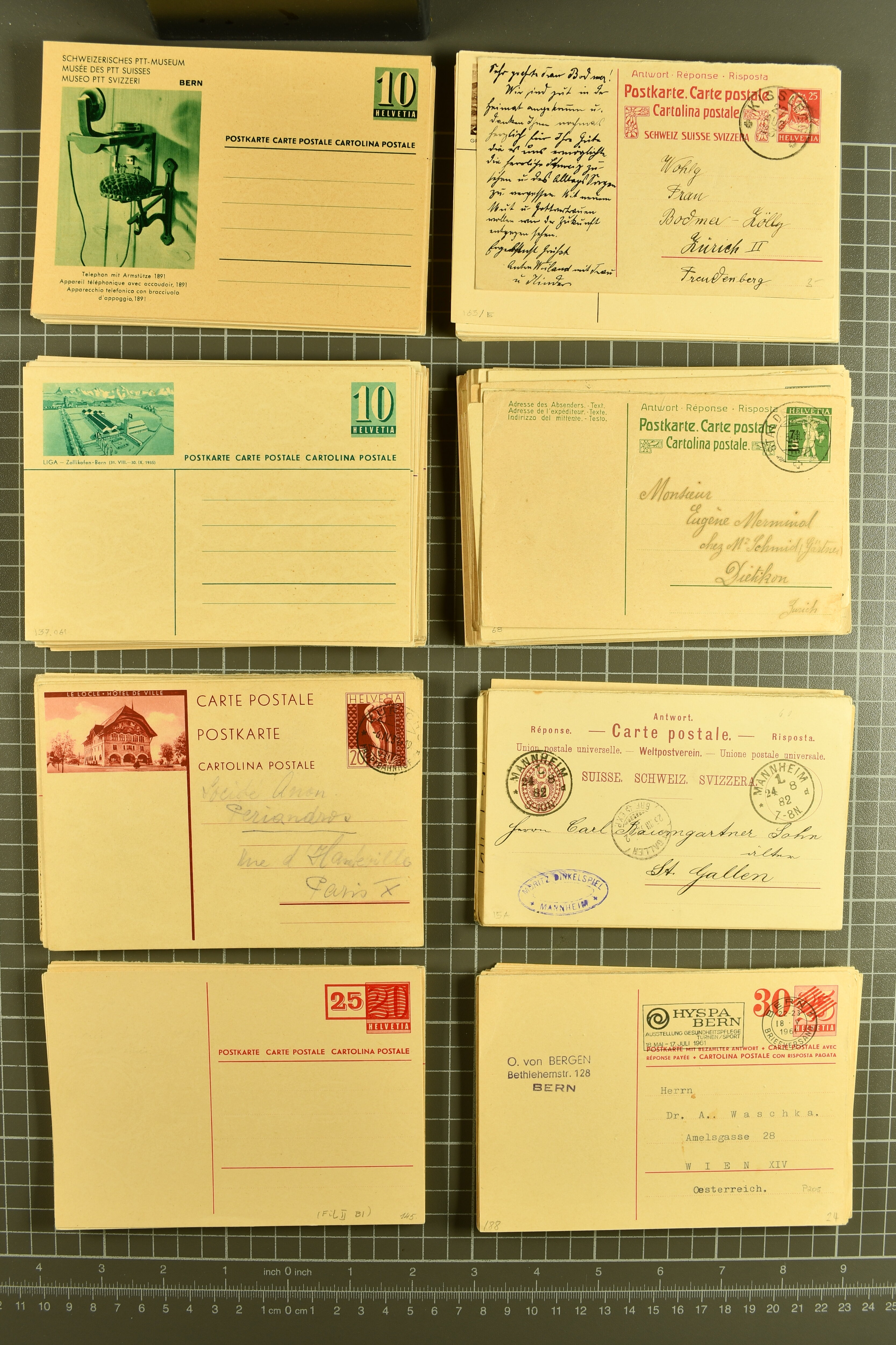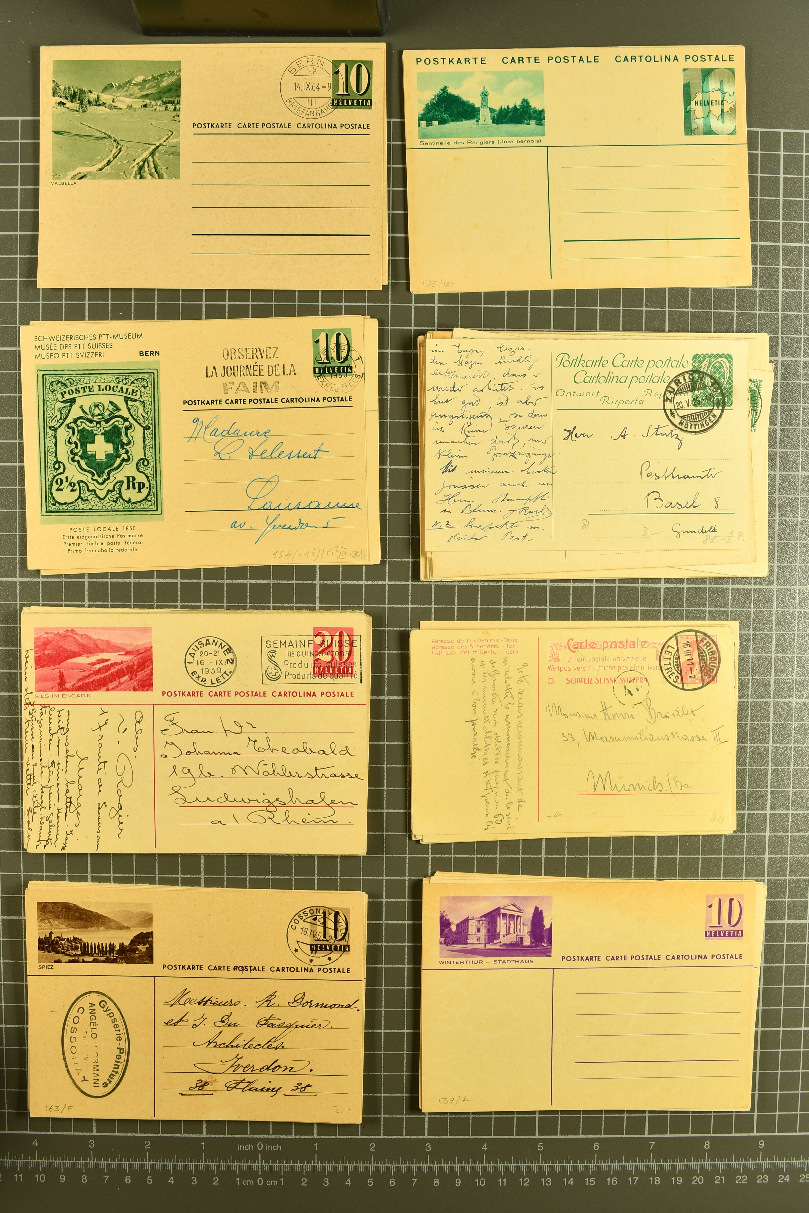 Umschlägen auch zu 12 oder 15 Rappen, Zusatzfrankaturen, Drucksachen-Karten mit Besuchsanzeigen, zwei Bahnhofsbriefe; weiterhin 120 meist ungebrauchte Umschläge / Karten meist mit zwei oder drei Wertstempeln; sowie 80 häufige nahezu vollständig