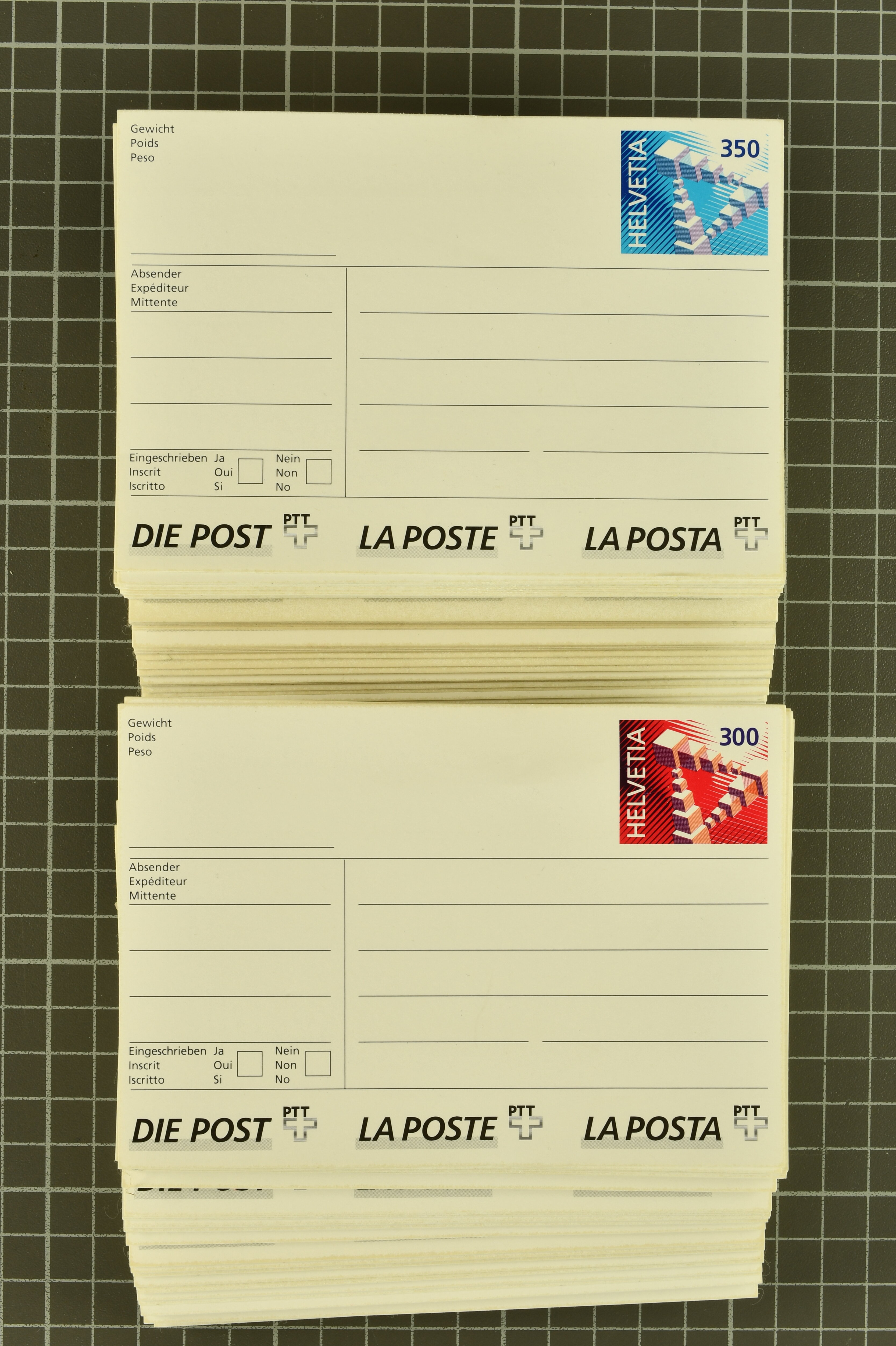 Aufdruckausgabe: ca. 1’400+ Stück. 'Tel. Gruss' 9'900 Stück dazu noch eine Schachtel mit diversen gültigen Karten und Kartenheften in kleineren Mengen insgesamt über 23'000 Karten, Nominalwert = CHF 10’000+. Einge wenige gestempelte sind auch