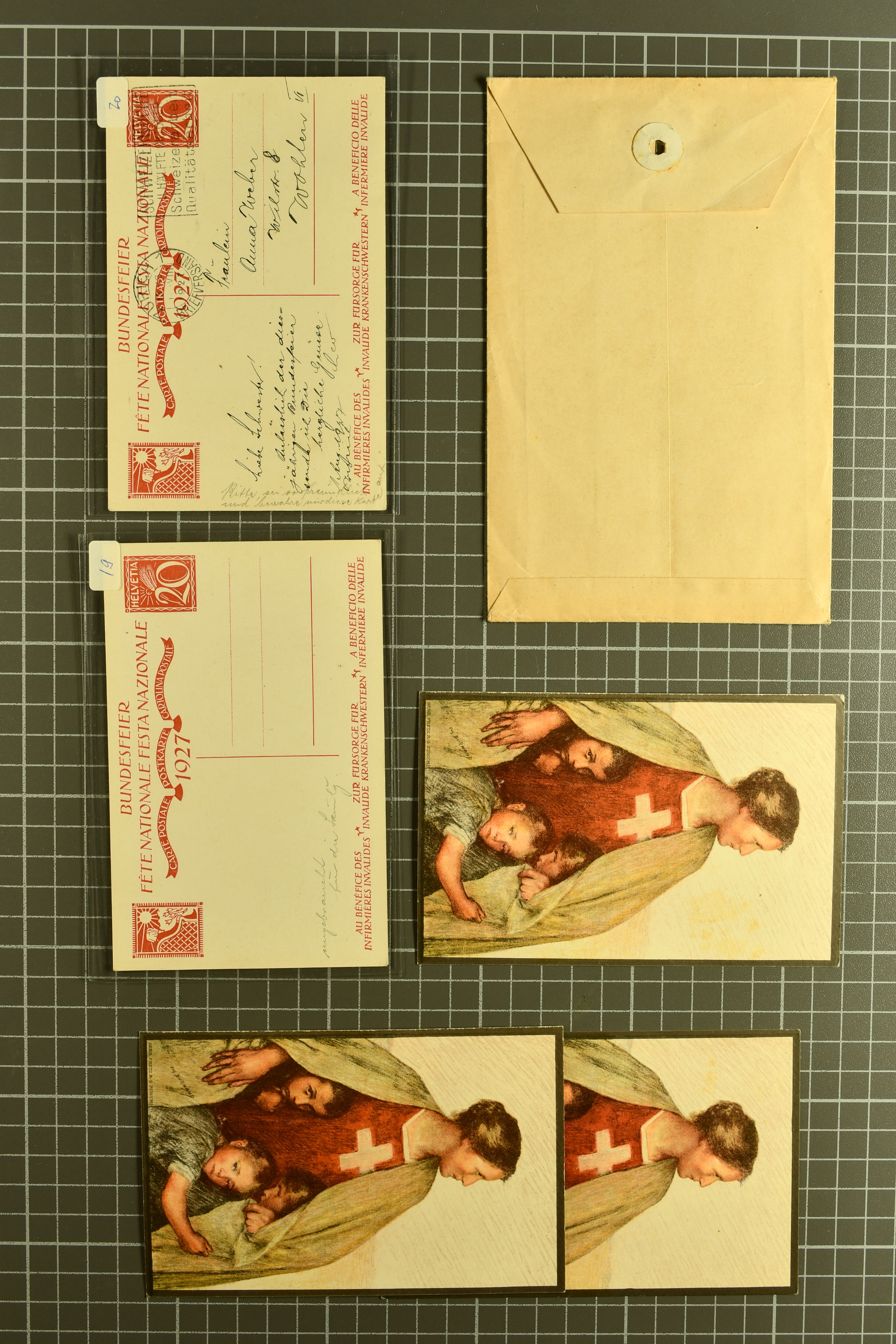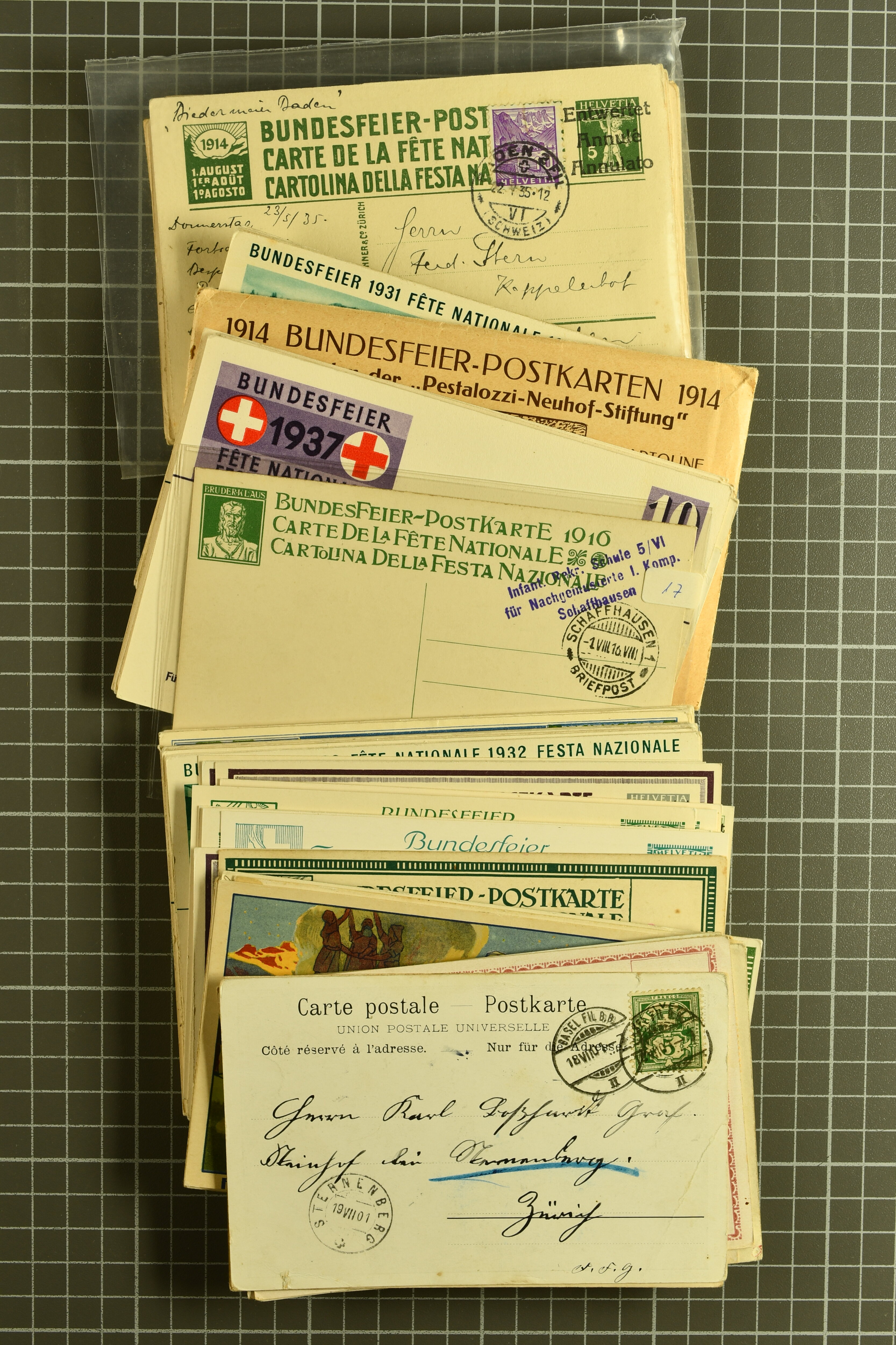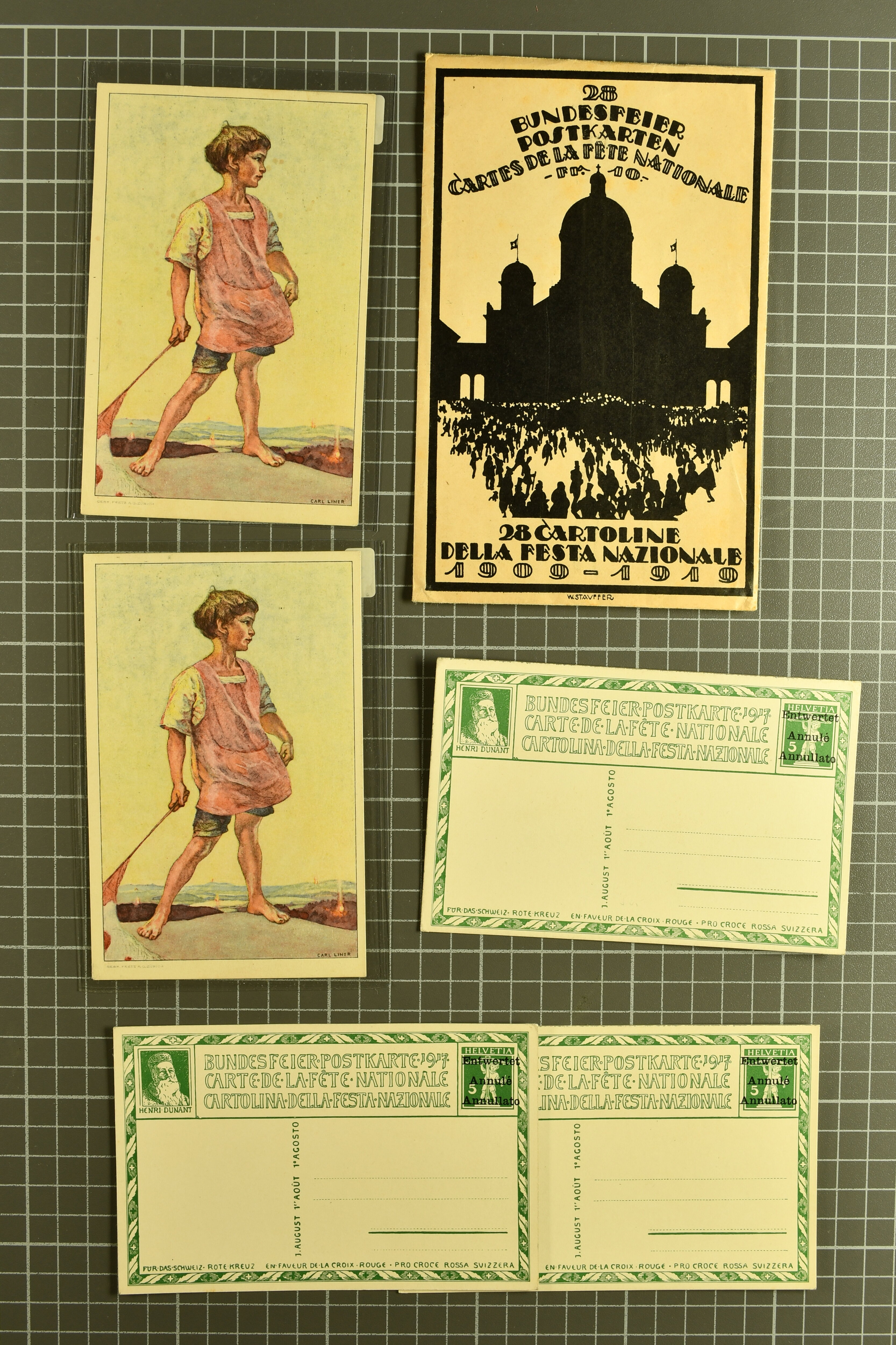 1914/33: Partie Bundesfeierkarten gebraucht und ungebraucht, dabei viele 'ENTWERTET' oder ohne Wertstempel, oft als Feldpost verwendet, dann 20 Rp. Kind mit Fahne 1928 gestempelt und gelaufen und ungebraucht; 25