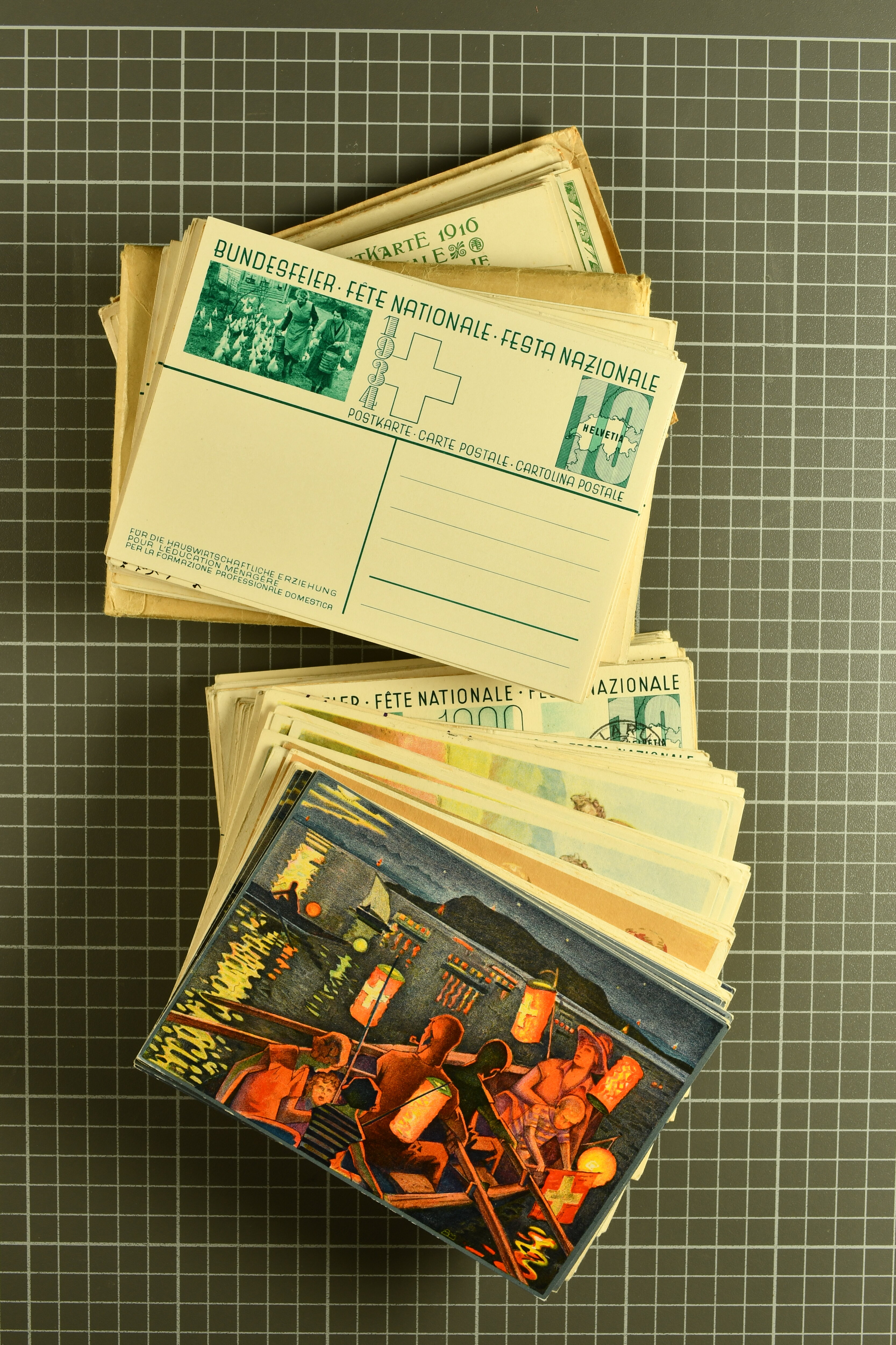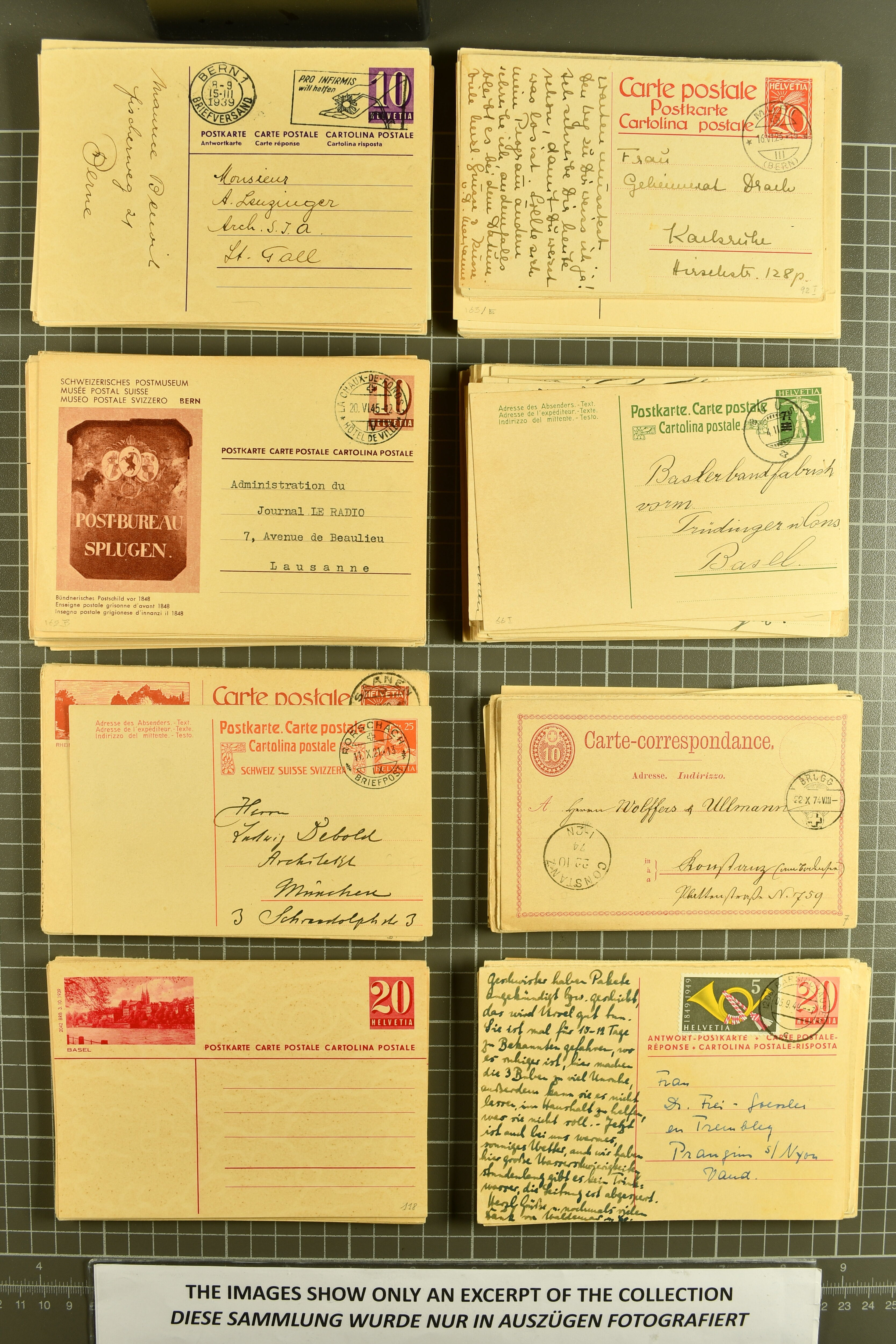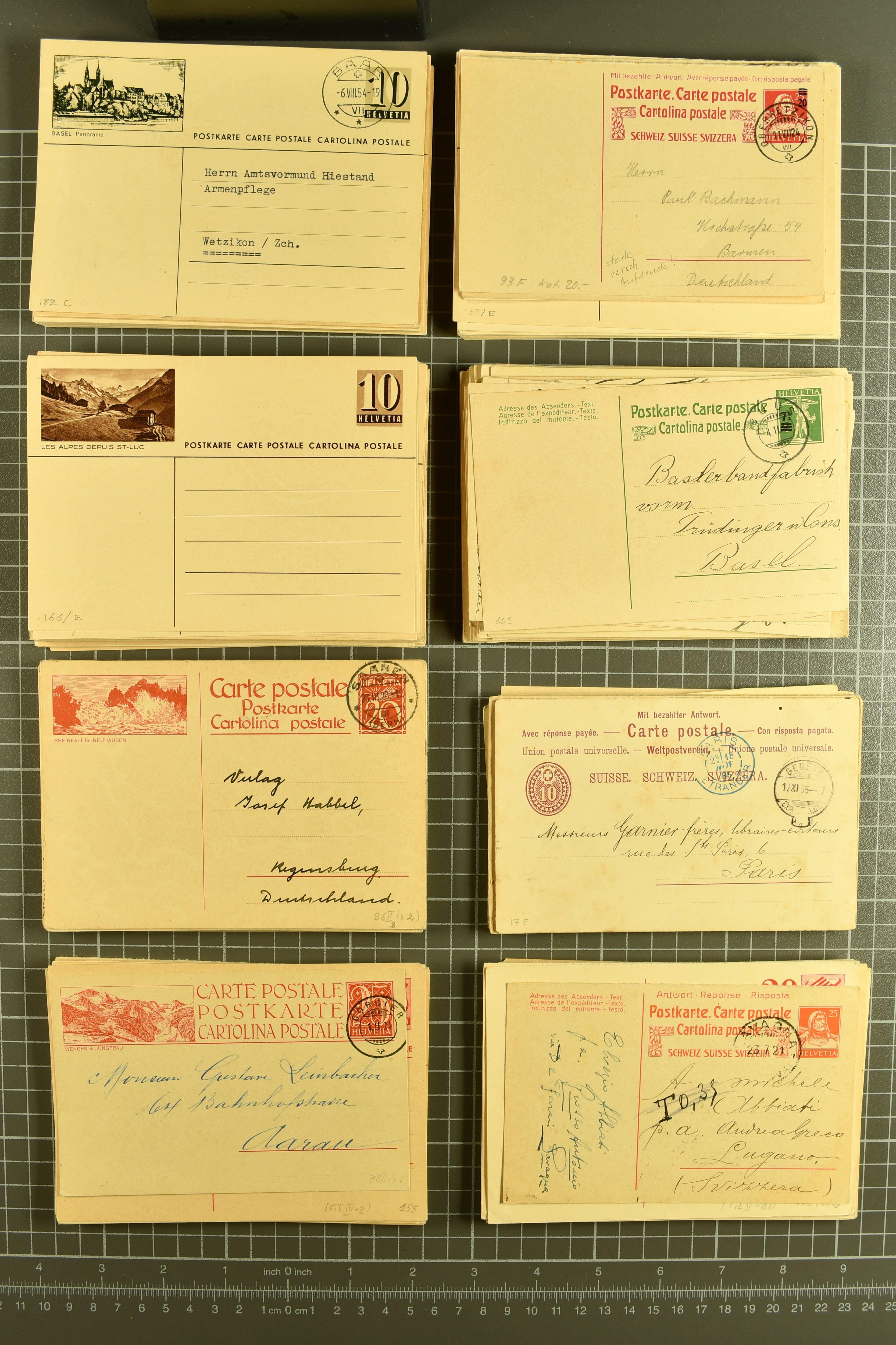 1924/60ca: Riesiger Bestand zumeist Bildpostkarten mit den Wertstempeln 'Ziffer mit Taube', 'Ziffer mit Ähren', 'Mater Fluviorum', 'Ziffer und Schweizkarte', sowie 'Grosse Wertziffer'; gebraucht und ungebraucht, überwiegend Inland- aber auch
