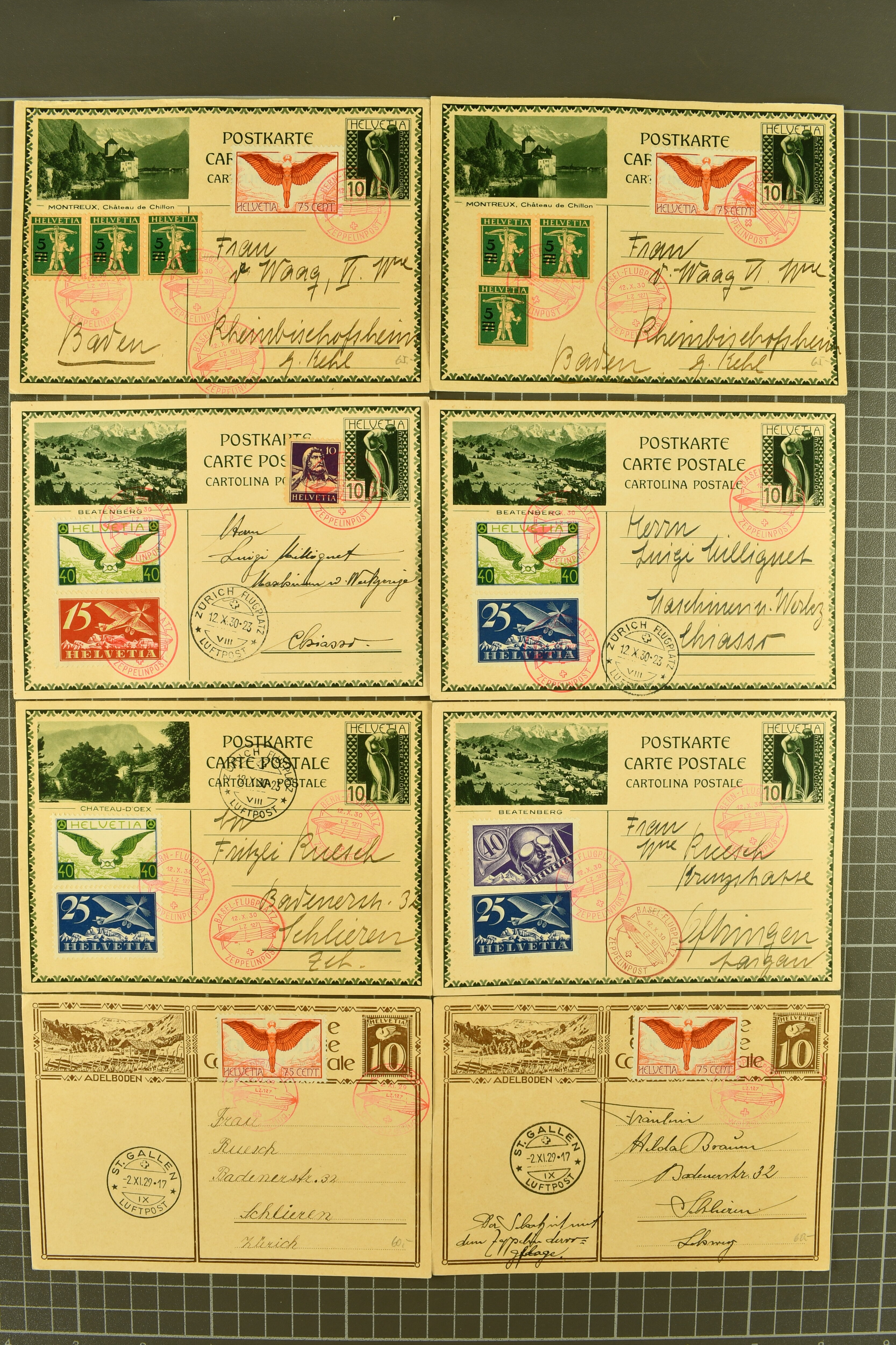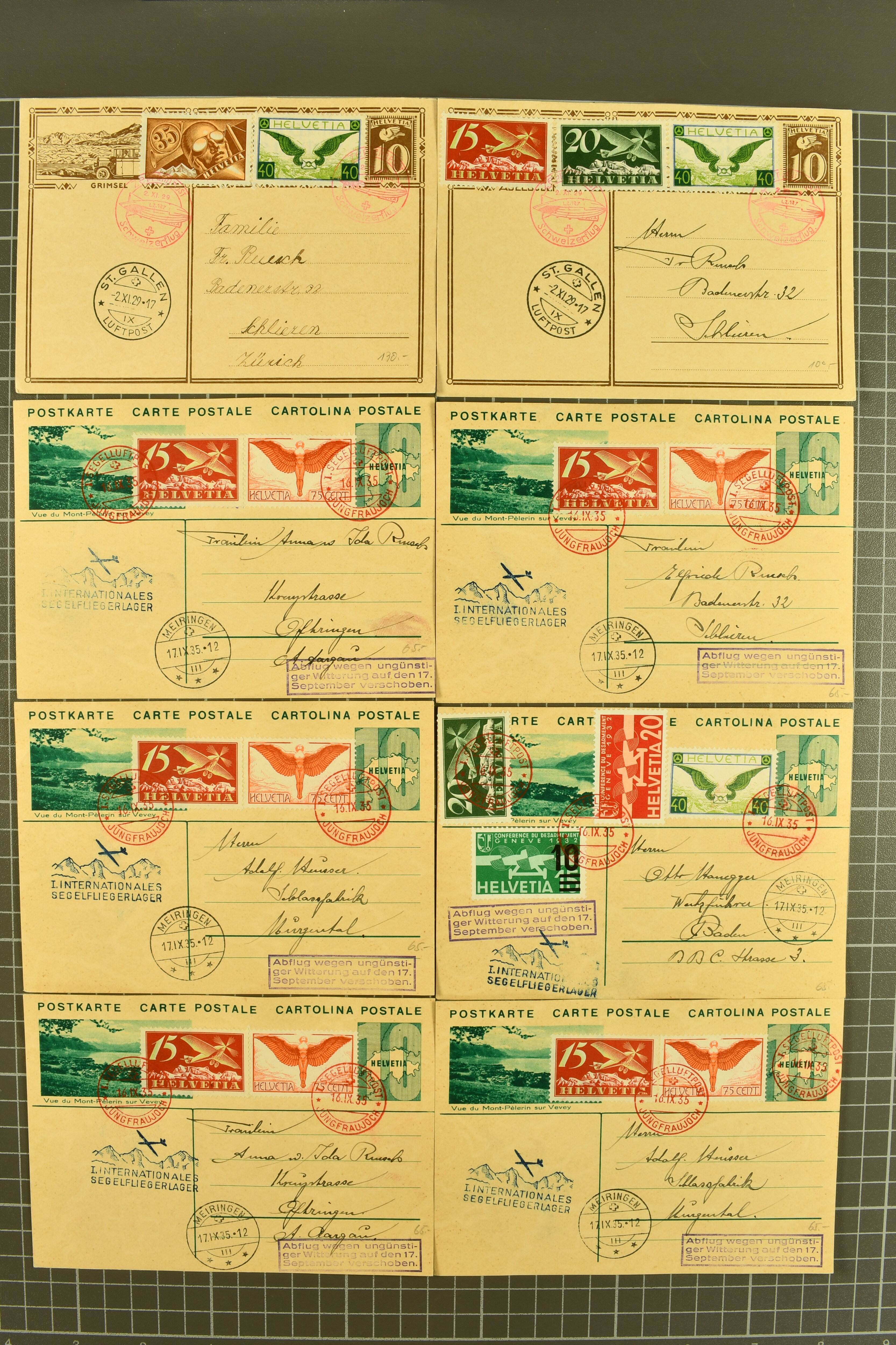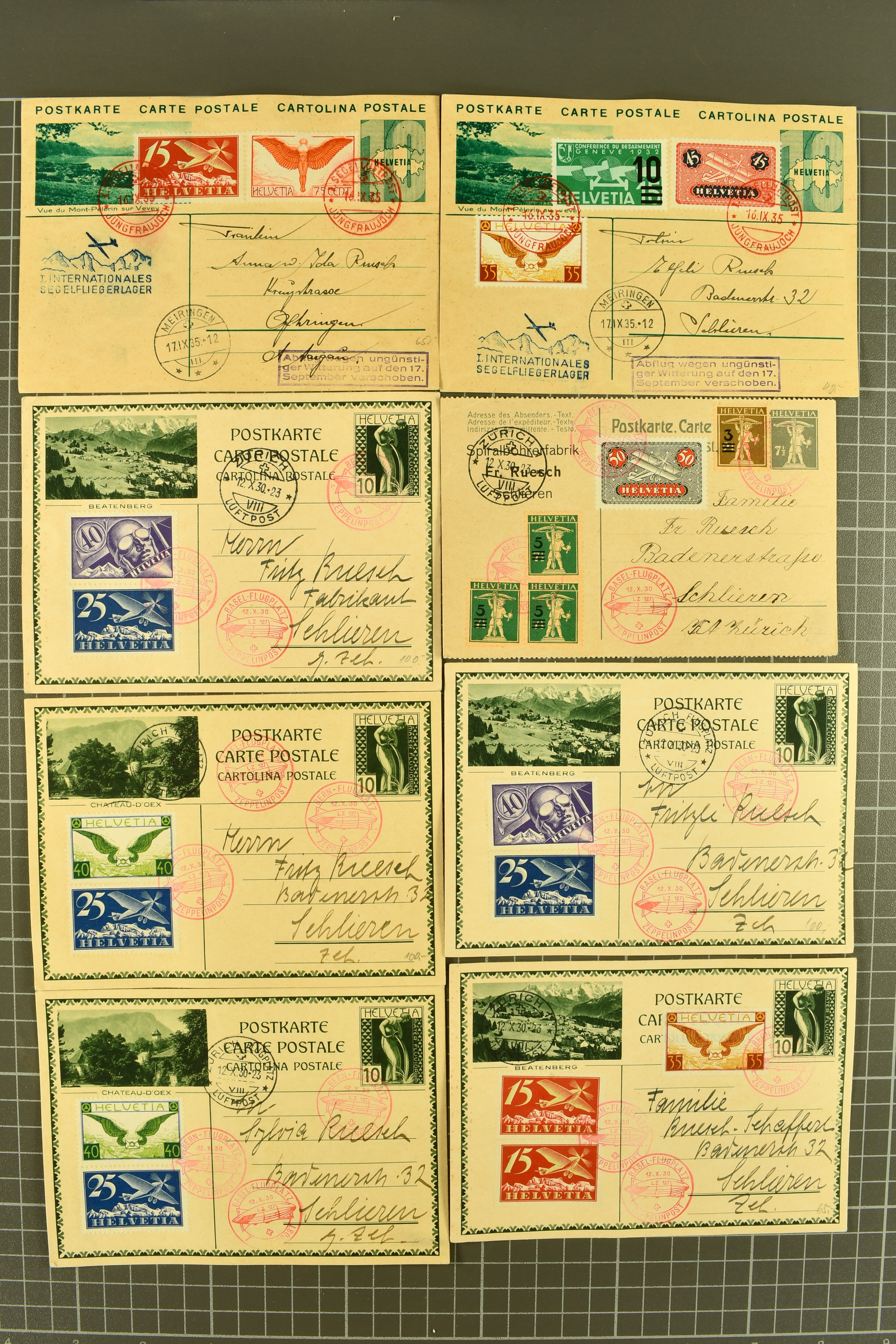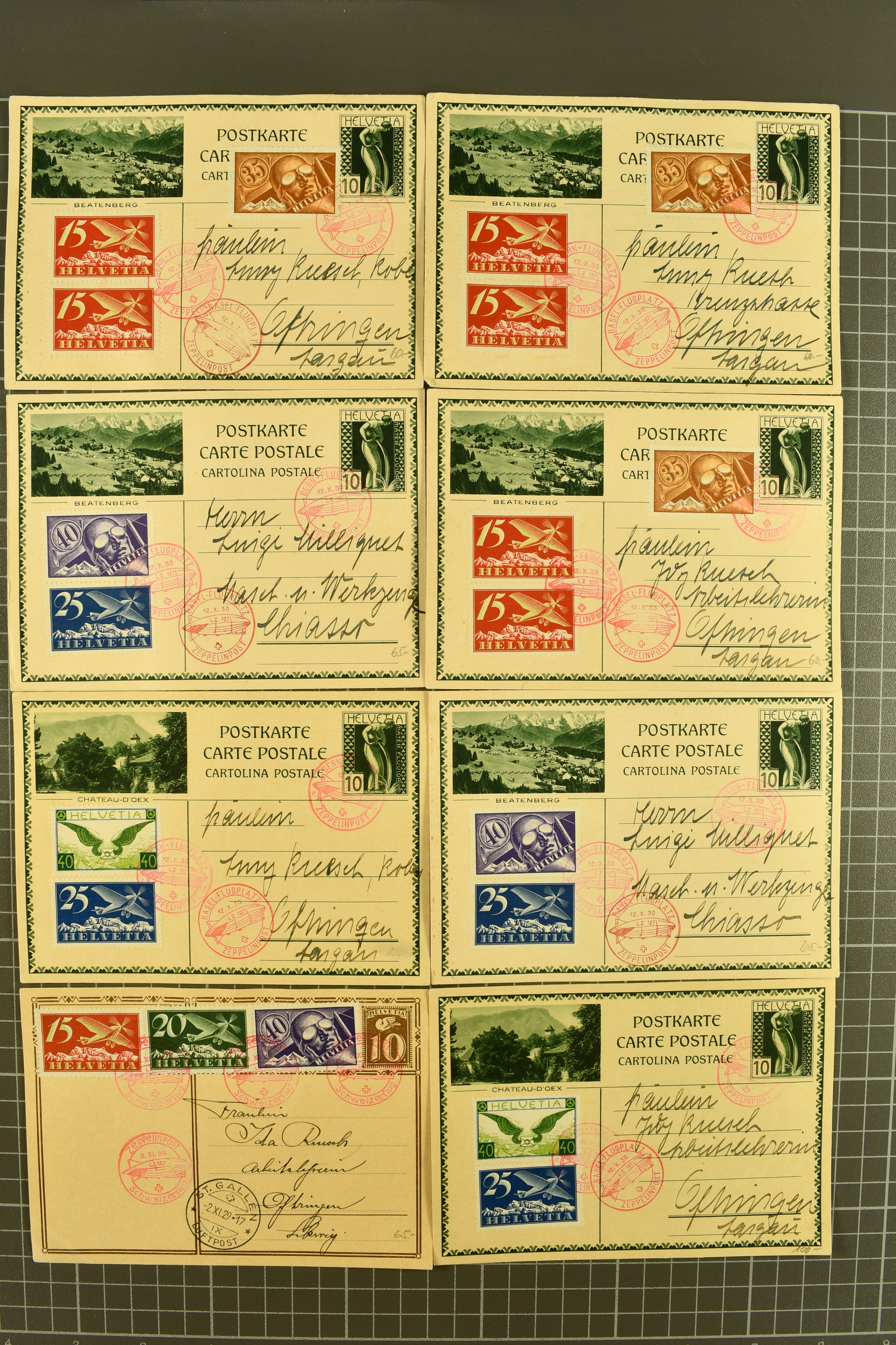 1929/35: Sauberes Lot von 68 Bildli-Ganzsachenpostkarten, überwiegend für häufige Flüge verwendet, jeweils hochwertig zusätzlich frankiert. Viele Kombinationen mehrfach vorhanden. Besonders häufig verwendet sind