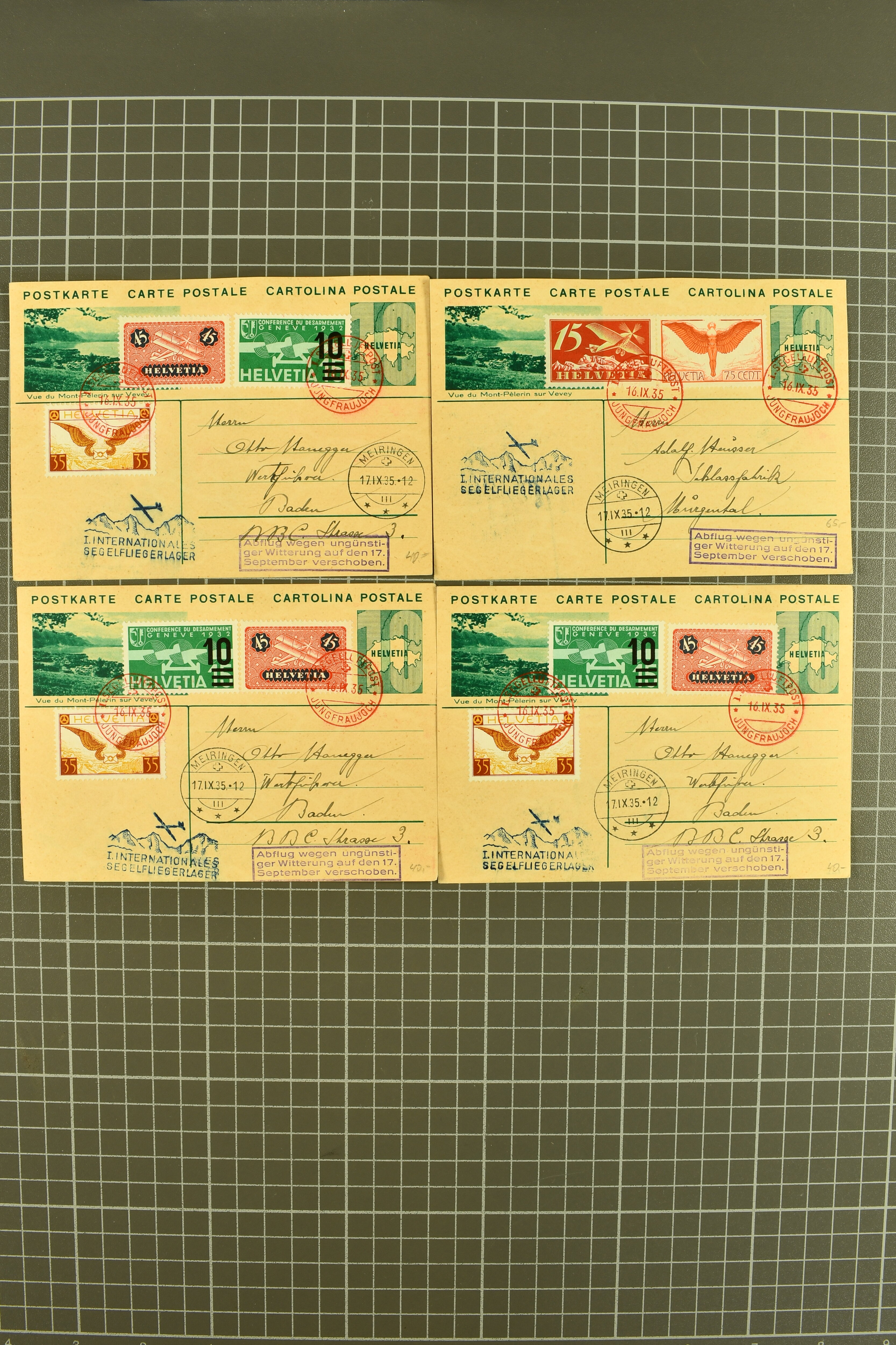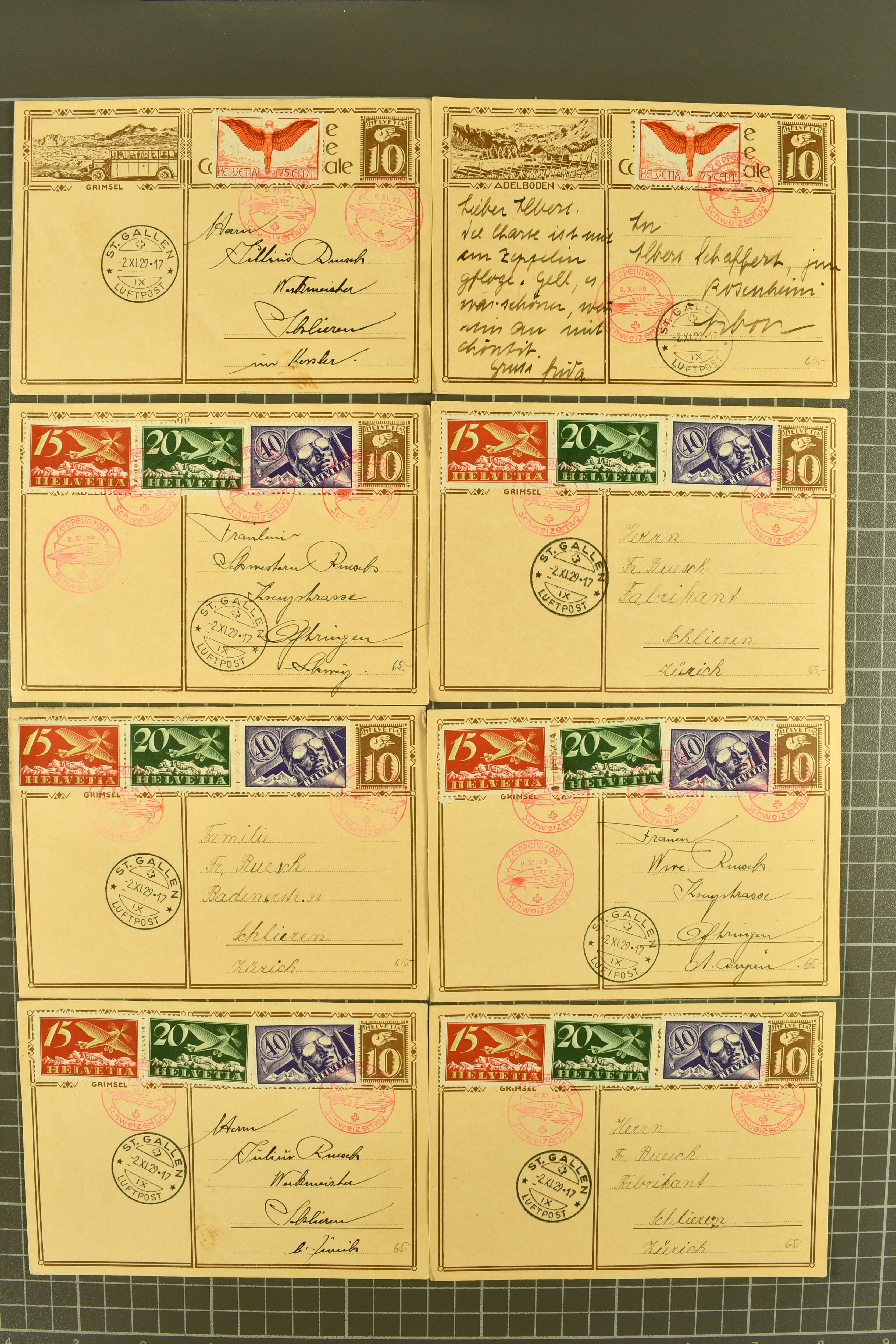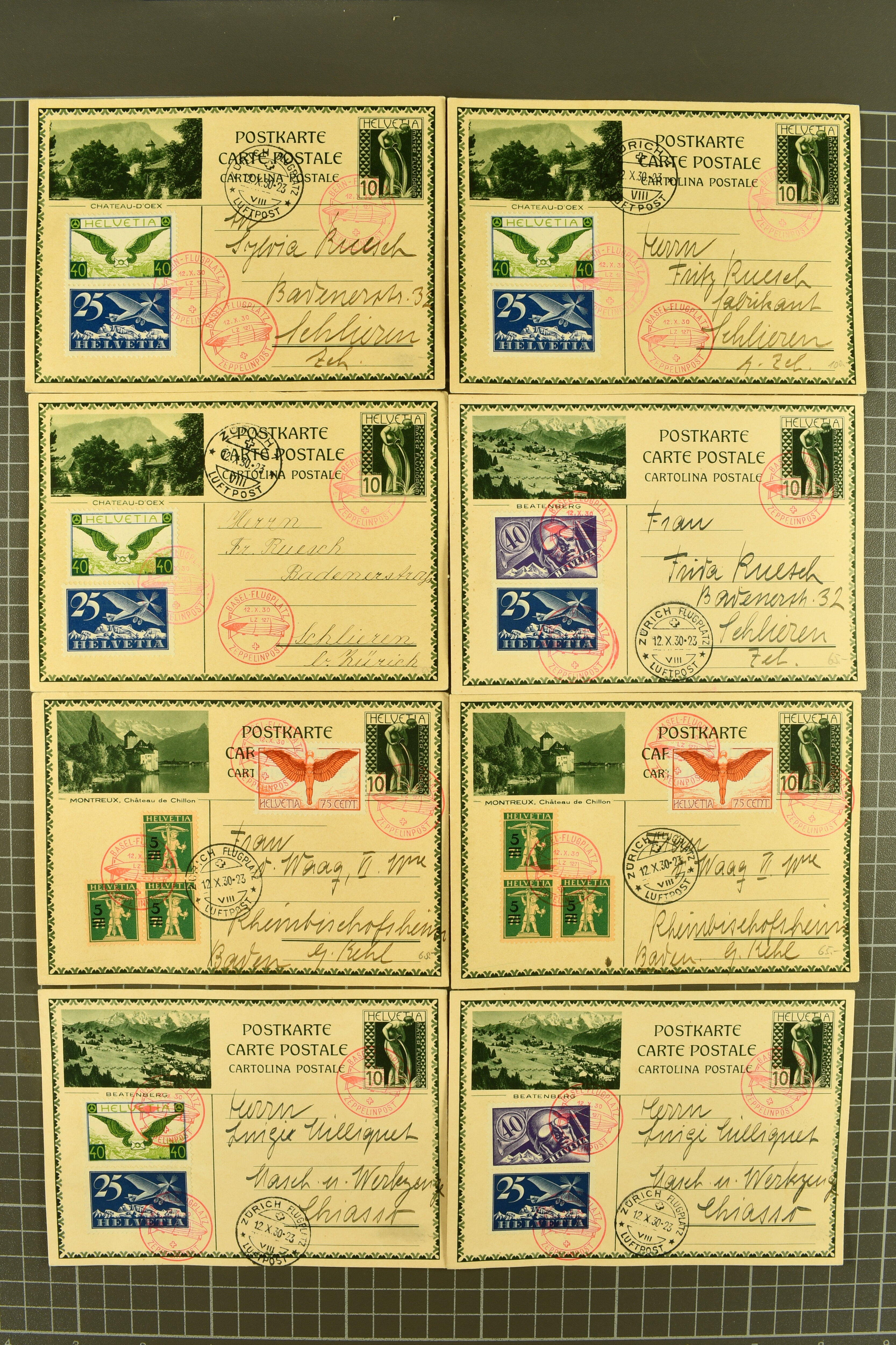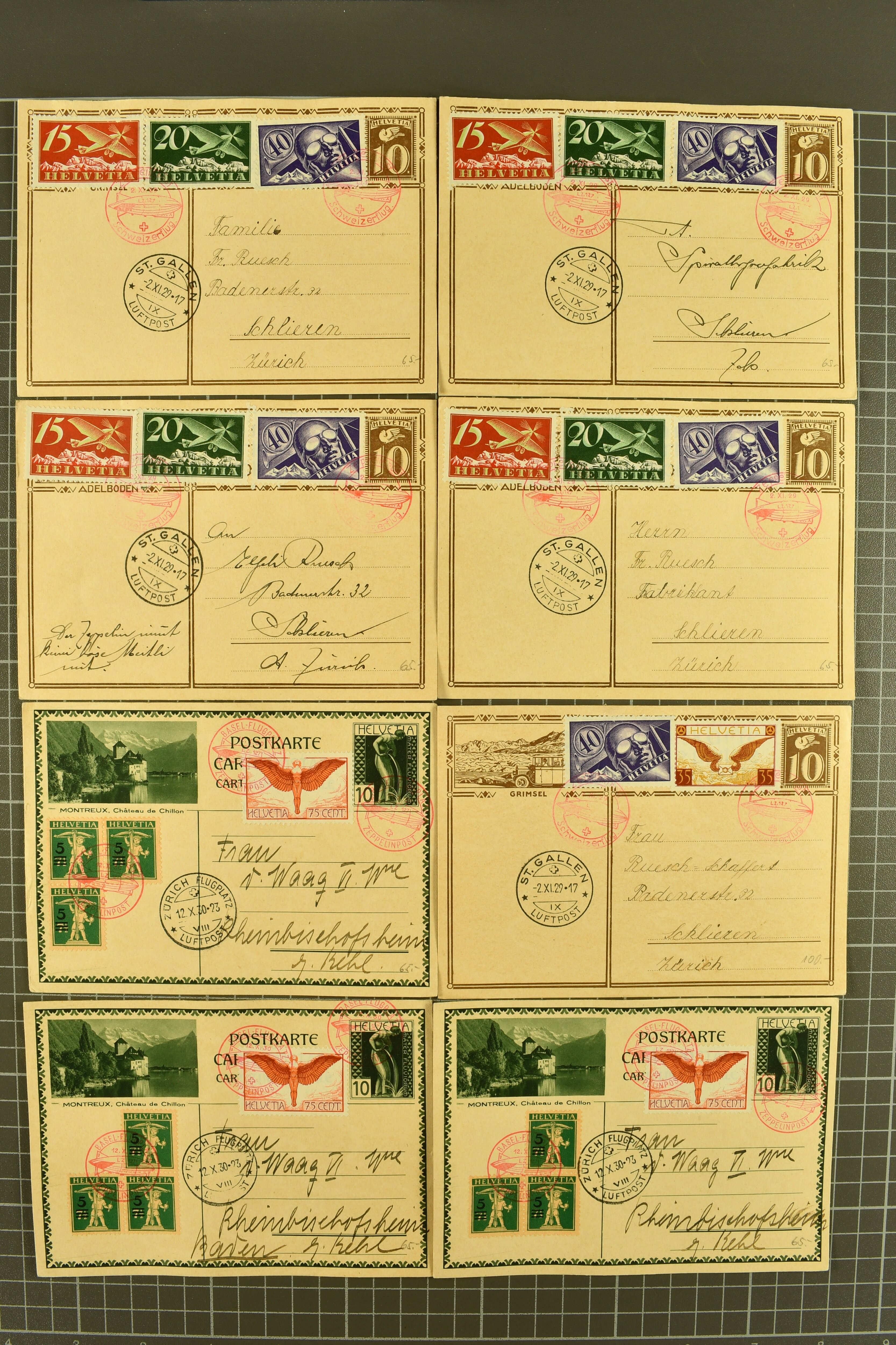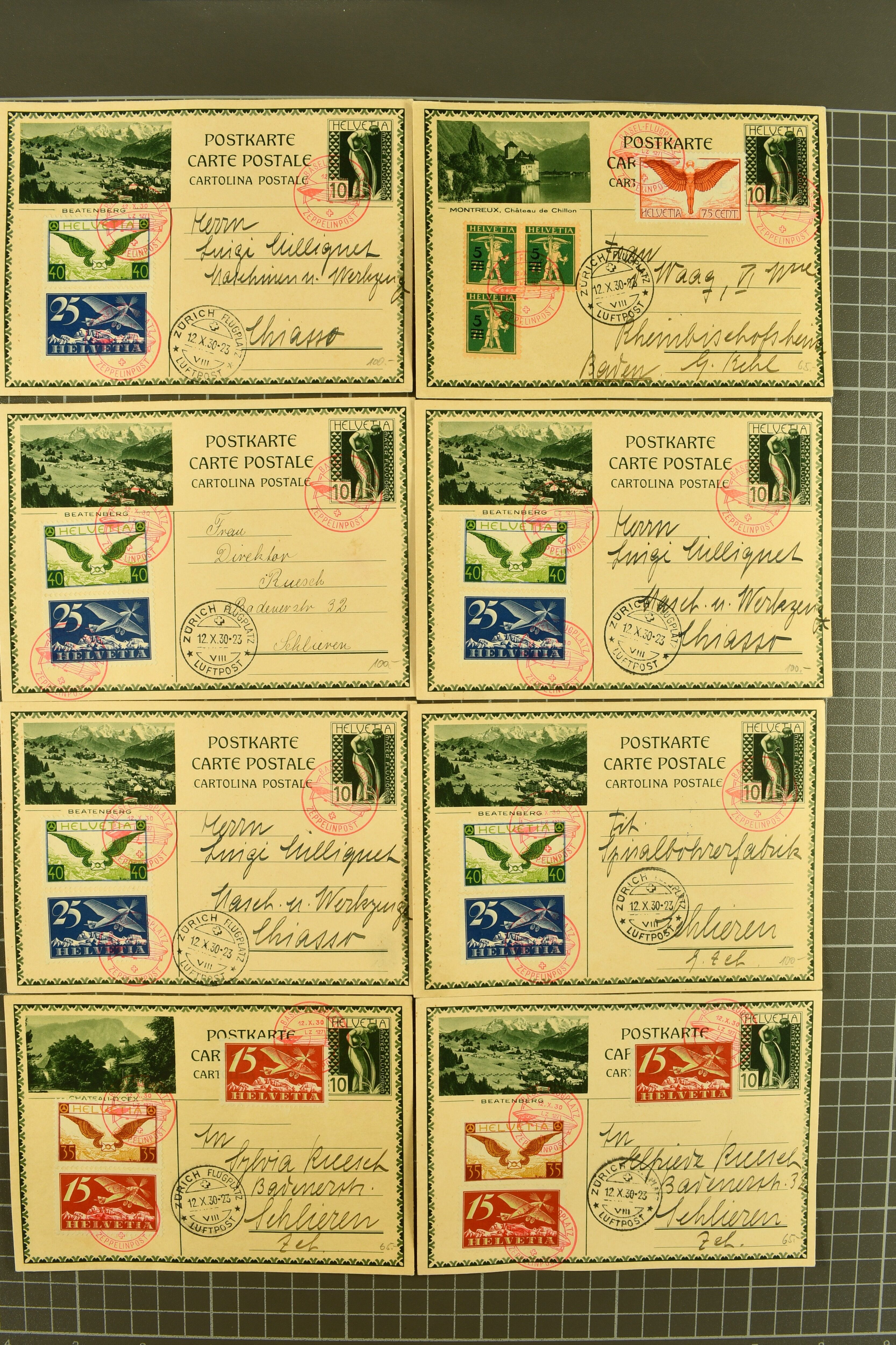 1929/35: Sauberes Lot von 68 Bildli-Ganzsachenpostkarten, überwiegend für häufige Flüge verwendet, jeweils hochwertig zusätzlich frankiert. Viele Kombinationen mehrfach vorhanden. Besonders häufig verwendet sind