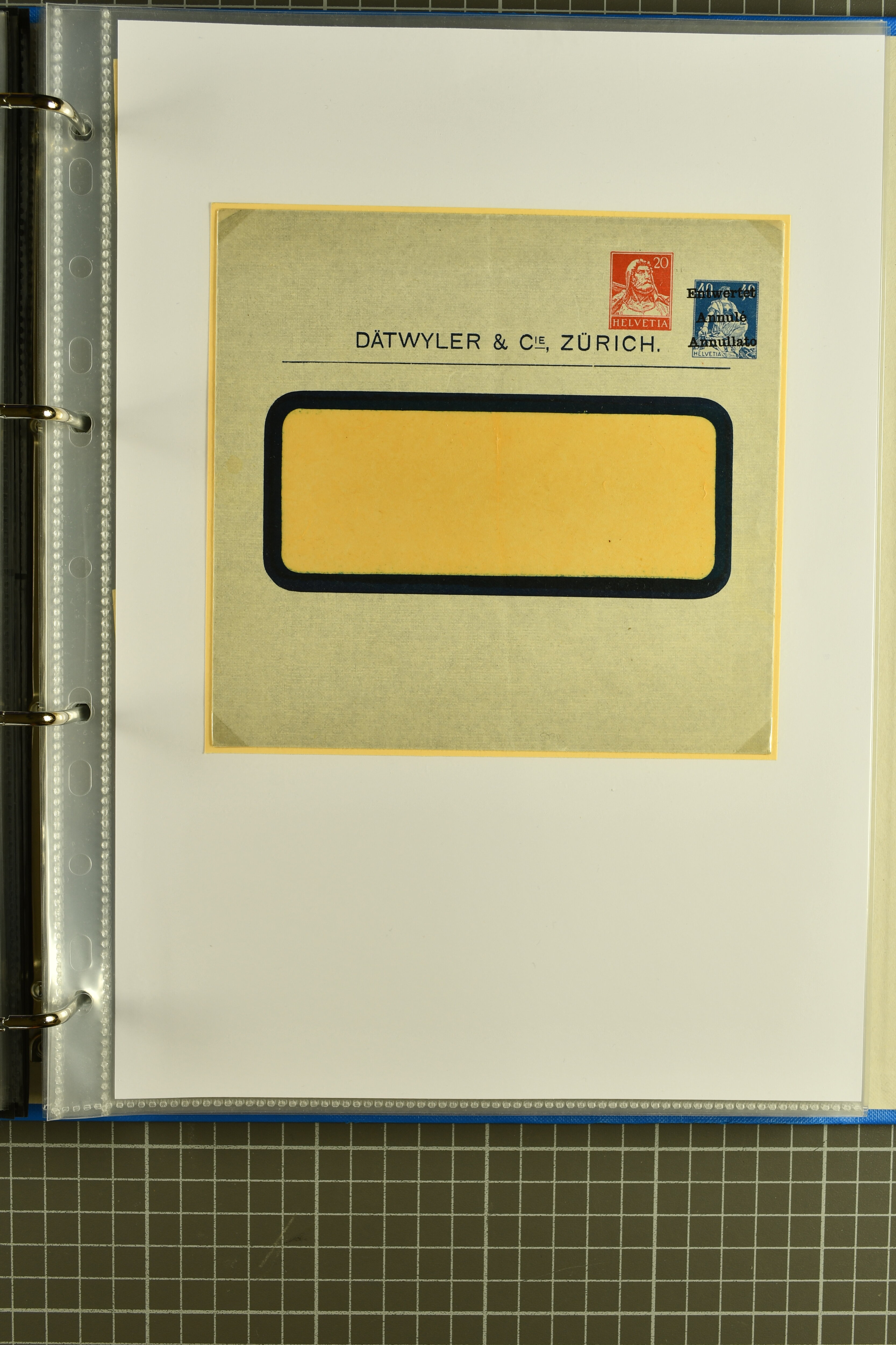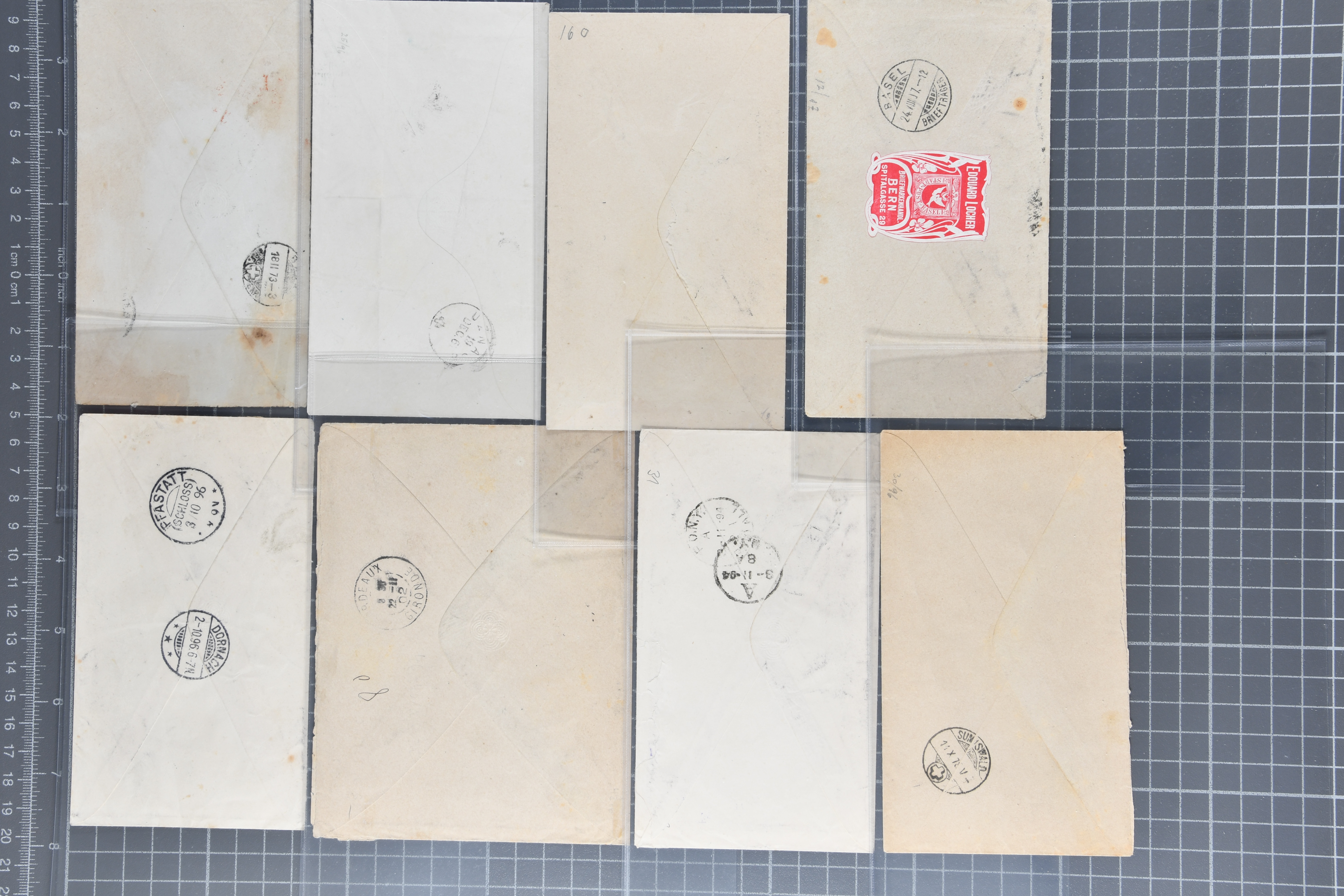 1869/70: Lot von 4 Tübli-Ganzsachenumschlägen – 10 Rp. mit „SPÉCIMEN“ auf dem Wertstempel und privatem Zudruck „A ESCHER…“; 25 Rp. gebraucht mit Privatzudruck „Papierfabrik BIBERIST SCHWEIZ“; 30 Rp. + 30 Rp. sitzende Helvetia