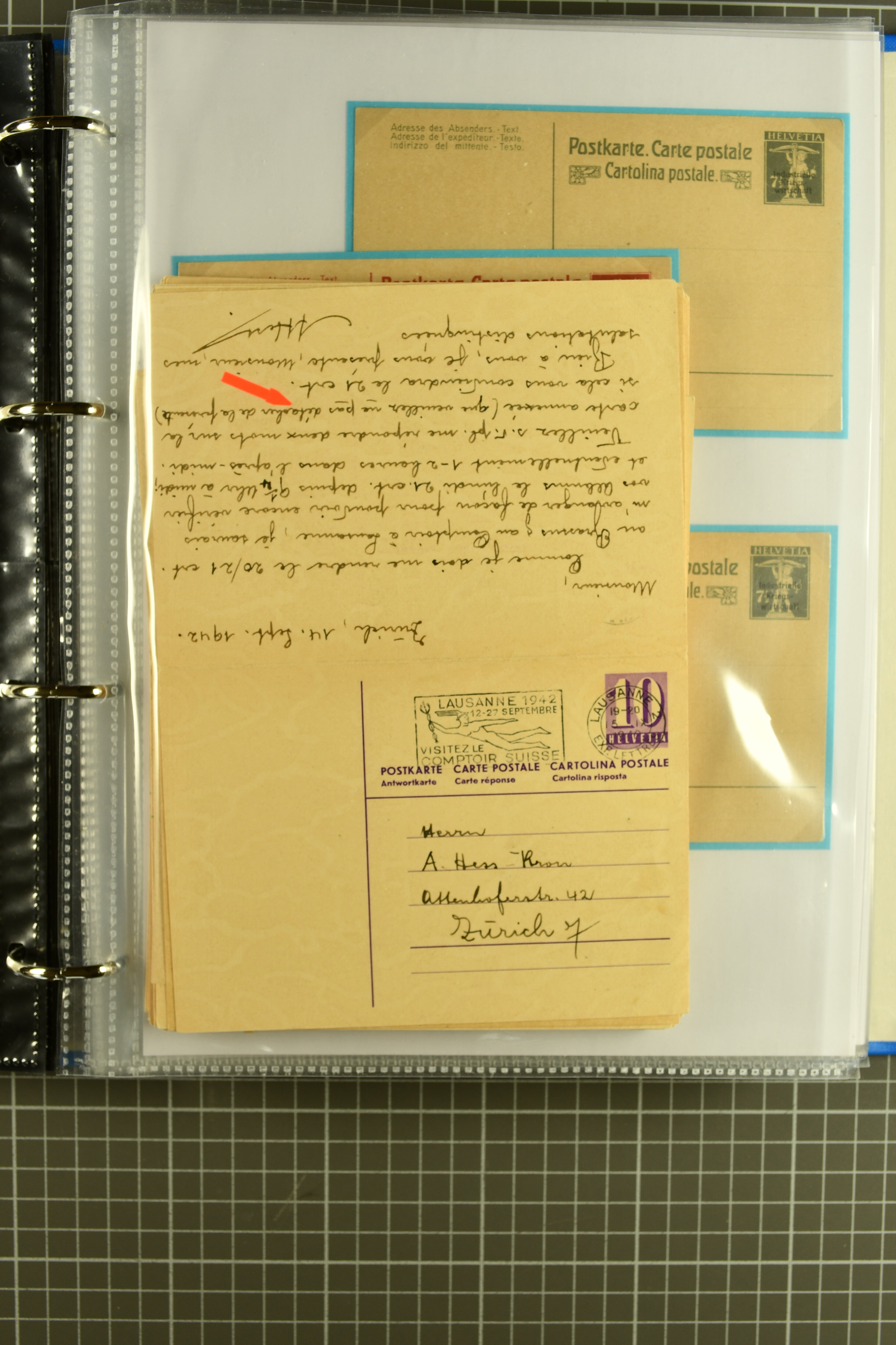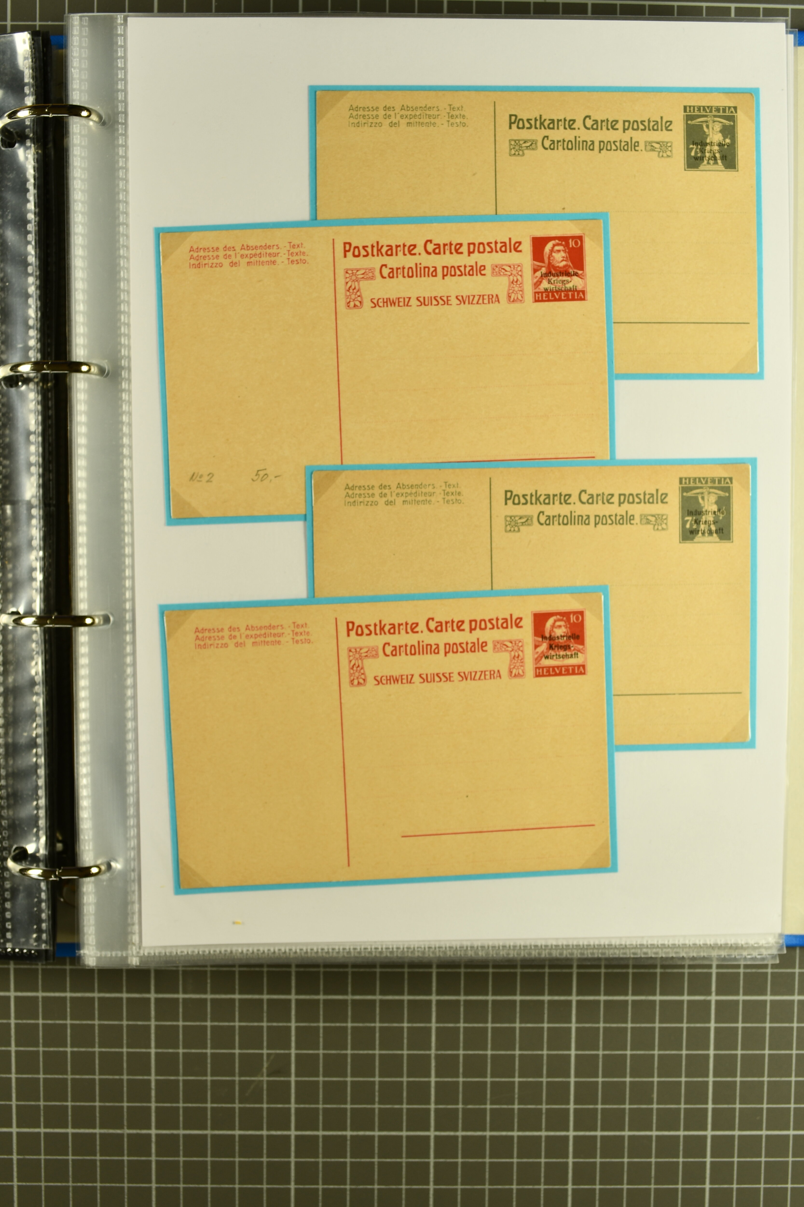 Helvetia mit Schwert 20 Rp., 30 Rp., 40 Rp. lila und 40 Rp. grünblau sowie seltene 40 Rp. blau der Fa. Demme, Bern; Alle vier Ganzsachenpostkarten 'Industrielle Kriegswirtschaft' ungebraucht , 38 zumeist verschiedene Doppelkarten mehrheitlich
