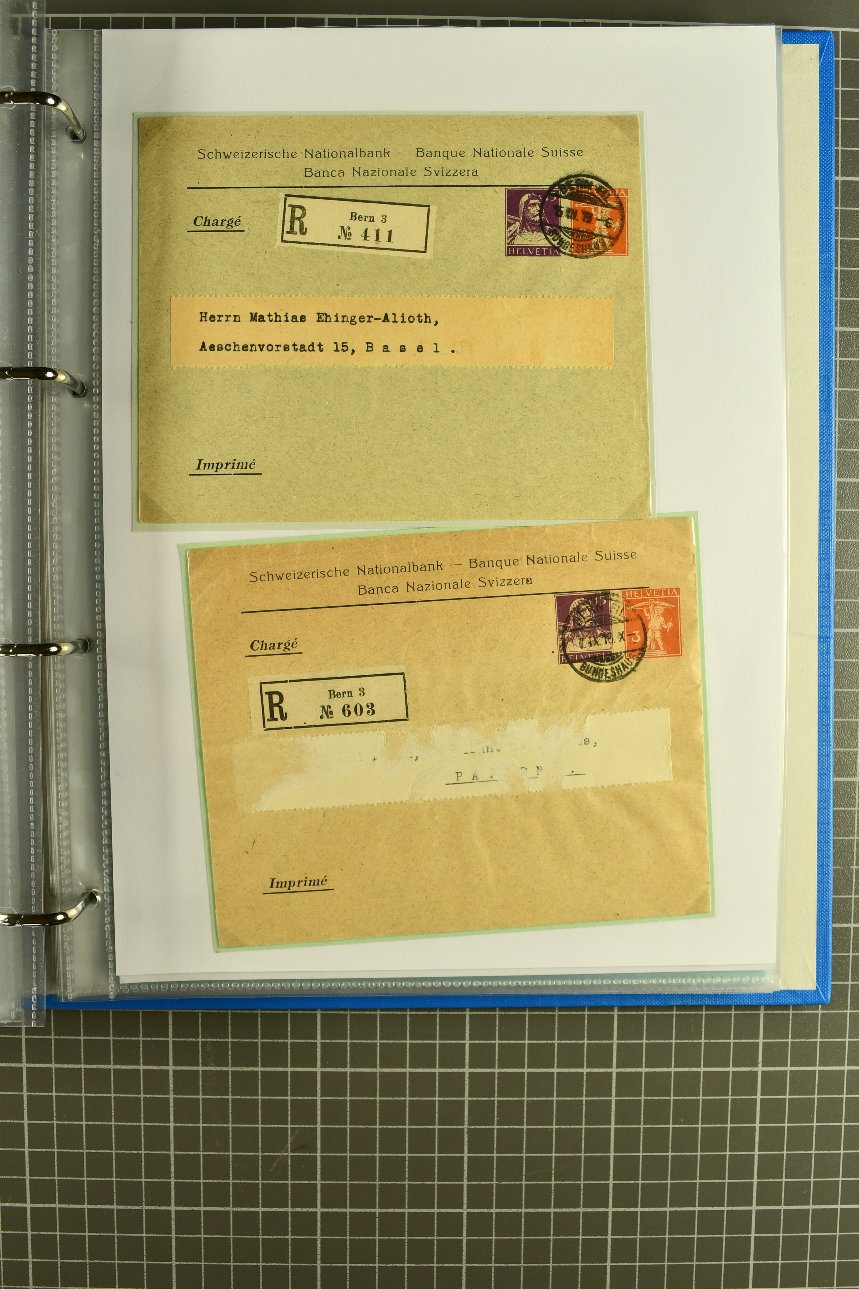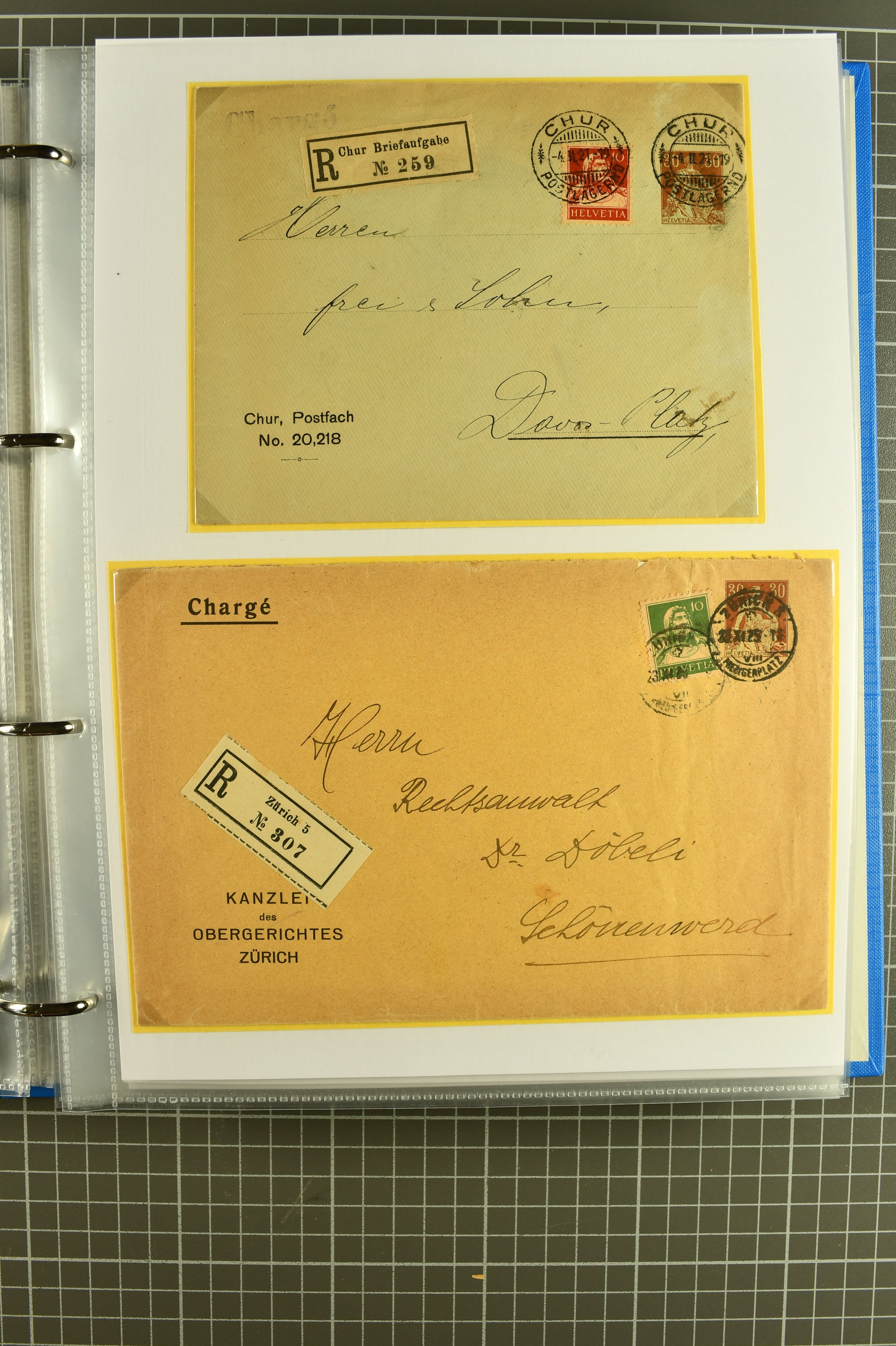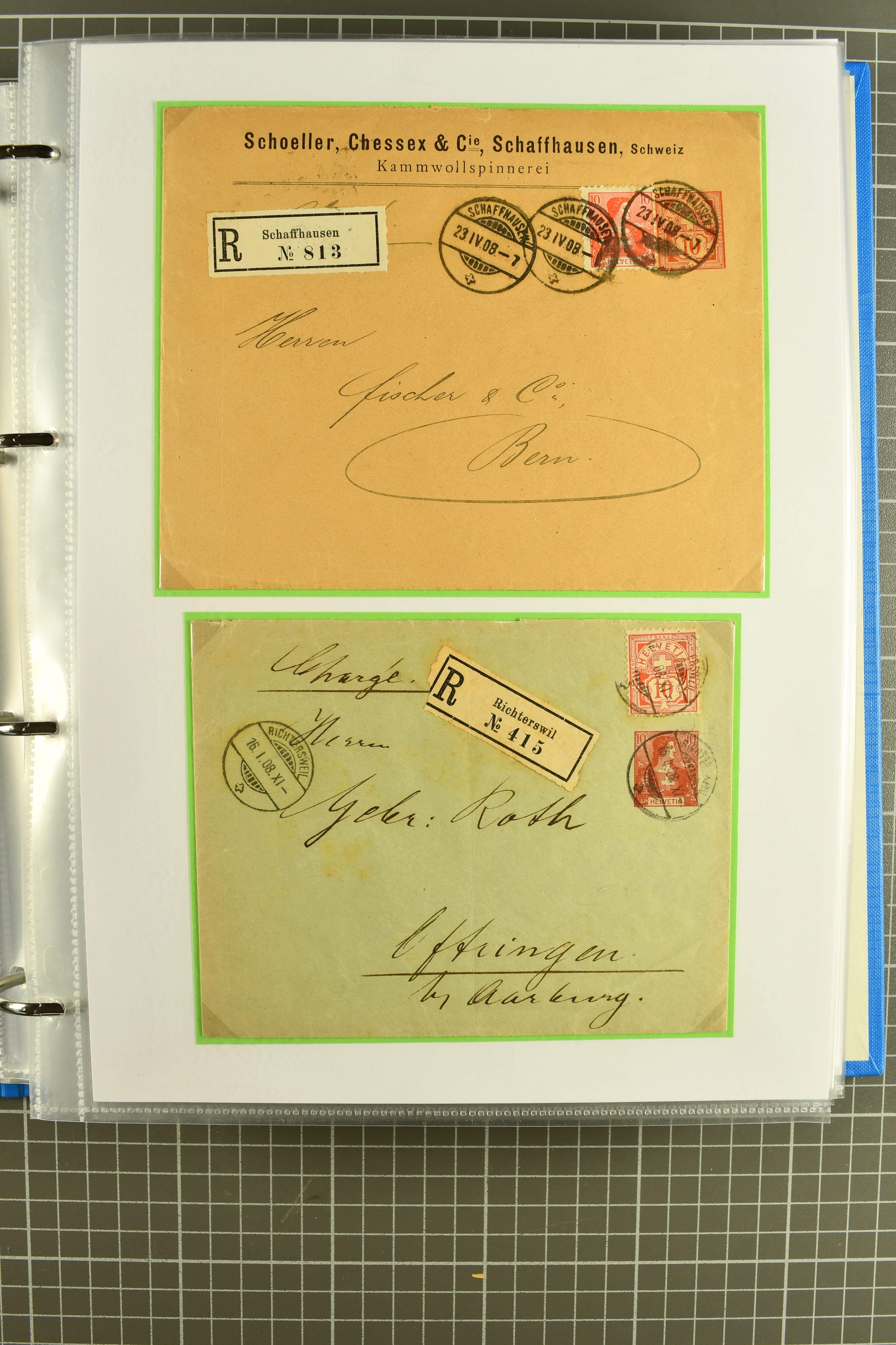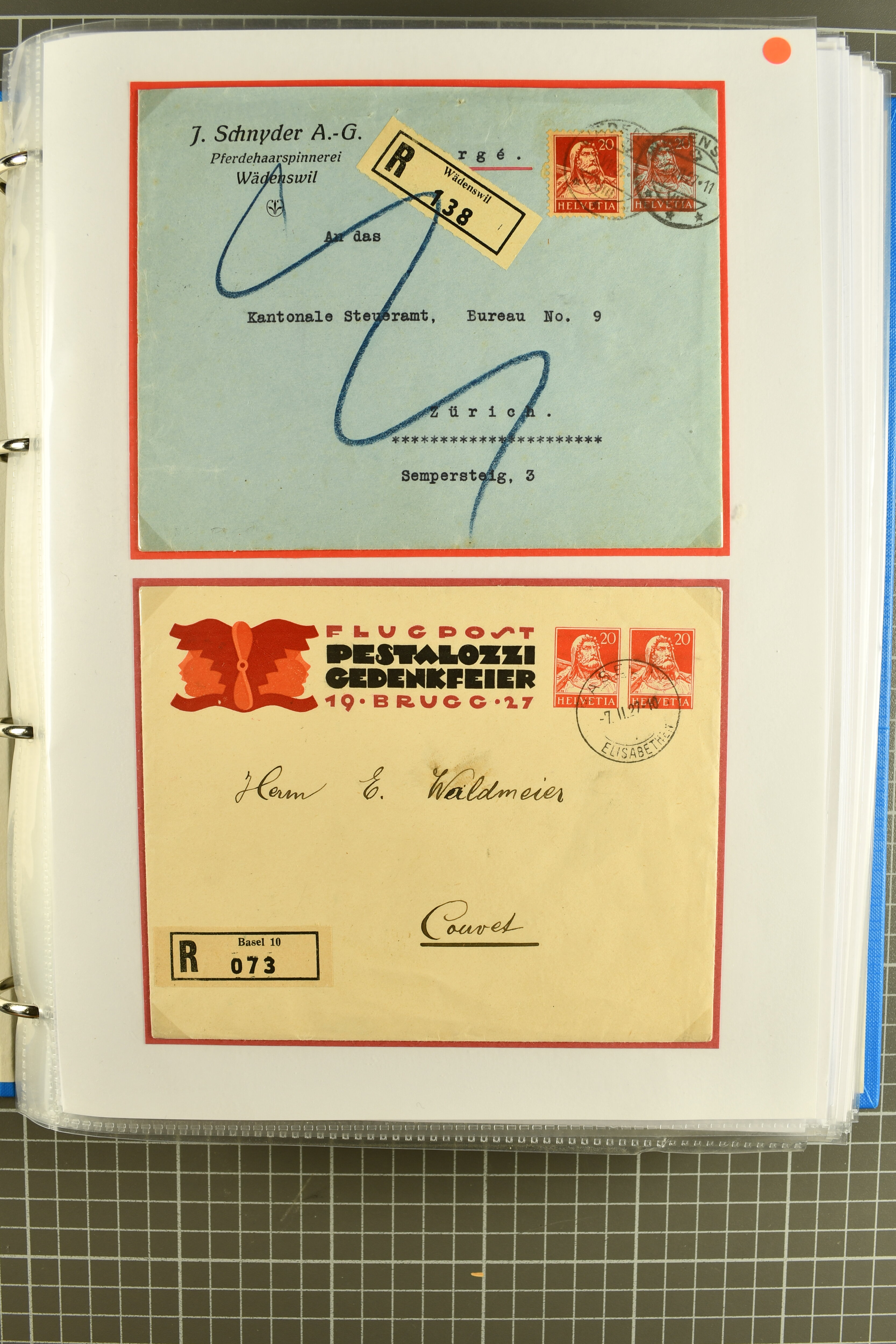 Vierfarben-Zusatzfrankatur 2 Rp. olivbraun, 3 Rp. grau, 5 Rp. lila und 15 Rp. gelb als portogerechte Einschreibefrankatur von Le Sentier (VD) nach Zeulenroda, Thüringen sowie ein ebensolcher Umschlag mit 2 Rp. hellolivbraun, 3 Rp. grau und 10 Rp.
