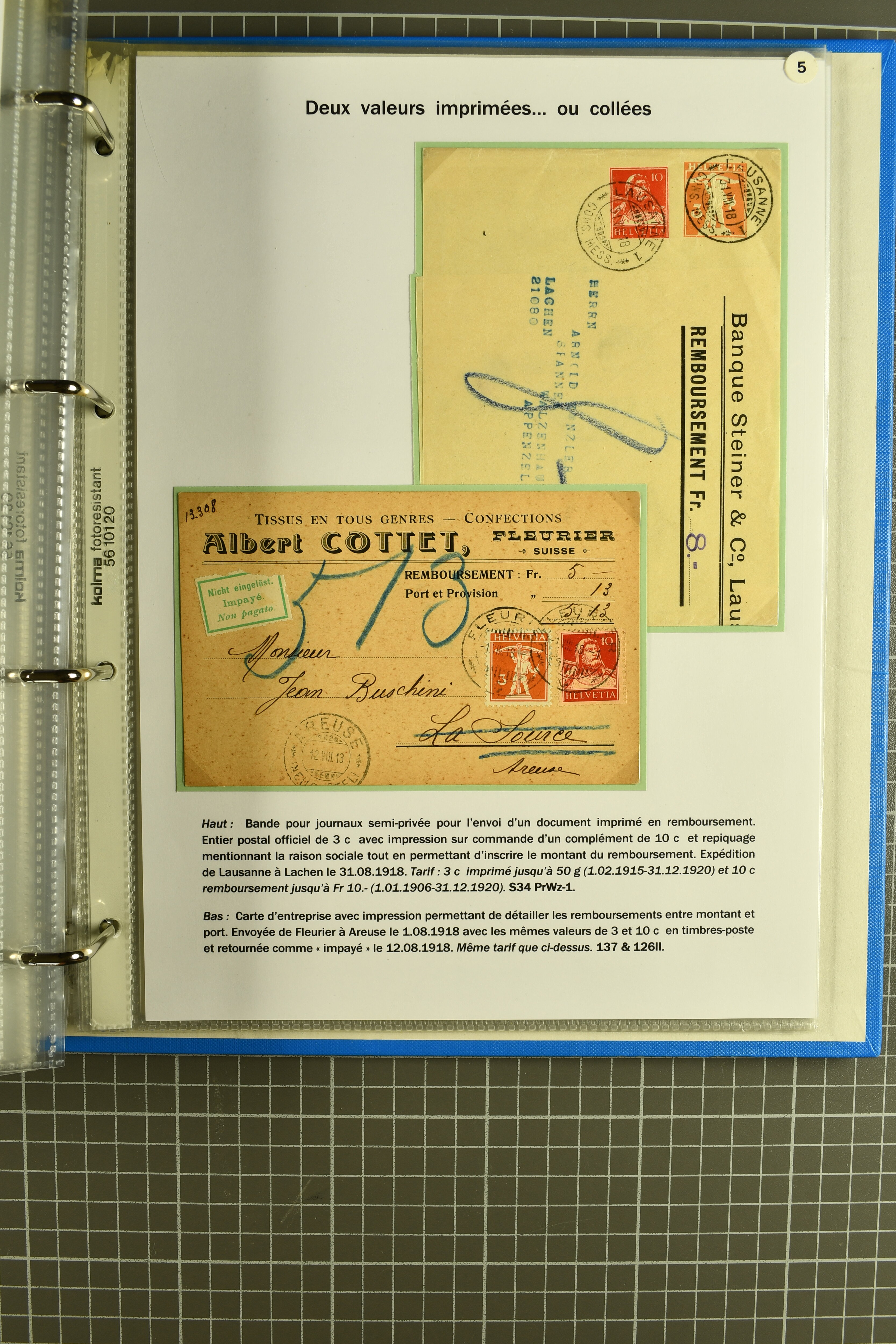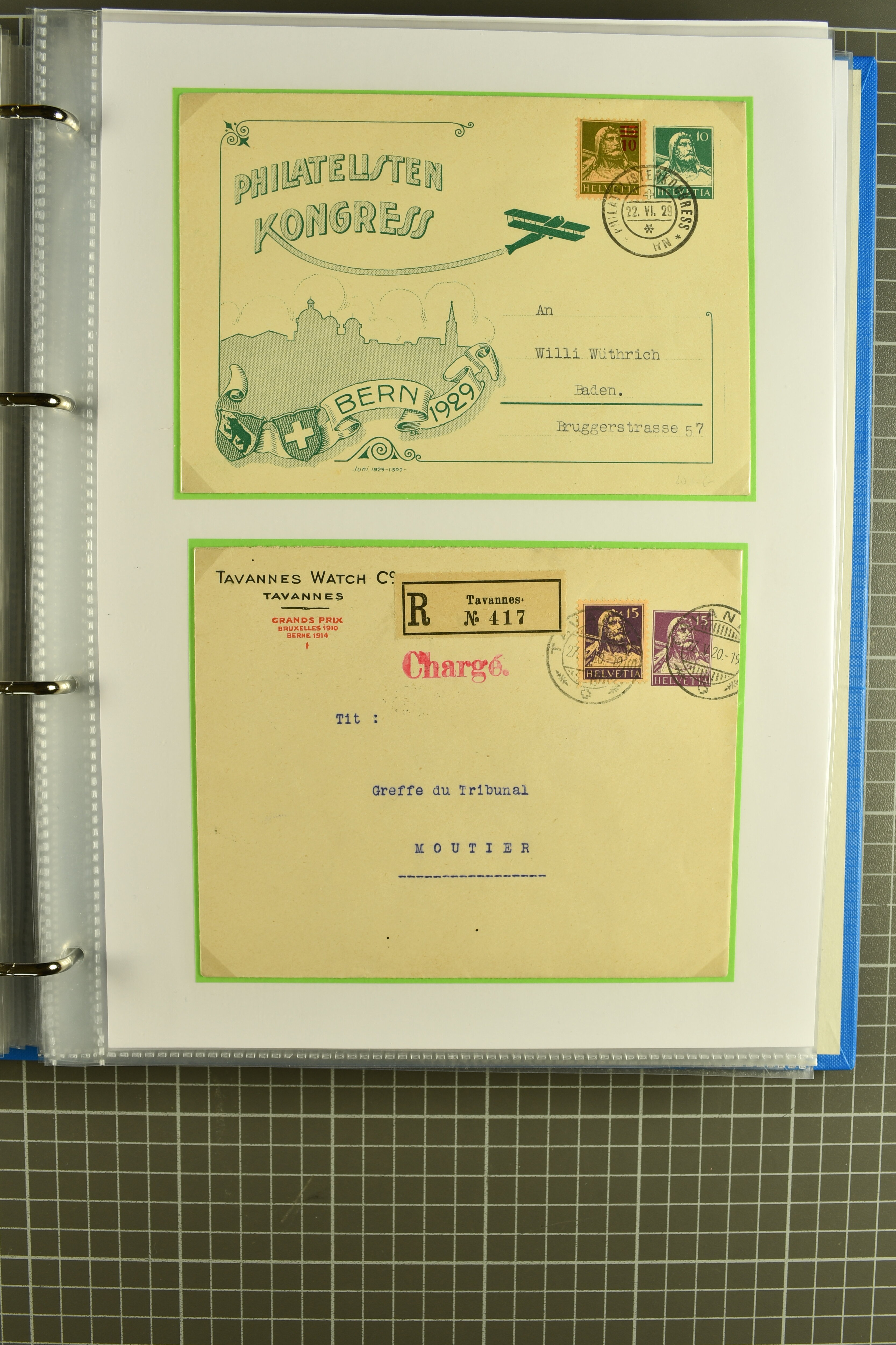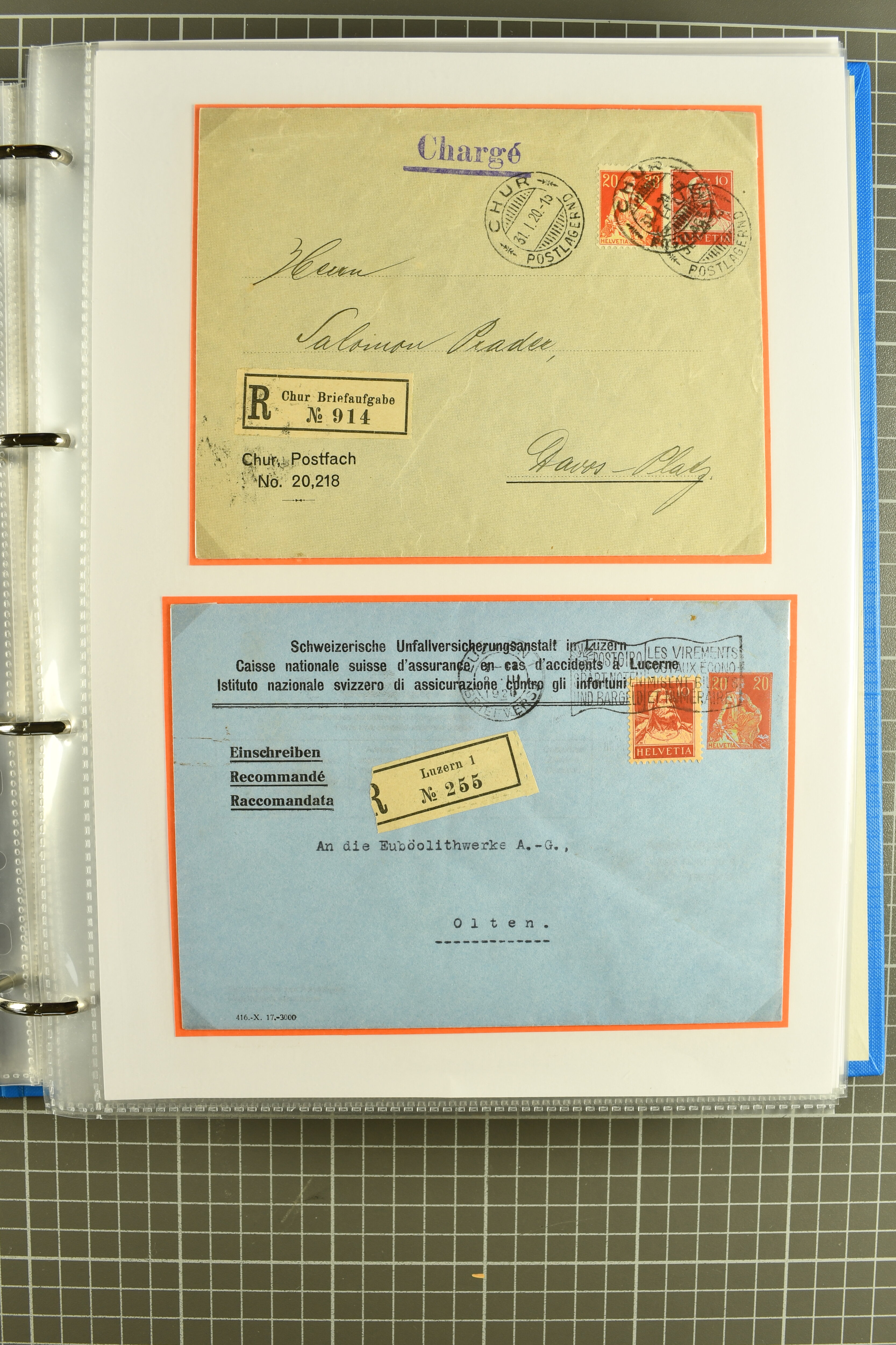 Vierfarben-Zusatzfrankatur 2 Rp. olivbraun, 3 Rp. grau, 5 Rp. lila und 15 Rp. gelb als portogerechte Einschreibefrankatur von Le Sentier (VD) nach Zeulenroda, Thüringen sowie ein ebensolcher Umschlag mit 2 Rp. hellolivbraun, 3 Rp. grau und 10 Rp.
