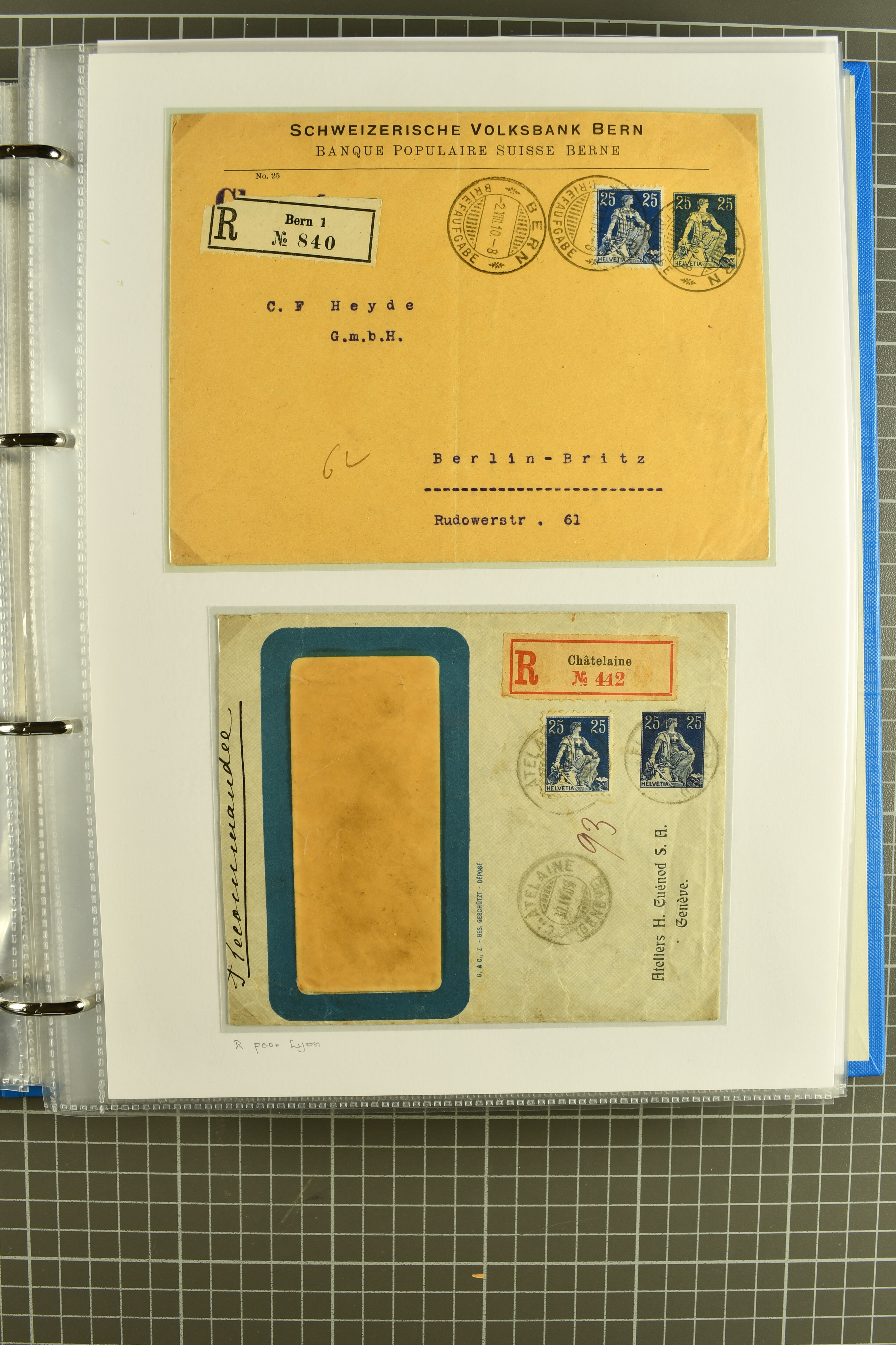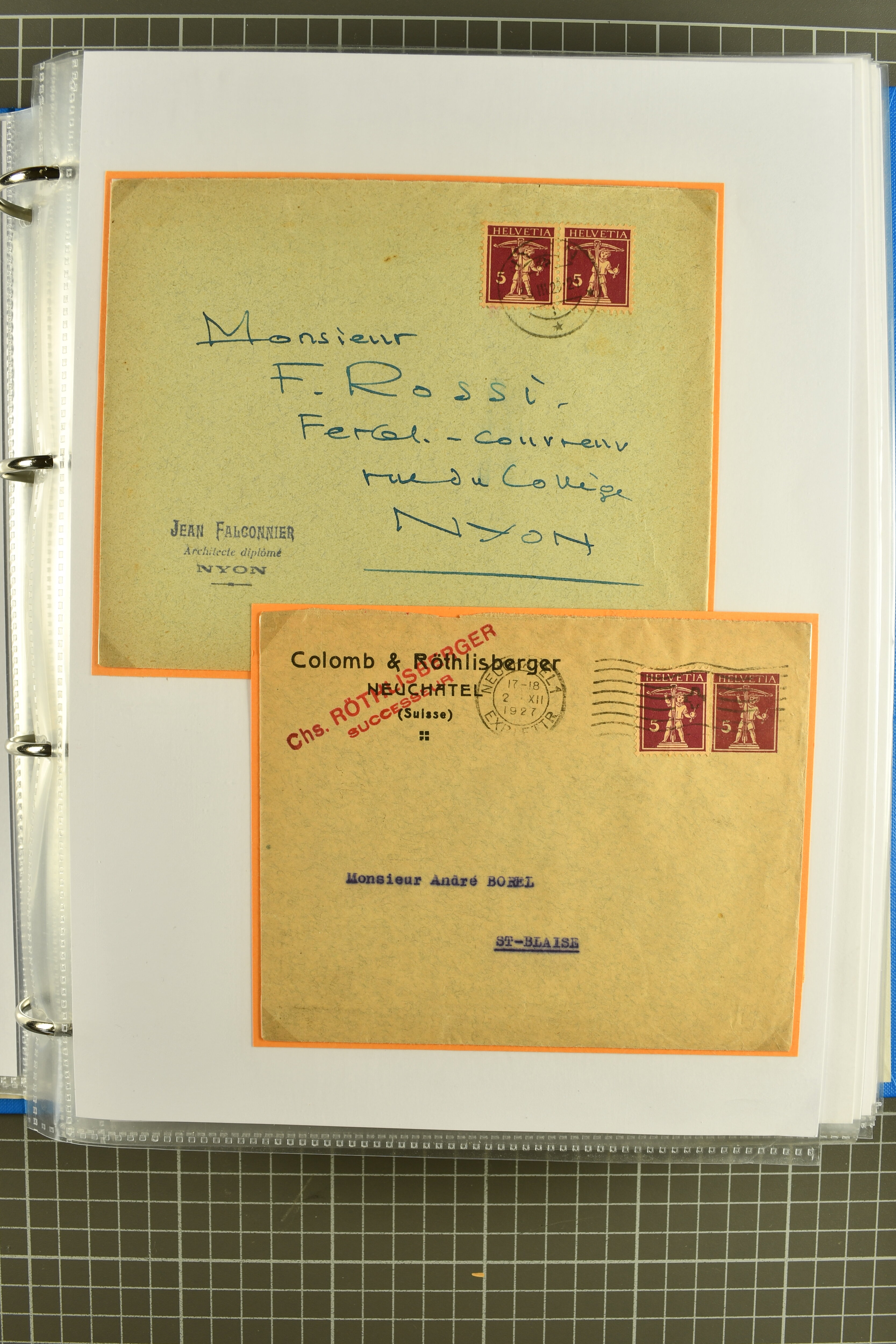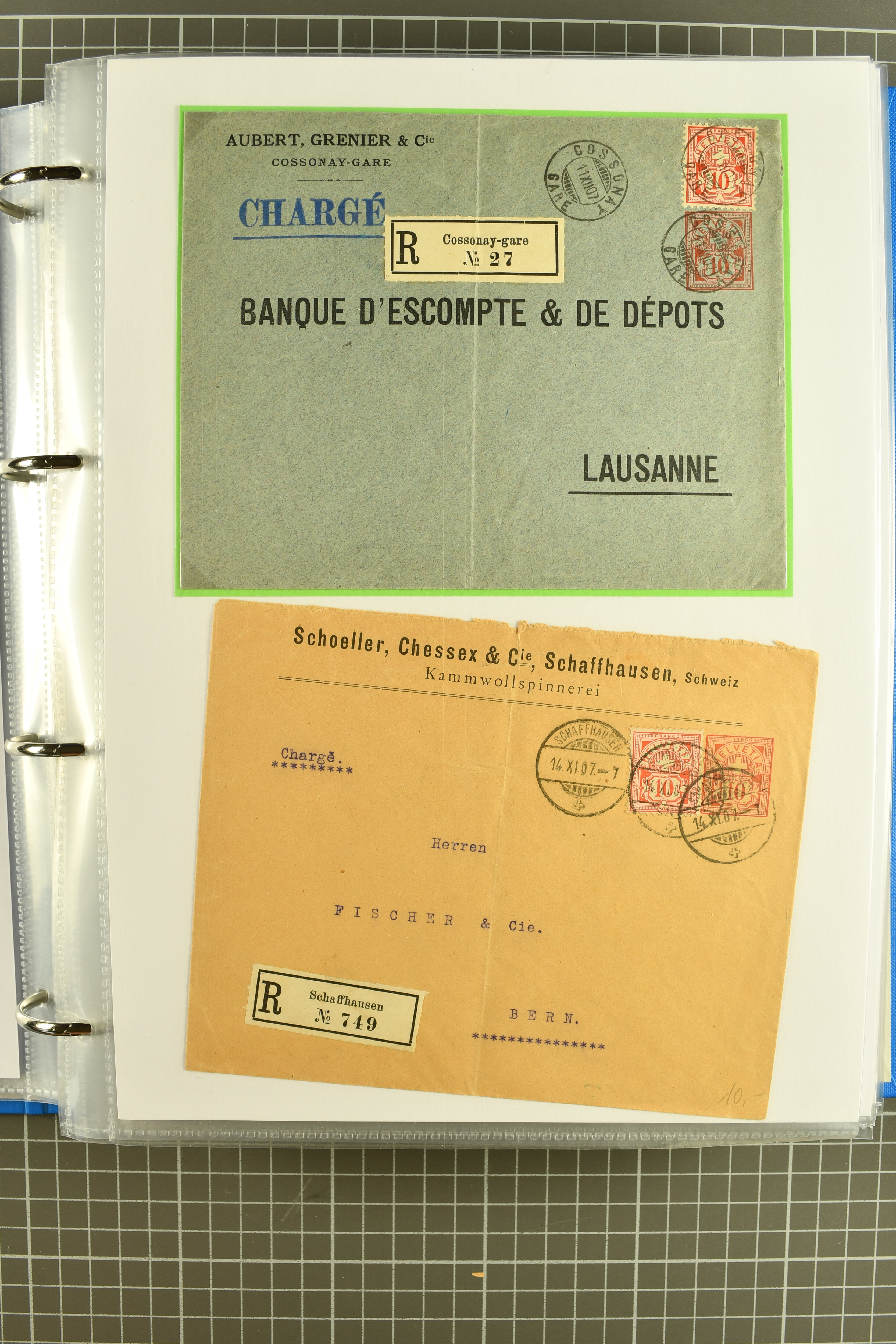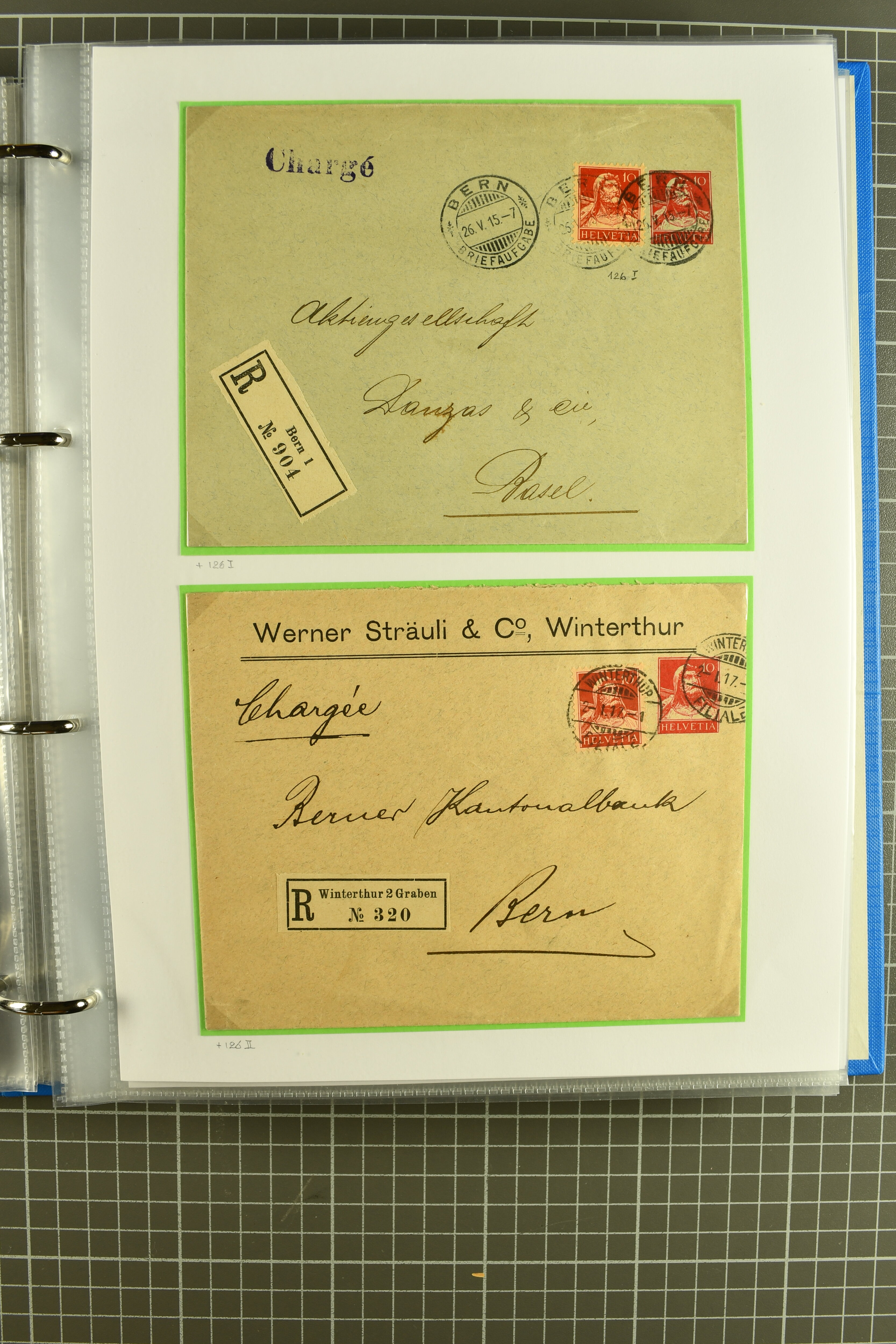 Vierfarben-Zusatzfrankatur 2 Rp. olivbraun, 3 Rp. grau, 5 Rp. lila und 15 Rp. gelb als portogerechte Einschreibefrankatur von Le Sentier (VD) nach Zeulenroda, Thüringen sowie ein ebensolcher Umschlag mit 2 Rp. hellolivbraun, 3 Rp. grau und 10 Rp.