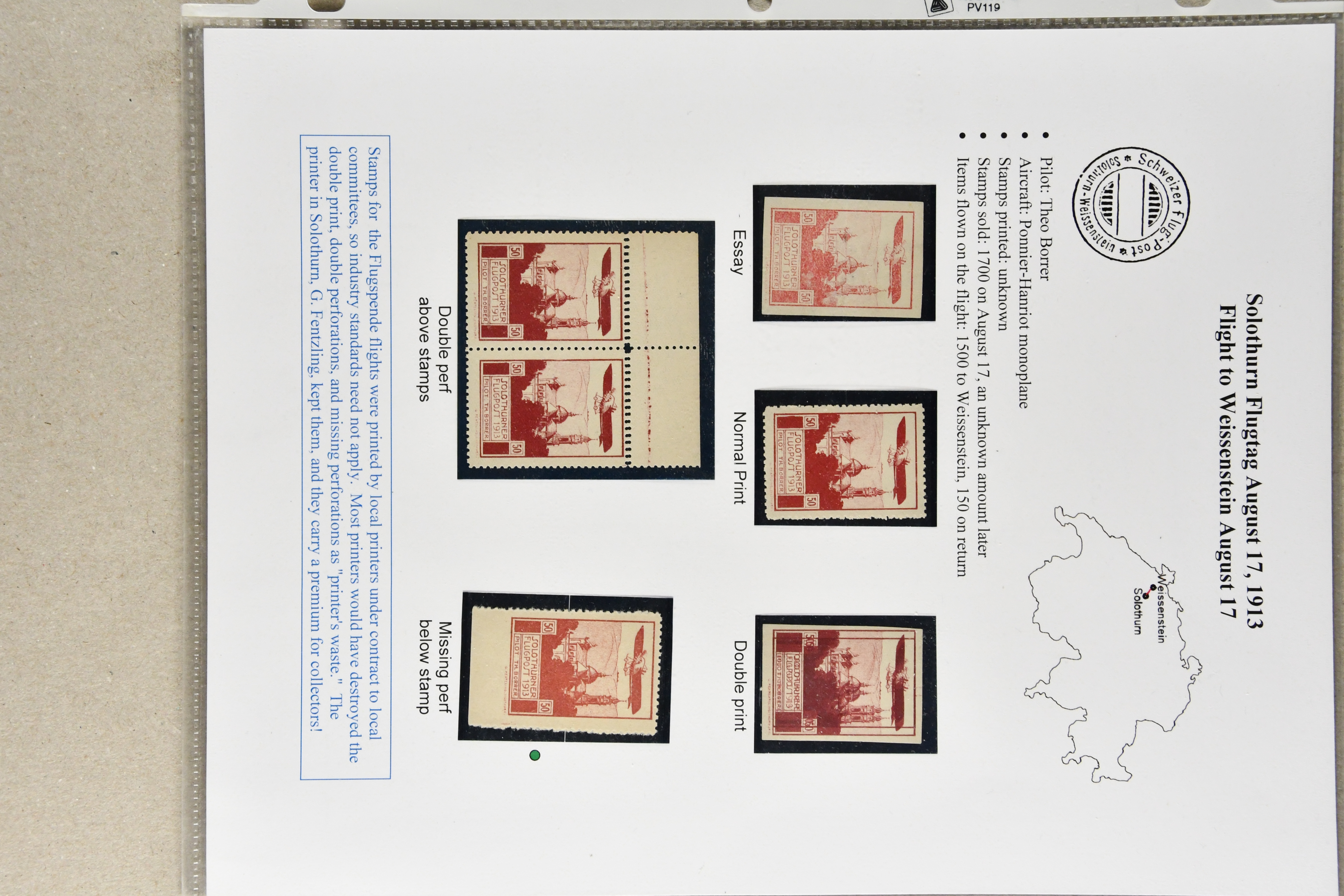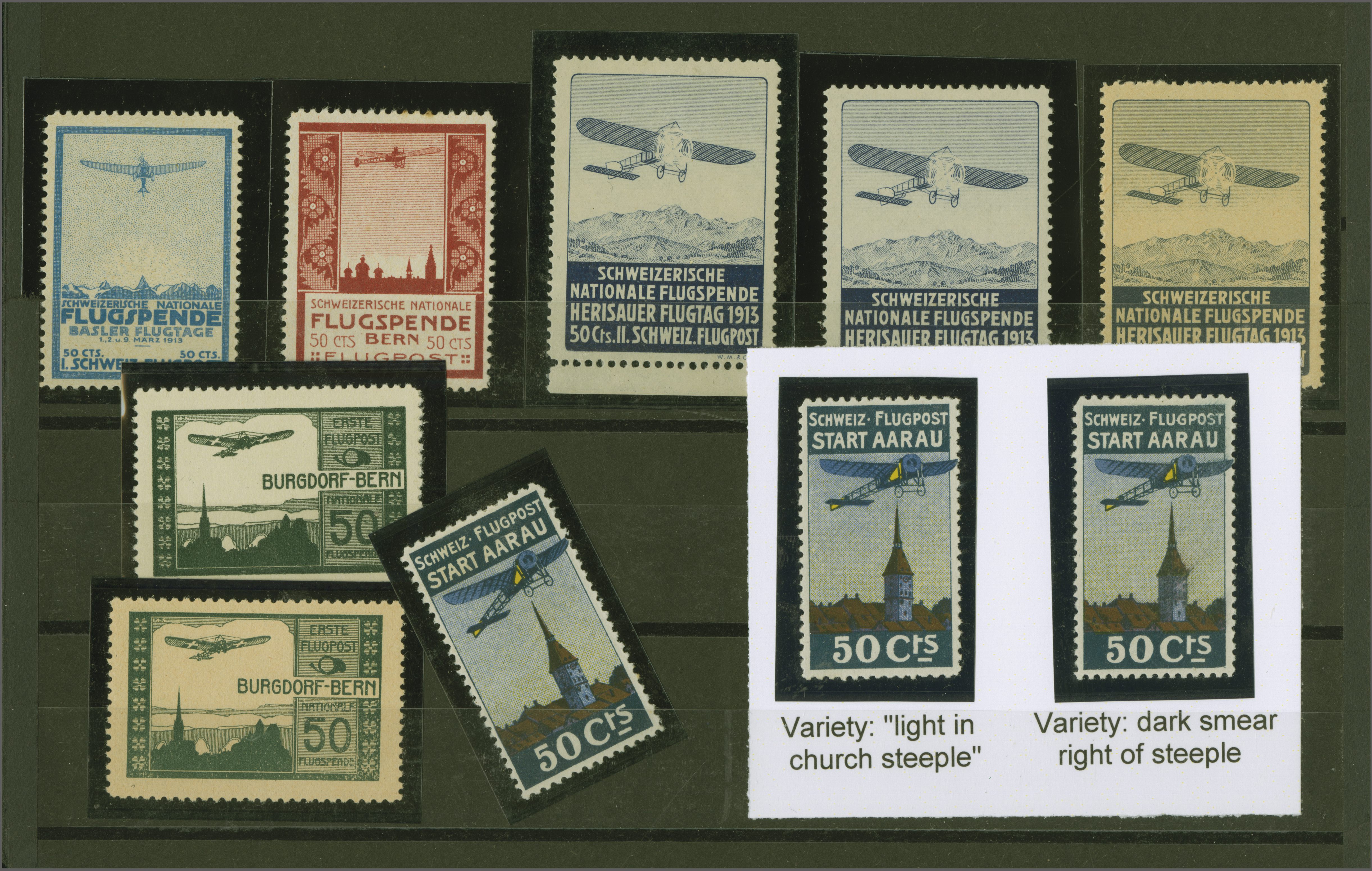 1913: Lot zehn Flugpost-Vorläufer ungest., dabei Aarau (3) mit zwei mit kl. Abarten, Basel, Bern (Zähnung oben minim getönt), Burgdorf (2) jeweils auf weissem, bezw.auf hellchamois Papier, sowie Herisau (3), davon