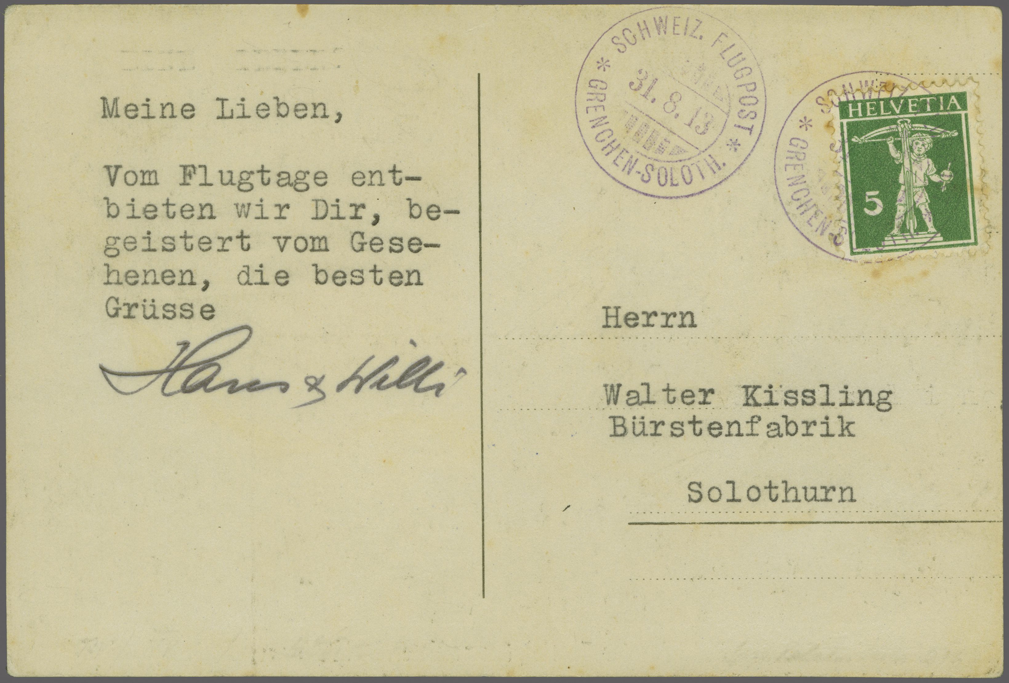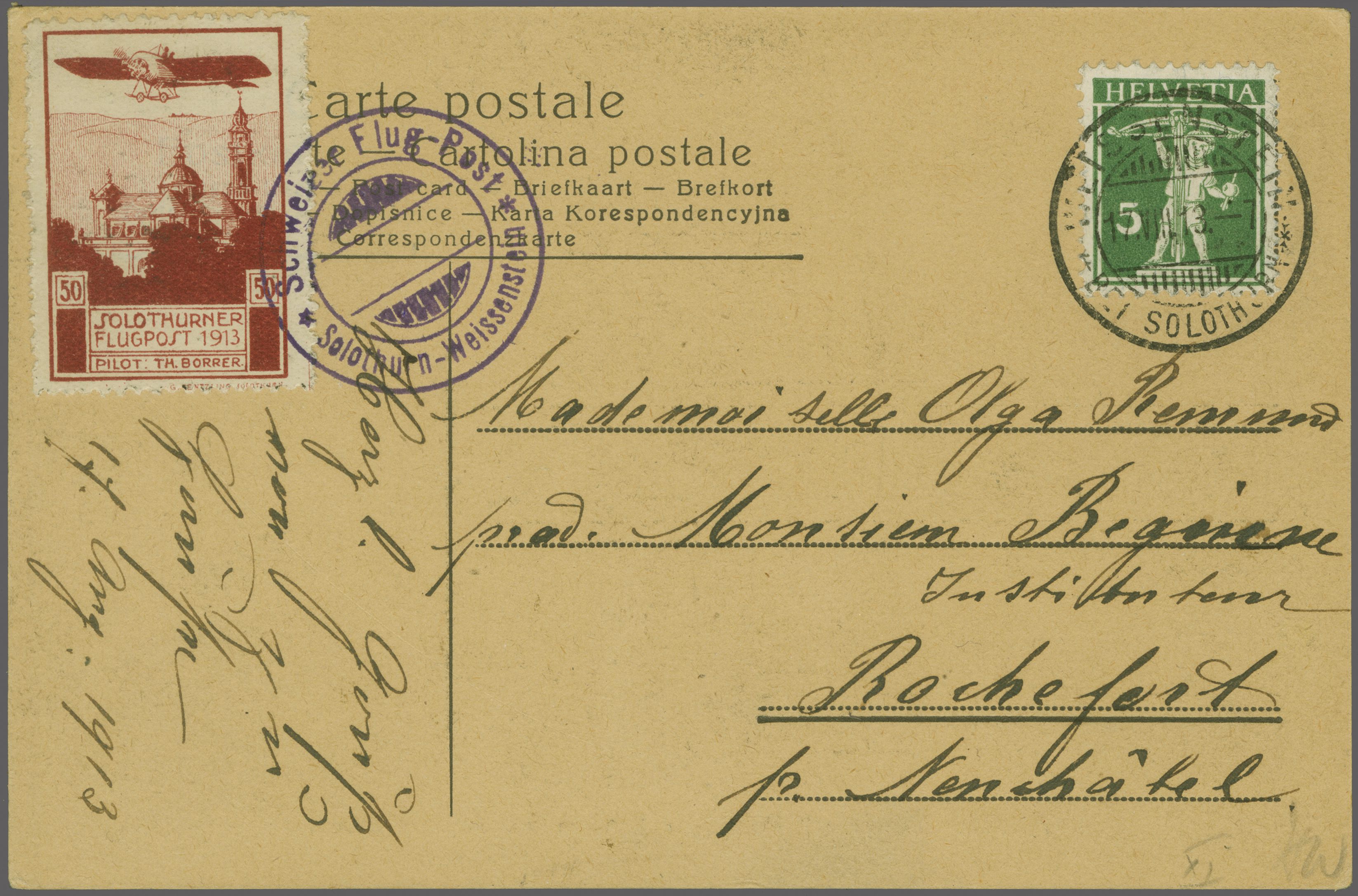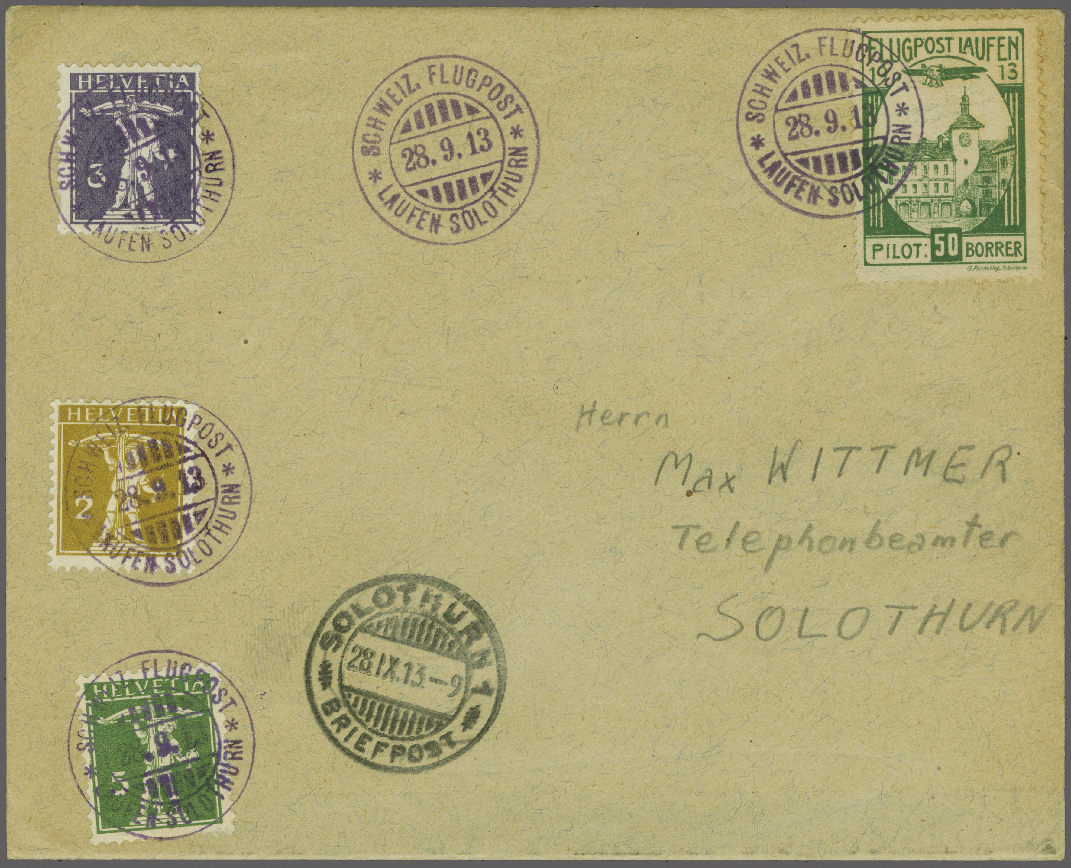 FLUGPOST LAUFEN-SOLOTHURN 28.9.13" und AnkStp. "SOLOTHURN 1 BRIEFPOST 28.IX.13-9" SLH = CHF 3'200 (Image 1)