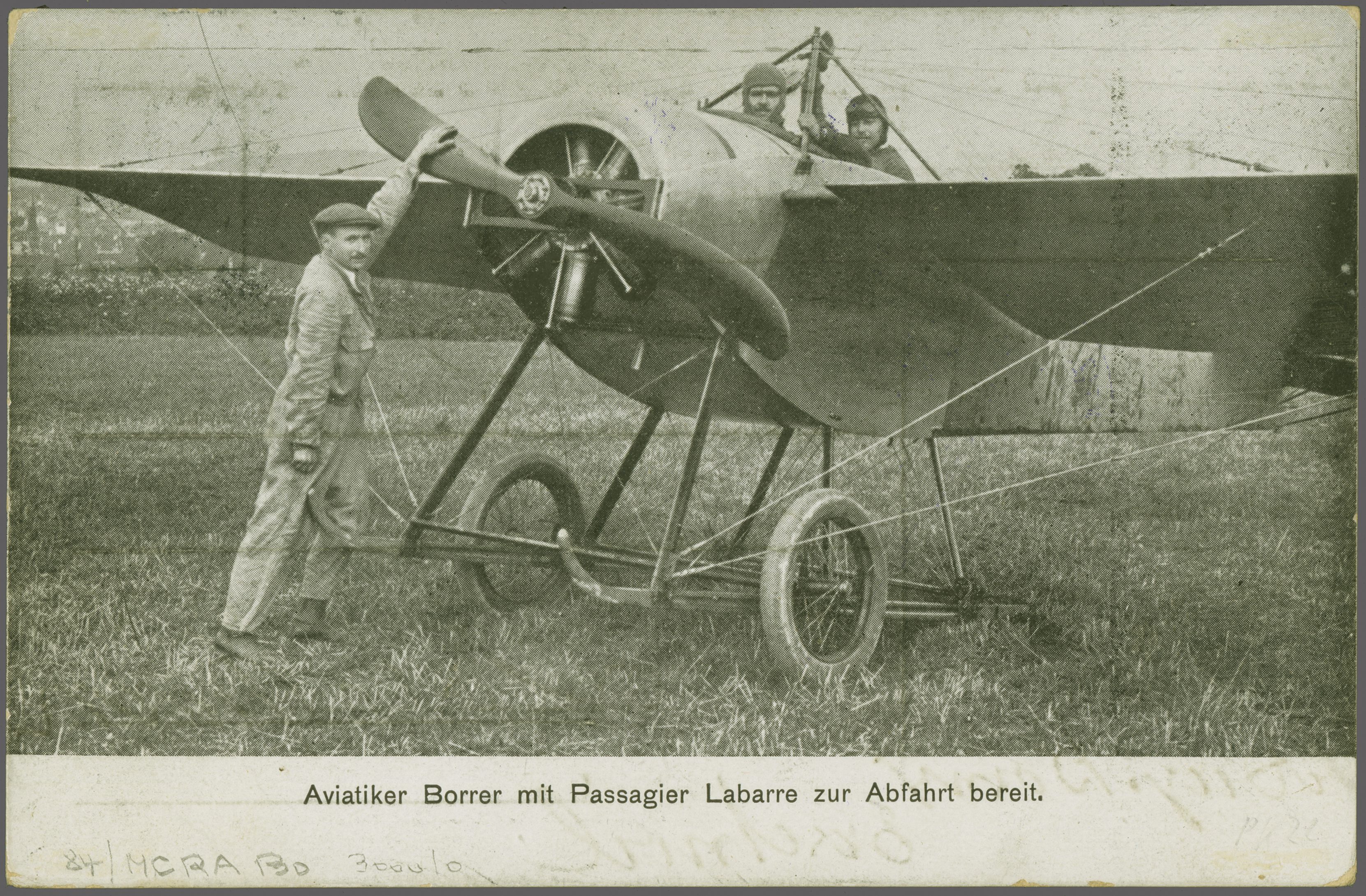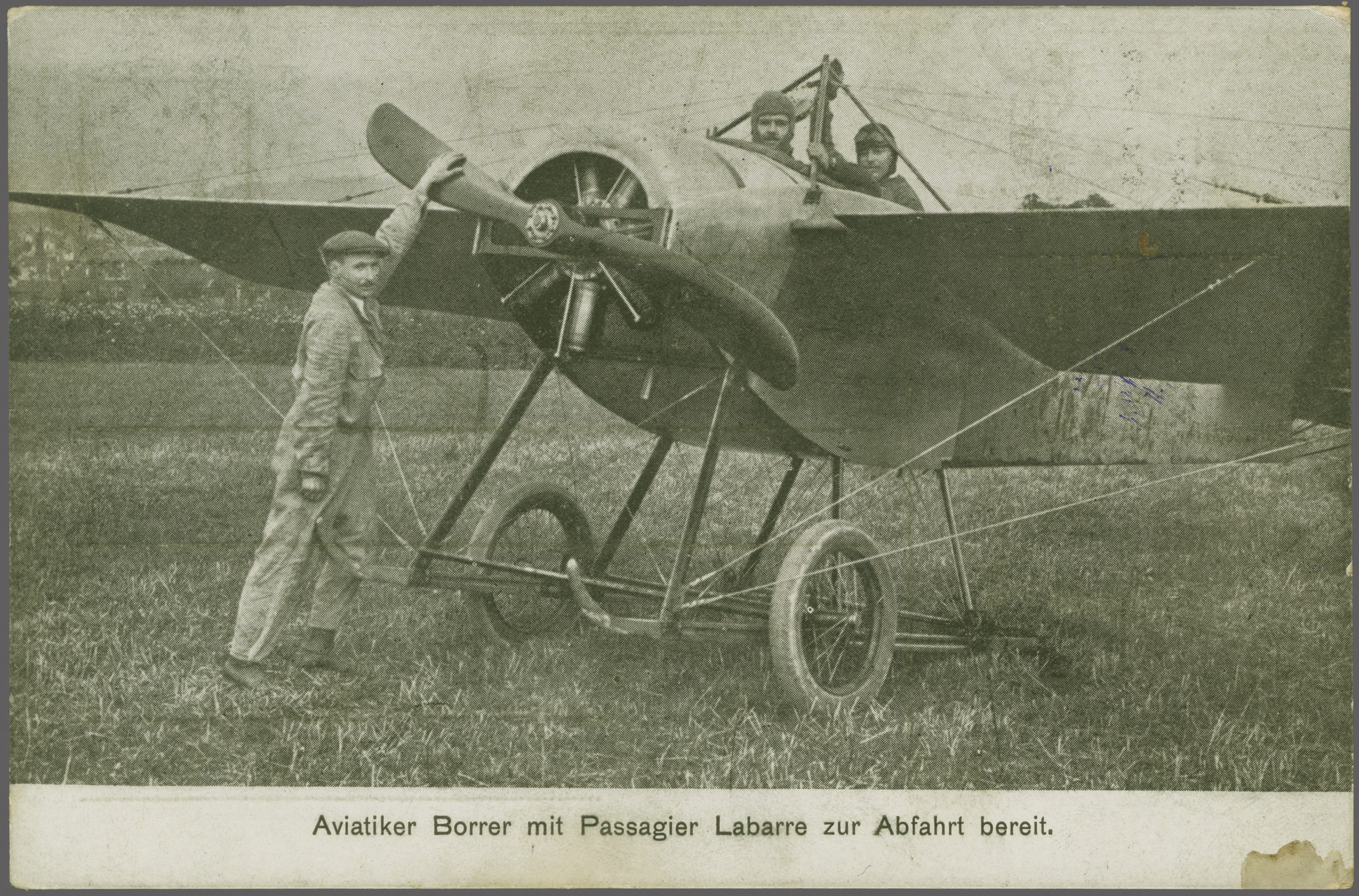 BRIEFPOST 28.IX.13-9" auf OK 1 "Aviatiker Borrer mit Passagier Labarre zur Abfahrt bereit.". Flugpostmarke sauber gezähnt und gut zentriert auf Karte mit Signatur von Borrer. Attest Bohler (1990) SLH = CHF 2'600 (Image 1)