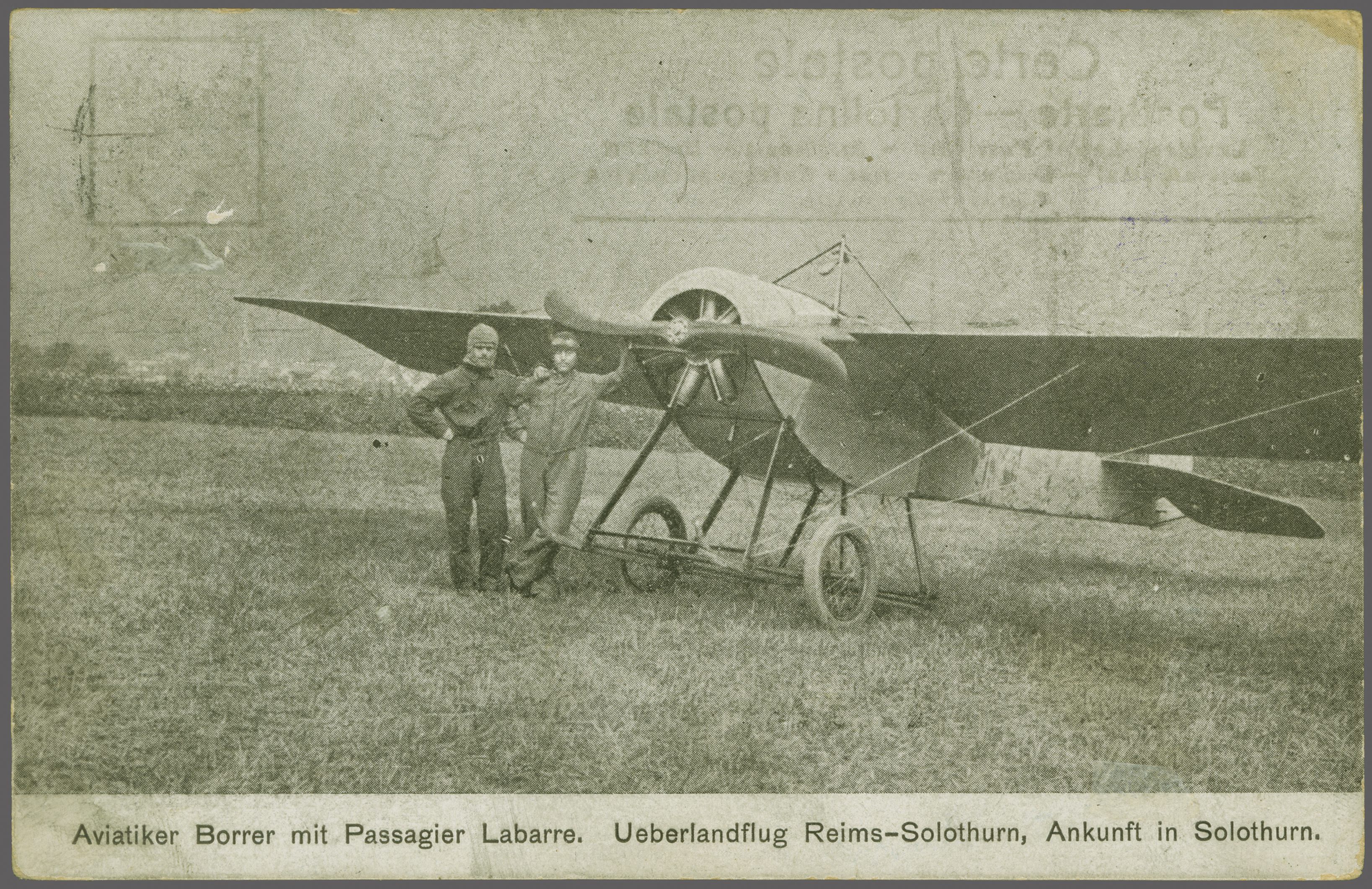 Flugtag Solothurn 1913 (17. Aug.): Fotokarte 'Aviatiker Borrer mit Passagier Labarre. Ueberlandflug Reims-Solothurn. Ankunft Solothurn.' mit Spendevignette 50 Cts. braunrot, sauber entw. mit SStp. "Solothurn-Weissenstein",