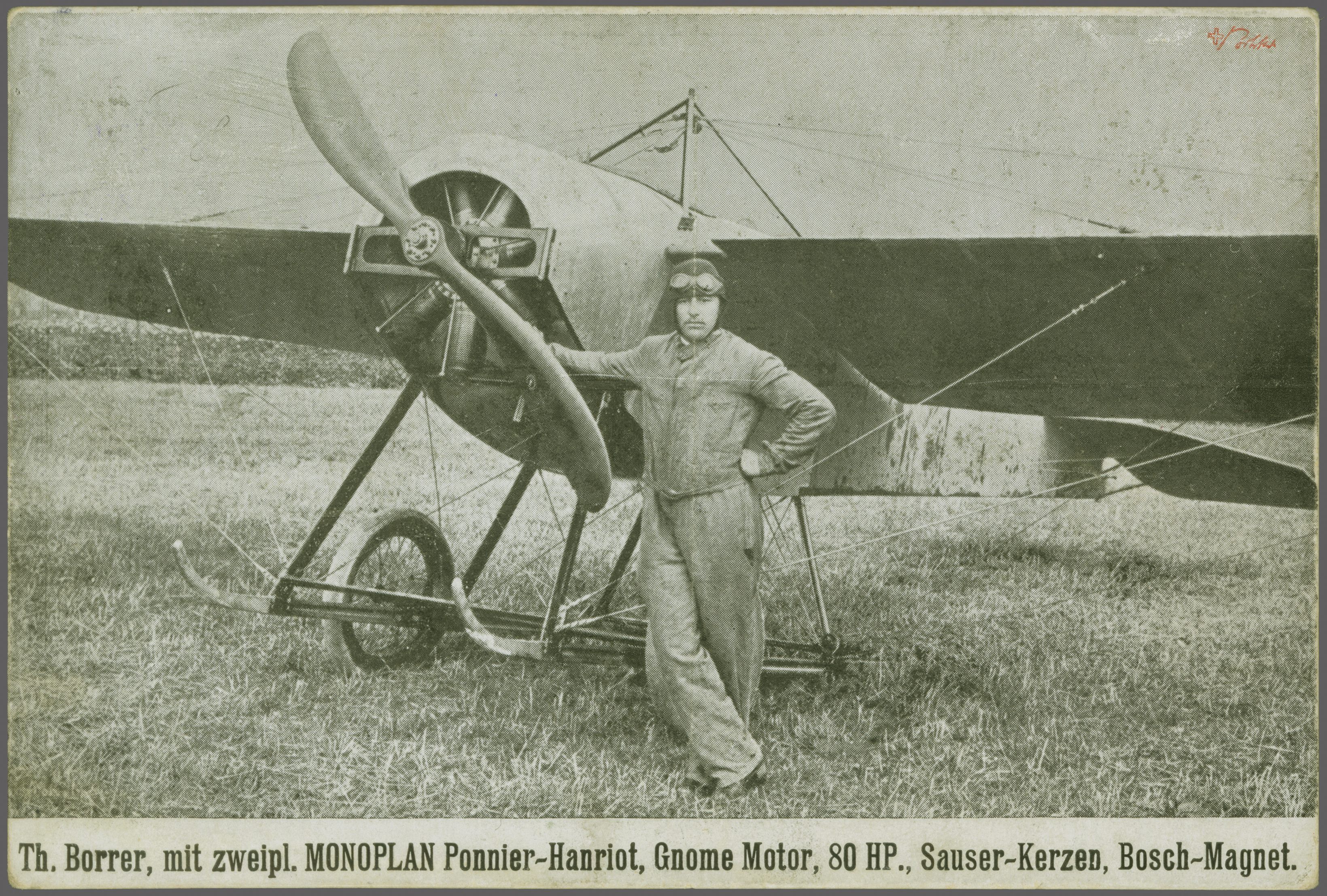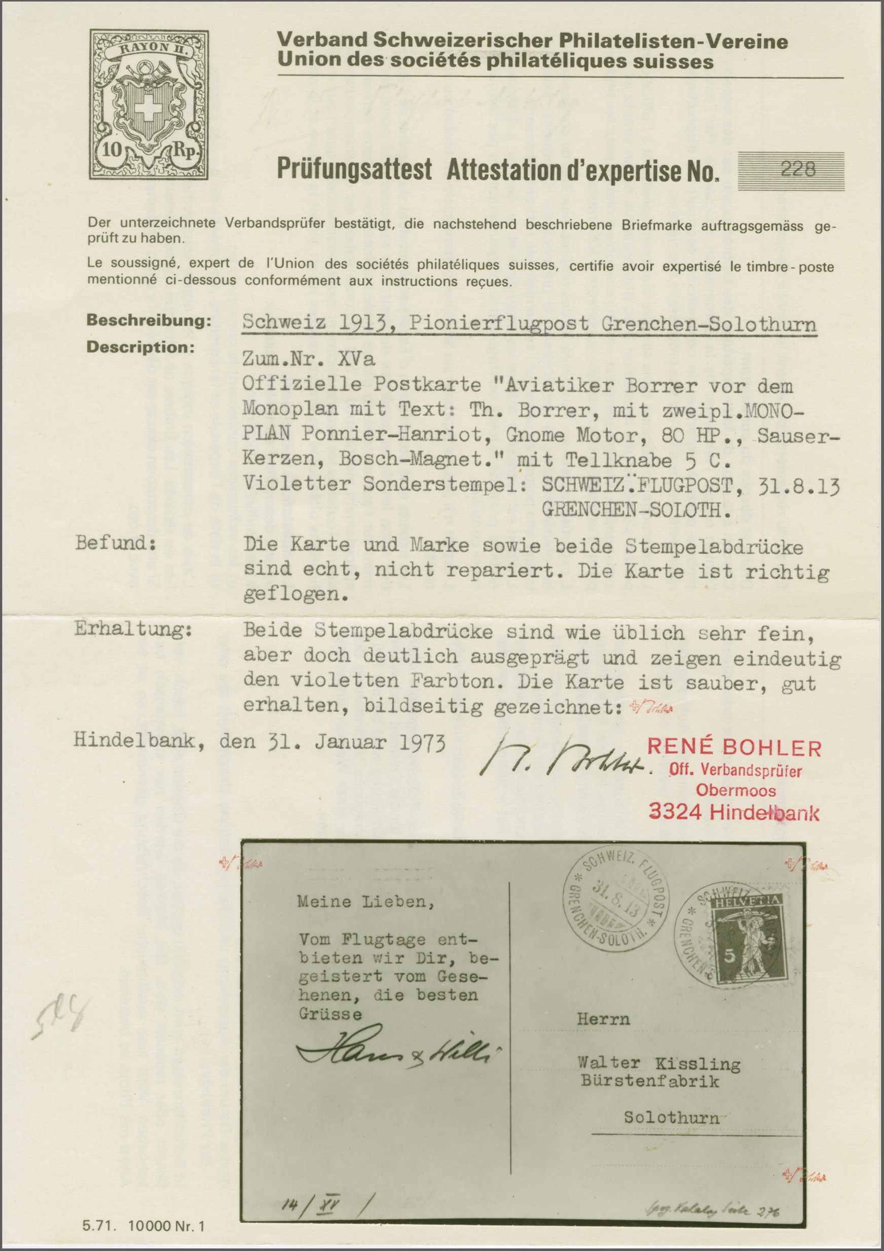 Flugtag Grenchen 1913 (31. Aug.): Offizielle Karte von Flugtag Solothurn 'Th. Borrer, mit zweipl. MONOPLAN Ponnier-Hanriot' frankiert mit Tellknabe 5 Rp, sauber gest. "SCHWEIZ. FLUGPOST GRENCHEN-SOLOTH. 31.8.13" in Violett.