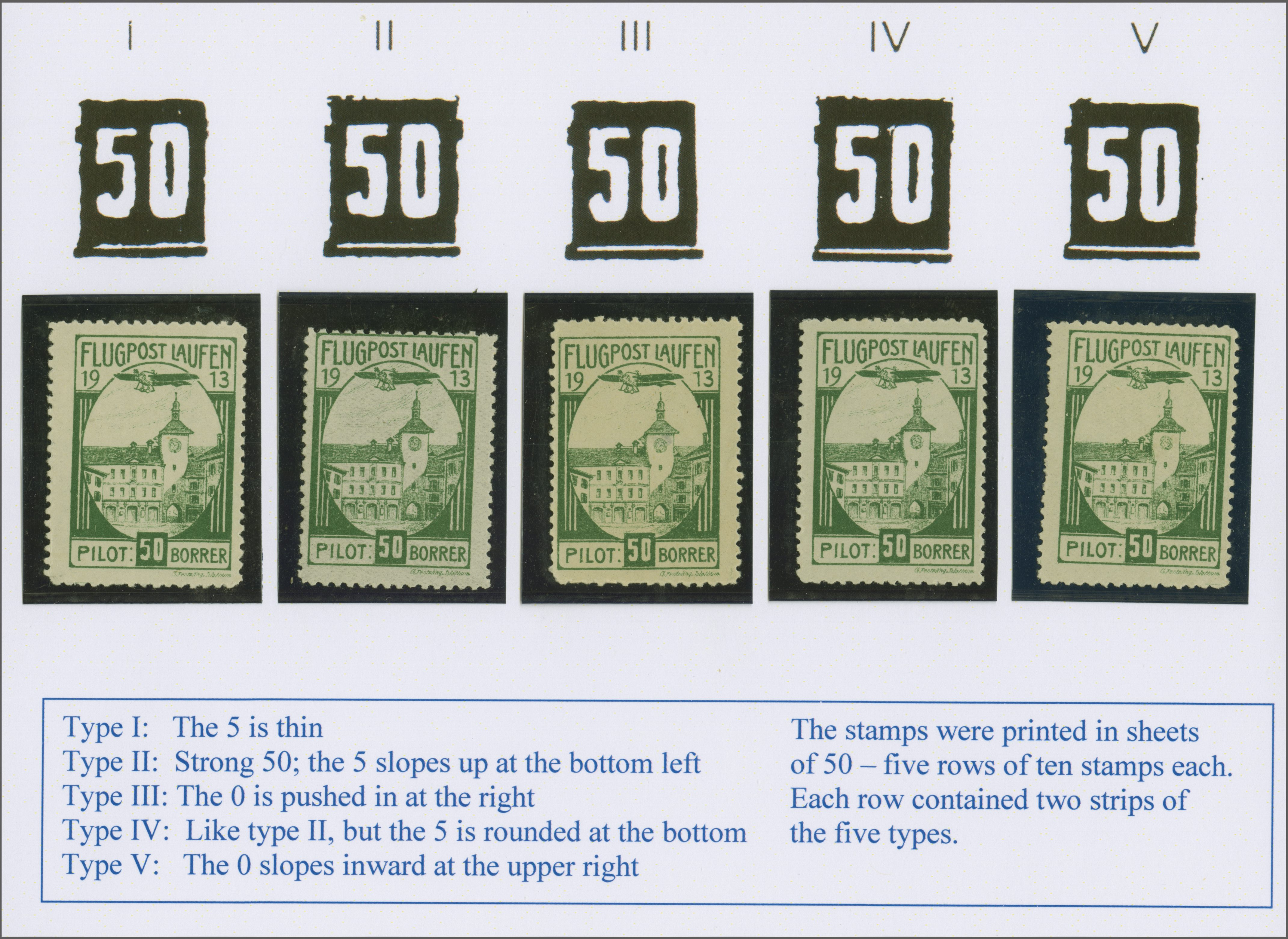 Flugtag Laufen 1913 (28. Sept.): Flugpostmarke 50 Rp. dunkelgrün der Typen I/II und VI/V auf weissem Papier ungebr. mit guter. leicht unregelmässiger Zähnung, sowie Type III dunkelgrün auf Chamois-Papier (kl. dünne Stelle,