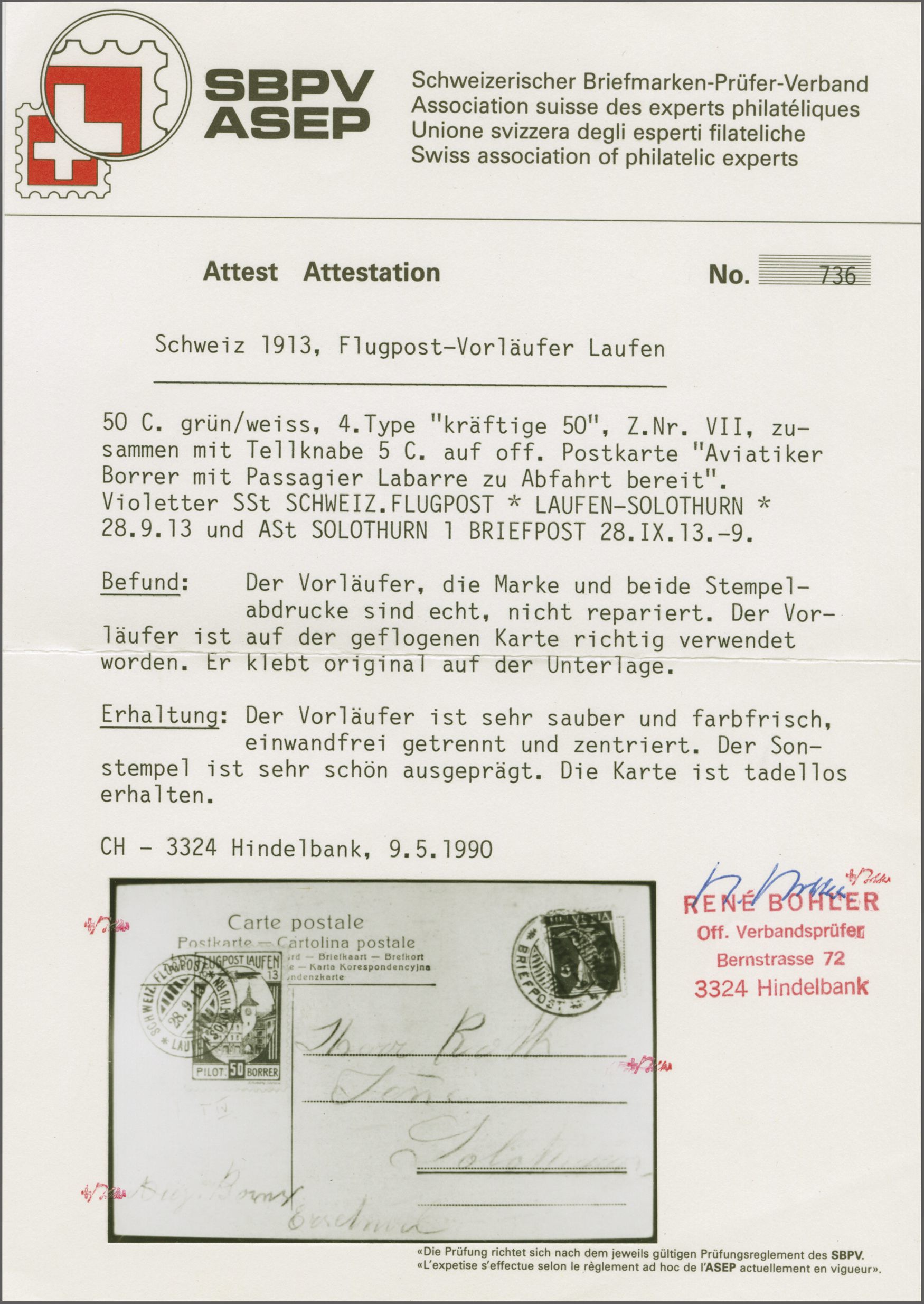 Flugtag Laufen 1913 (28. Sept.): Flugpostmarke 50 Rp. dunkelgrün der Type IV 'kräftige 50' übergehend gest. "SCHWEIZ. FLUGPOST LAUFEN-SOLOTHURN 28.9.13" auf OK frankiert mit Tellknabe 50 Rp. bei Ankunft gest. "SOLOTHURN 1