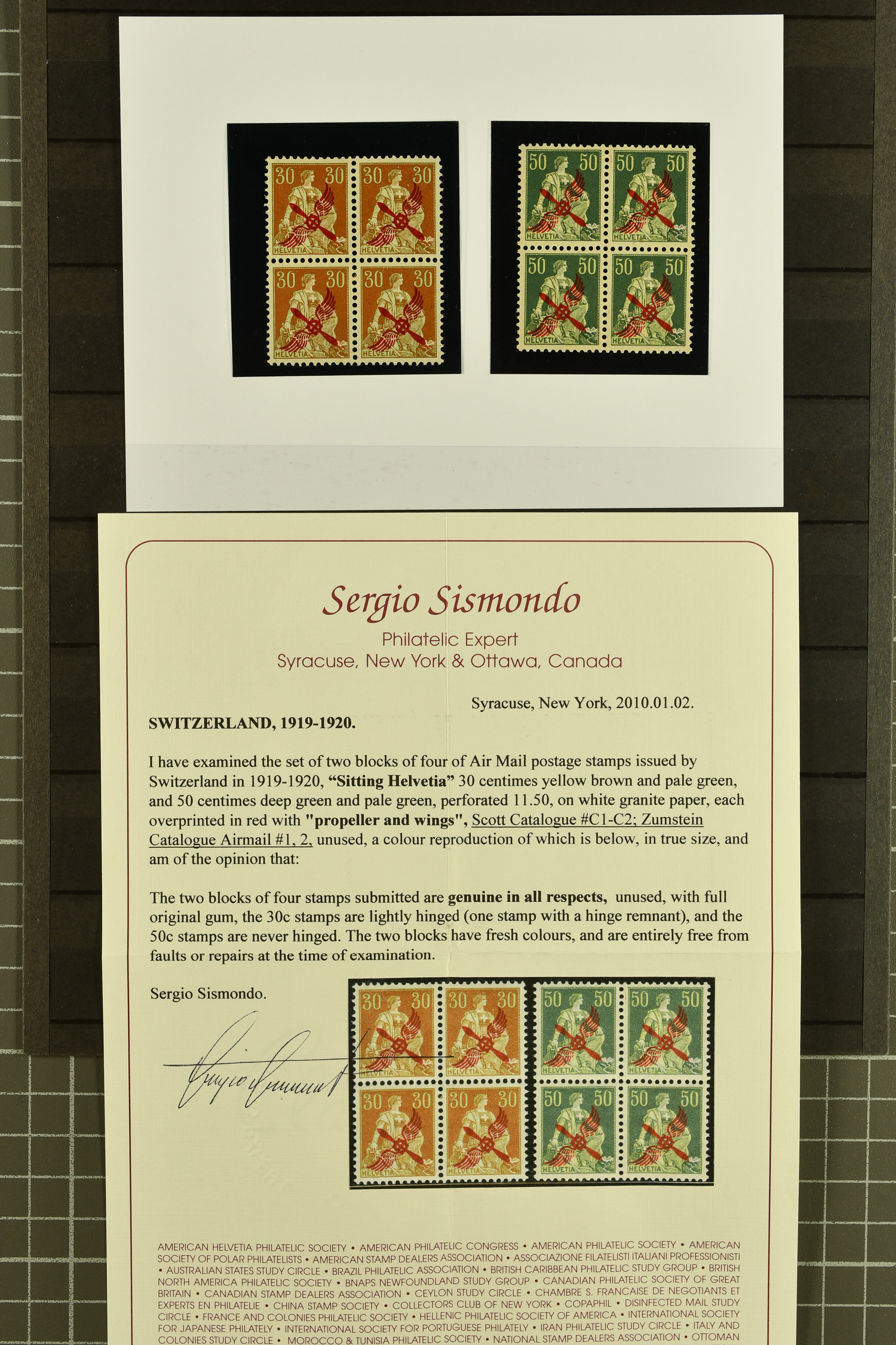 1919/38: 'Propeller' Aufdruck in rot, je auf 30 Rp. hellbraun, bezw. 50 Rp. Grün, beide im ungebr. Viererblock, gut und regelmässig gez., 30 Rp. mit Erstfalz, 50 Rp. postfr.,beide mit Attest Sismondo, dazu die