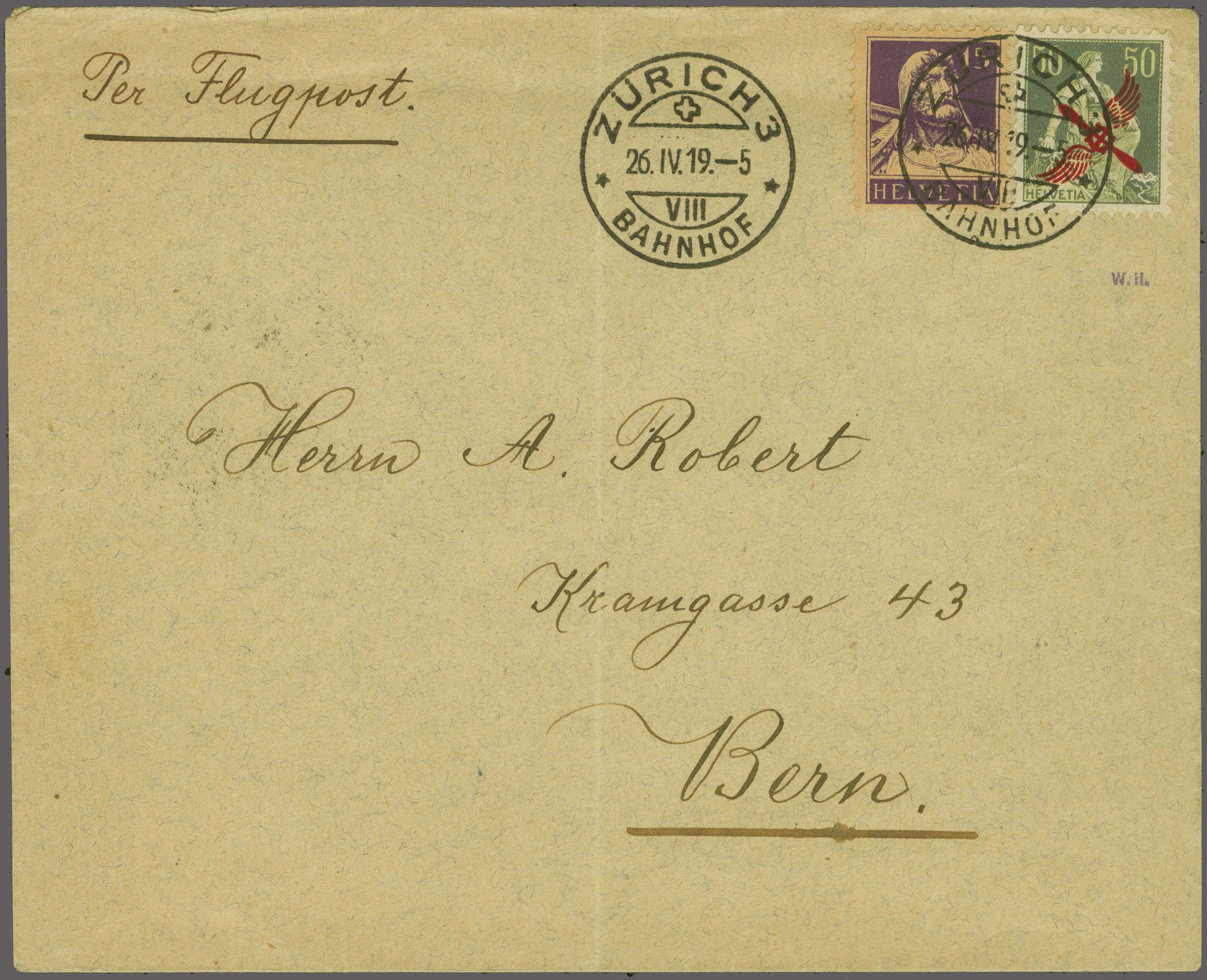 1919 (30. April): Brief vom Erstflug Dübendorf - Bern, frankiert mit Flugpostmarke 50 Rp. plus 15 Rp. Tellbrustschild, sauber gest. "Zürich 3 Bahnhof 26.IV.19-5" mit rücks. Bestätigungsstp. "Schweizer Flugpost 30.IV.19-1".