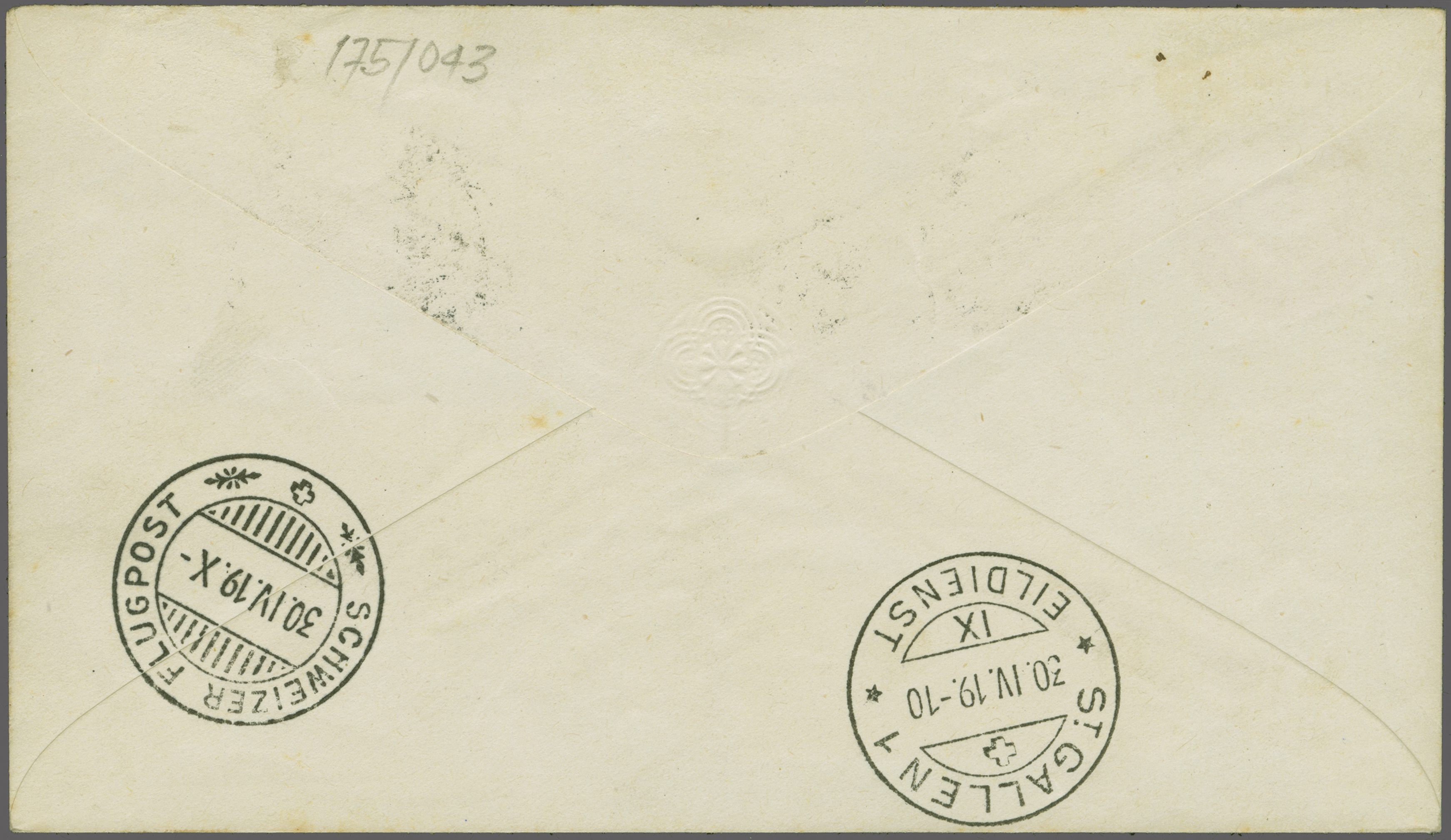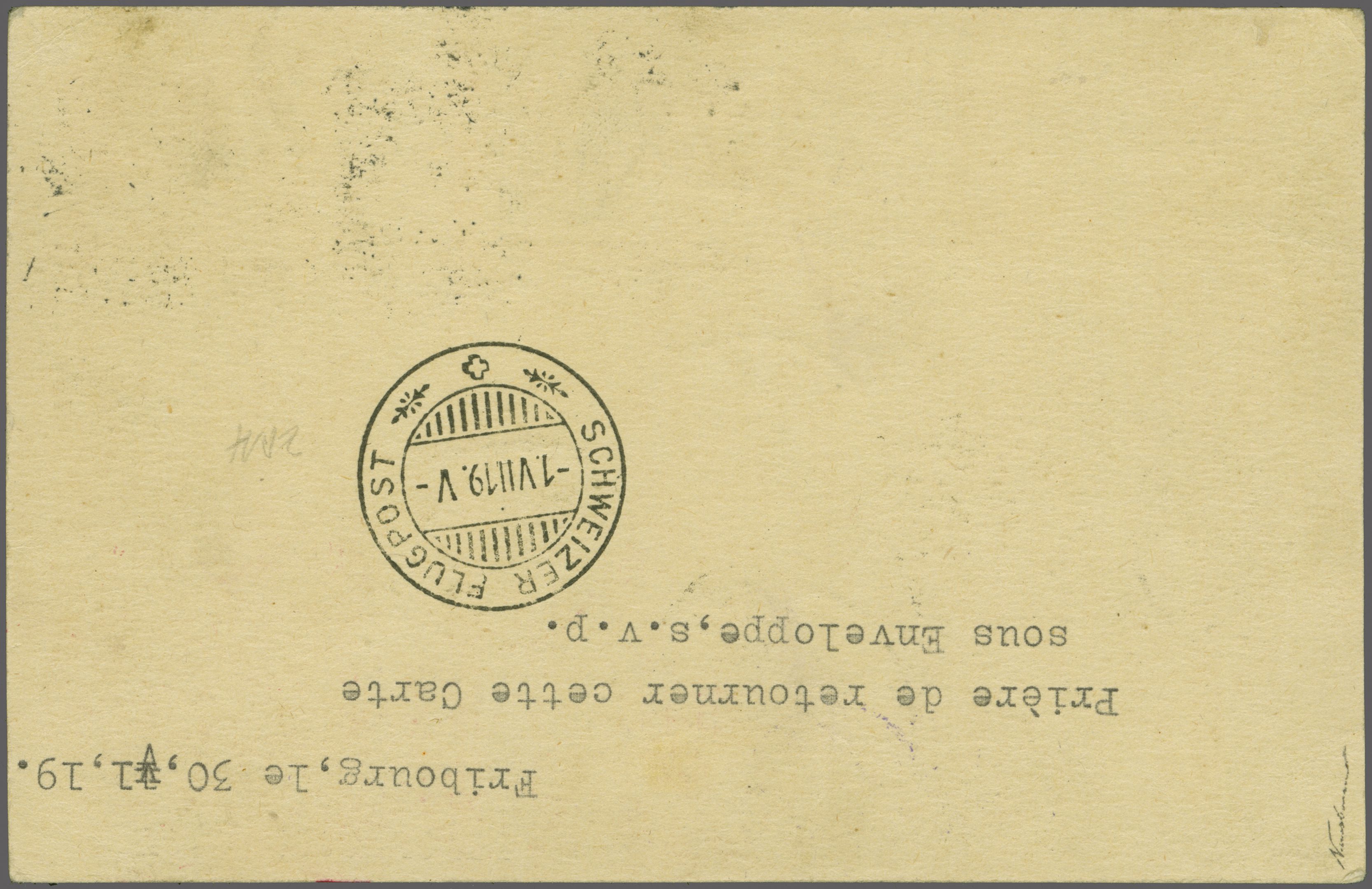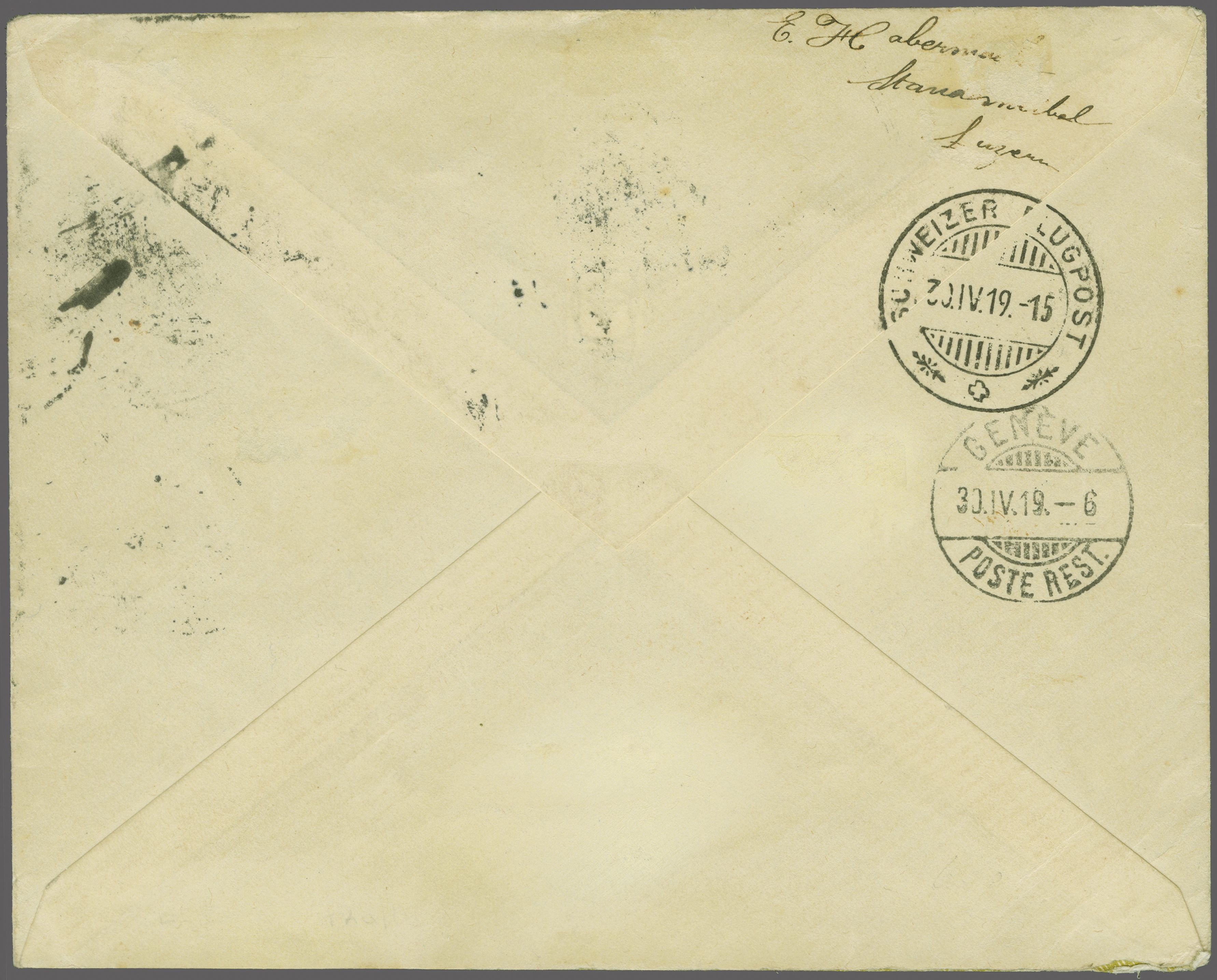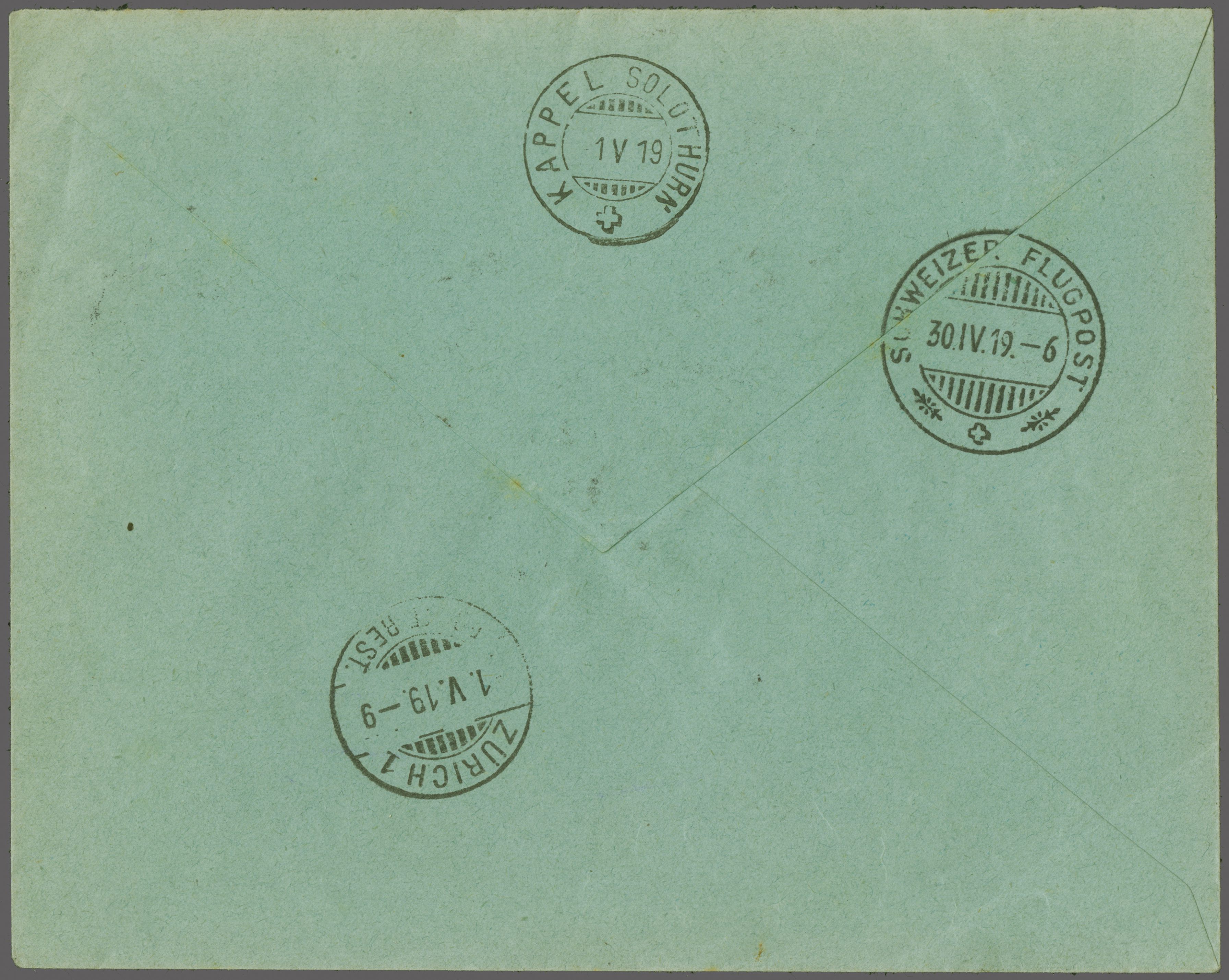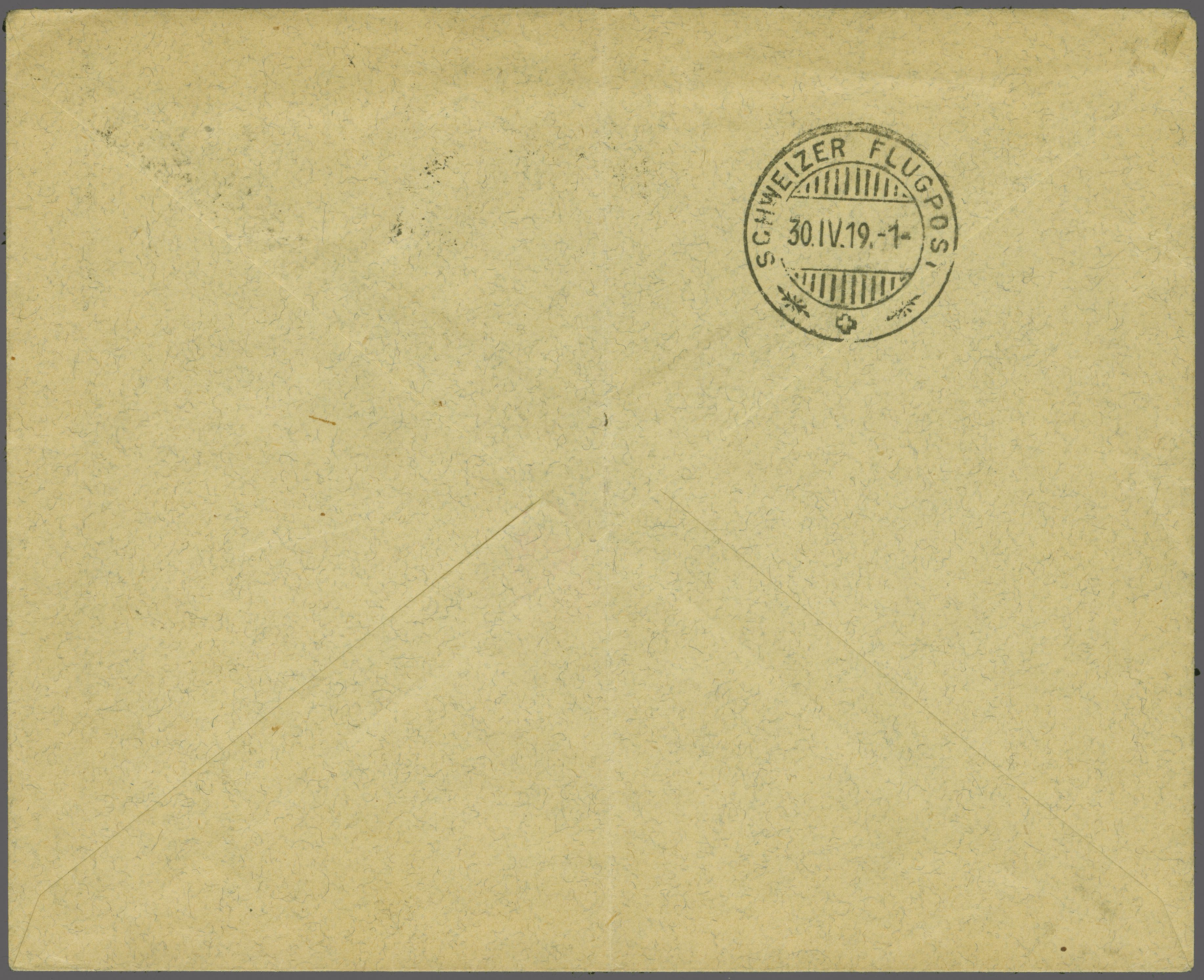 Kartenschluss bis St. Gallen nach Zürich geflogen und per Bahn weiterbefördert mit rücks. AStp. "St.Gallen 1 Eildienst 30.IV.19-10" und dem Zürcher Flugpoststp. "Schweizer Flugpost 30.IV.19.X". SLH = CHF 1'200 (Image 1)