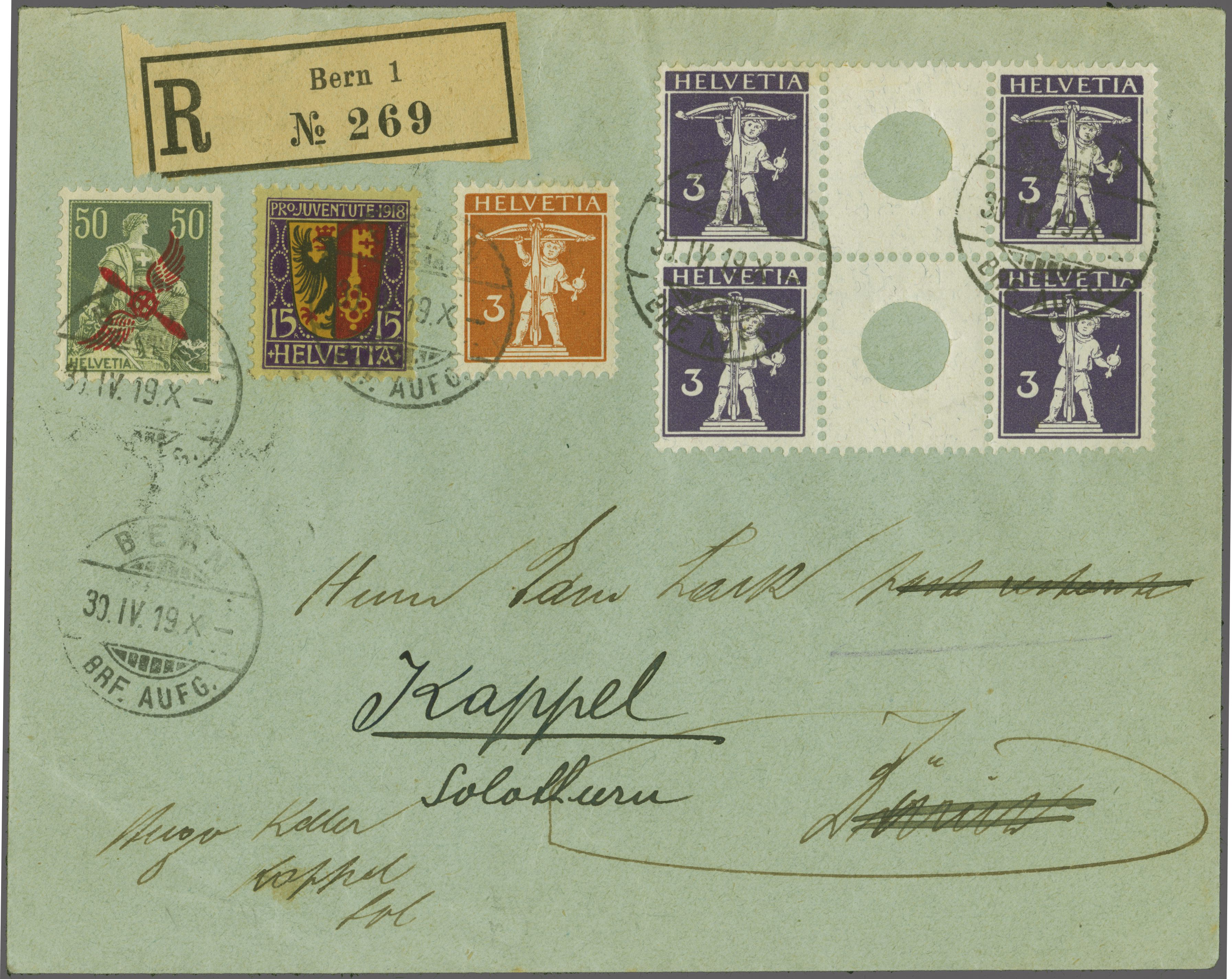Lochung als portogerechte 30 Rp. Frankatur von Bern nach Zürich, rücks. gest. "Schweizer Flugpost 30.IV.19-6" und weitergeleitet am darauf folgenden Tag, den 1. Mai nach "Kappel Solothurn". SLH = CHF 750 (Image 1)