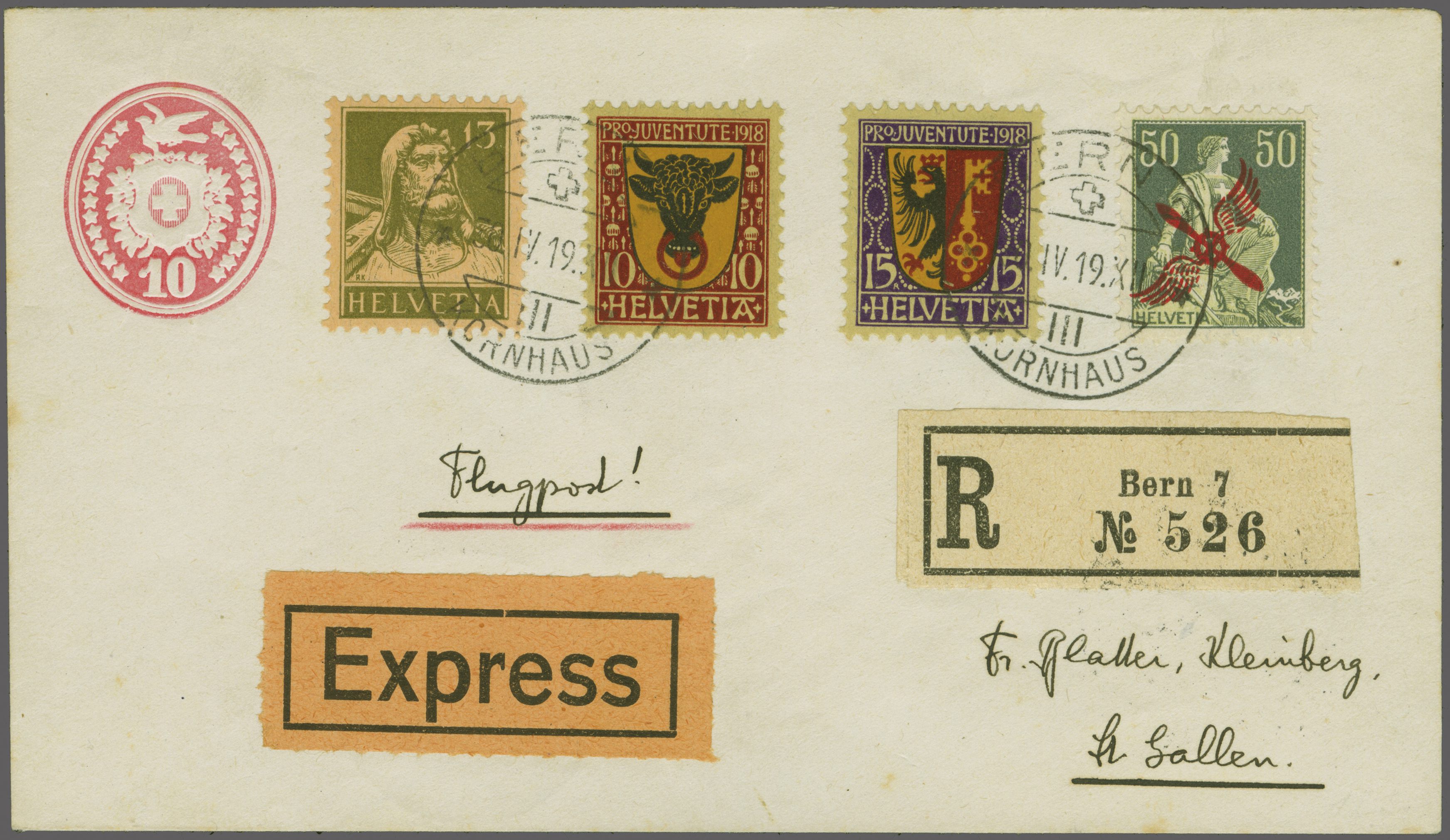 1919 (30. April): Erstflug Bern-Zürich, 10 Rp. GS-Umschlag frankiert mit 'Propeller' 50 Rp. grün, Tell 13 Rp. plus Pro Juventute Zusatzfrankatur, sauber gest. "Bern Kornhaus 30.IV.19 XII" auf eingeschr. 'Blatter'-Brief mit