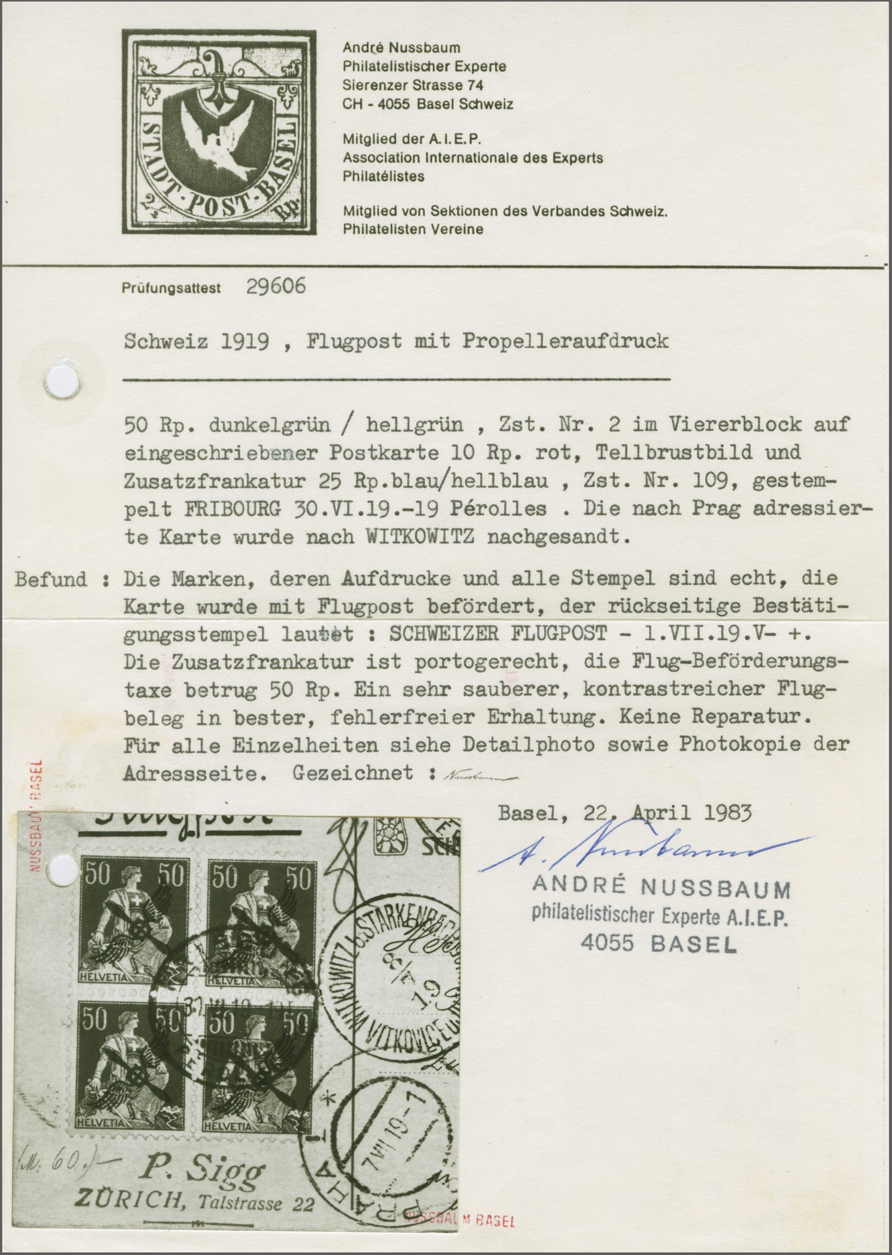 Tarif von 35 Rp. für eine eingeschr. Auslandskarte plus 50 Rp. Flugpost-Zuschlag völlig ausreichte. Attest Nusssbaum (1983) SBK = CHF 1'800 für Viererblock, SLH = CHF 1'100 Flug plus Viererblock-Frankatur (Image 1)