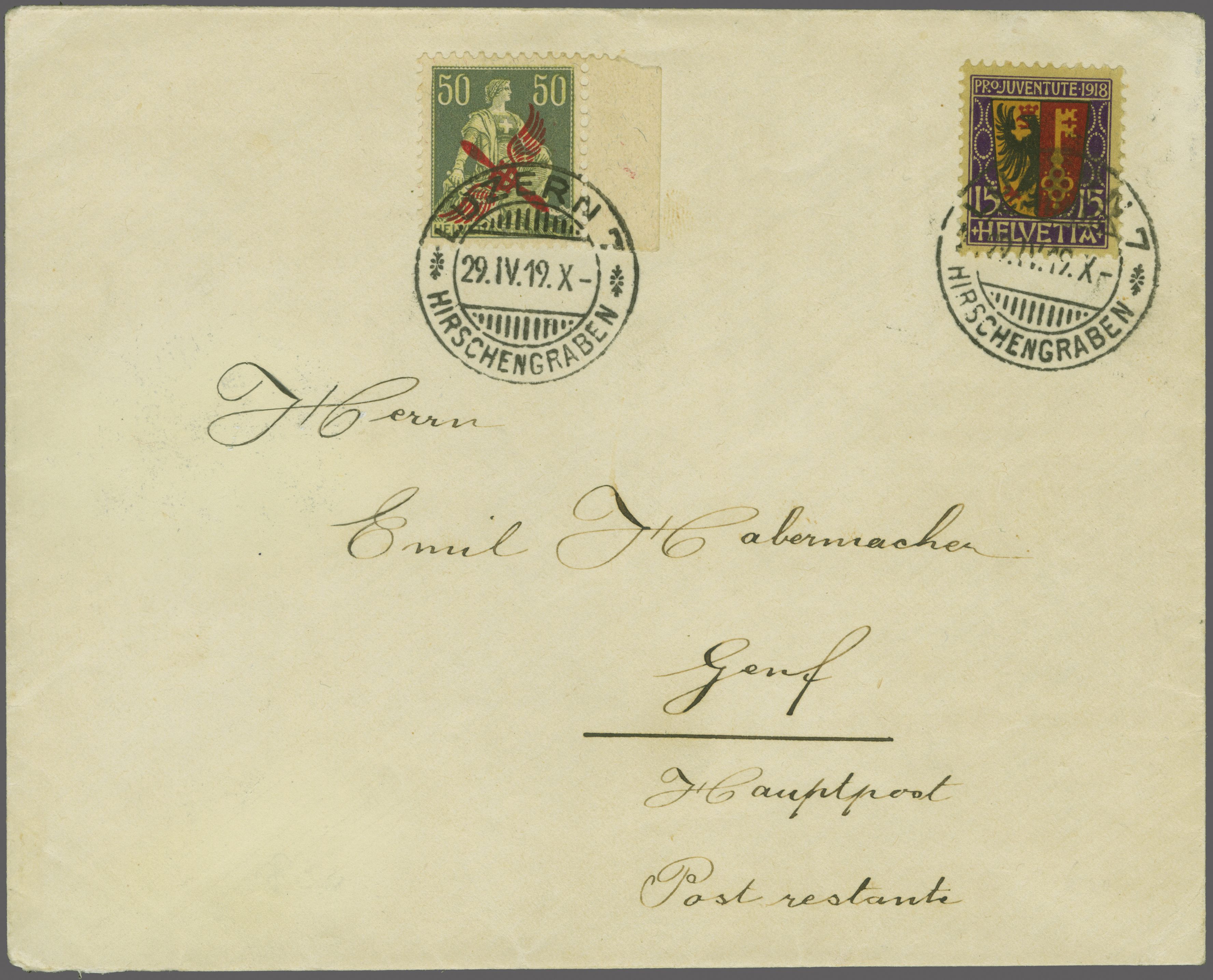 1919 (30. April): Etappe Bern - Lausanne, 'Propeller' 50 Rp. grün mit Bogenrand rechts zusammen mit 15 Rp. Pro Juventute, beide sauber gest."LUZERN 7 HIRSCHENGRABEN 29.IV.19.X" auf Brief nach Genf, rücks. gest. "SCHWEIZER