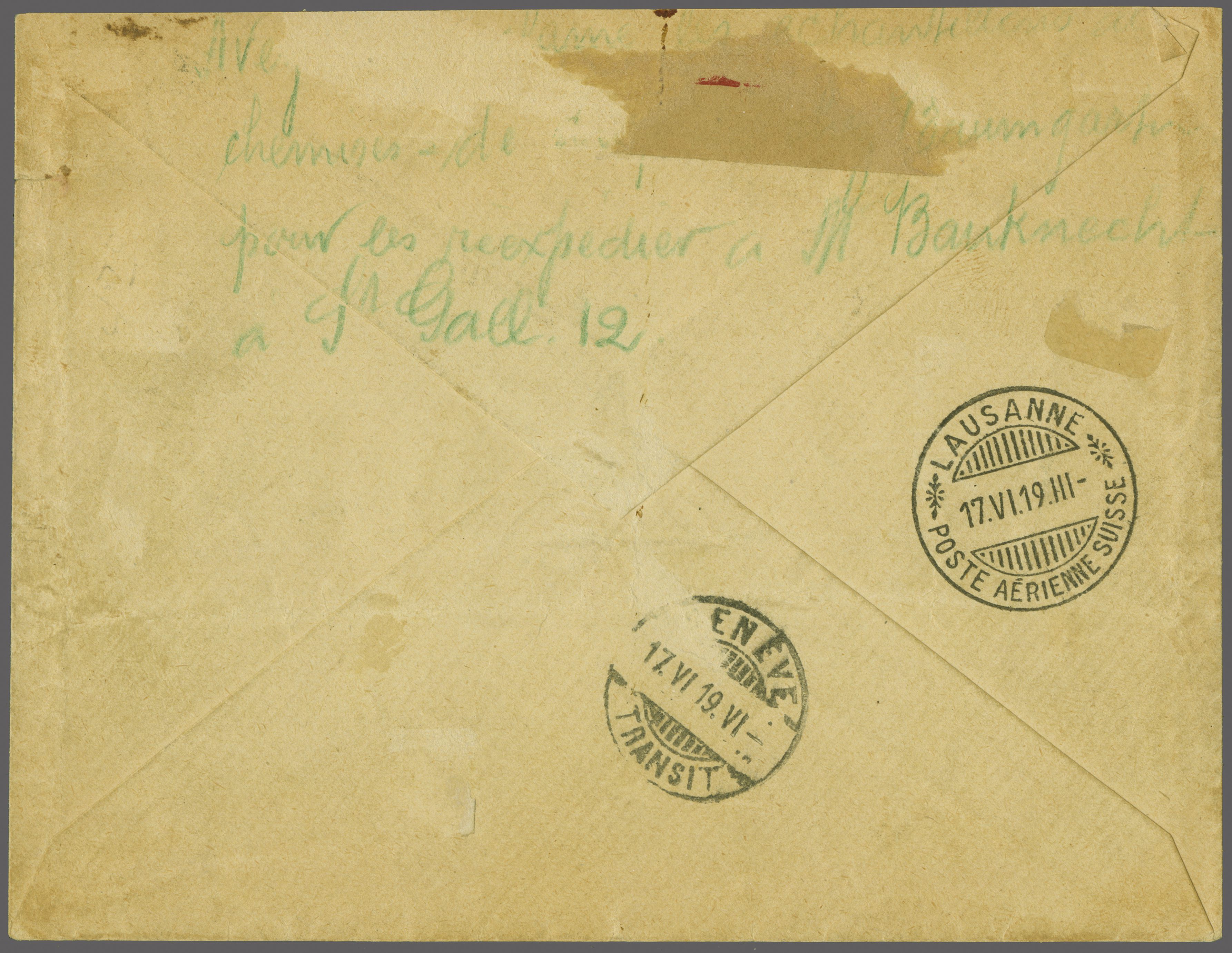 17.VI.19 476-", aufgeliefert zum Flug ab Zürich (oder Bern) mit rücks. Bestätigung durch entsprechenden Flugpoststp. "Lausanne Poste Aérienne 17.VI.19.III", weiter per Bahn nach Genf mit AStp. "GENÈVE TRANSIT 17.VI.19.VI". Eine doch recht seltene