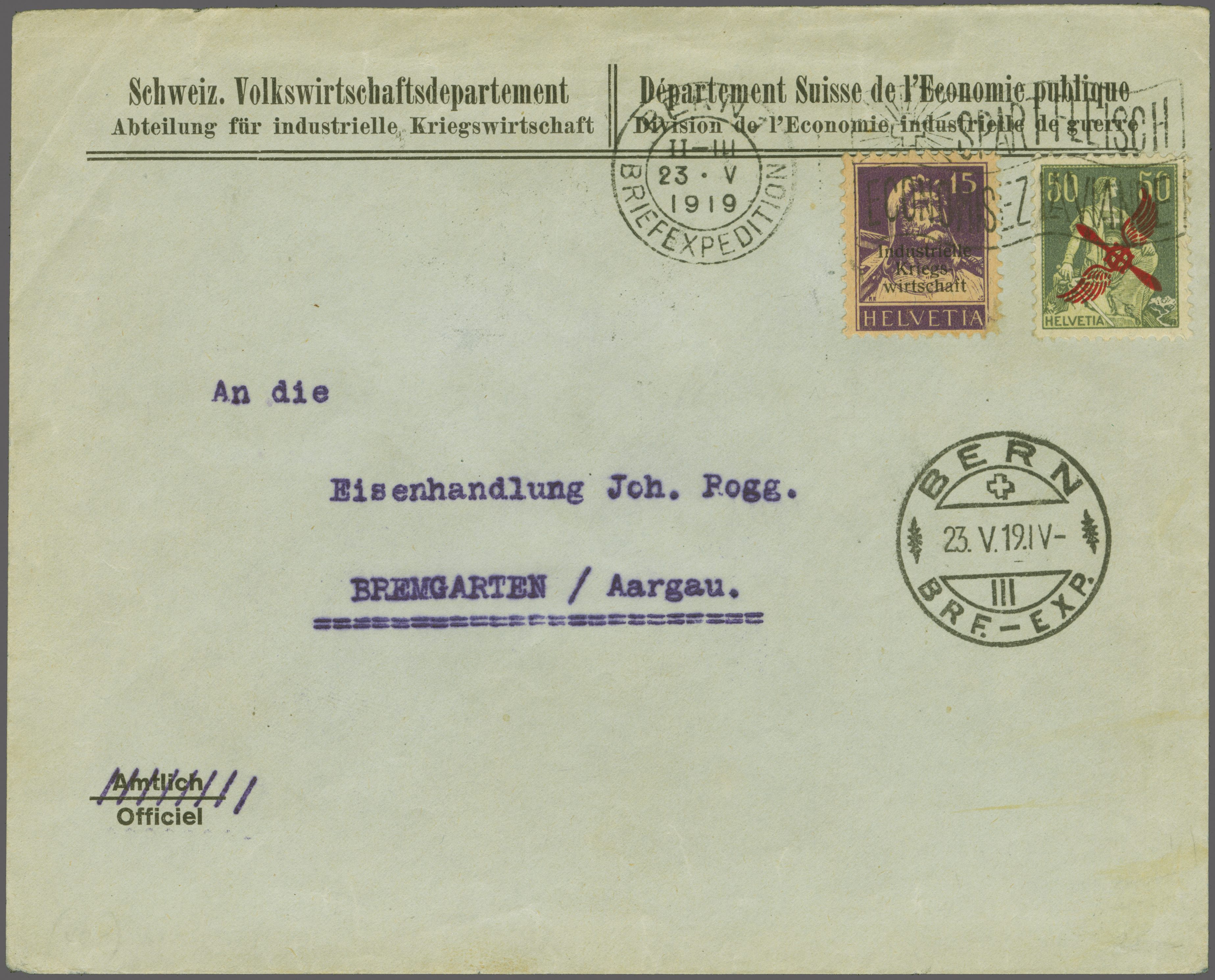 1919 (23. Mai): Dienstbrief der Abteilung für Industrielle Kriegswirtschaft frankiert mit 'Propeller' 50 Rp. plus IKW 15 Rp. entw. mit Flaggenstp. von "Bern Briefexpedition 23.V.19" via Zürich mit rücks. Flugpoststp.