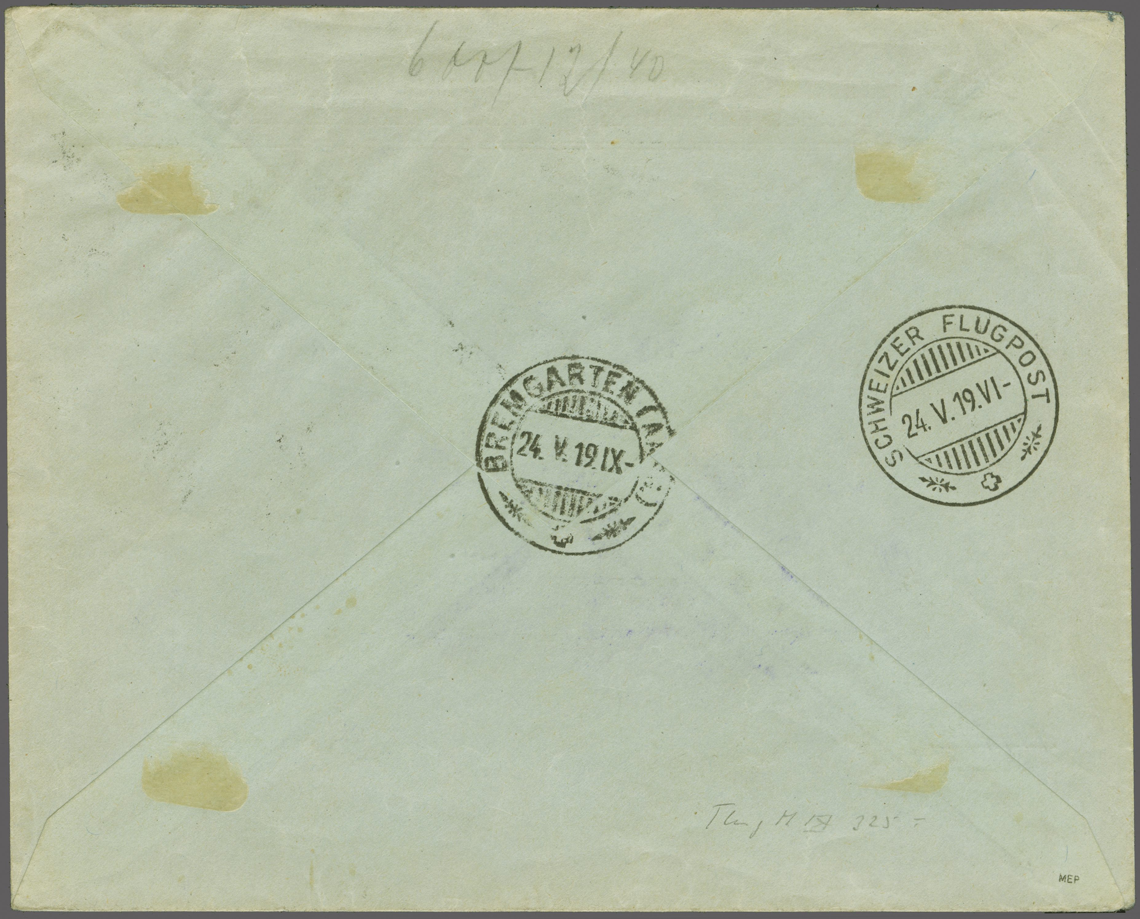 "Schweizer Flugpost 24.V.19.VI" nach Bremgarten 24.V.19.IX". Obwohl die Dienstmarken nicht mehr gültig waren (Gültigkeit bis 15. Mai 1919) und der amtliche Zudruck gestrichen wurde, wurde der Brief mit der Dienstmarken Zusatzfrankatur ohne