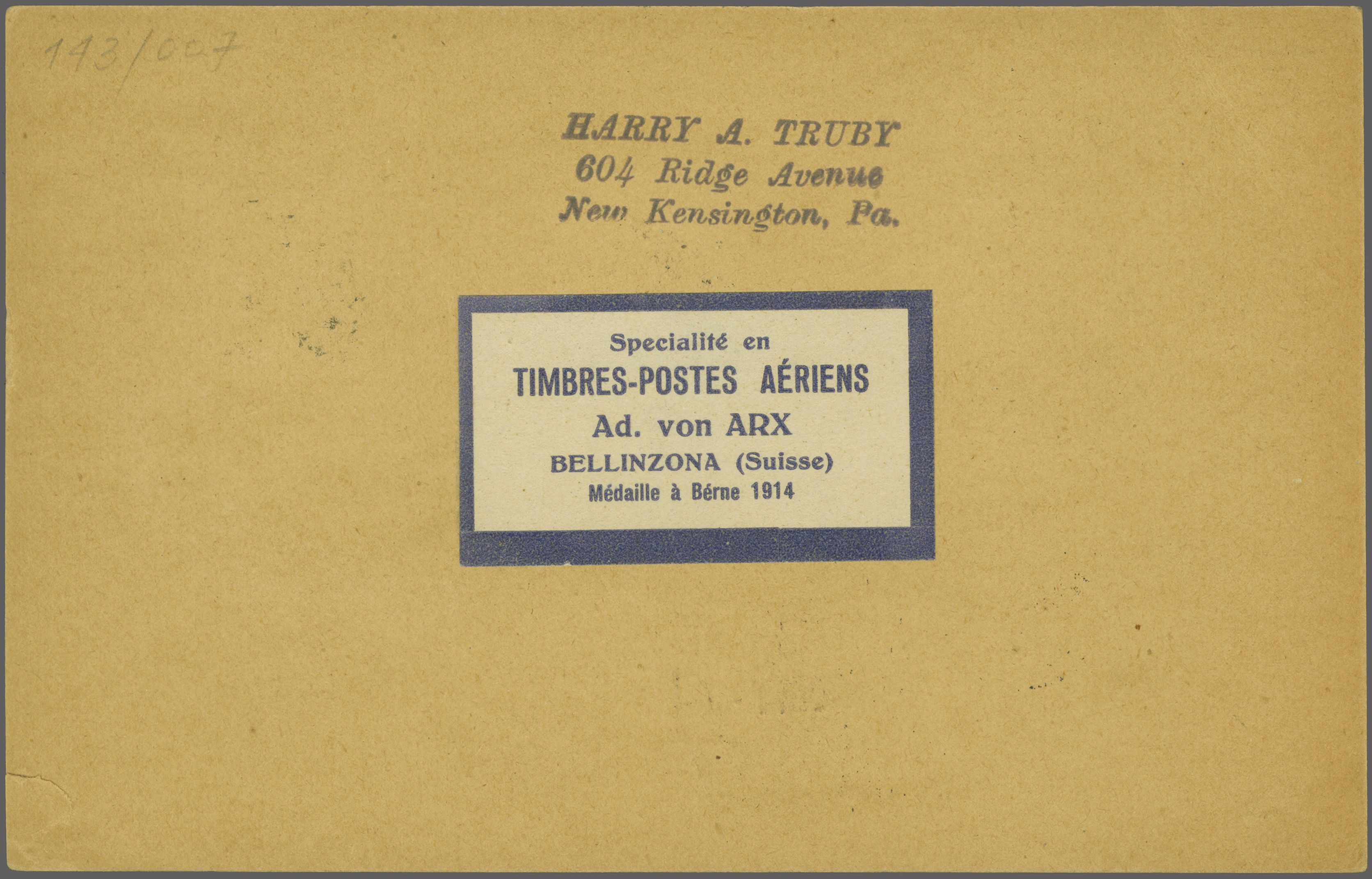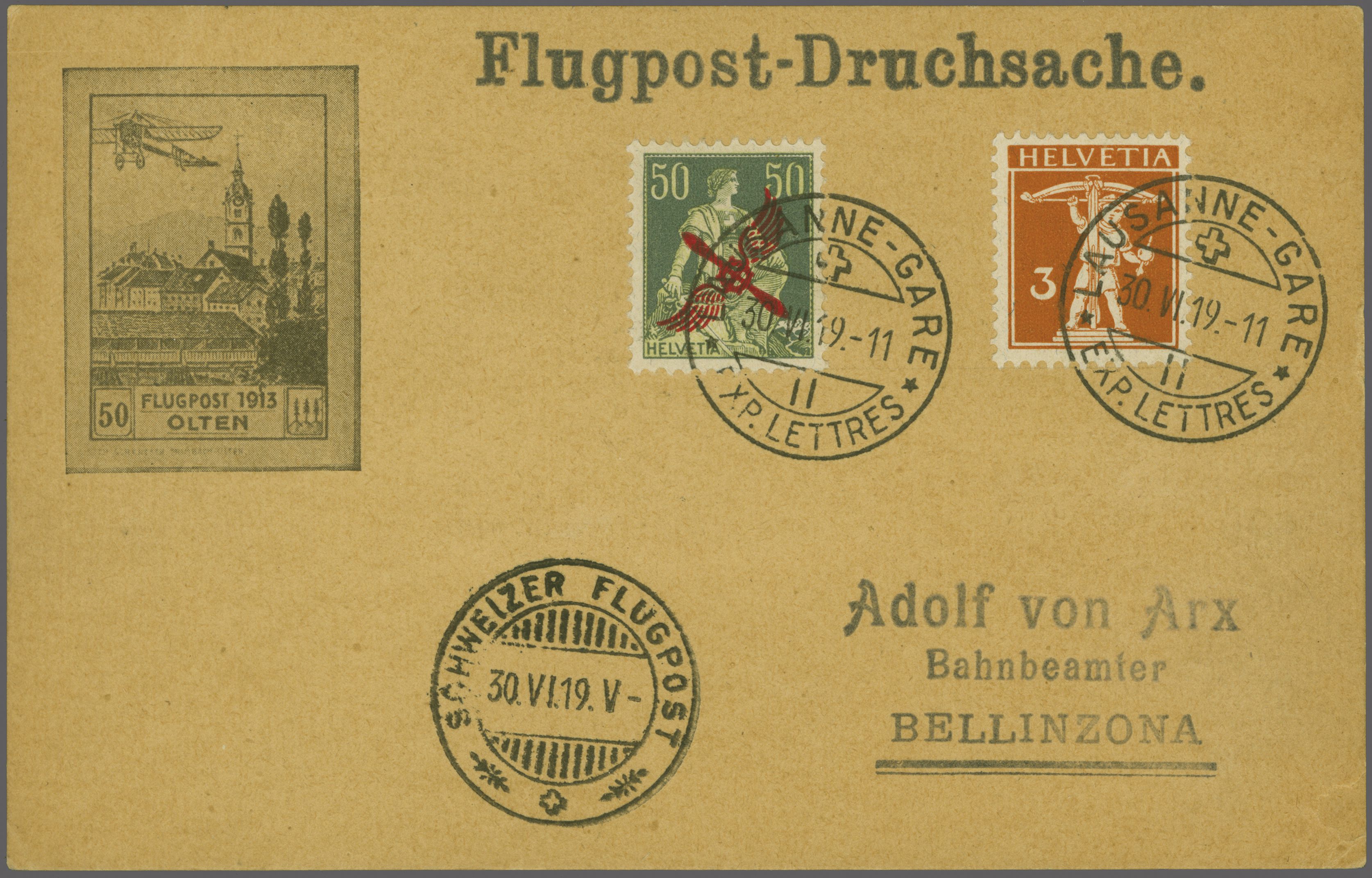 30.VI.19-11" zugeleitet zum Flug nach Bern mit AStp. "SCHWEIZER FLUGPOST 30.VI.19.V". Eine seltene Drucksache adressiert an Adolf von Arx, Bahmbeamter Bellinzona SLH = CHF 600 (Image 1)