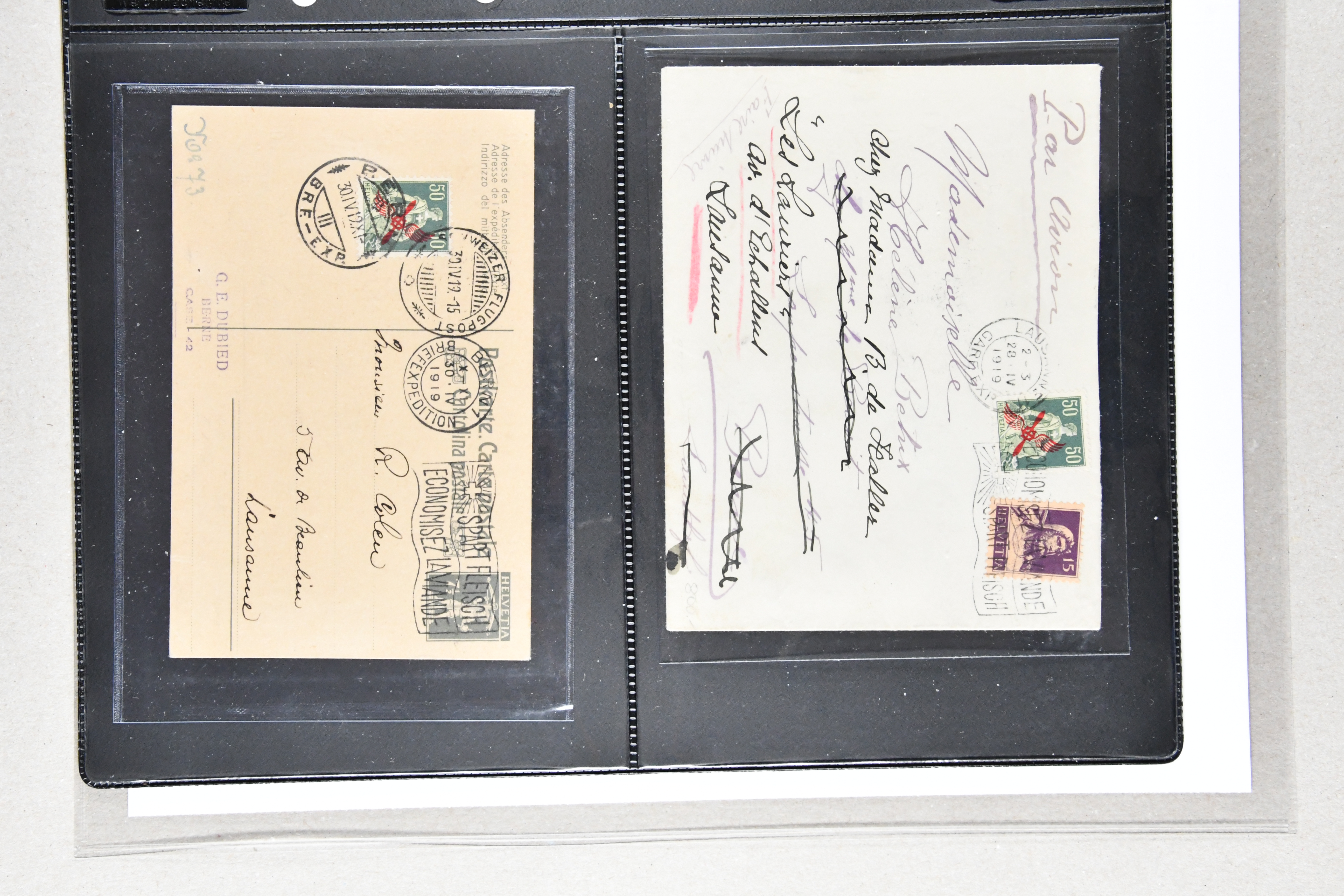 Drucksachenporto zu 3 Rp. von Genf (4.VIII.19-11) geflogen von Lausanne nach Bern, weiter zwei Feldpostverwendungen vom 6. Juni 19 nach Lausanne, bezw. 7. Sept. von Wallenstadt nach Genf sowie eine Karte von Oskar Bider an seine Schwester Leni