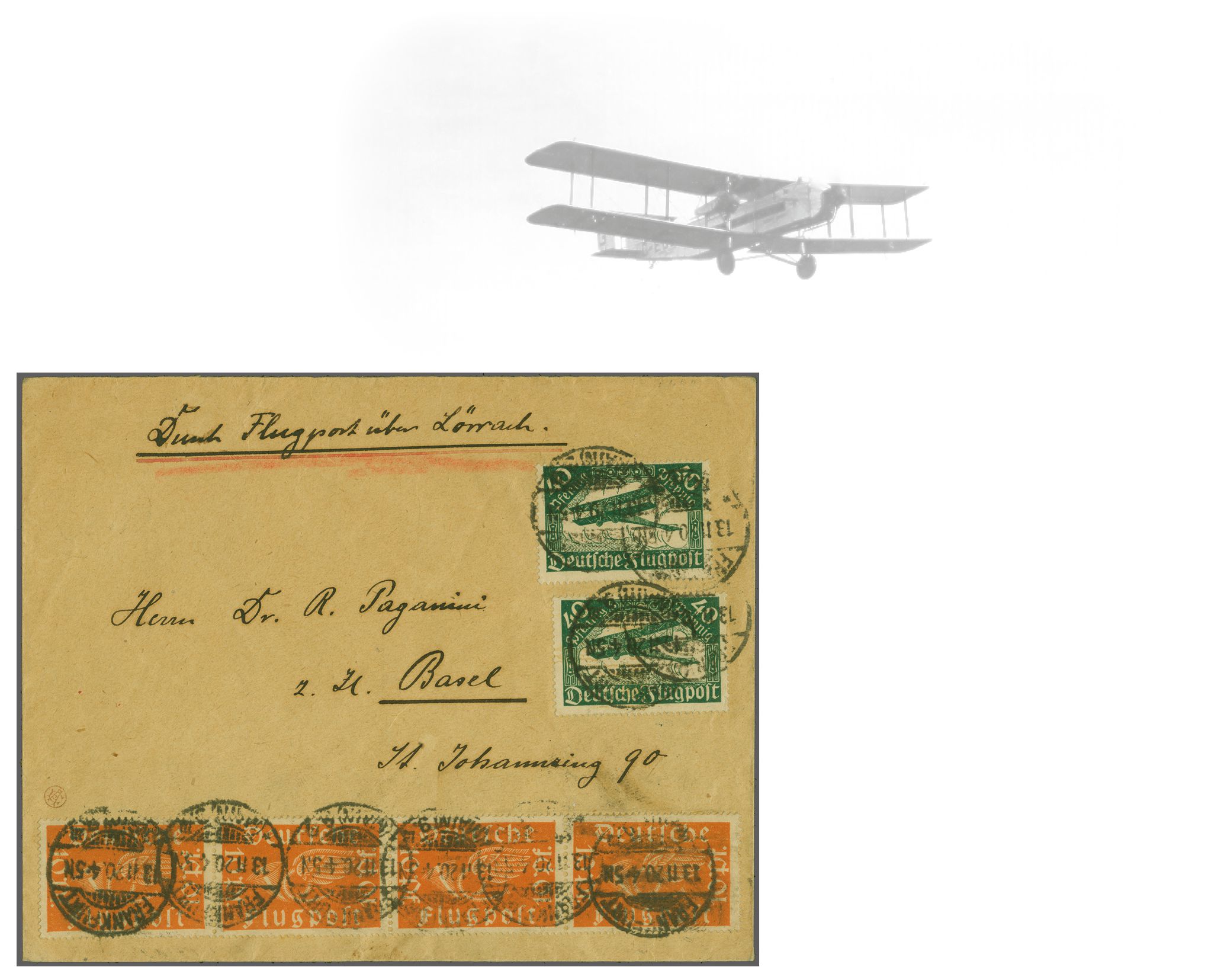 Pfg. Doppeldecker sowie vier Marken zu 10 Pfg. Posthorn, alle Werte übergehend gest. "FRANKFURT (MAIN) 13.11.20 4-5N". Das Flugzeug erreichte Lörrach erstmals am 14. November. BefS. sechs Belege, wovon der hier vorliegende Brief bis dato der einzig