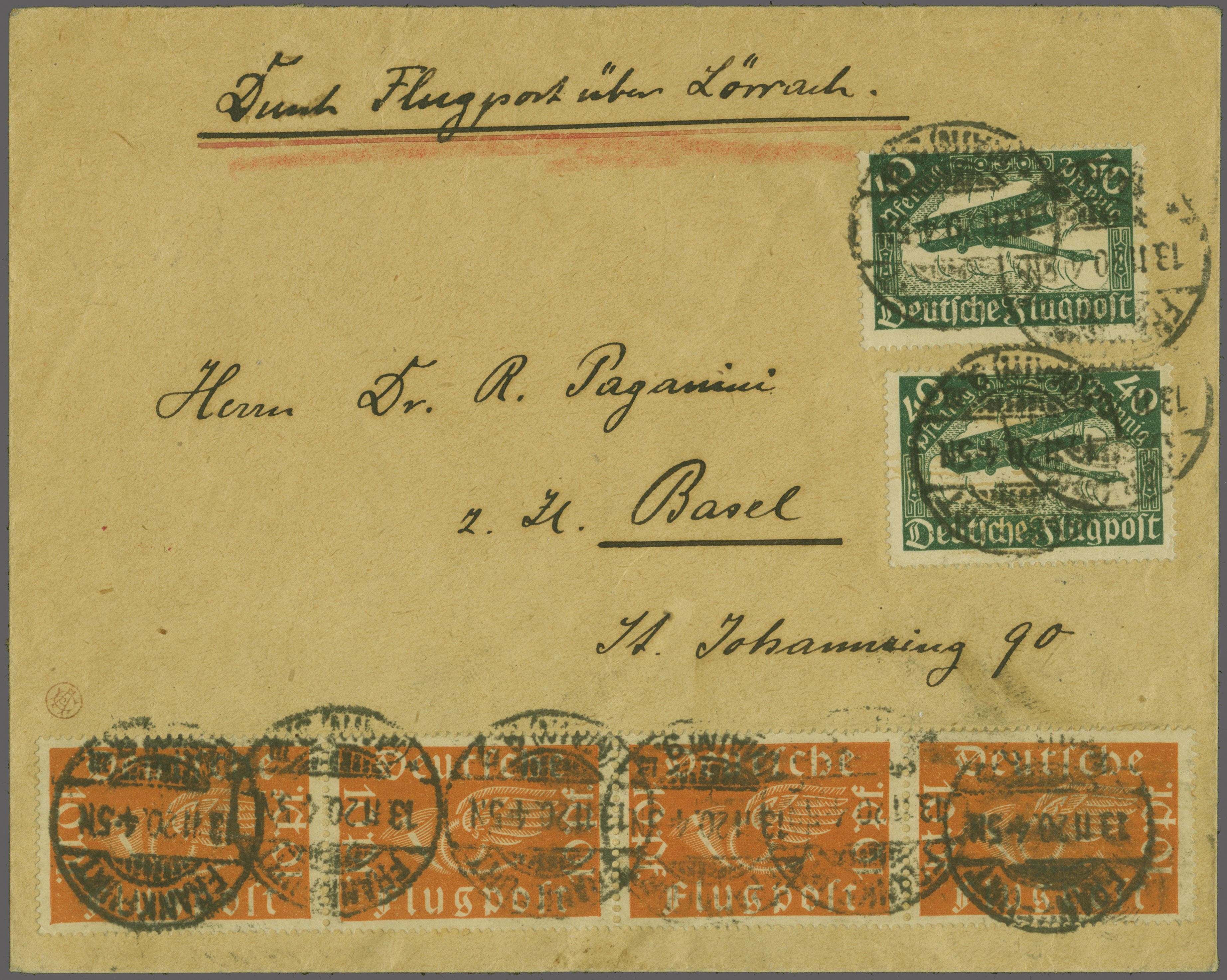 Badische Luftverkehrs-GMBH Linie Frankfurt - Lörrach Deutsche Post 1920 (14. Nov.): 'Paganini'- Brief vom Erstflug Frankfurt - Basel/Lörrach mit handschriftl. Leitvermerk 'Durch Flugpost über Lörrach' frankiert mit zweimal 40