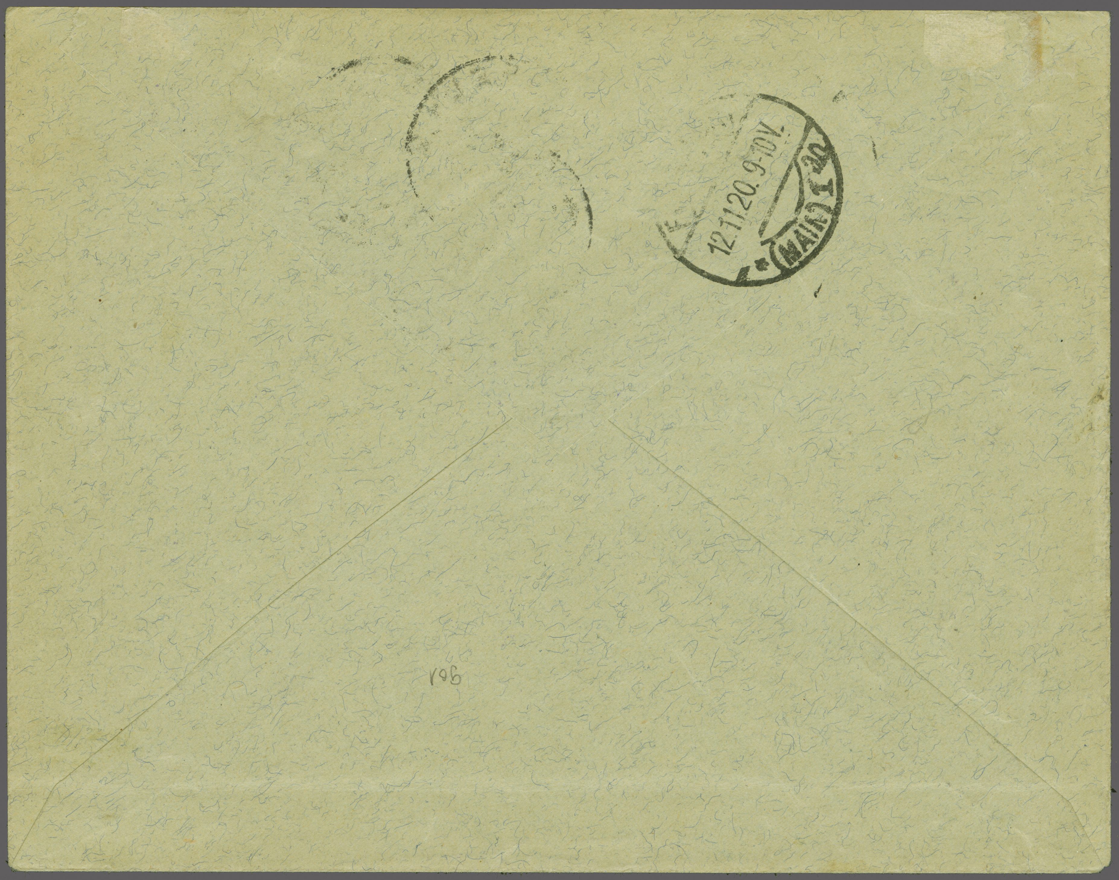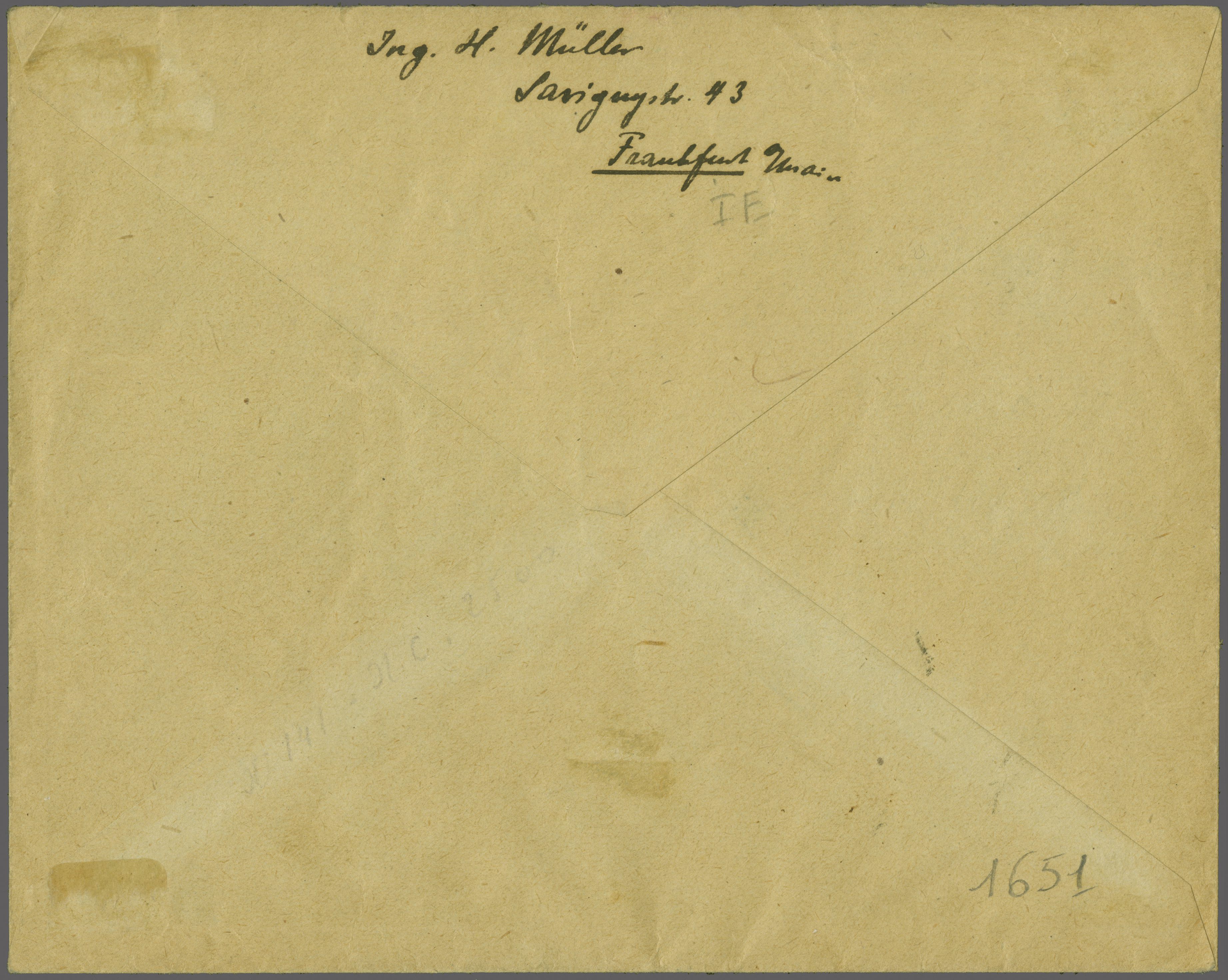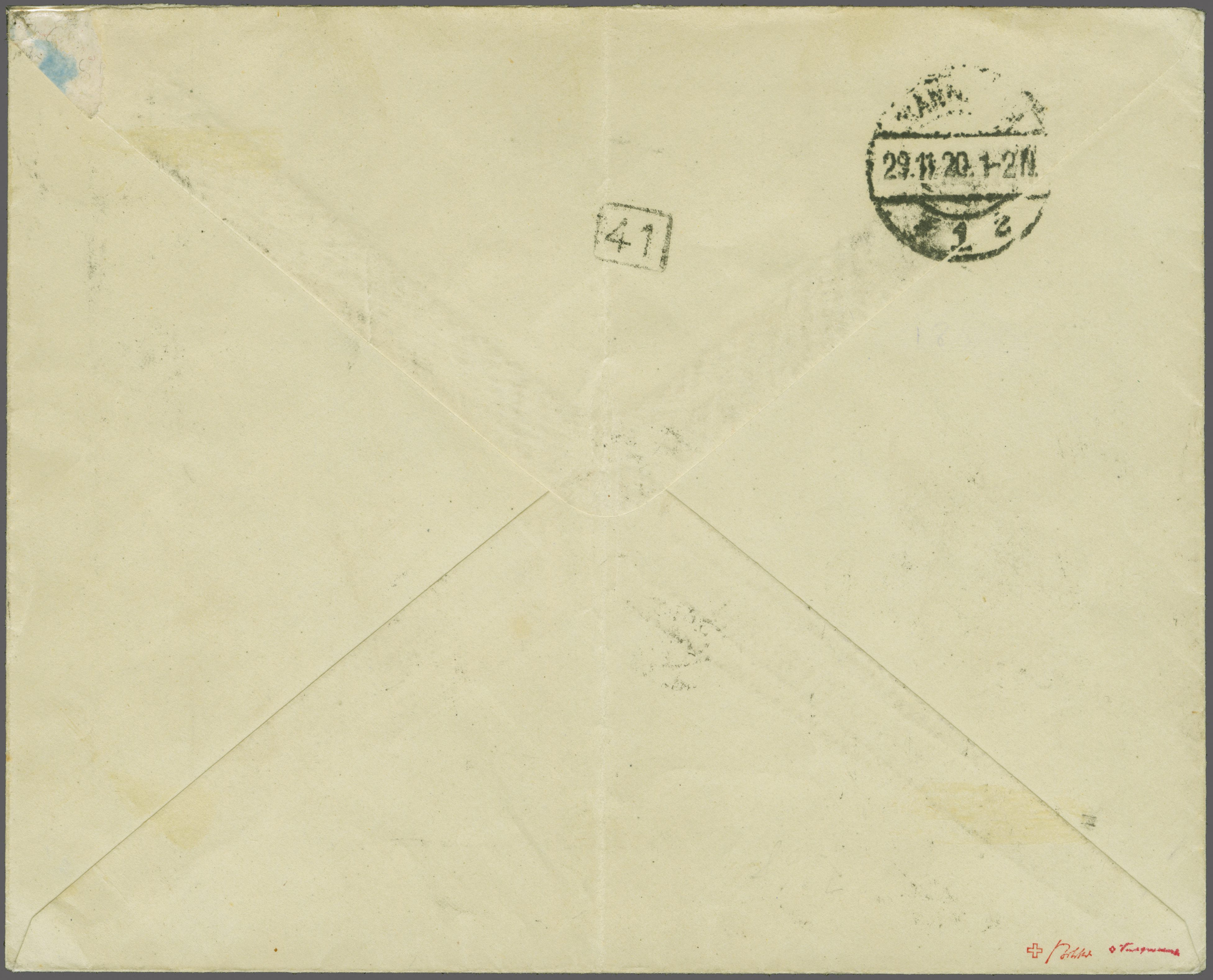 rücks. AStp. "Frankfurt West 13d 24.11.20 6-7V". Die ausgewiesenen Zeitverhältnisse ergeben, dass der Brief (mittig senkr. gefaltet, minim eingerissener Bug mit Fleck, Frankatur jedoch nicht beeinträchtigt) per Flugpost befördert wurde. Der Absender