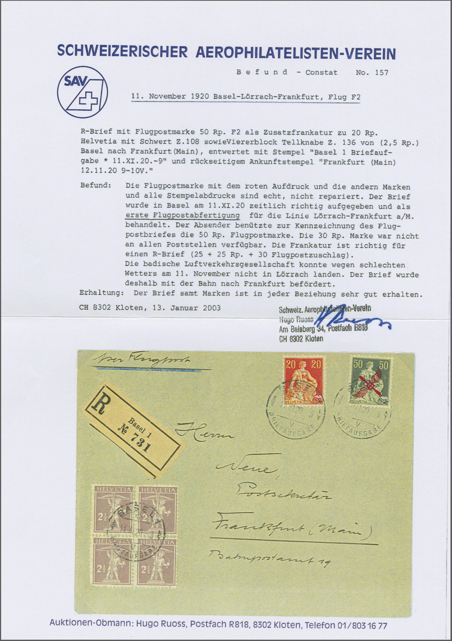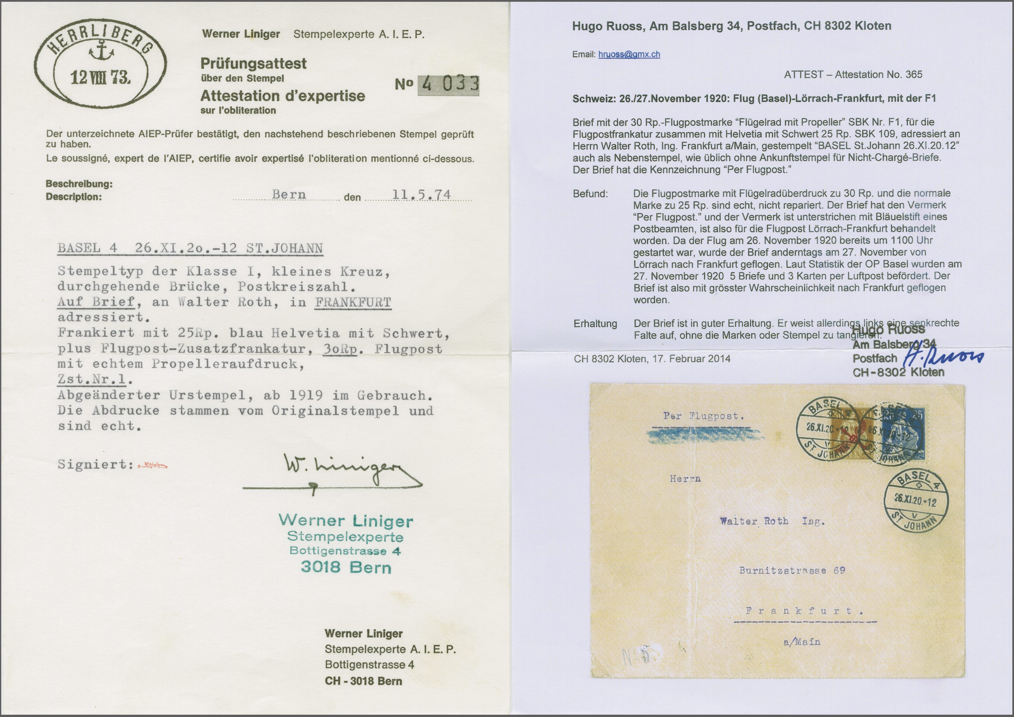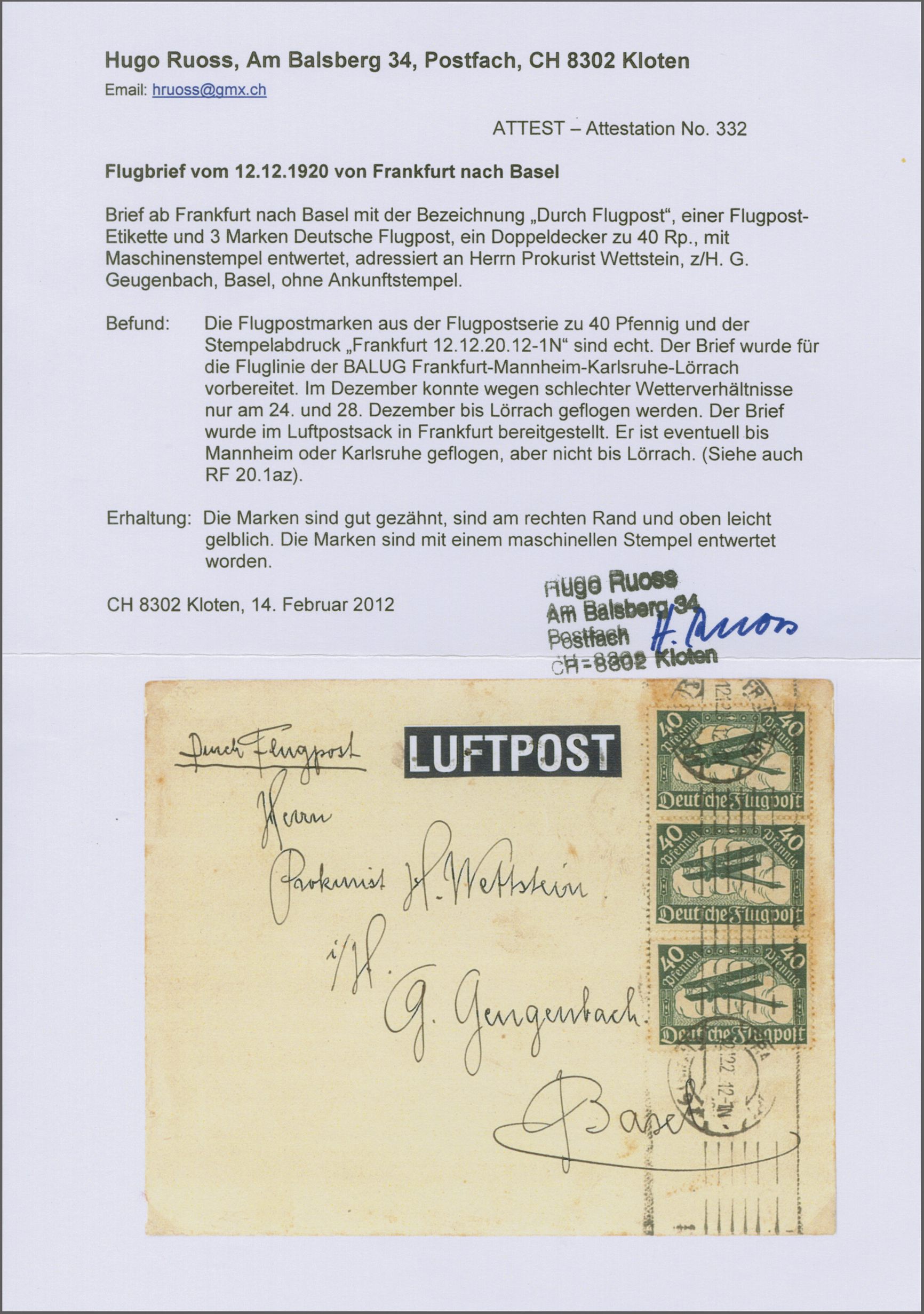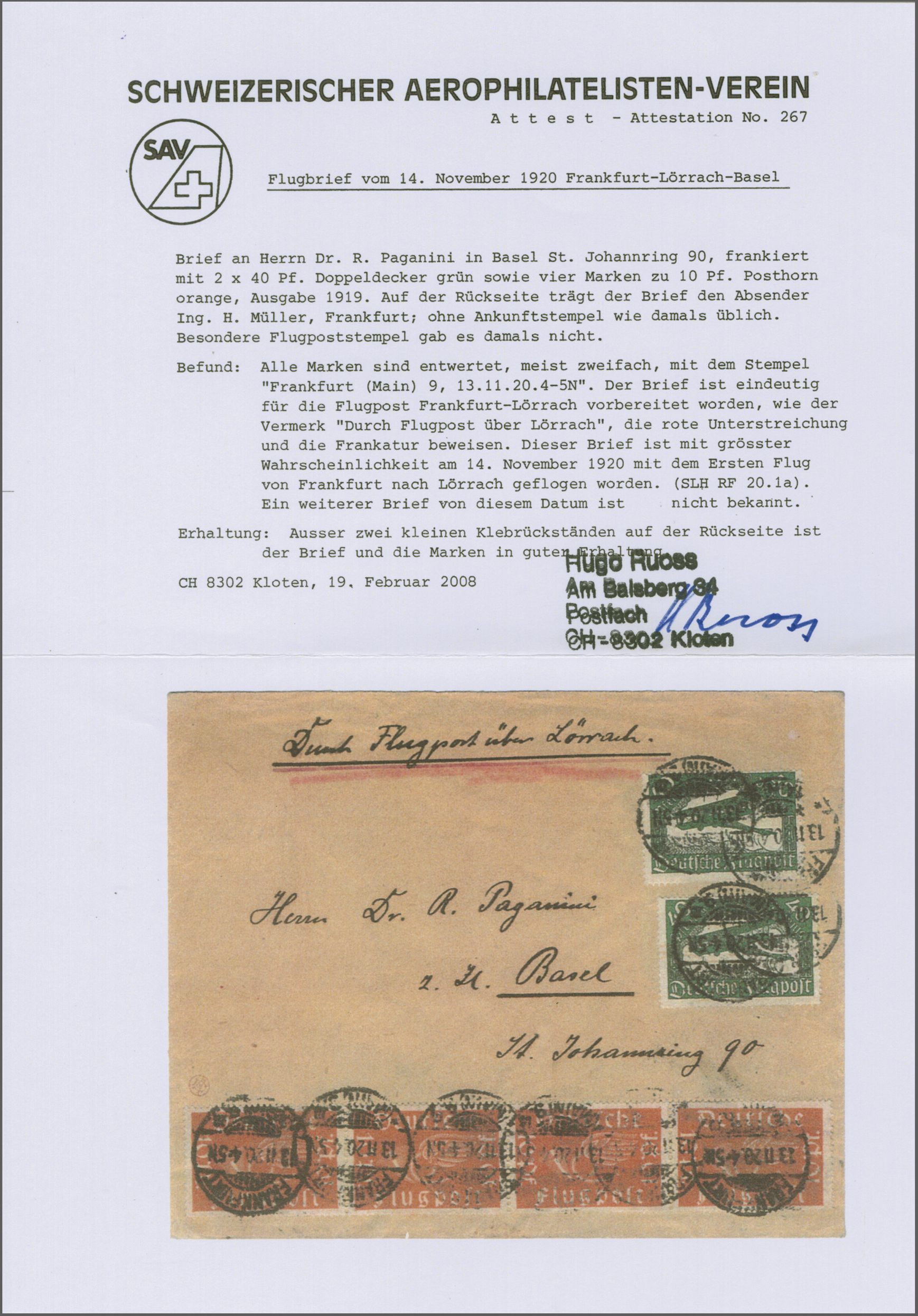 Lörrach nach Frankfurt geflogen. Laut Statistik und Attest von Hugo Ruoss wurden am 27. November insgesamt 5 Briefe und 3 Karten per Luftpost befördert. Der Brief ist mit grösster Wahrscheinlichkeit nach Frankfurt geflogen worden. Attest Hugo Ruoss