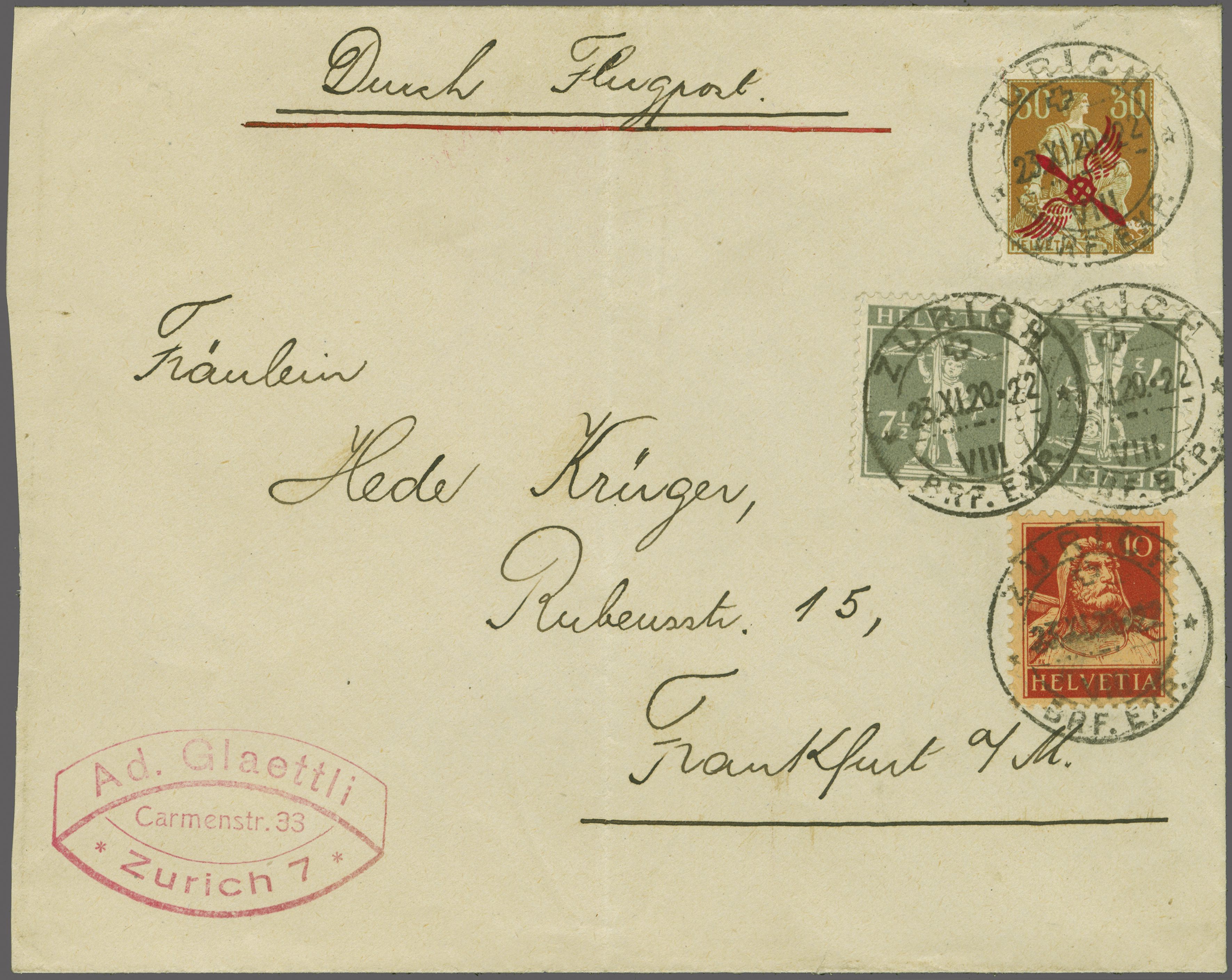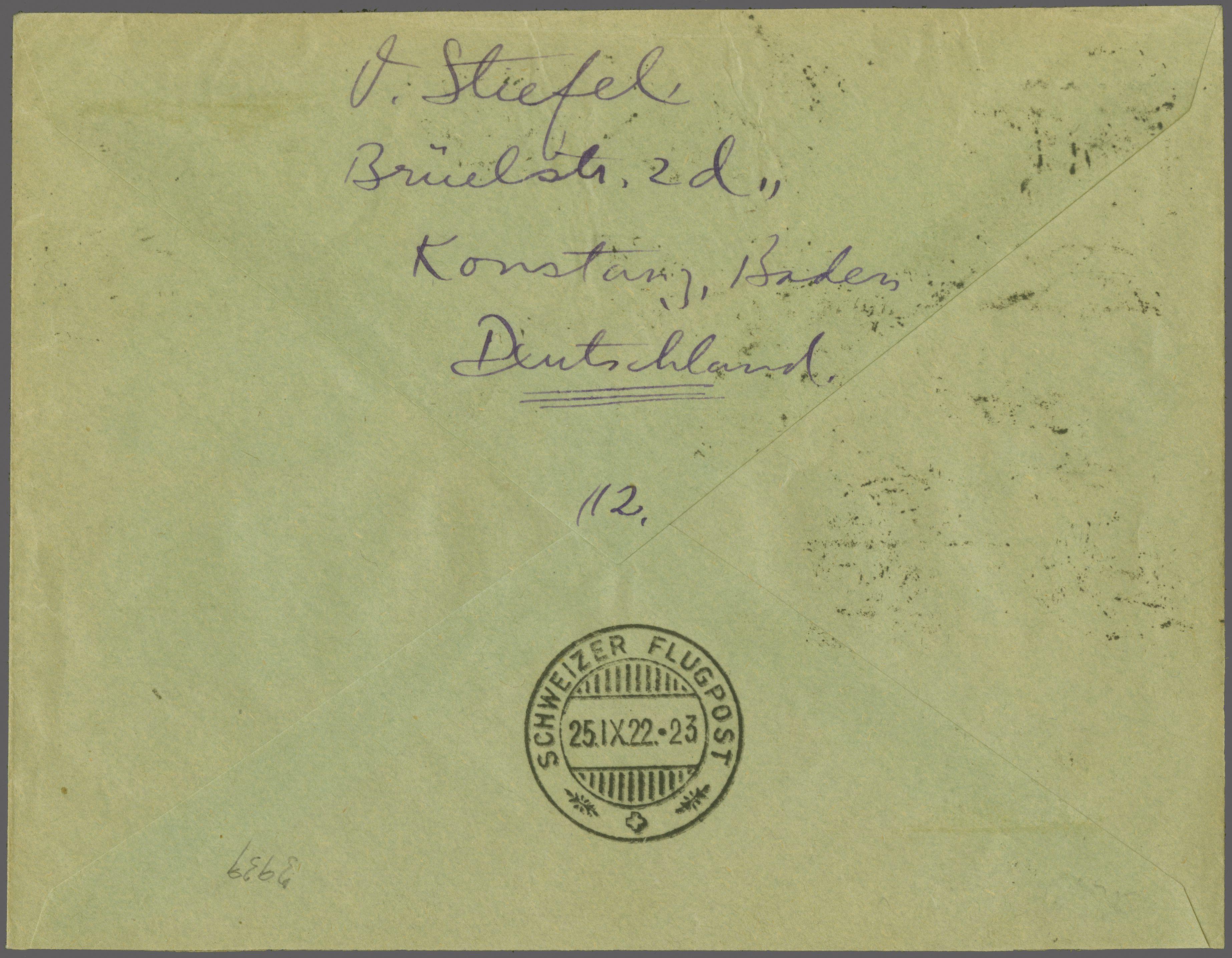 Ankunft in Zürich rücks. bestätigt mit "Schweizer Flugpost 25.IX.22.23". Portogerecht frankierter Brief, die Taxe von RM 2.05 entspricht dem damaligen Drucksachenporto plus Flugpostzuschlag bis 50 Gramm. Ein sehr seltener Beleg von dieser Etappe, nur